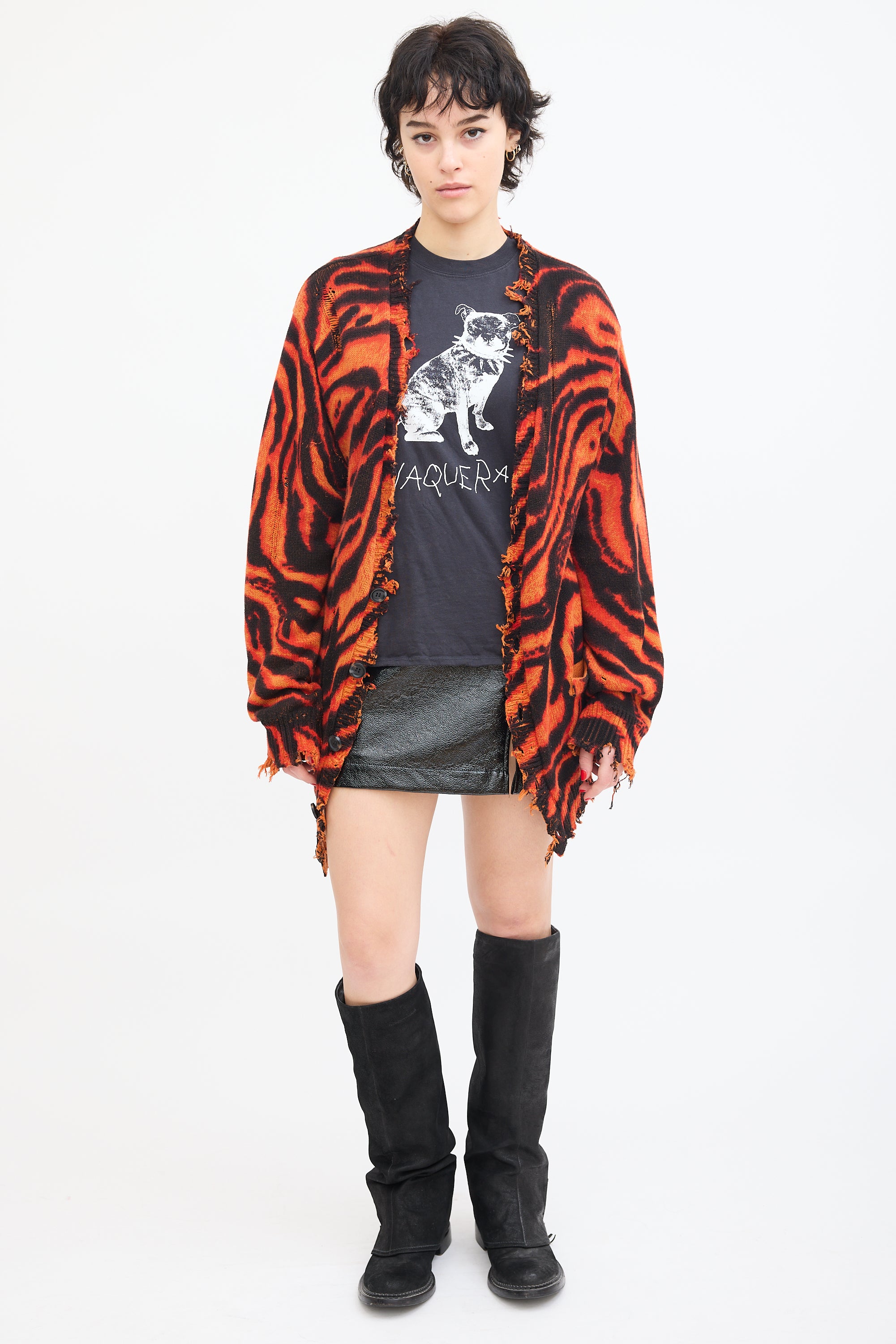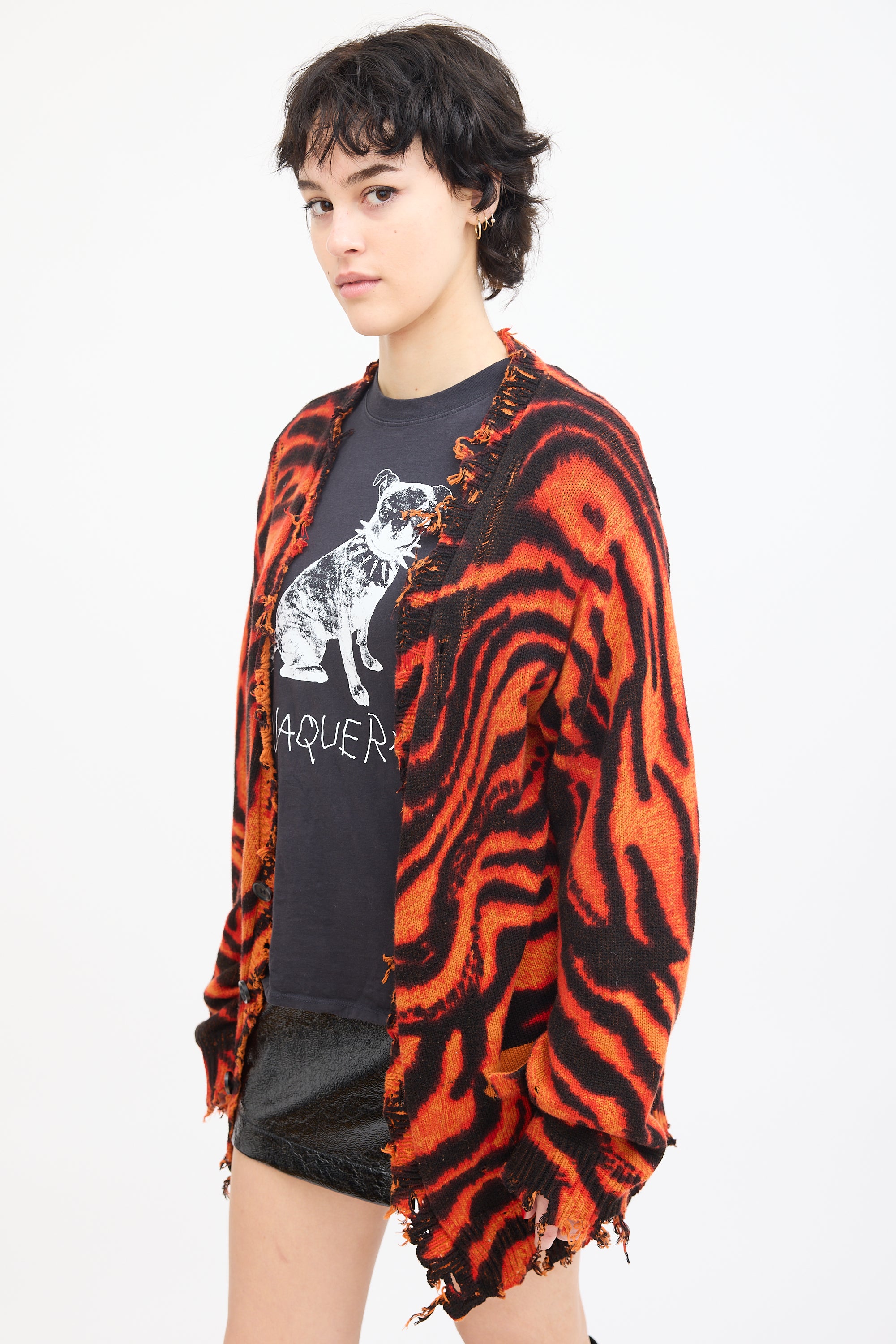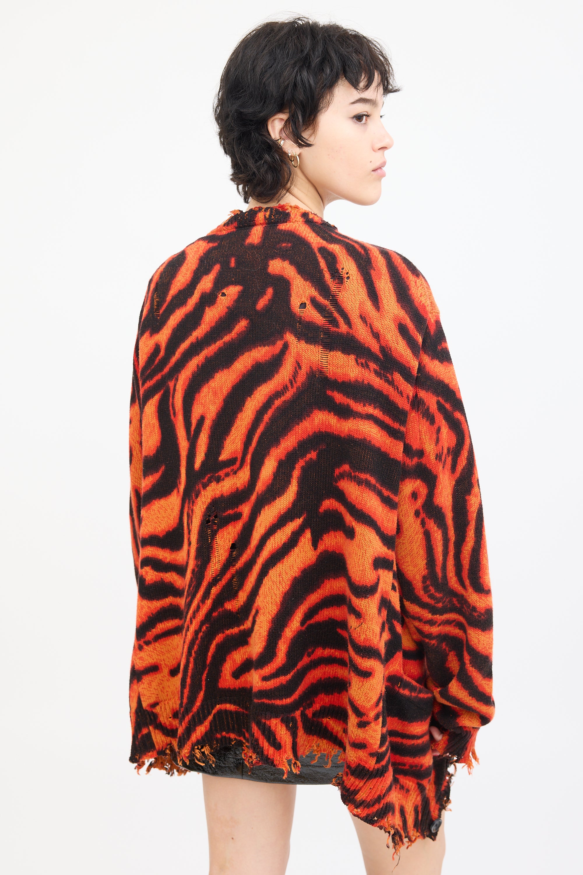 Pre-owned R13 orange and black cardigan featuring V-neckline, button up front, tiger striped print, two front slip pockets, dropped shoulders, long sleeves, intentional distressing throughout, and distressed ribbing trim.