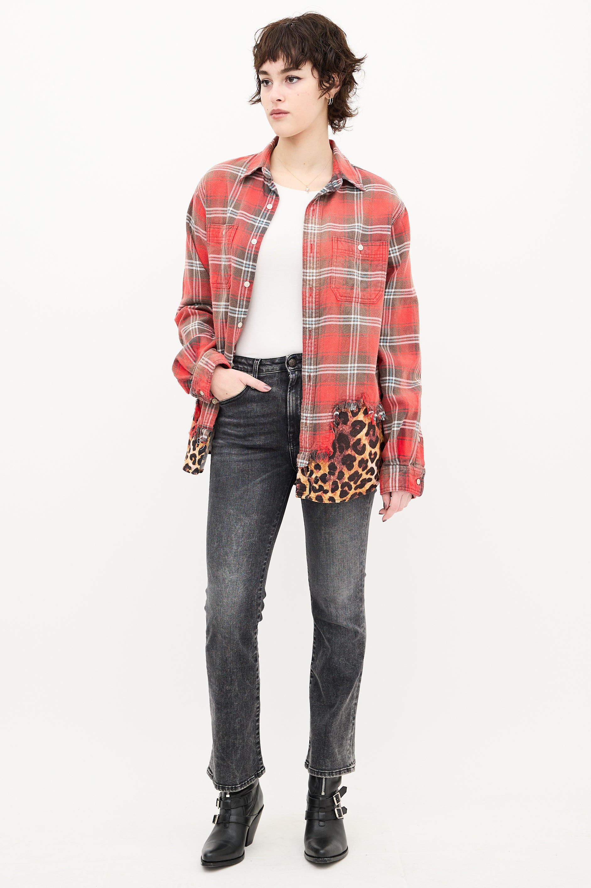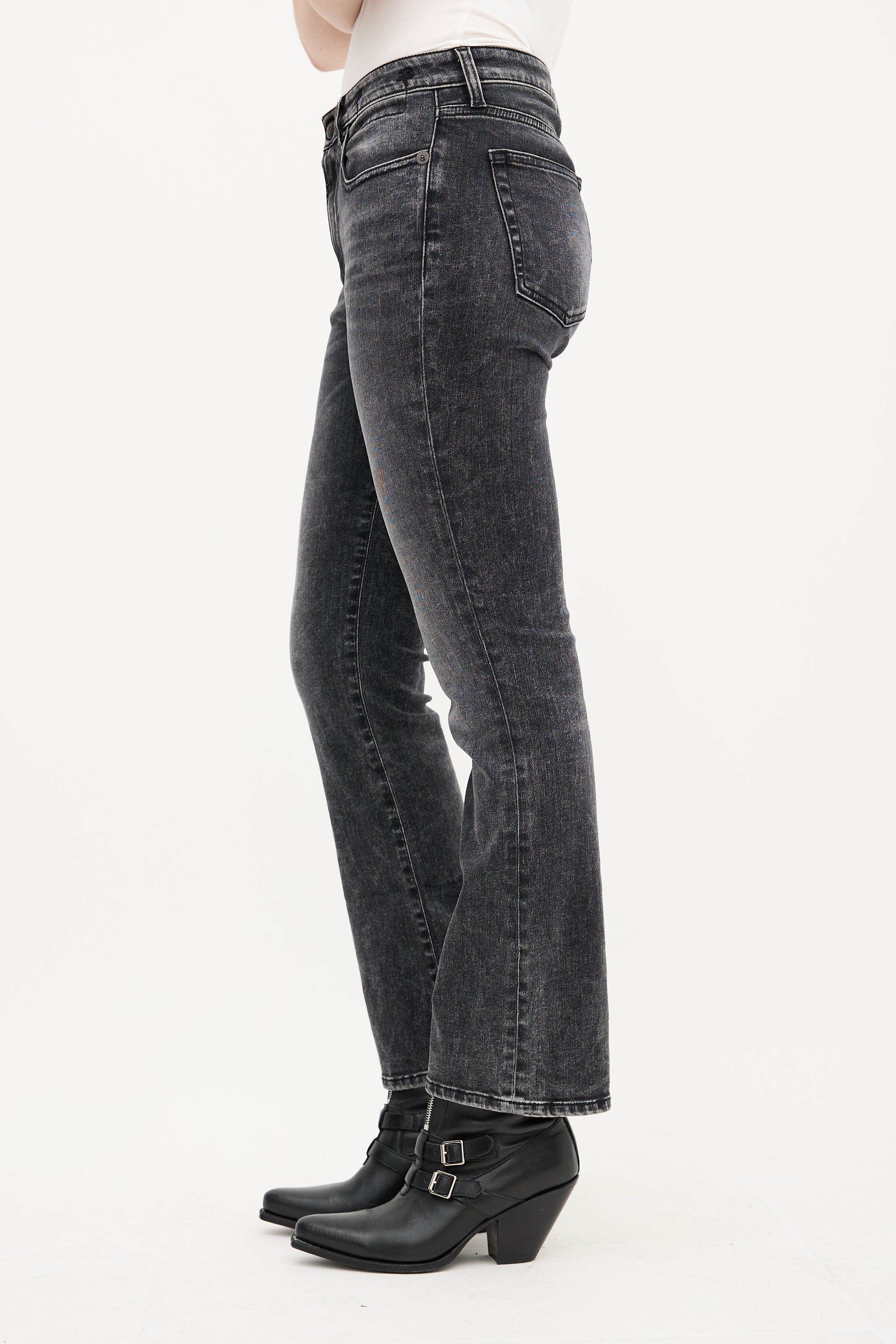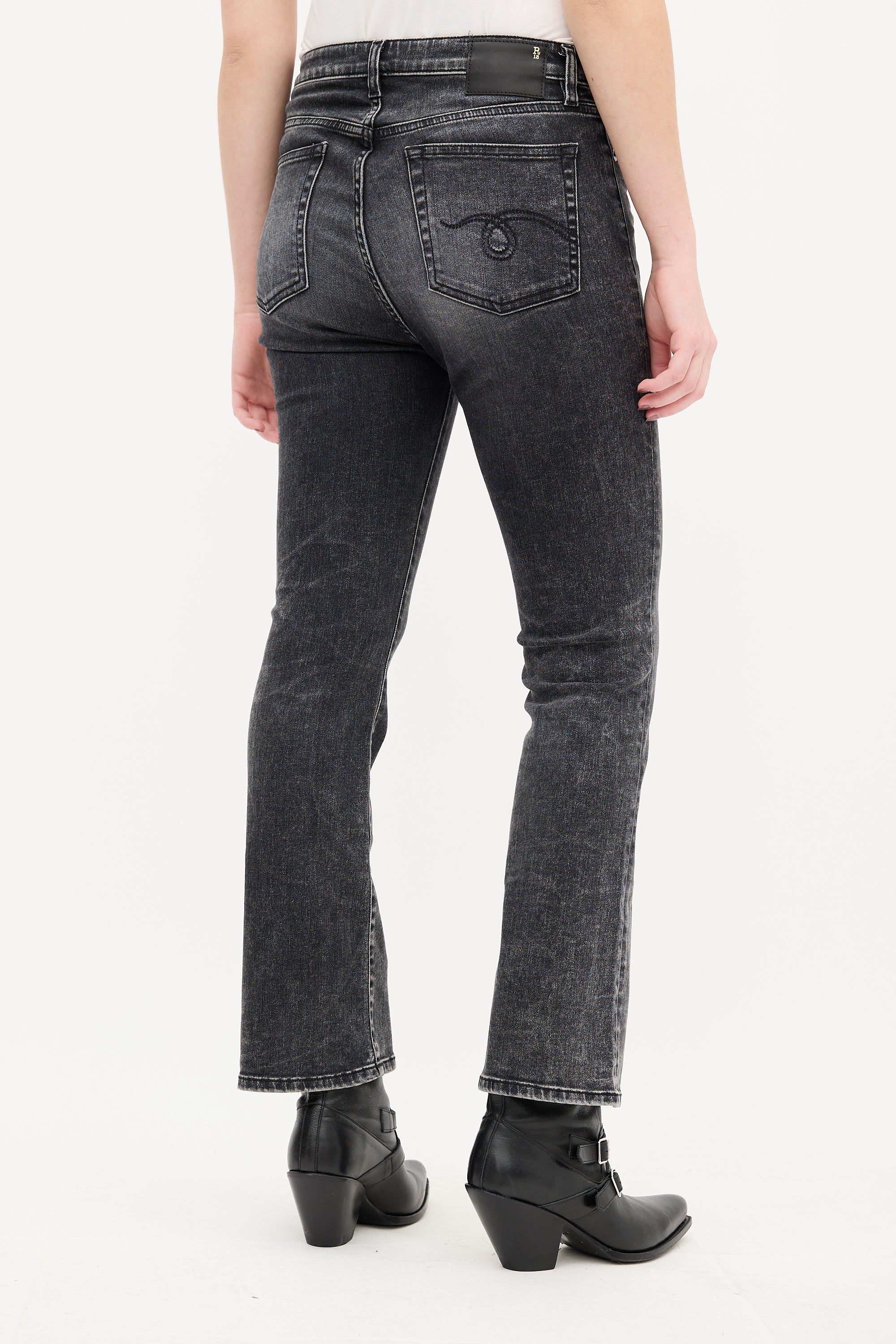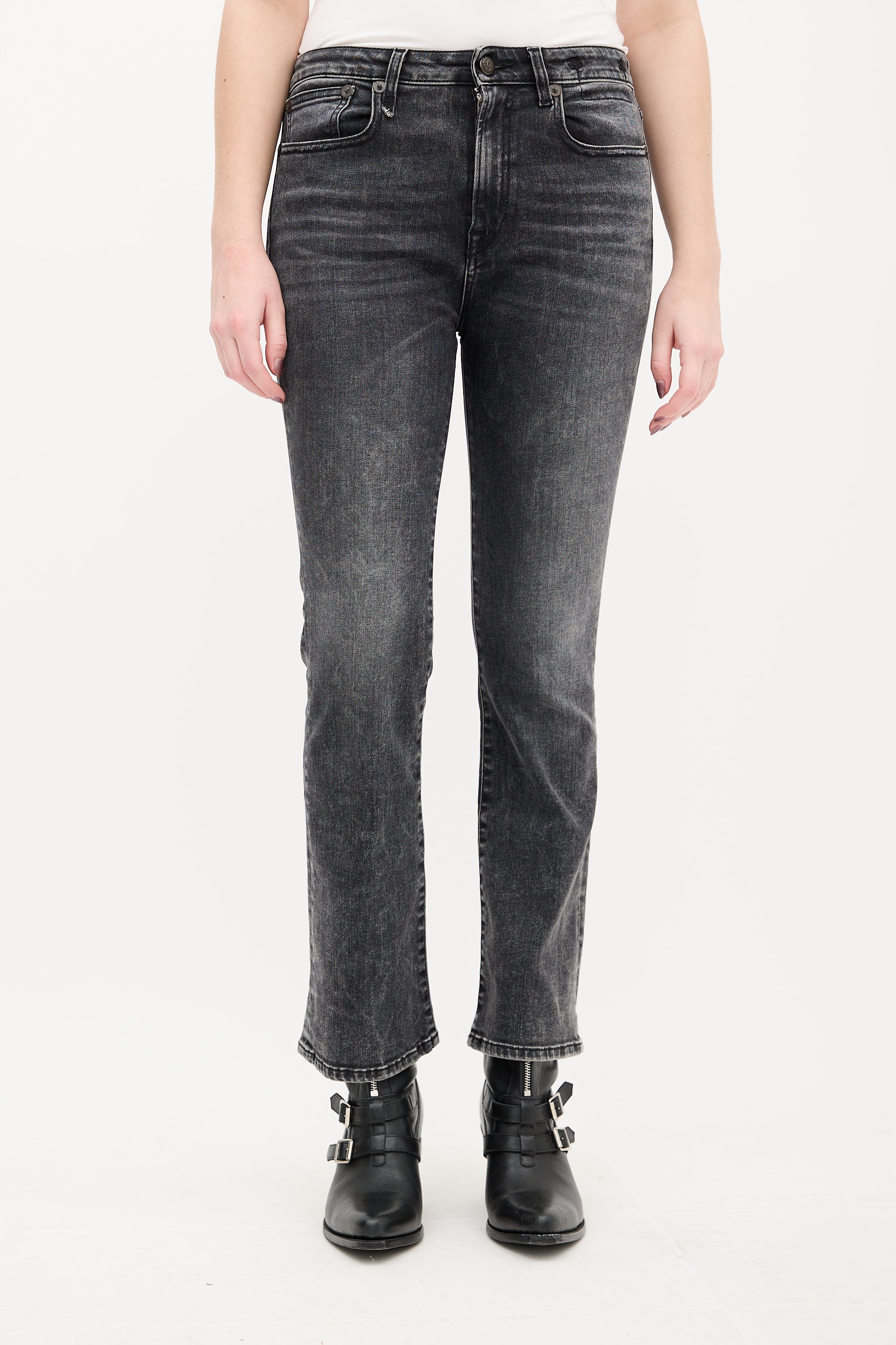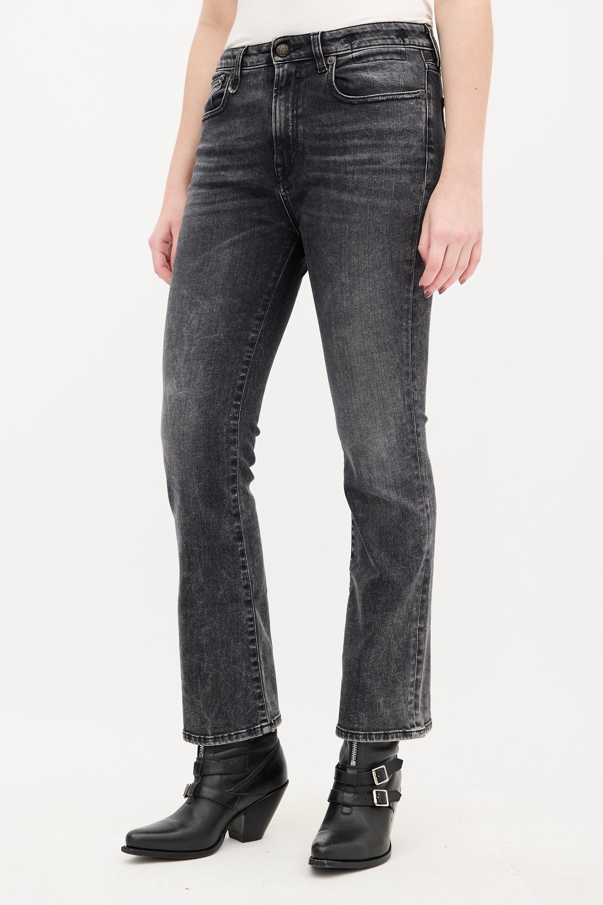 Pre-owned R13 washed black Kick Fit jeans featuring belt loops, zip fly, five pocket styling, black logo patch at back waist, and flared leg.