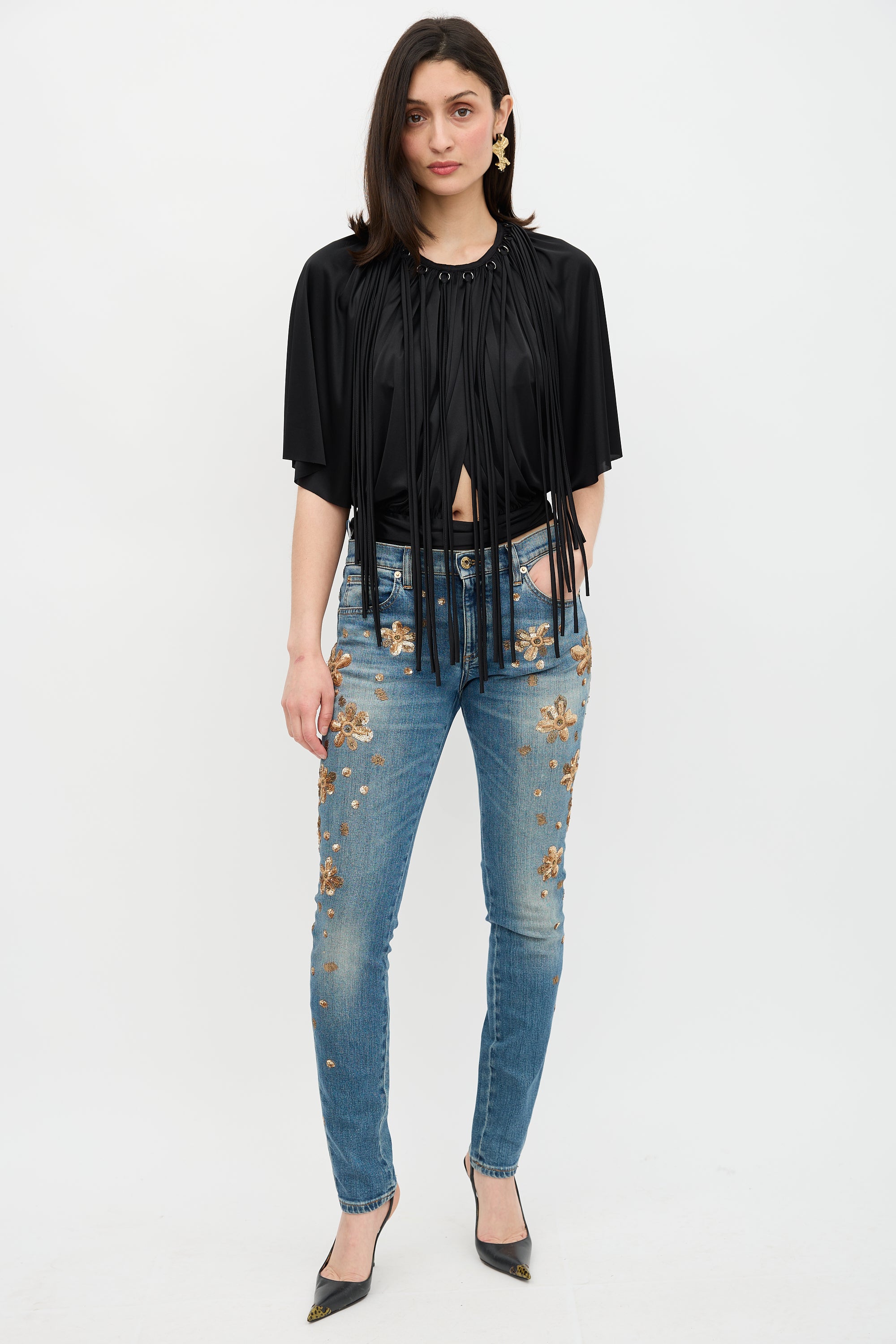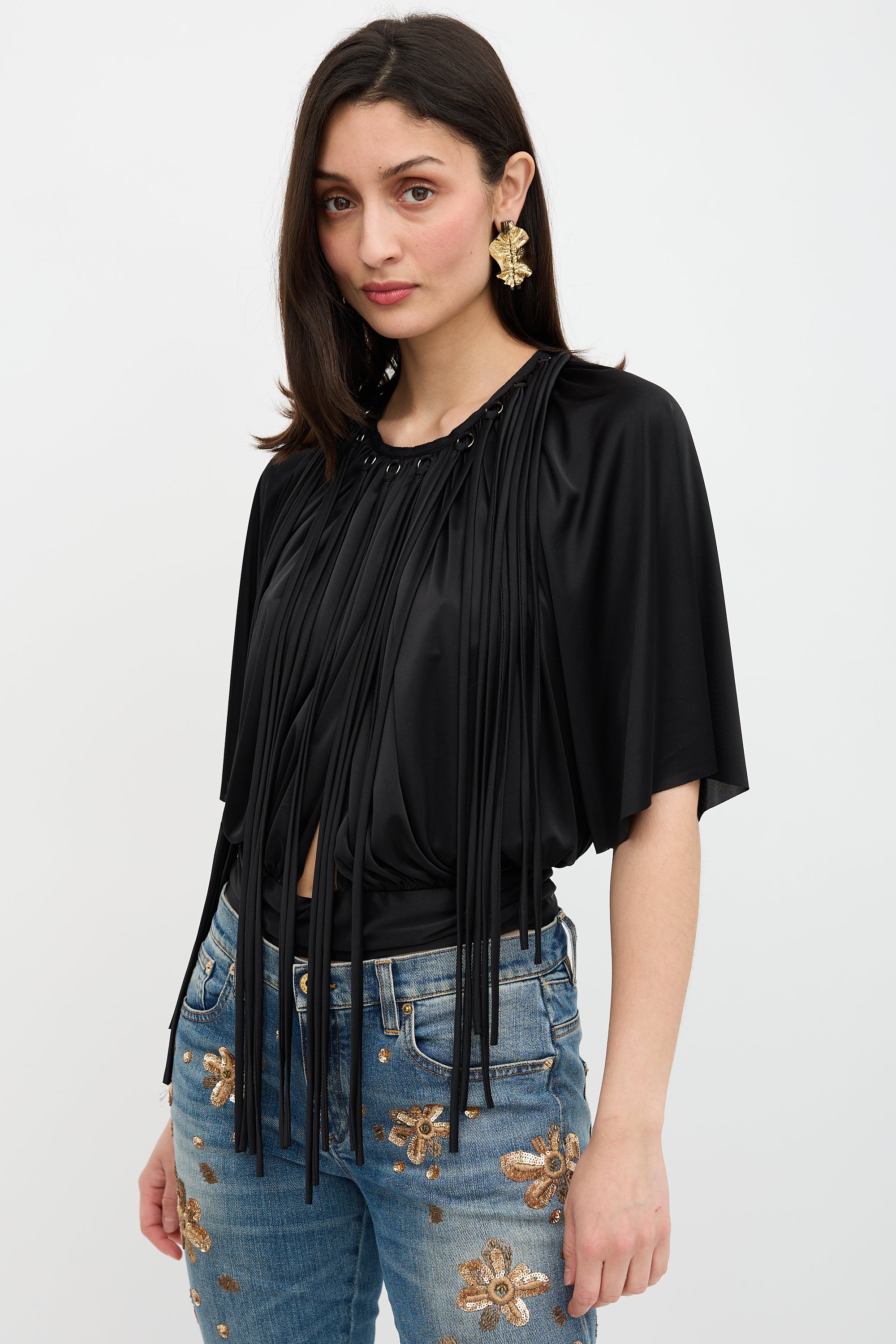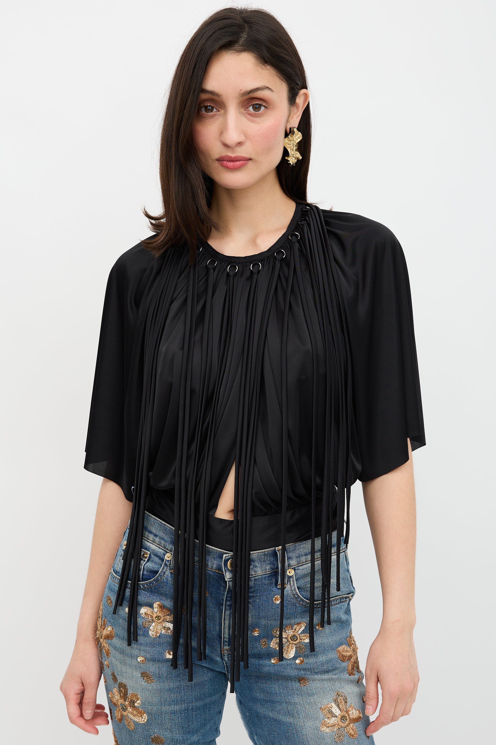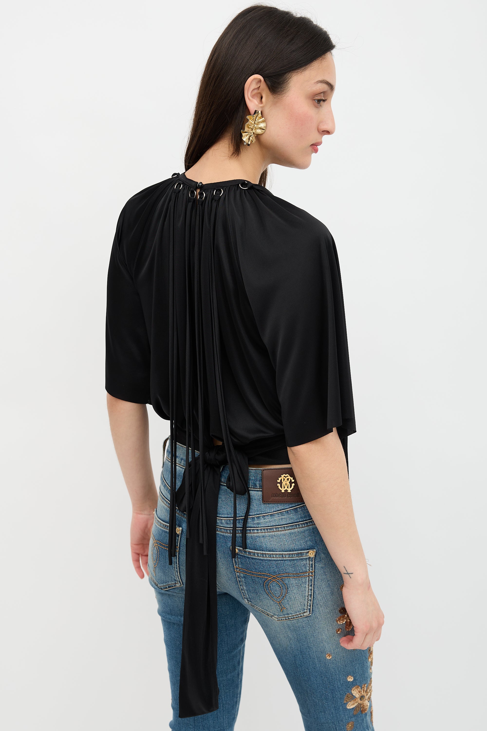 Pre-owned Rachel Comey black satin top featuring round neckline, fringe collar, cutout back collar with button closure, half sleeves, and ruched tie waist.