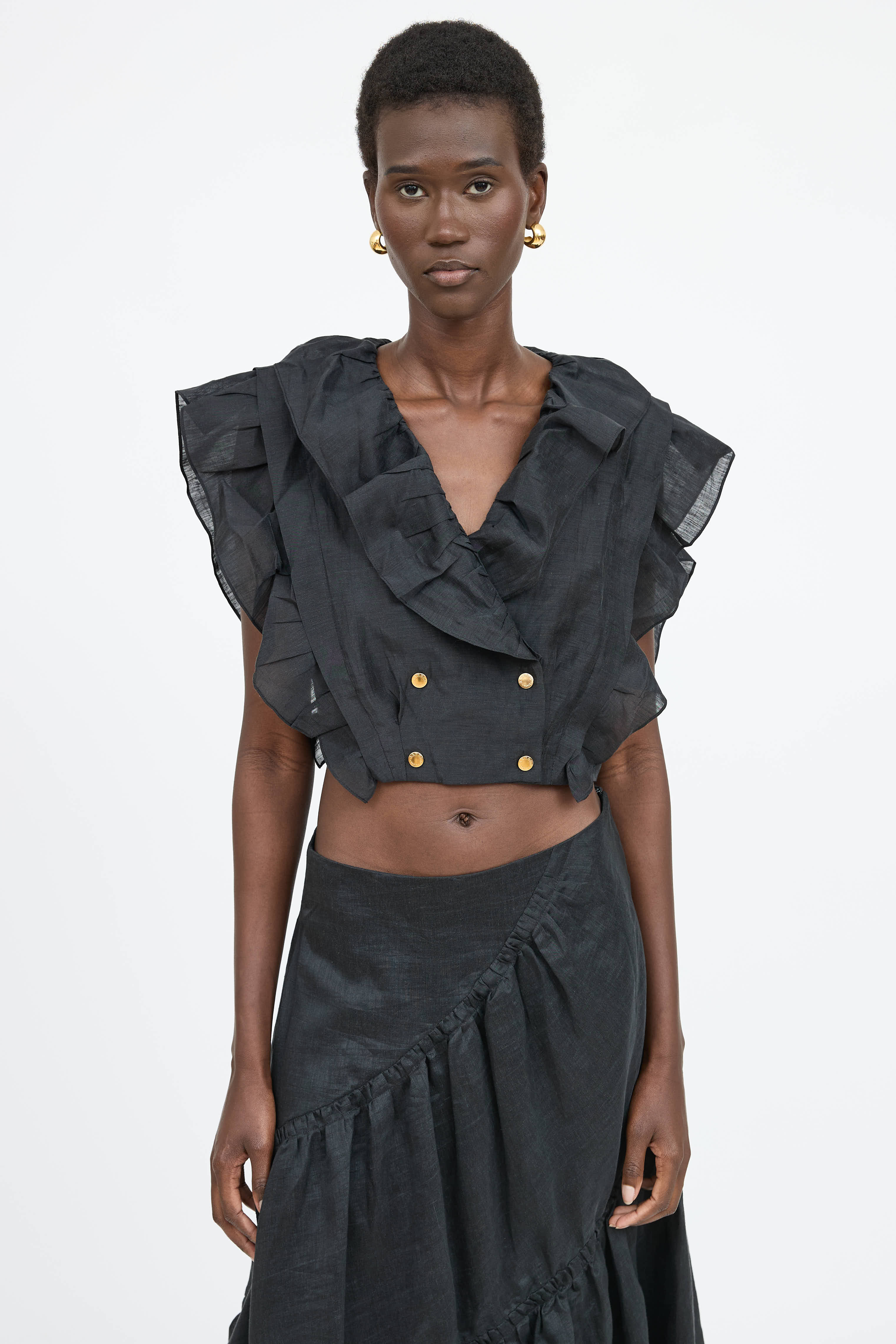 Pre-owned Sandro black sleeveless linen top featuring v-neckline, gold tone embellishments at front, and exaggerated ruffle trim throughout.