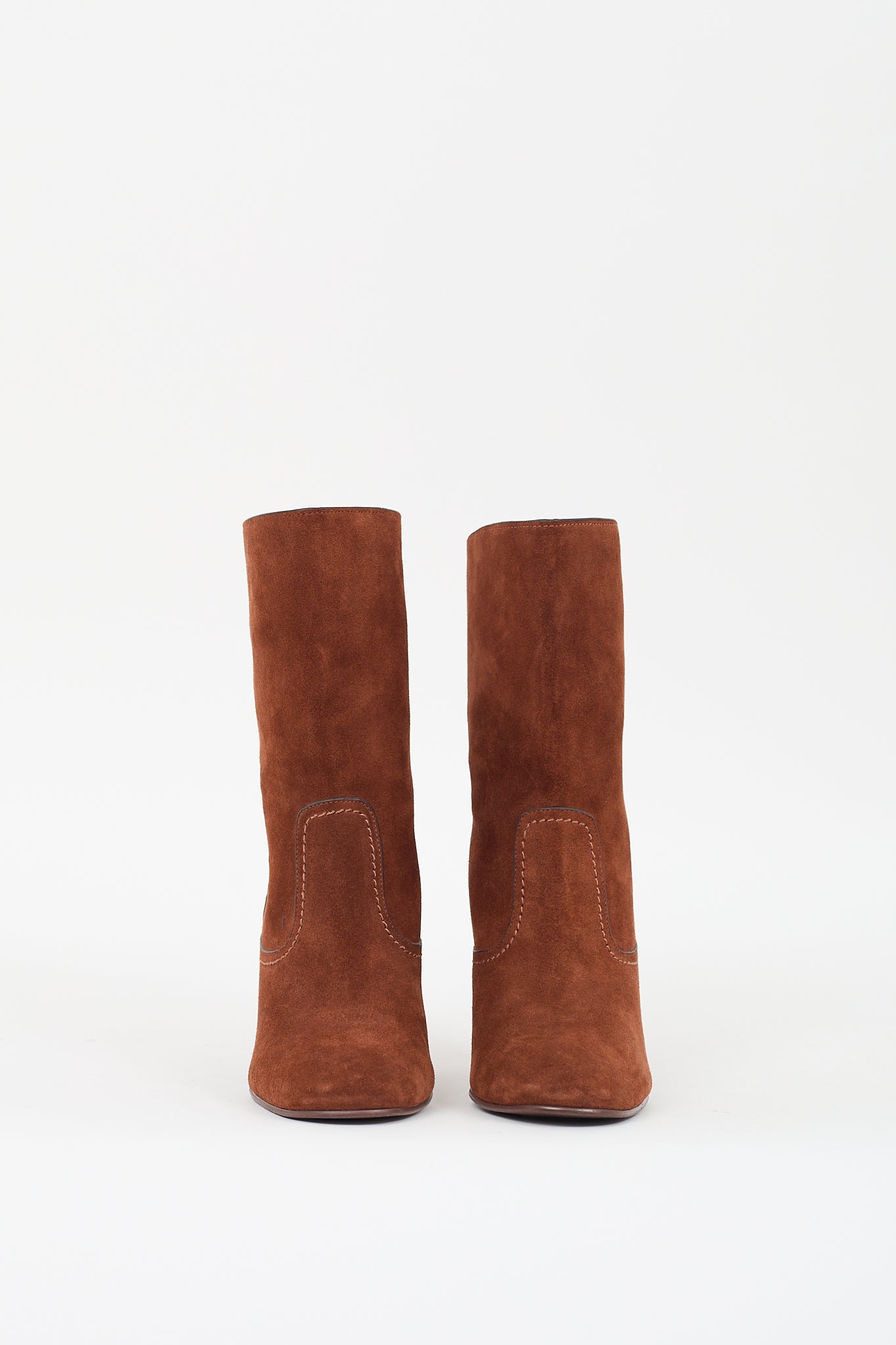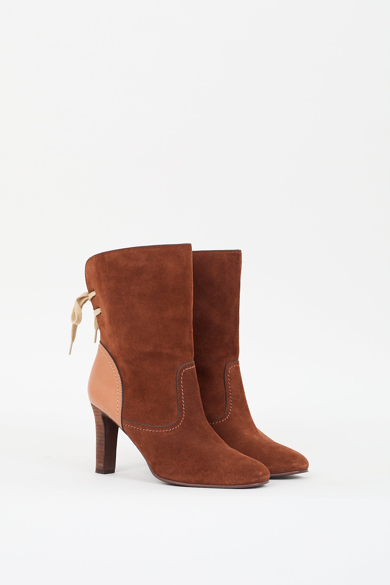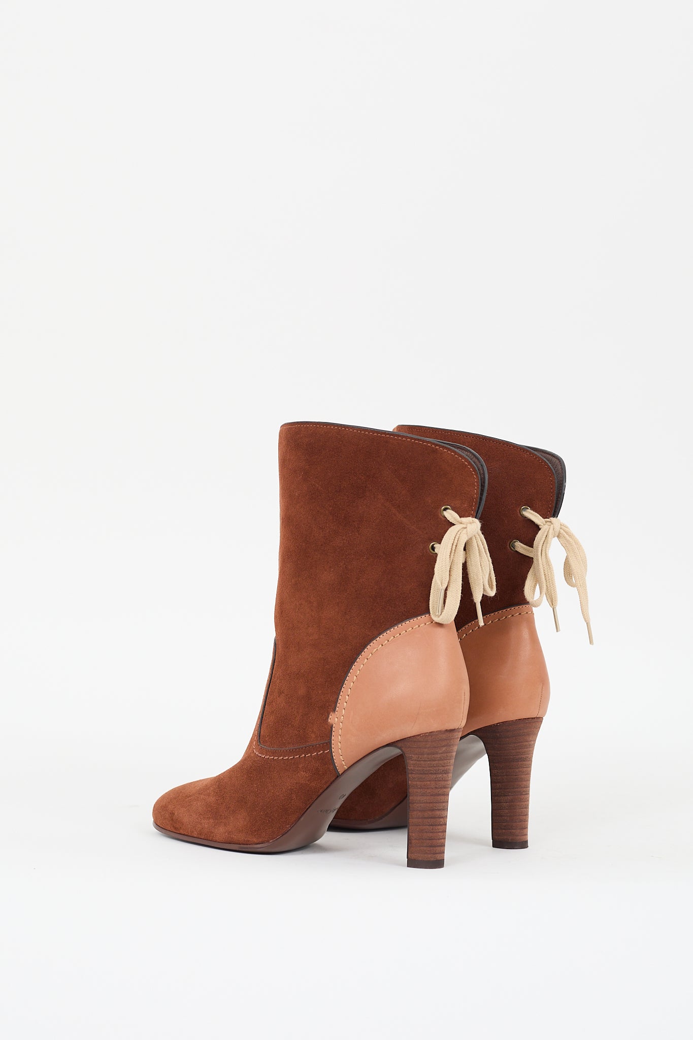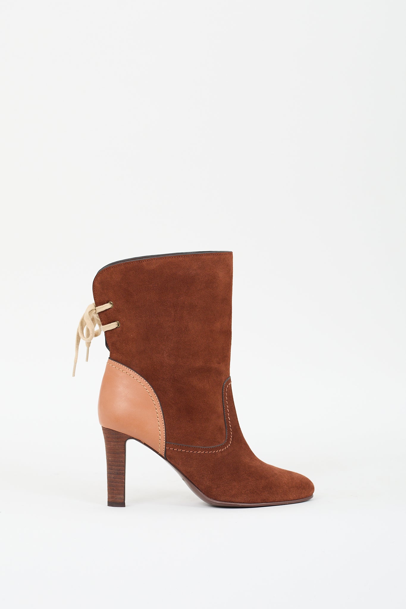 Pre-owned See By Chloé brown suede ankle boots featuring rounded toe, light brown heel counter, lace detail at back, and stacked slim block heel.