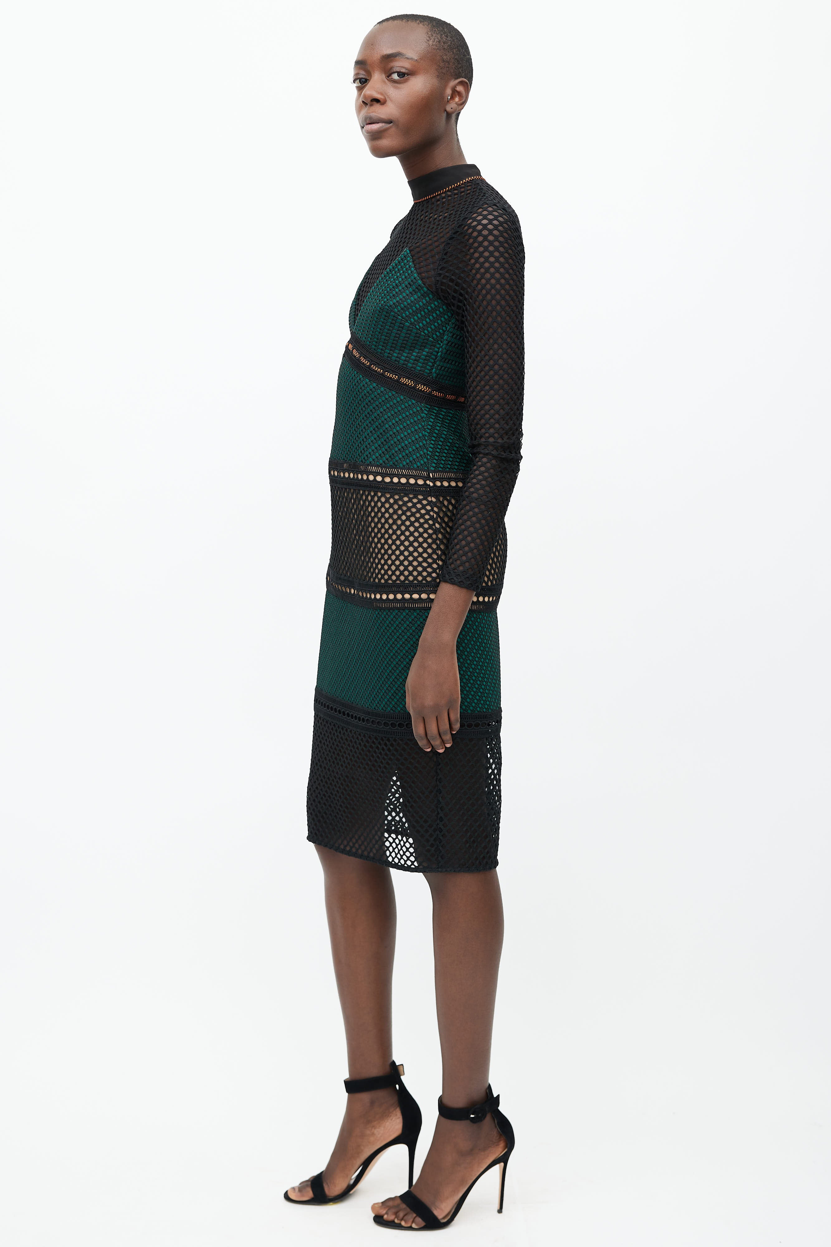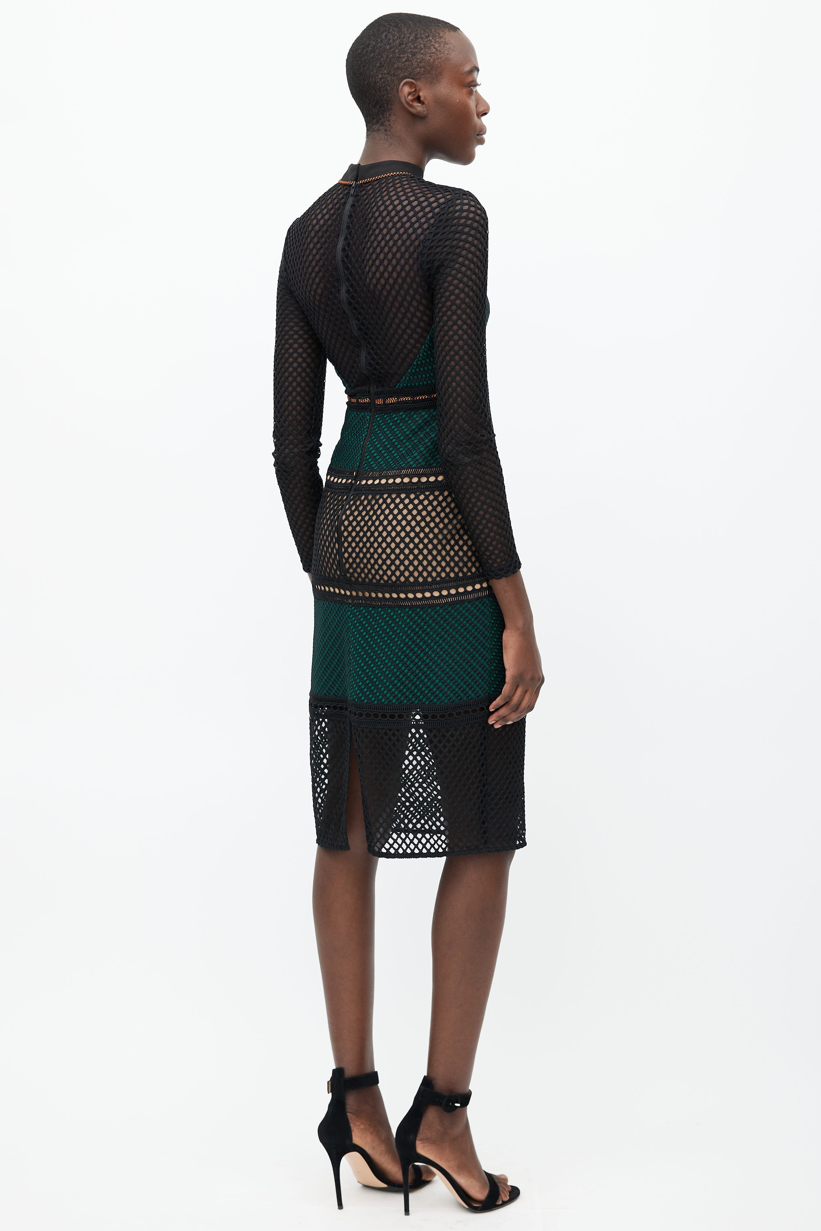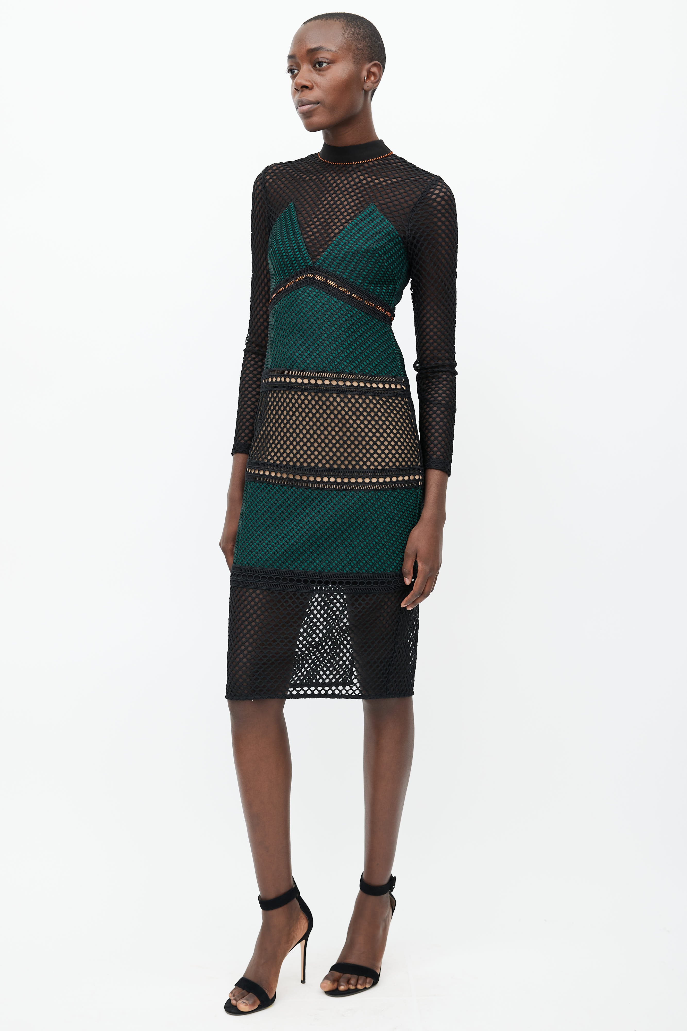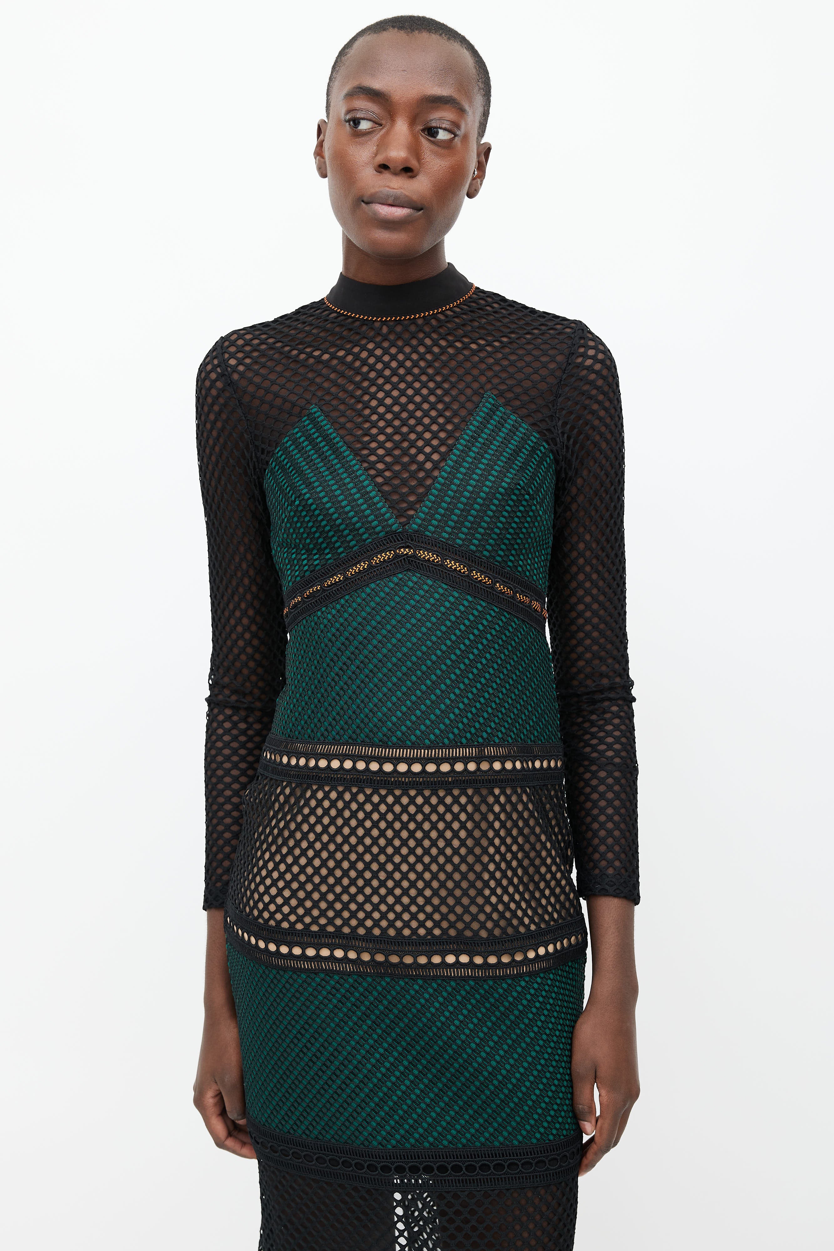 Pre-owned Self-Portrait black and green color-block dress featuring netted lace pattern throughout, mock neck collar, green sweetheart neckline, long sleeves, green paneling at bodice and mid-thigh, orange and black trim at bust and collar, and exposed black zip closure at back. Half-lined interior.