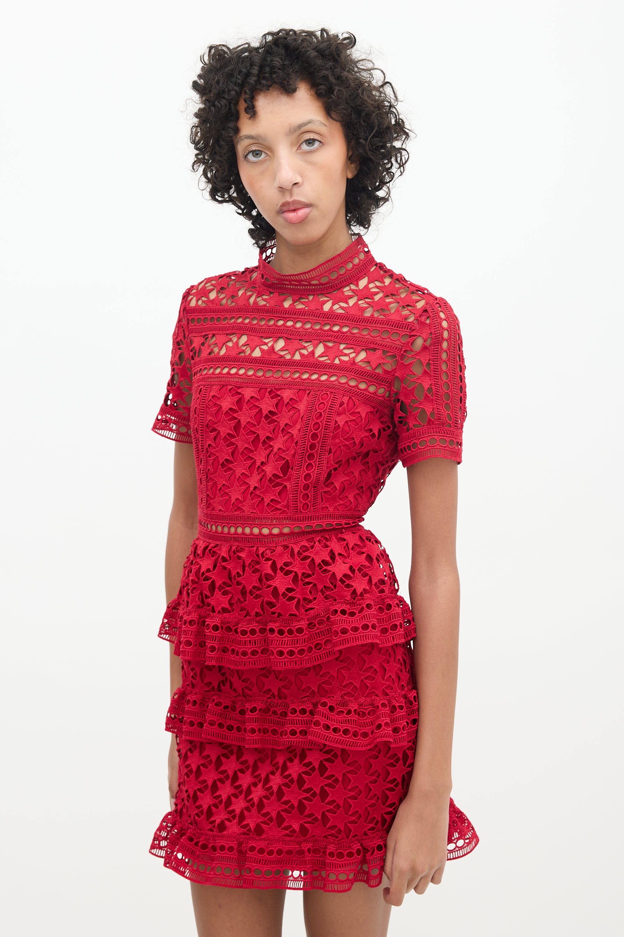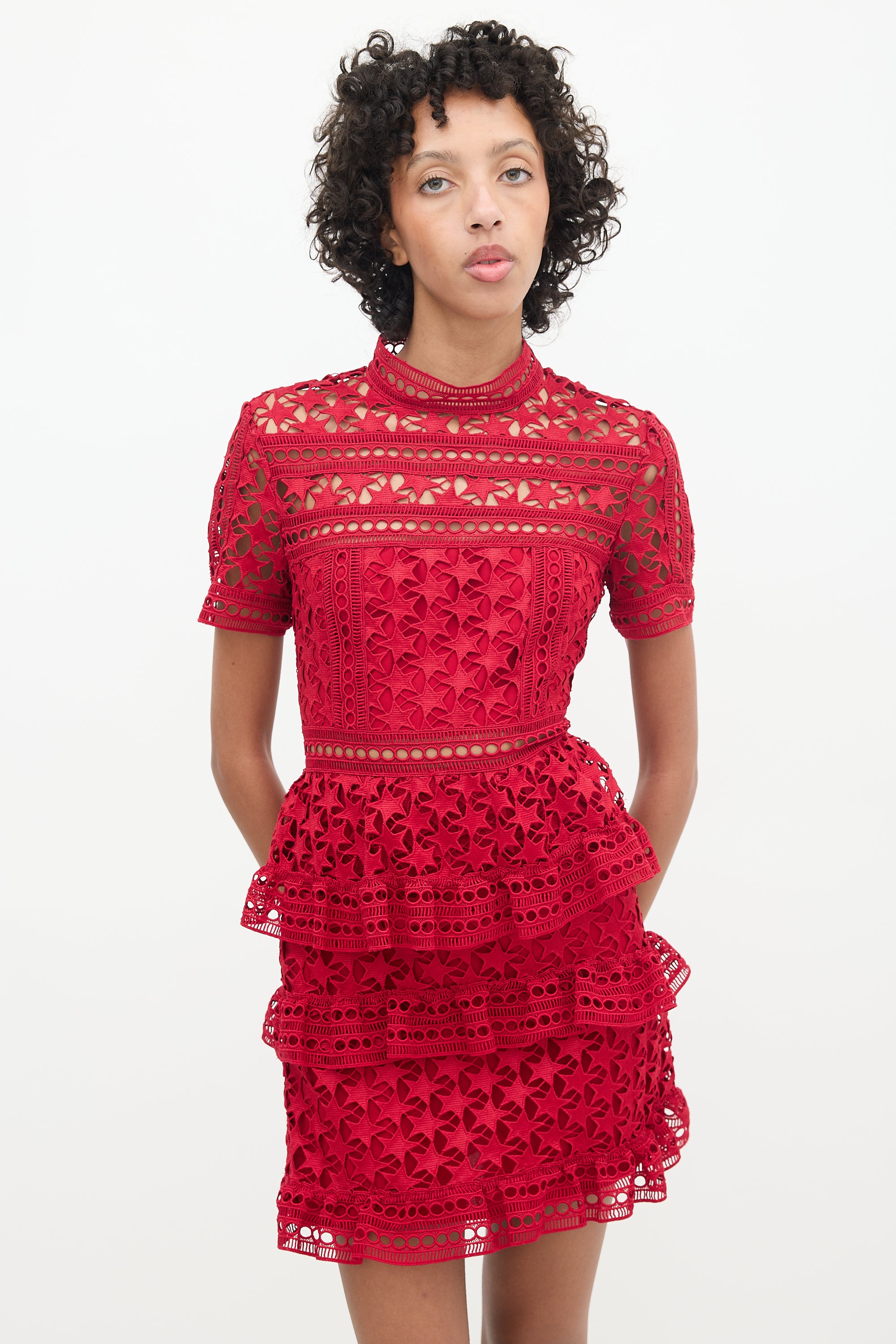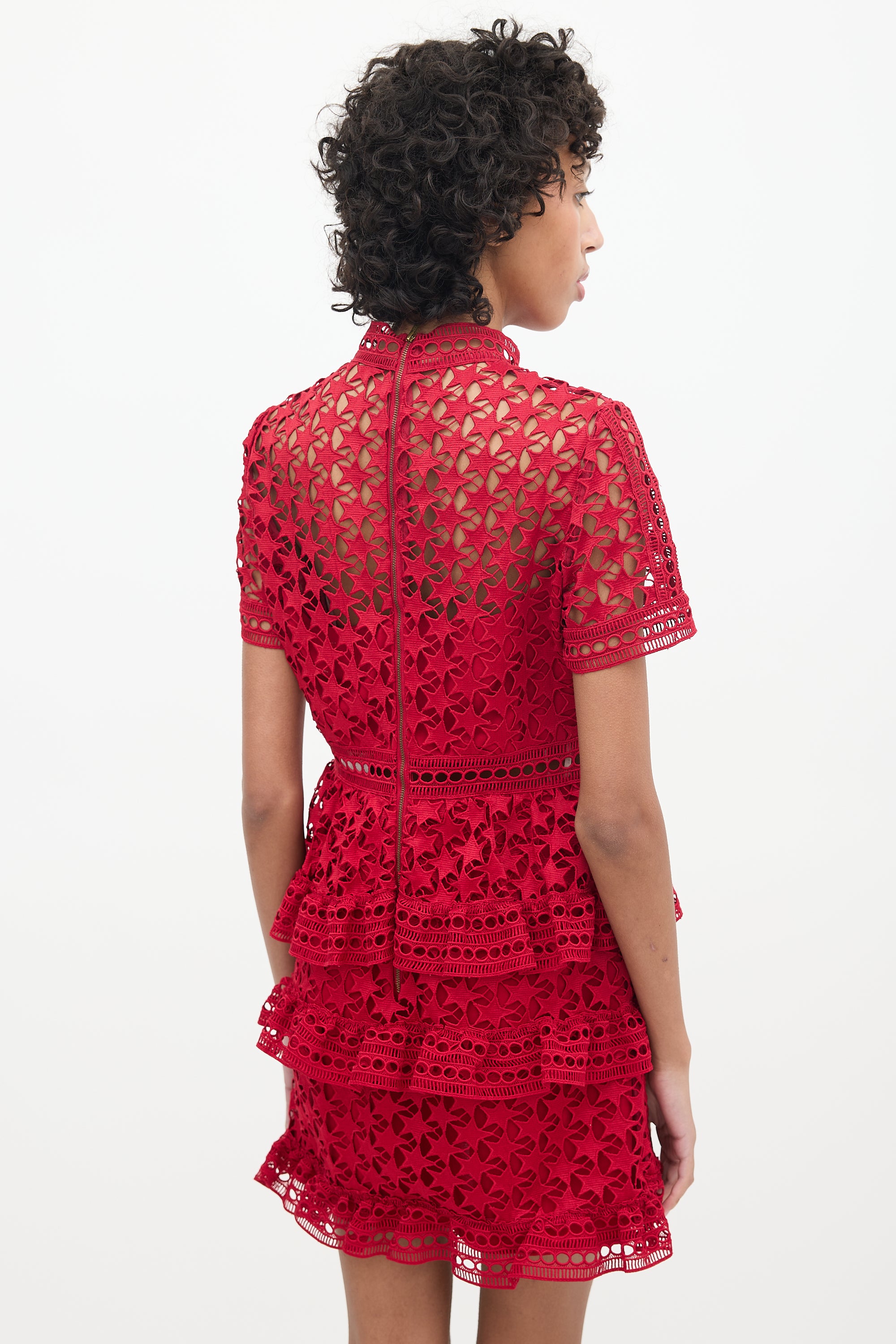 Pre-owned Self-Portrait red dress featuring a mock neck collar, star lace detailing, short sleeves, ruffled skirt, and zip at back with hook and eye closure. Lined. Clipped to fit model.