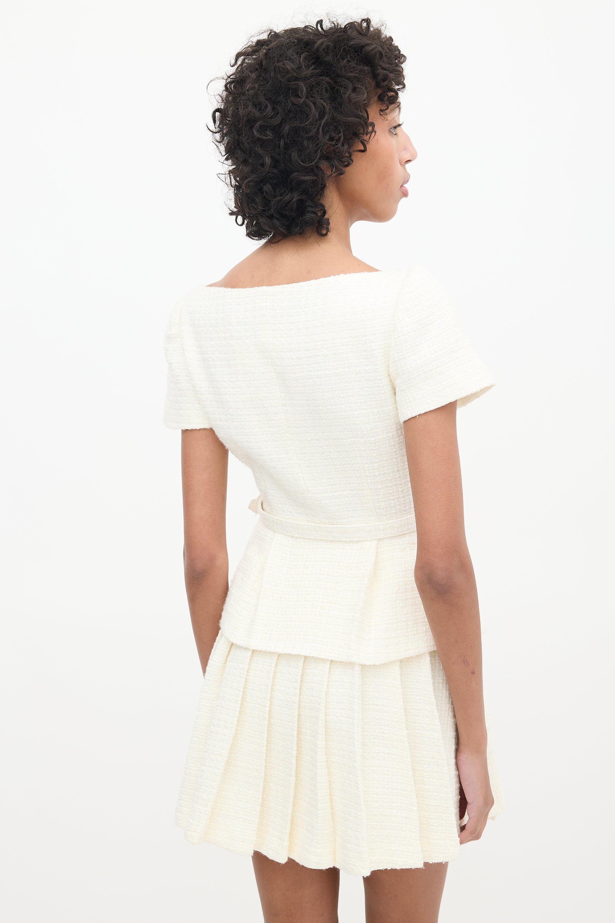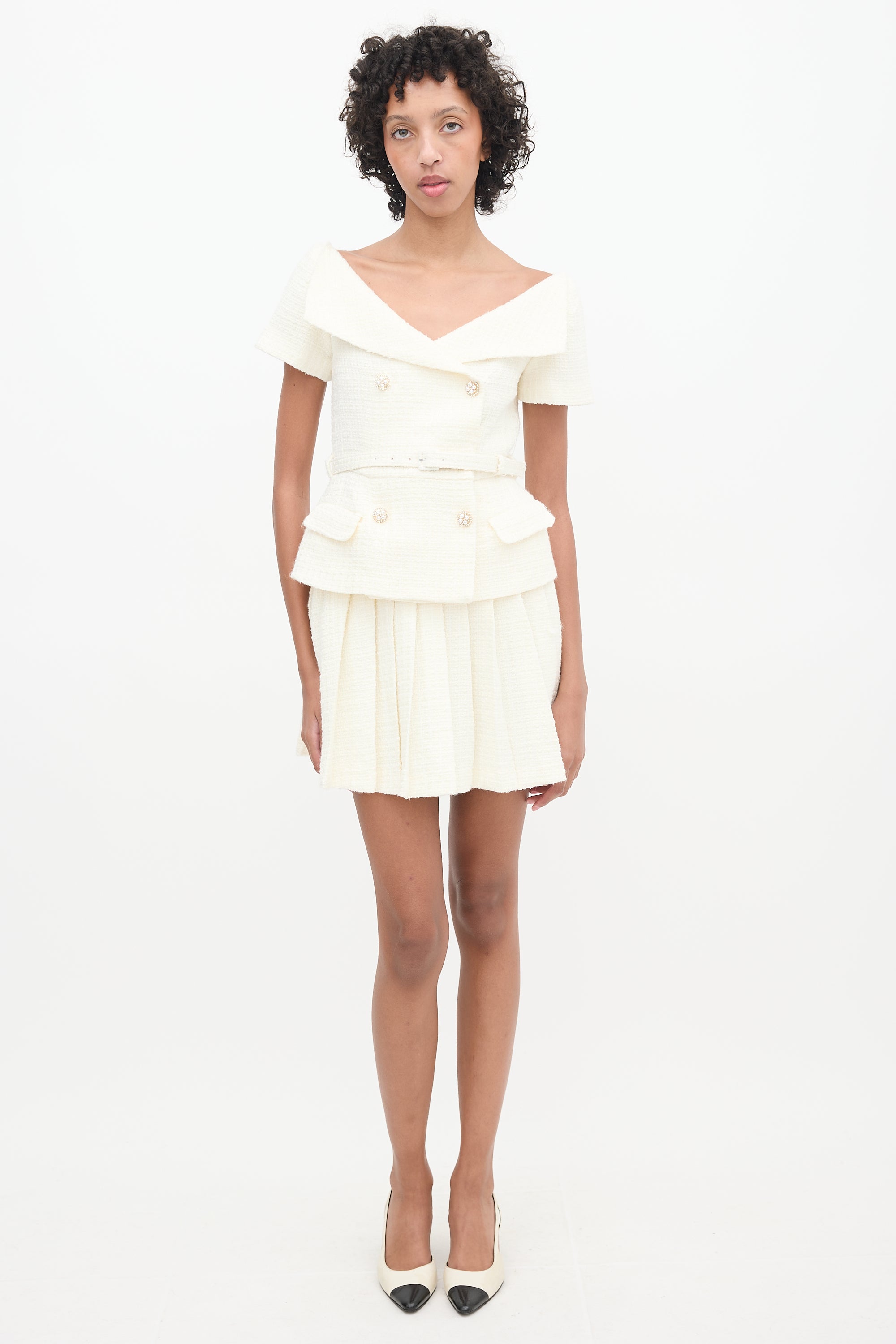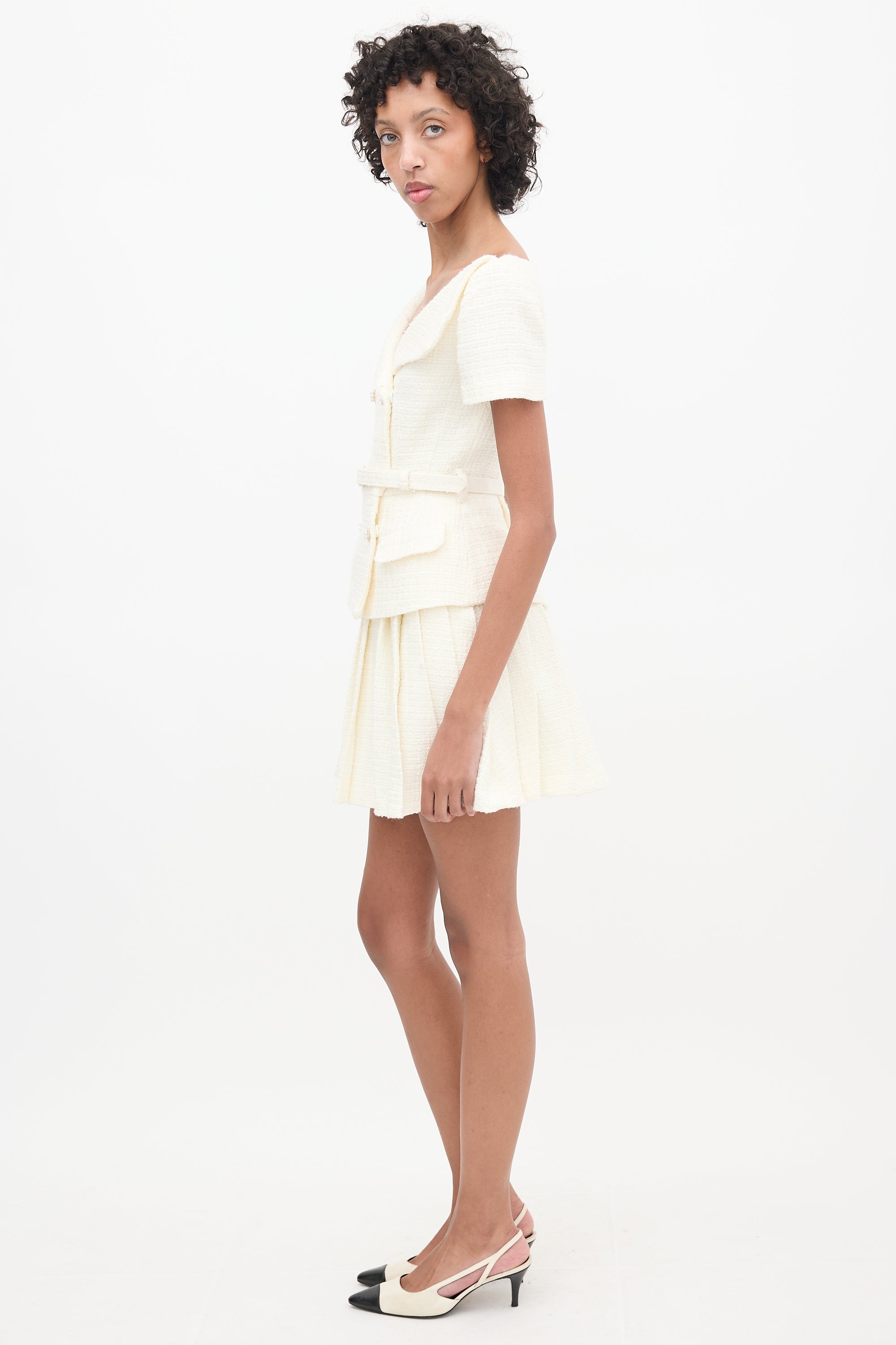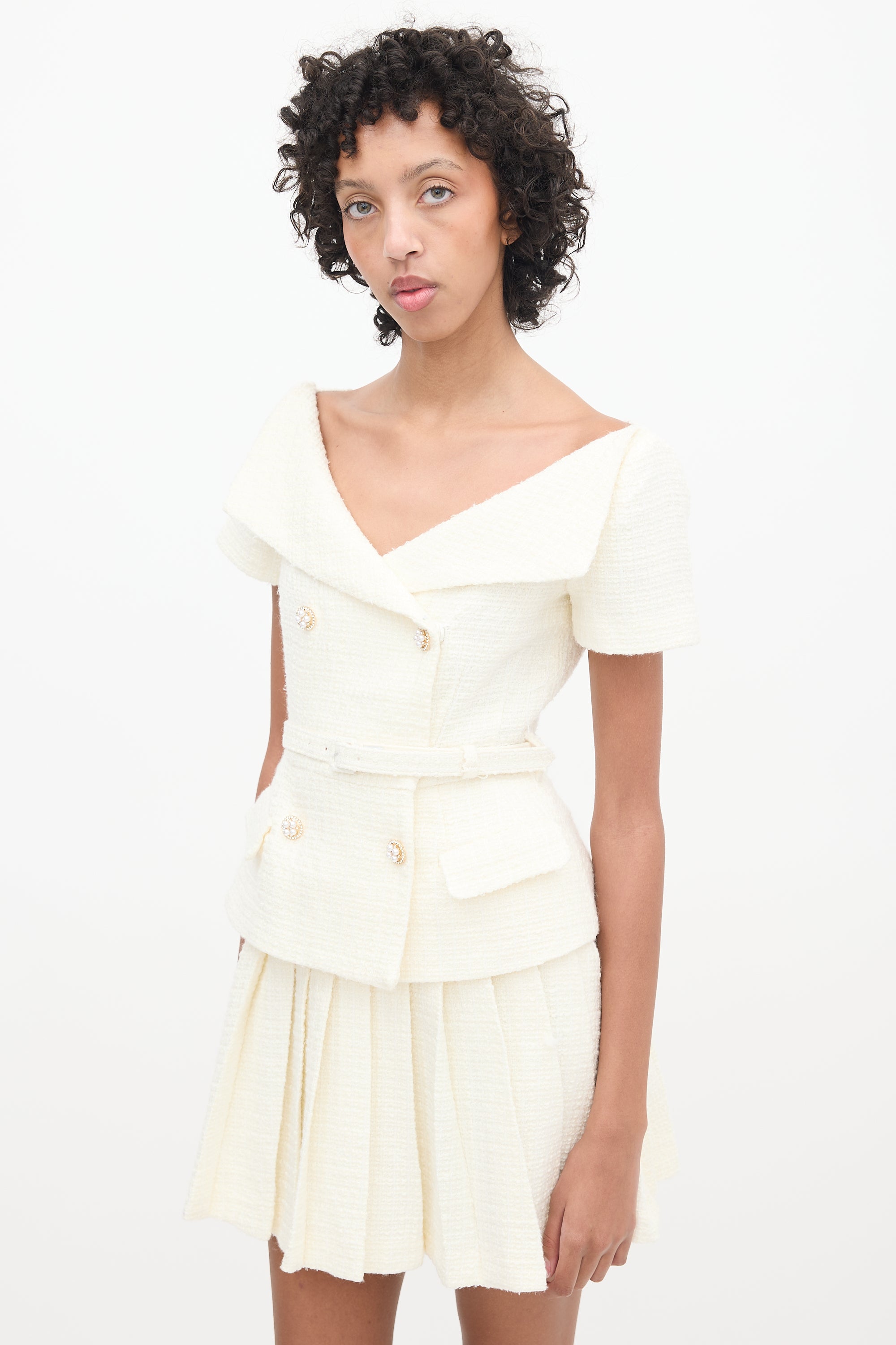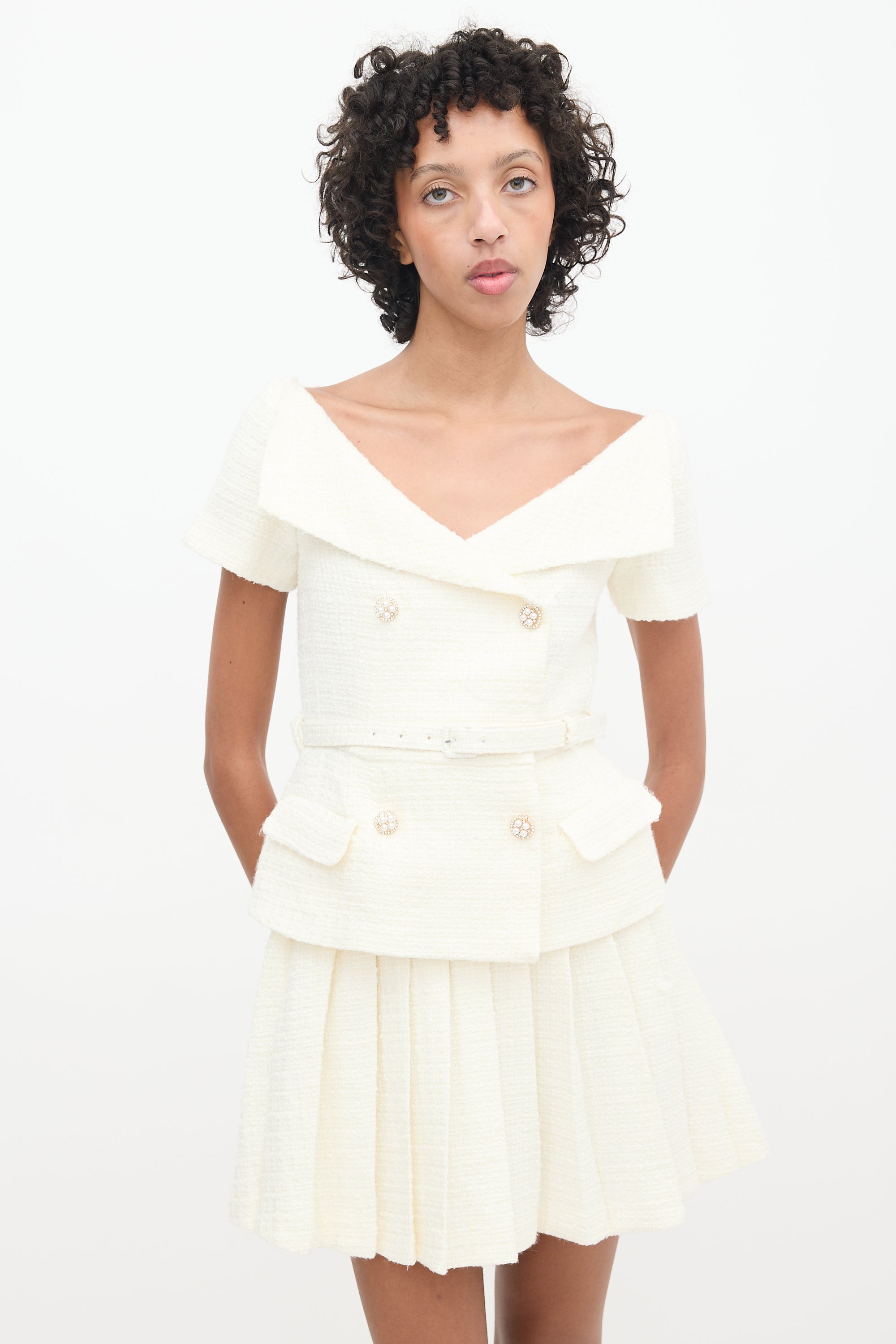 Pre-owned Self-Portrait white tweed midi dress featuring a V-neck open collar, short sleeves, two flap pockets at hip, pleated skirt, adjustable belt at waist, double breasted jewel encrusted button detail at front, and zip closure at side. Lined.