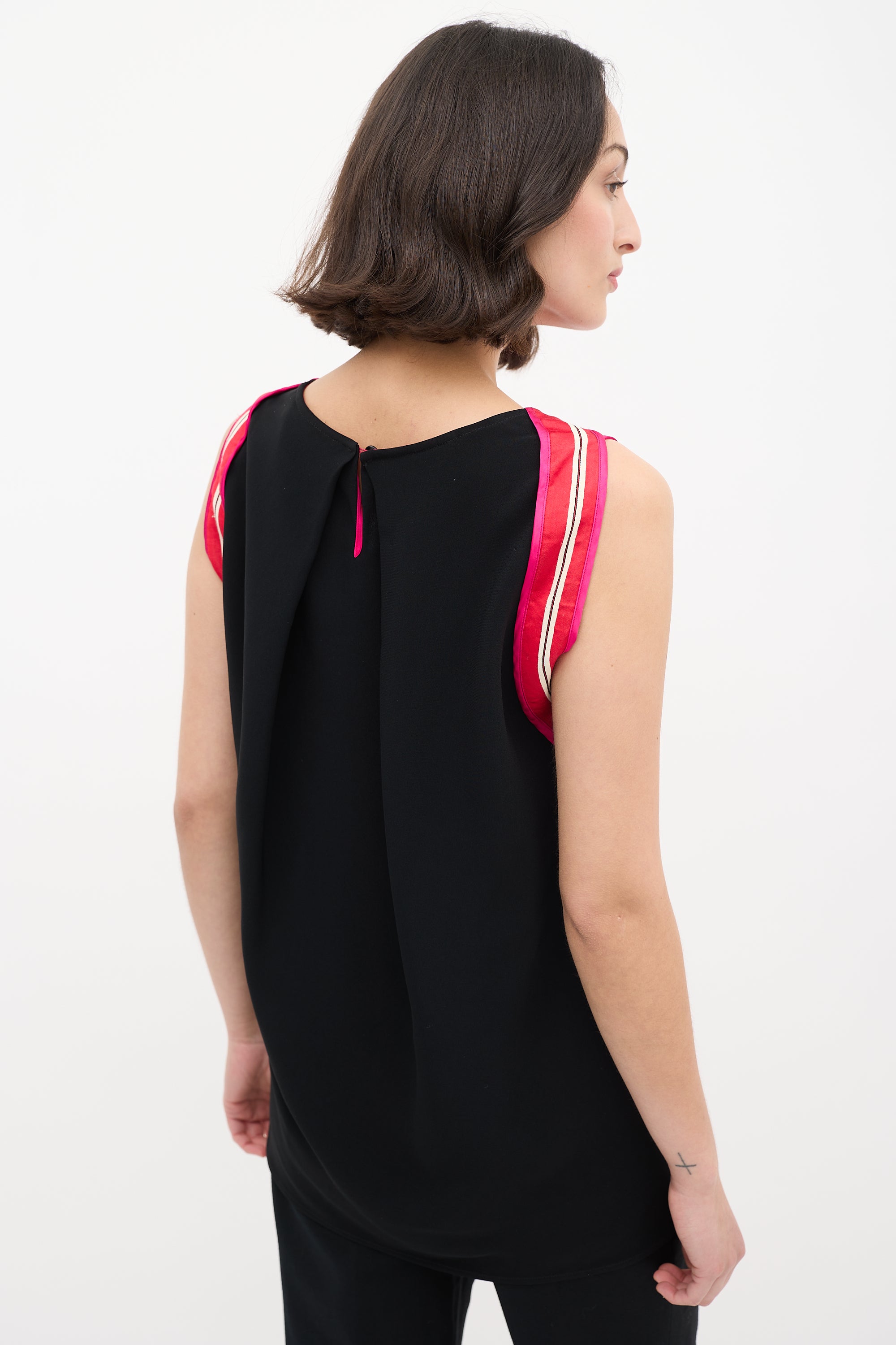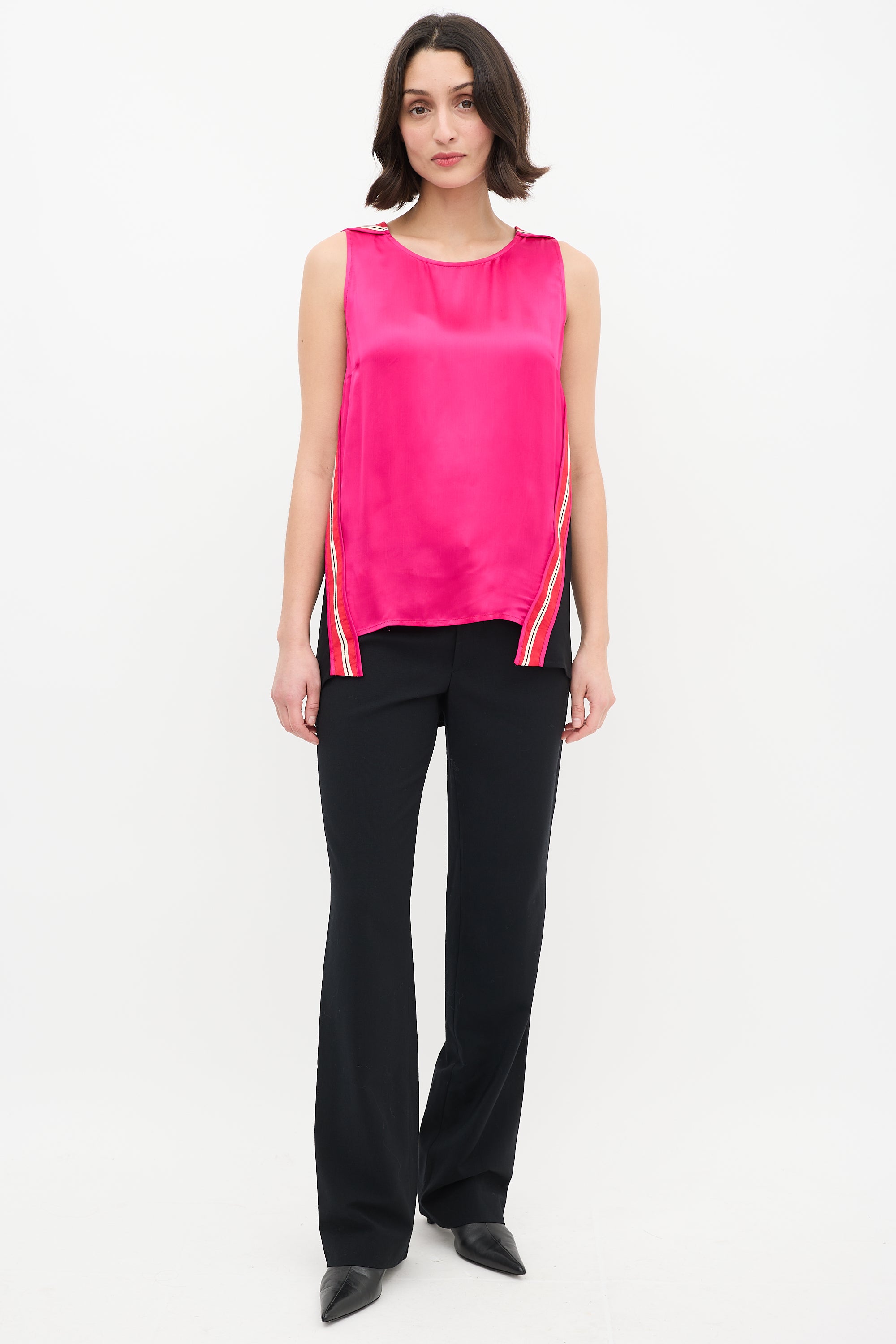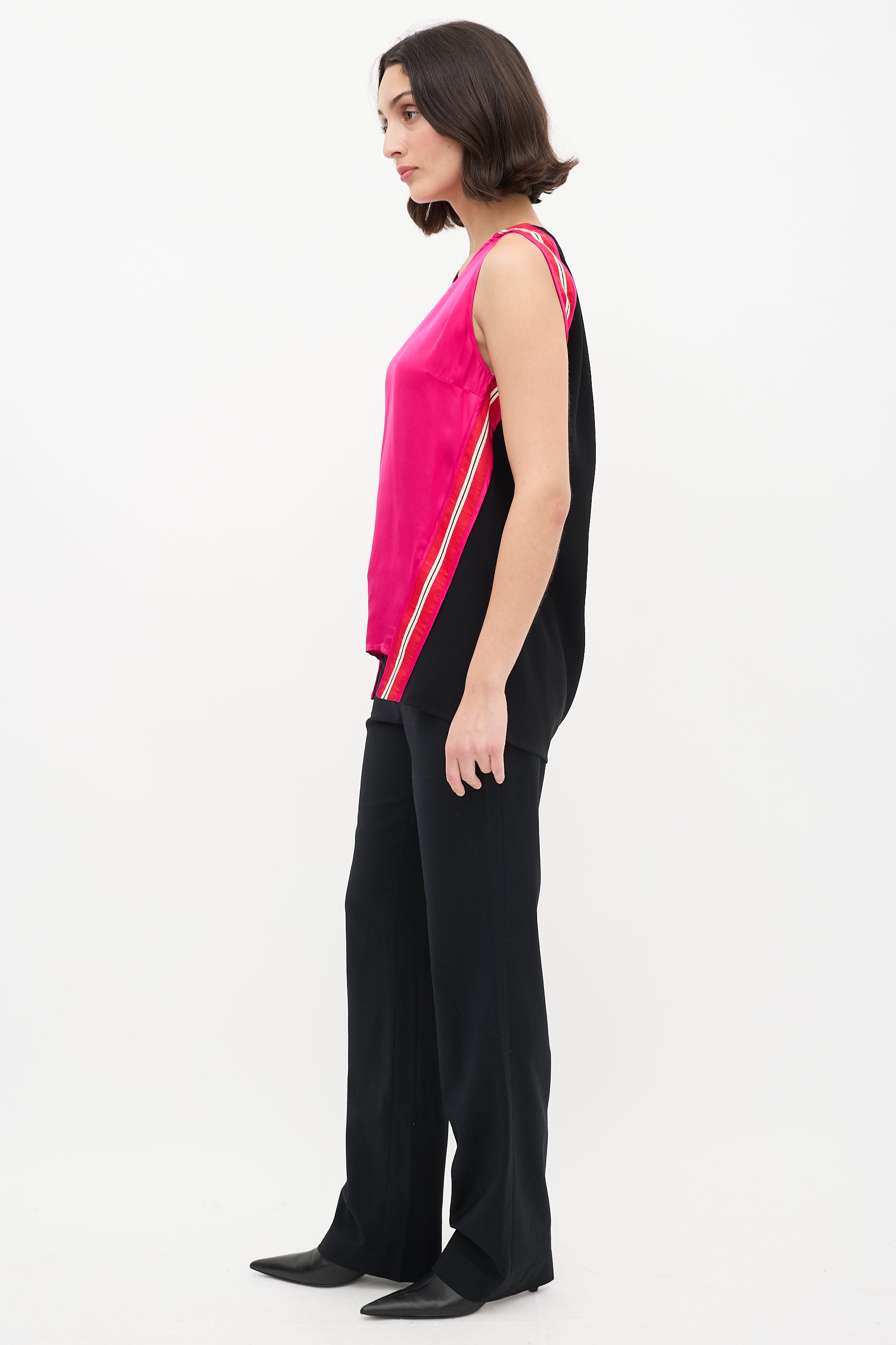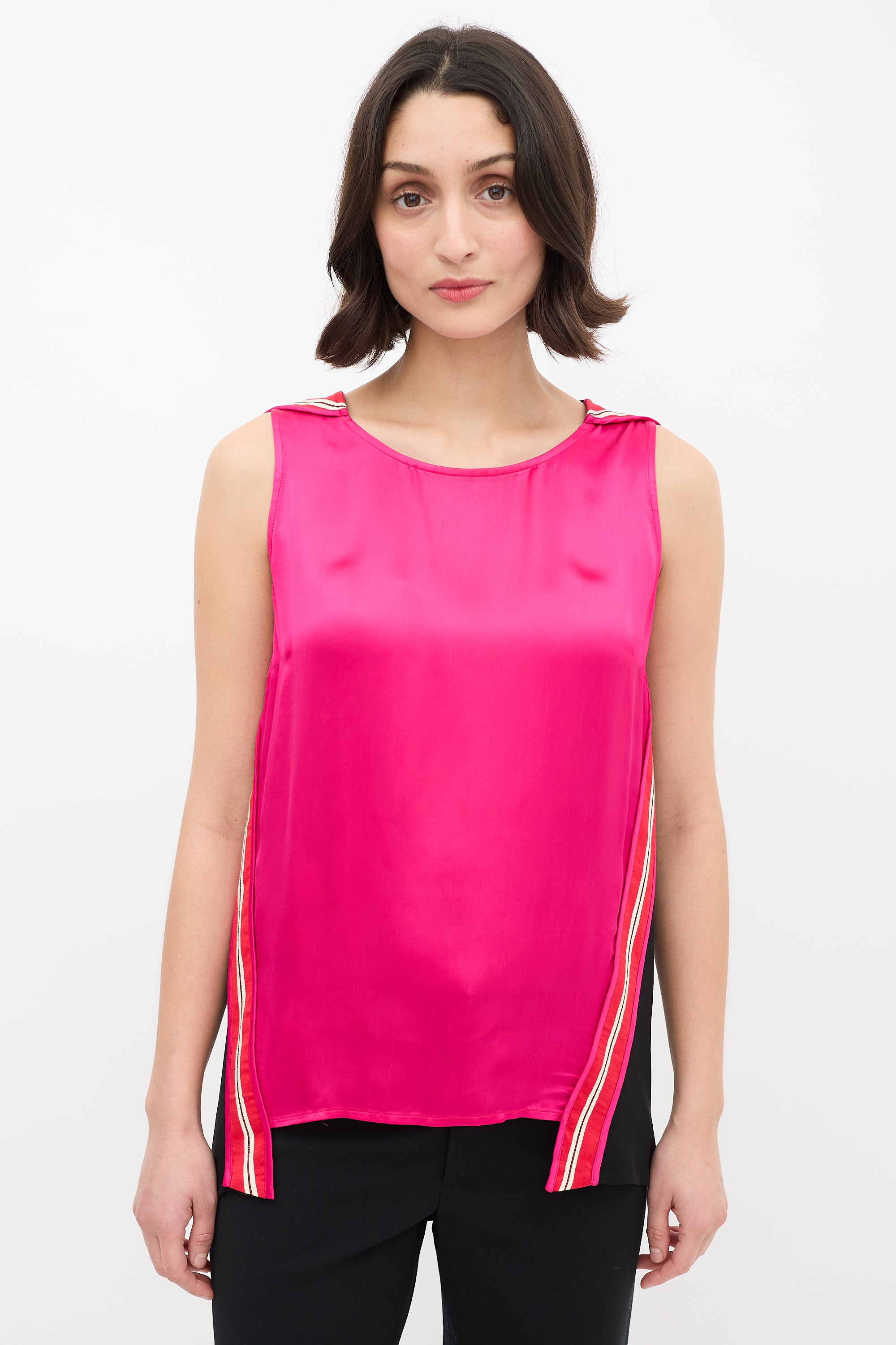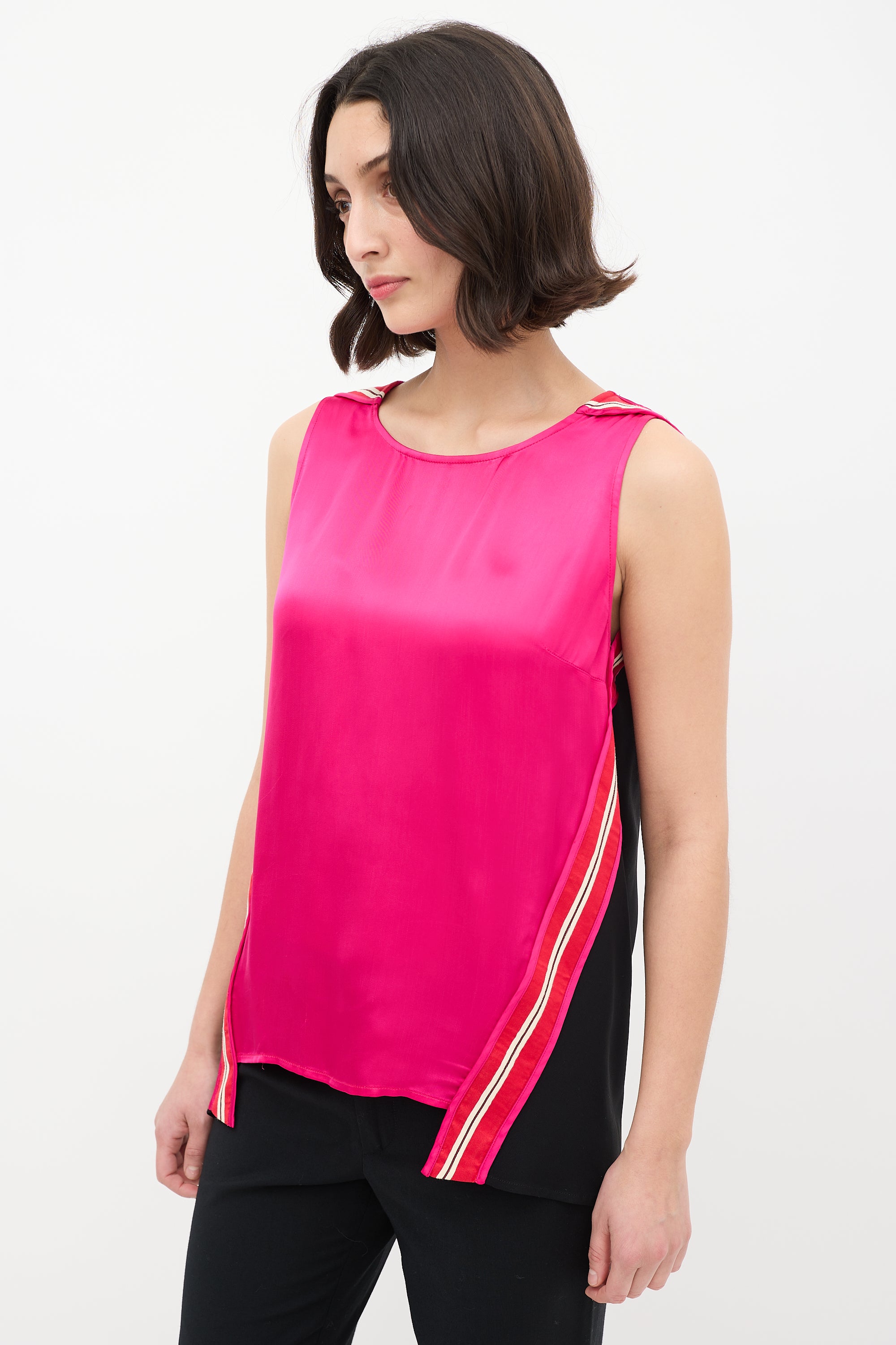 Pre-owned Stella McCartney fuchsia and multicolour satin tank top featuring a round neckline, box pleat at back neck with single button fastening, contrast cape design with stripe panels at sides, and high low hem.