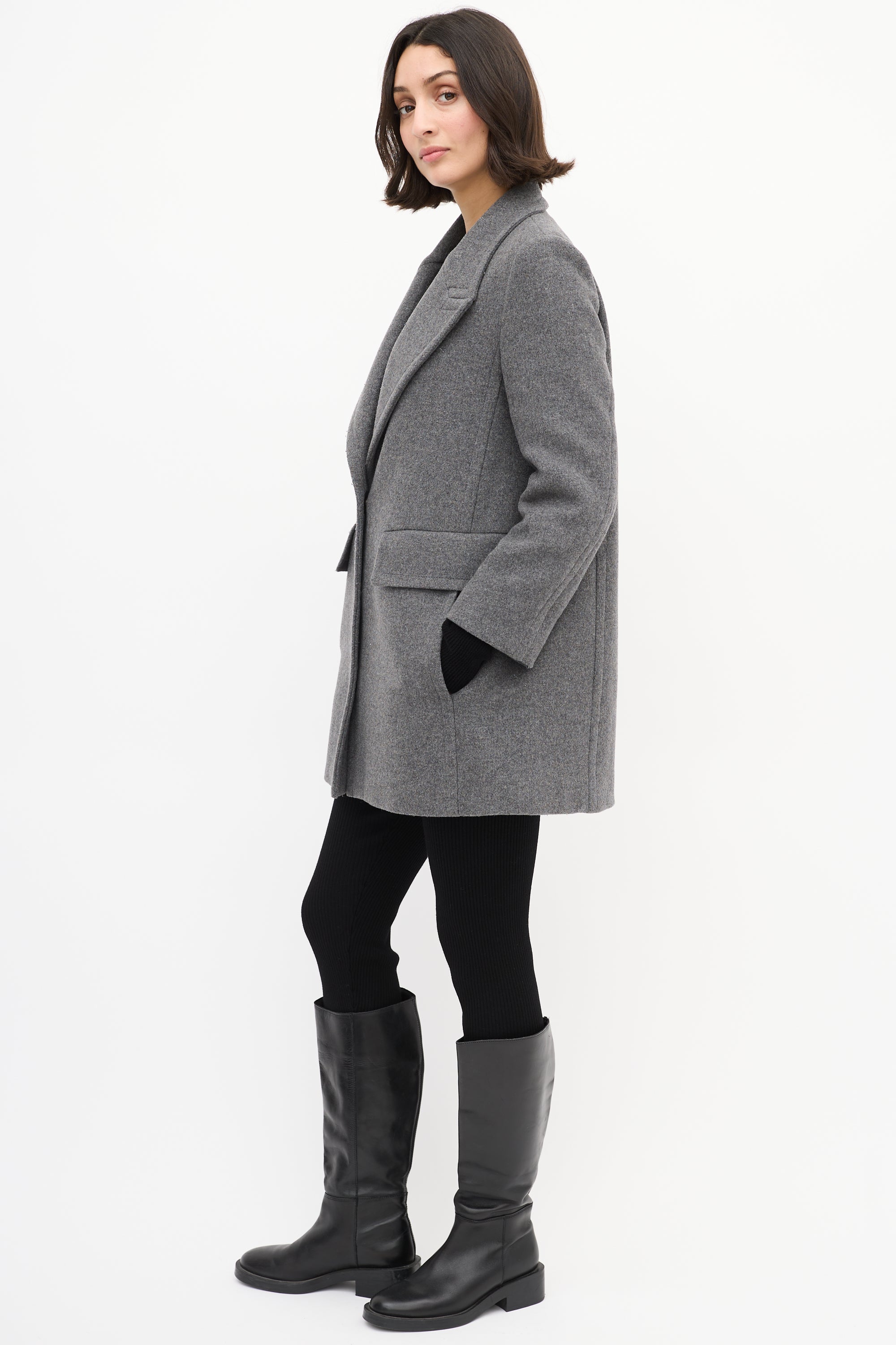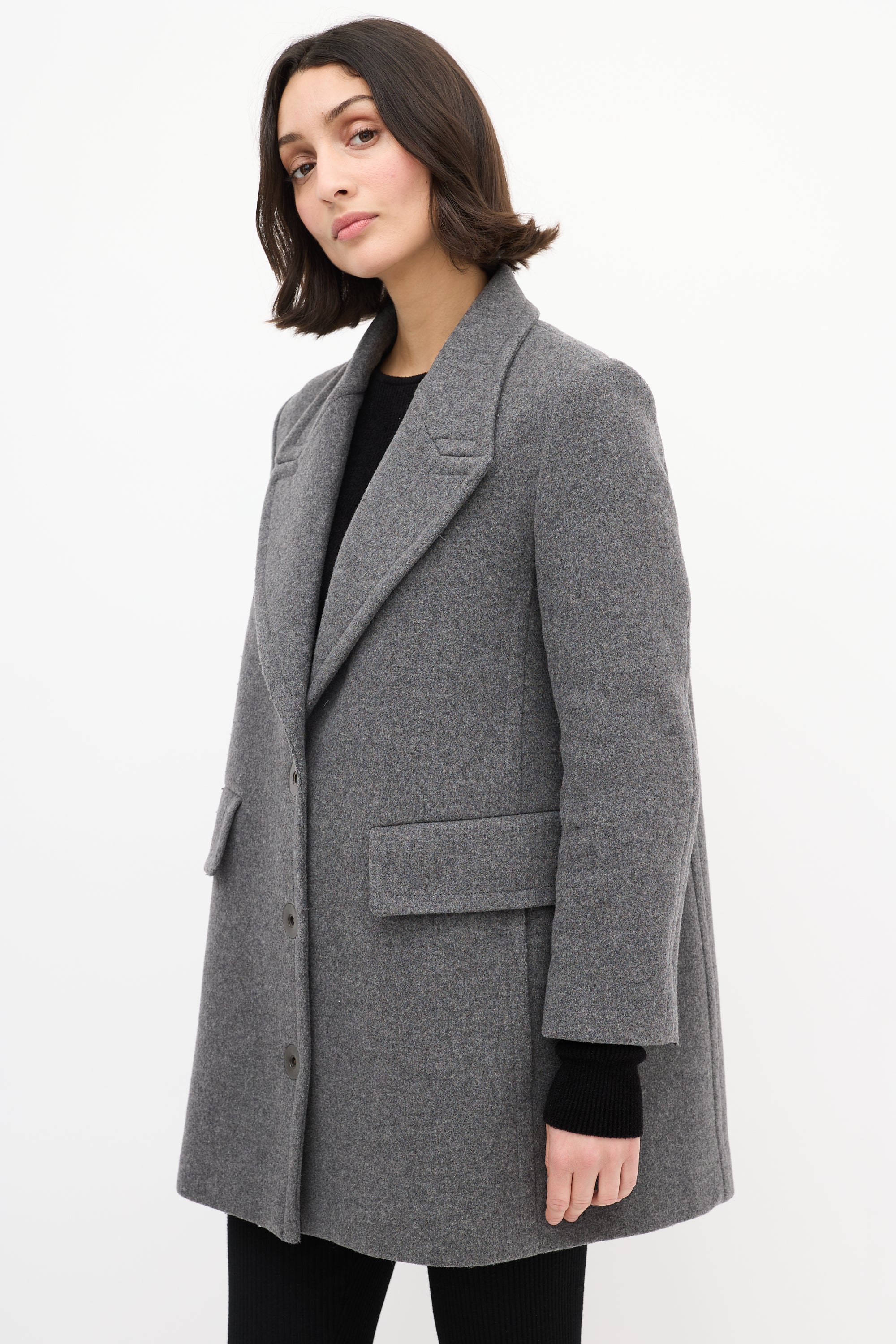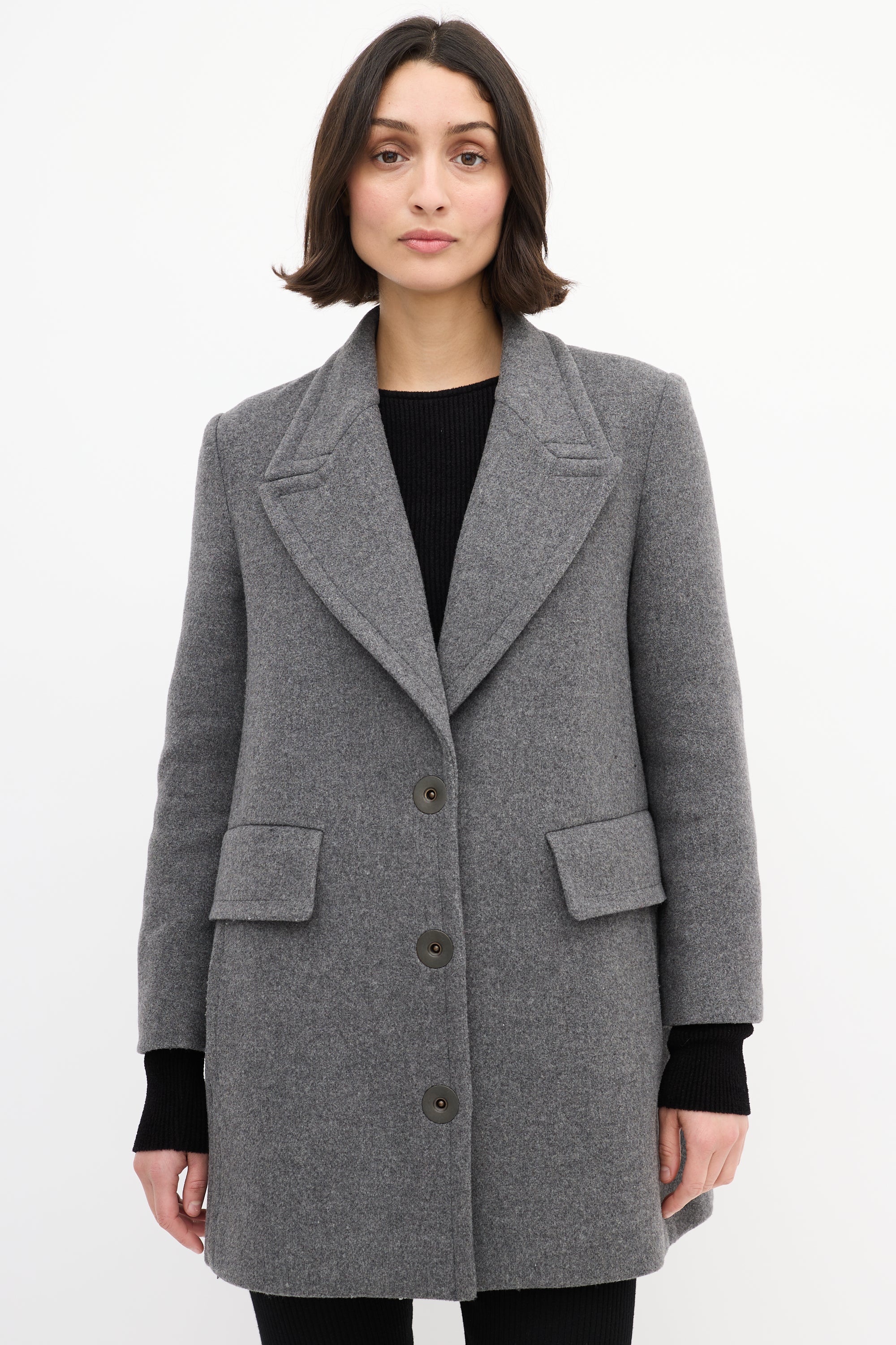 Pre-owned Stella McCartney grey wool blend mid length coat featuring a peak lapel, snap button up front closure, two flap pockets at front waist, two slash pockets at front hip, padded shoulders, and long sleeves. Lined.