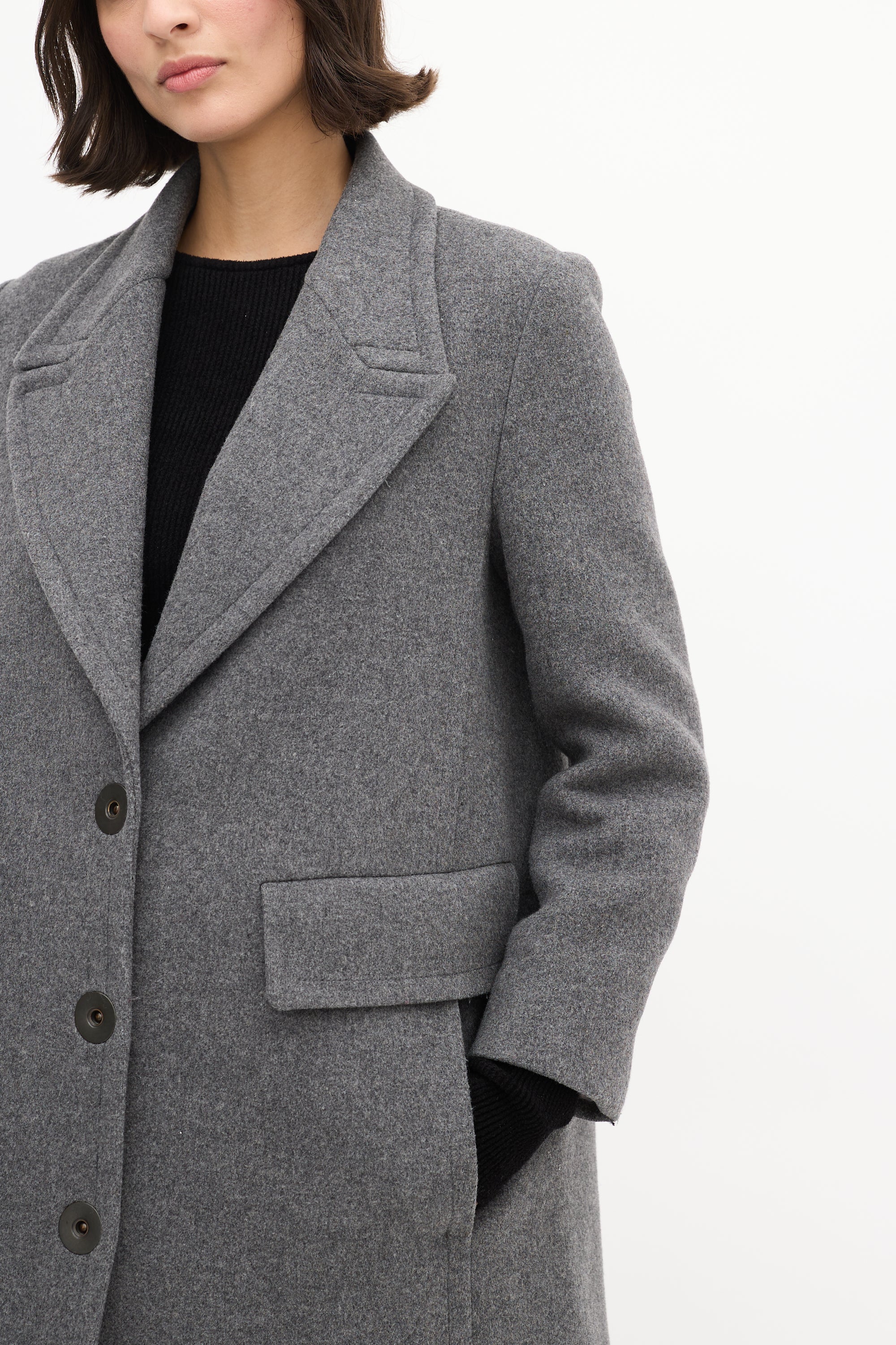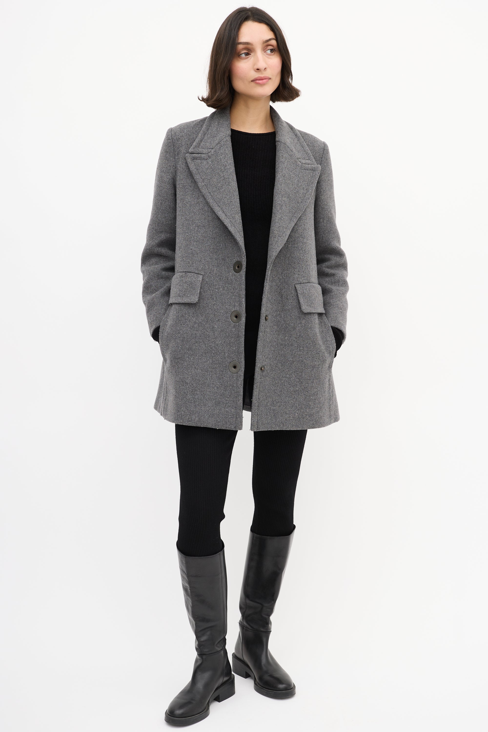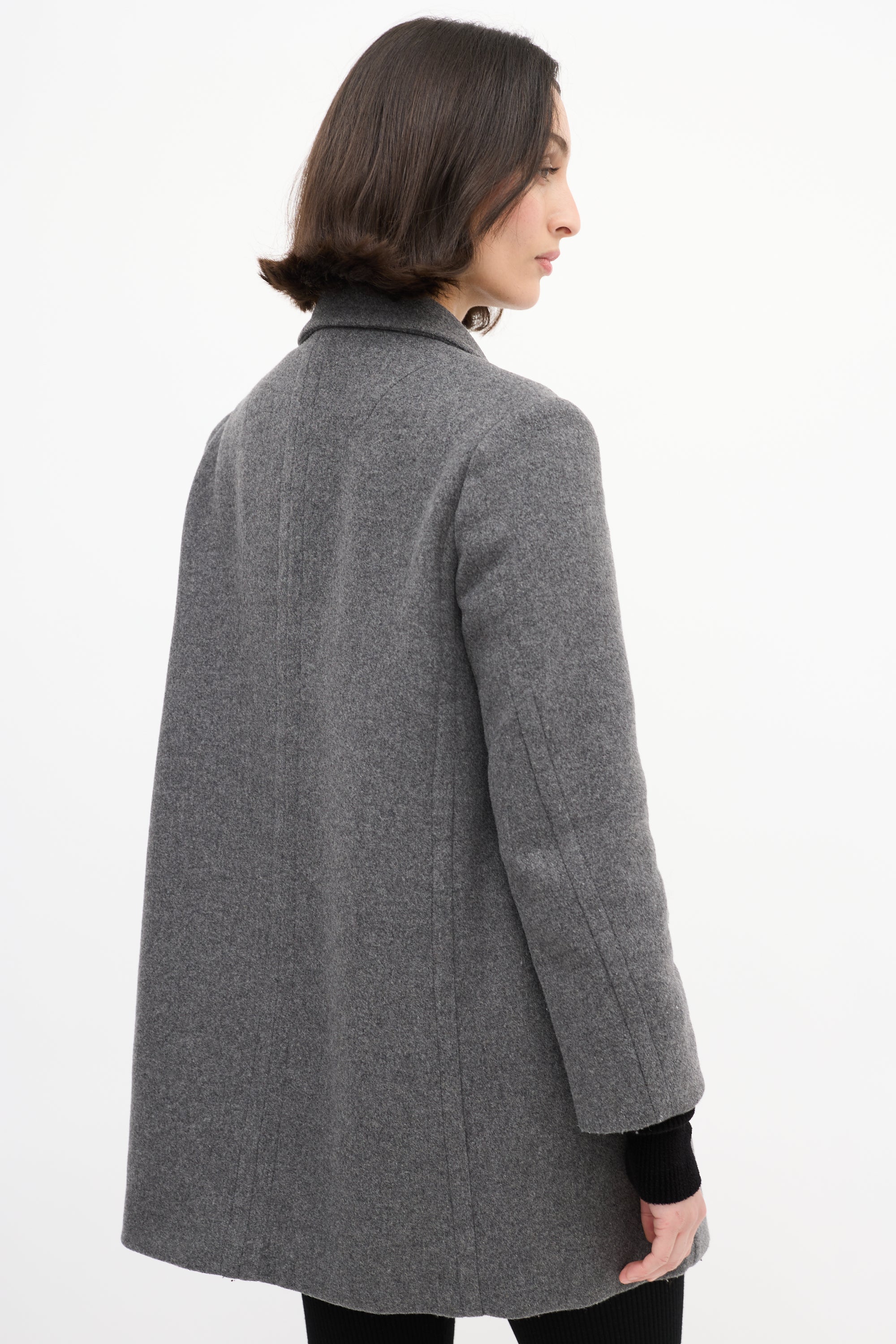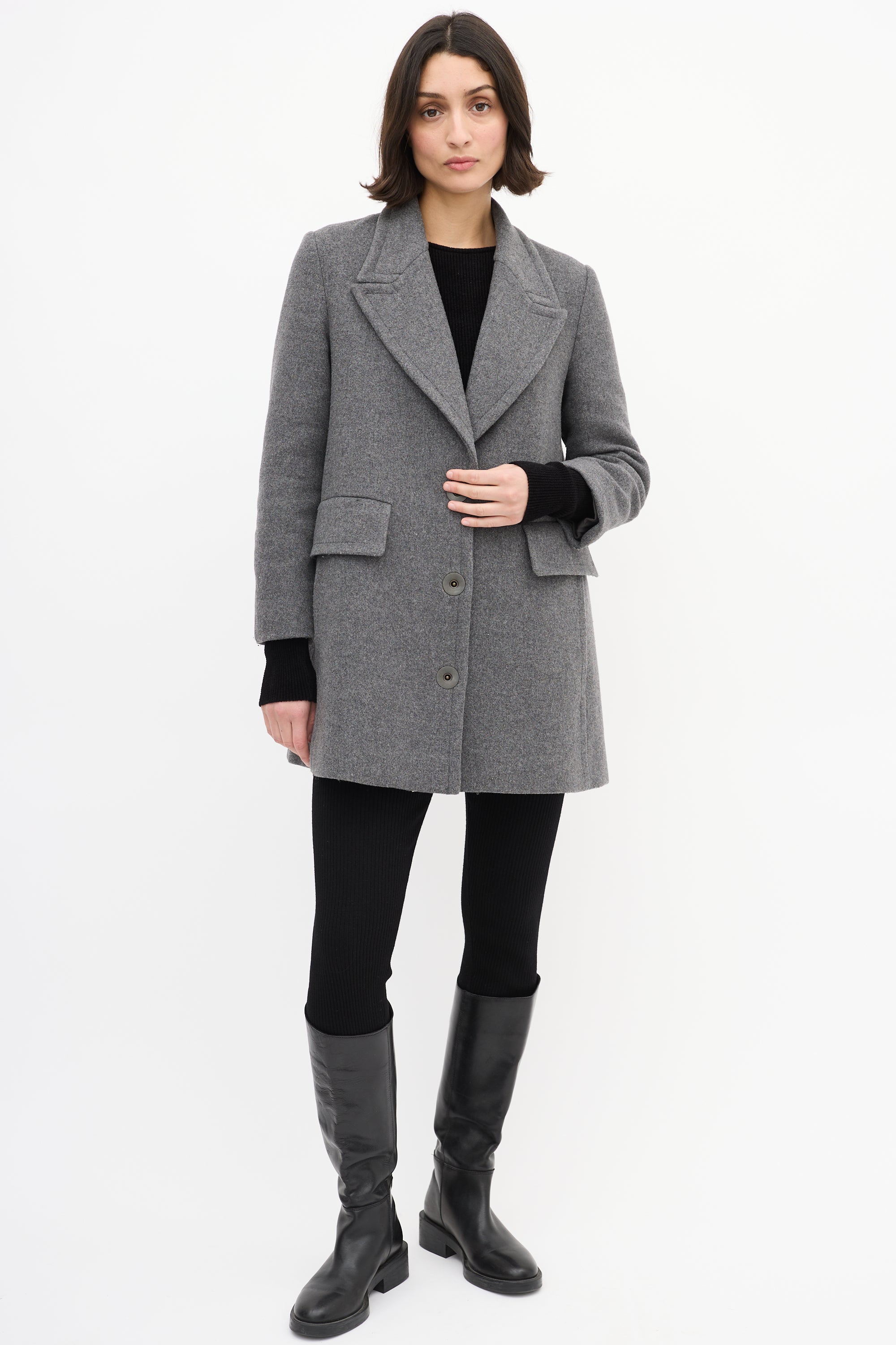 Pre-owned Stella McCartney grey wool blend mid length coat featuring a peak lapel, snap button up front closure, two flap pockets at front waist, two slash pockets at front hip, padded shoulders, and long sleeves. Lined.