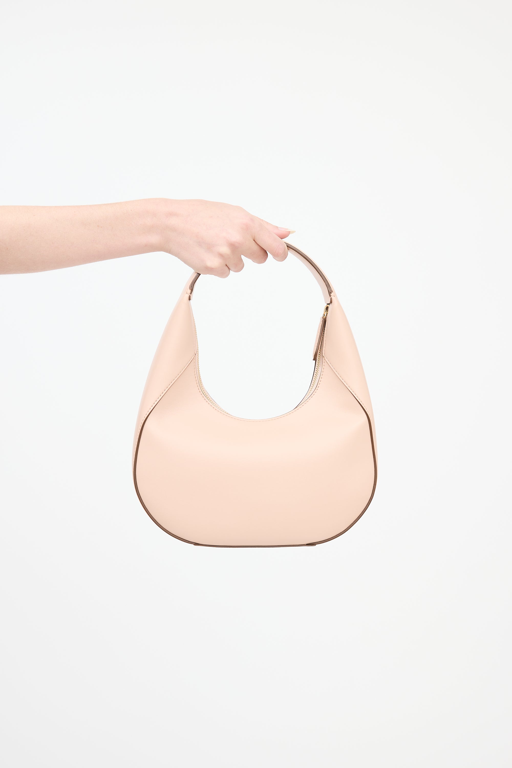 Pre-owned Stella McCartney pink faux leather Stella Logo shoulder bag featuring a flat top handle, curved gold tone zip closure, perforated medallion logo at front, and one interior zip pocket.