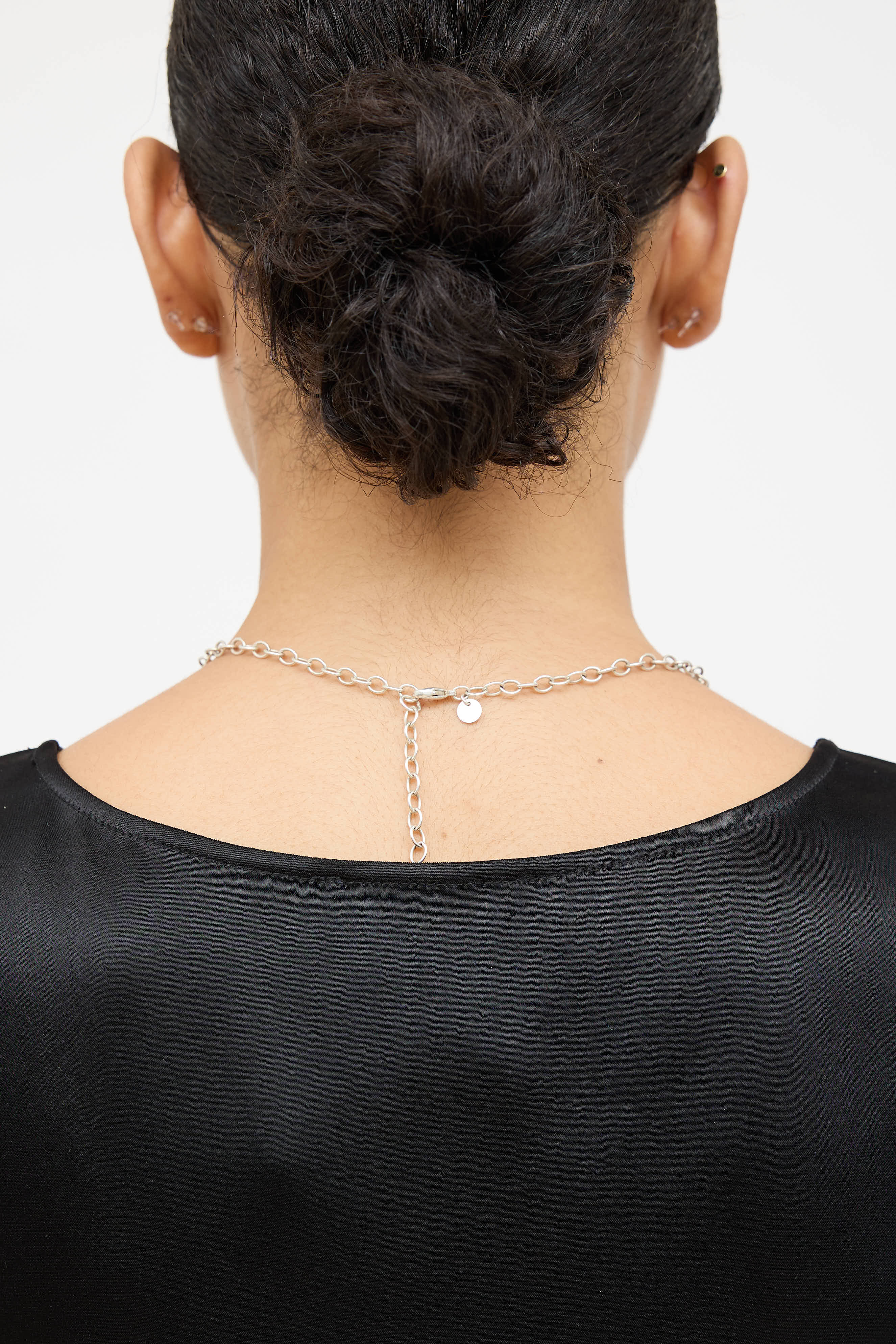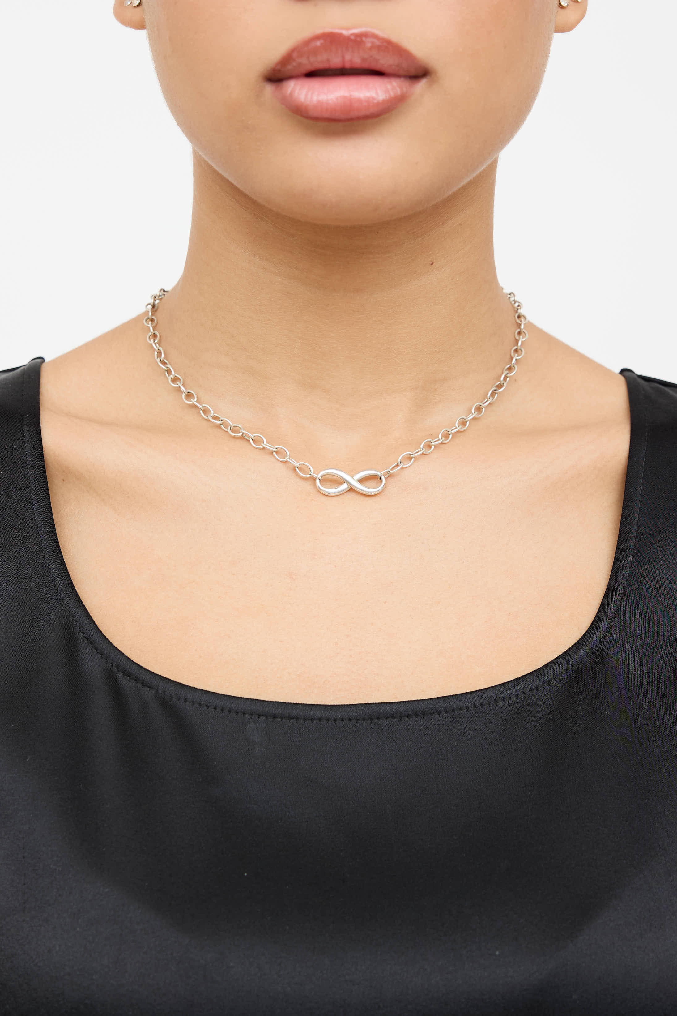 Pre-owned Tiffany & Co. sterling silver necklace featuring chain link, infinity pendant, "Ag925" stamping at pendant, and lobster clasp closure.