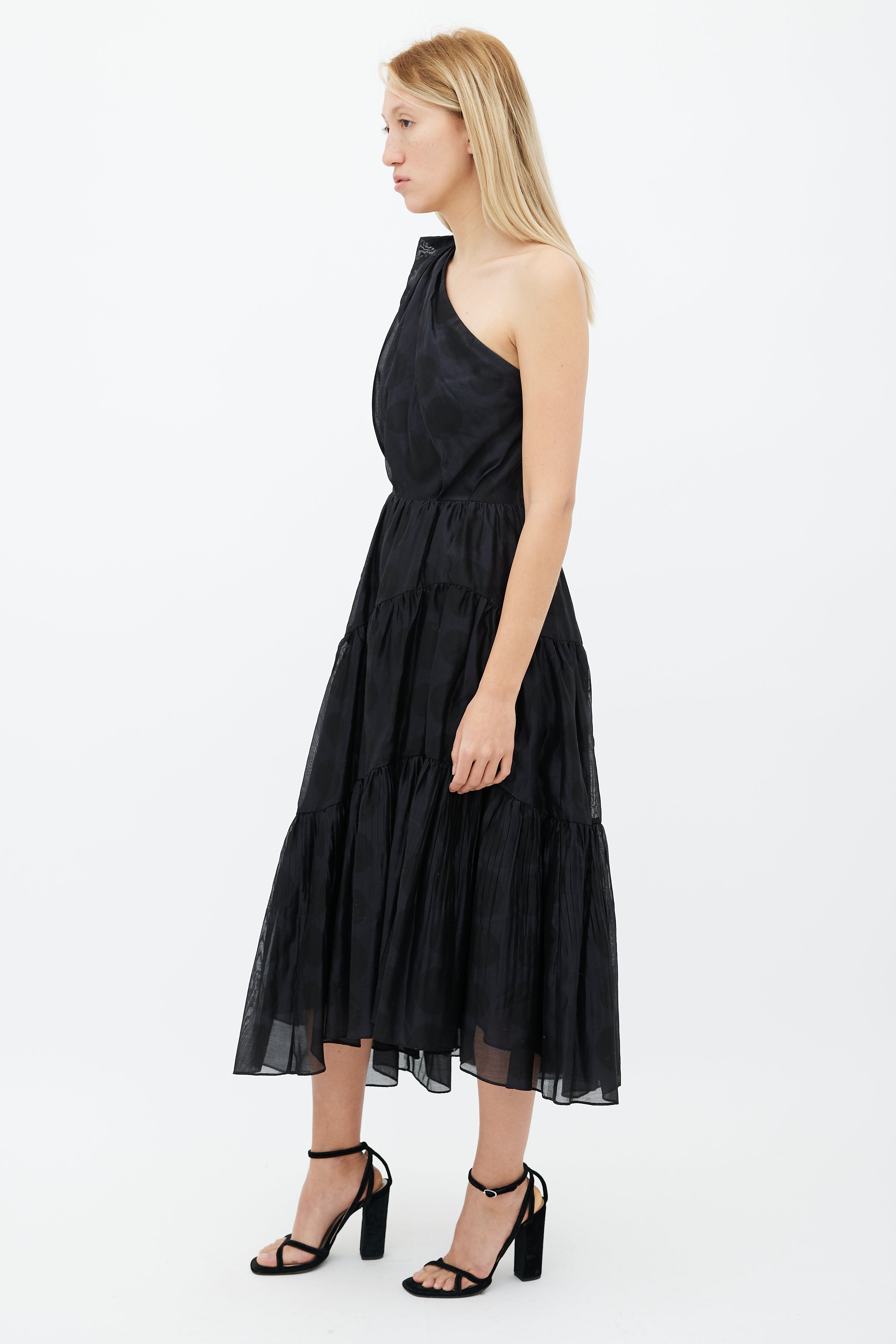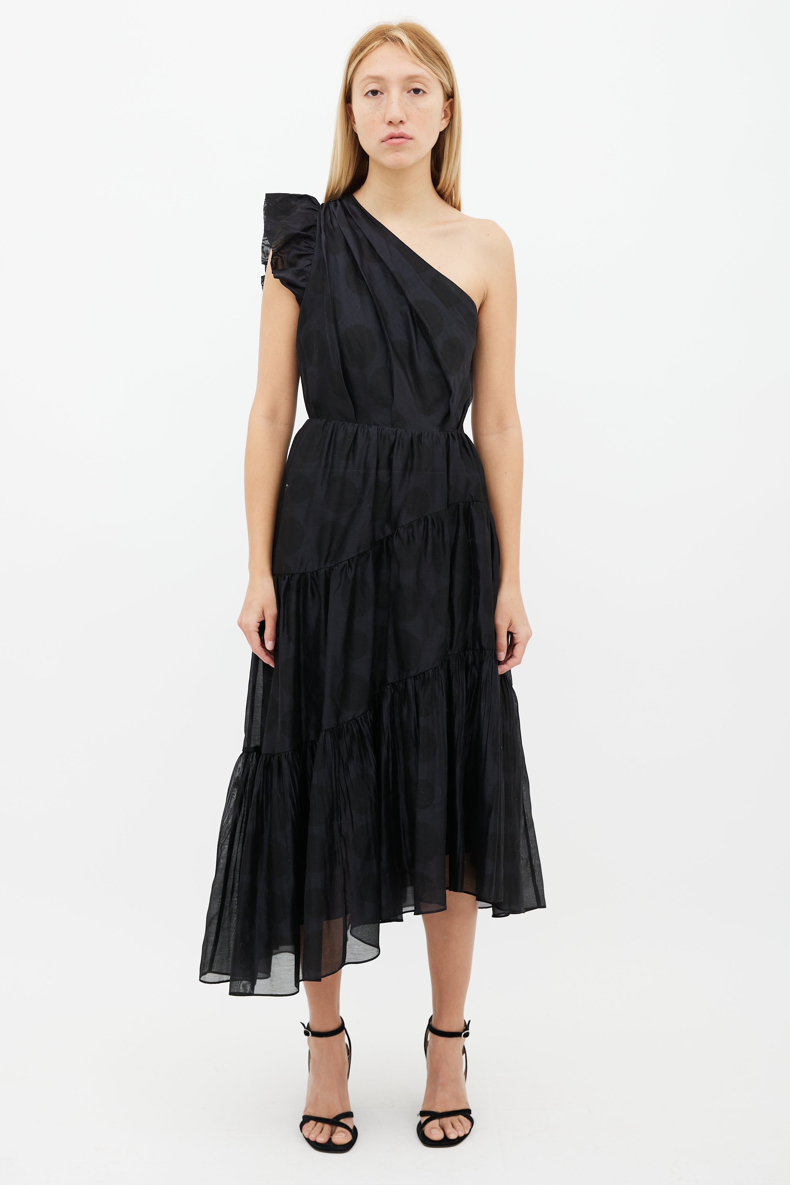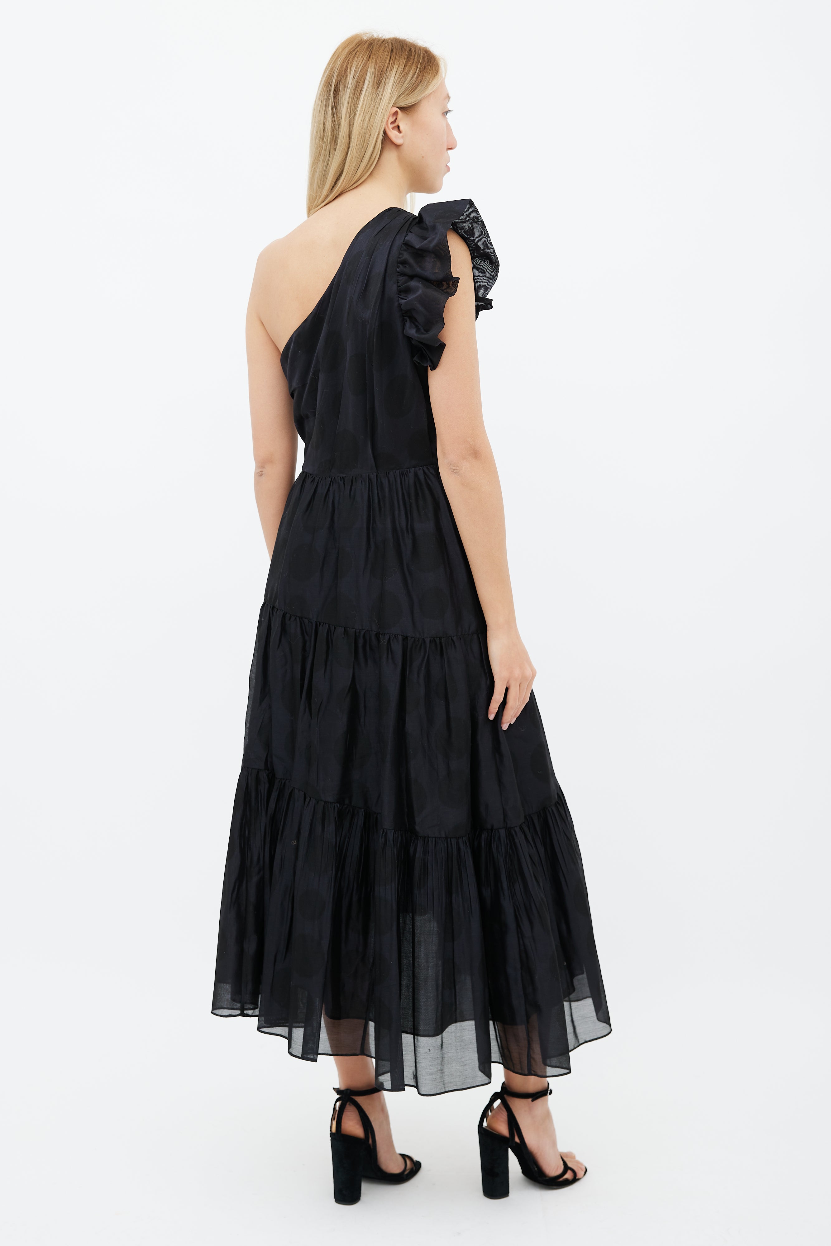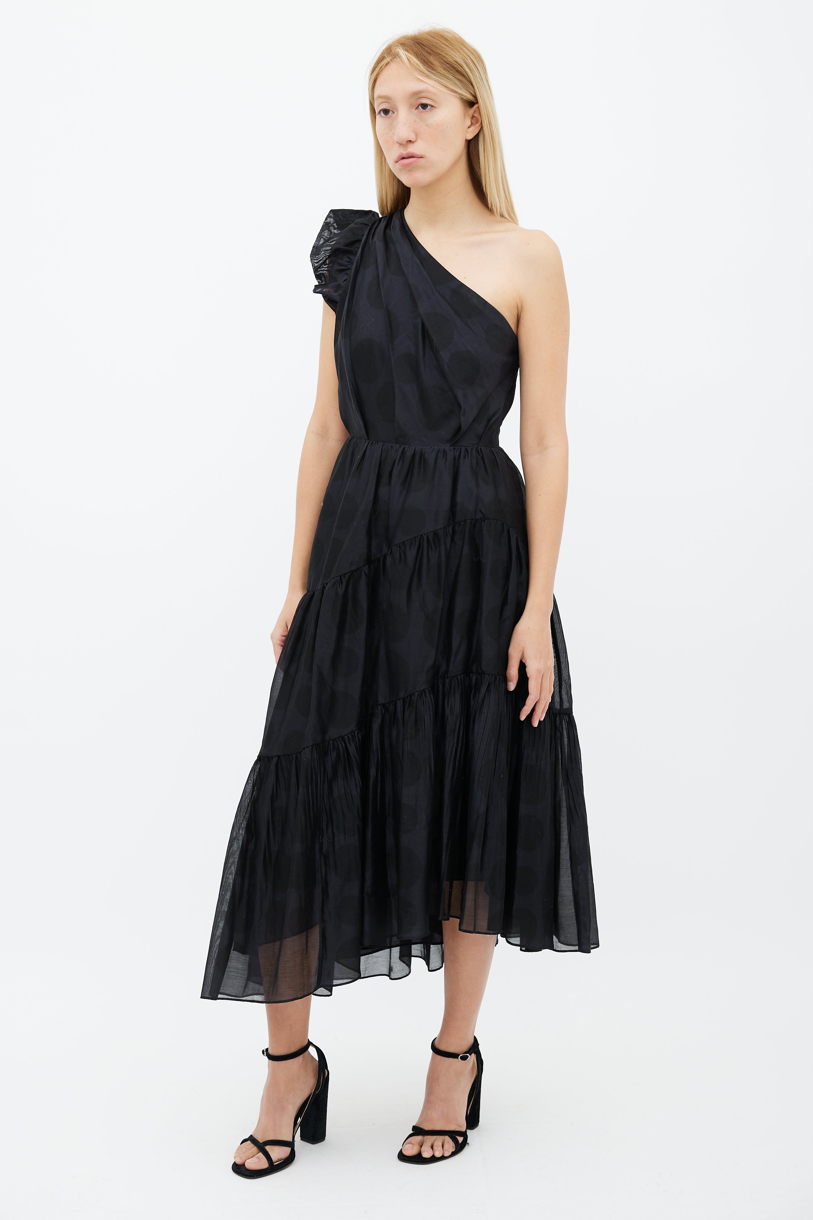 Pre-owned Ulla Johnson dress in black featuring one shoulder styling, gathered detail at short sleeve, concealed zipper closure at side, and tiered skirt design with gathered detailing. Clipped to fit model.