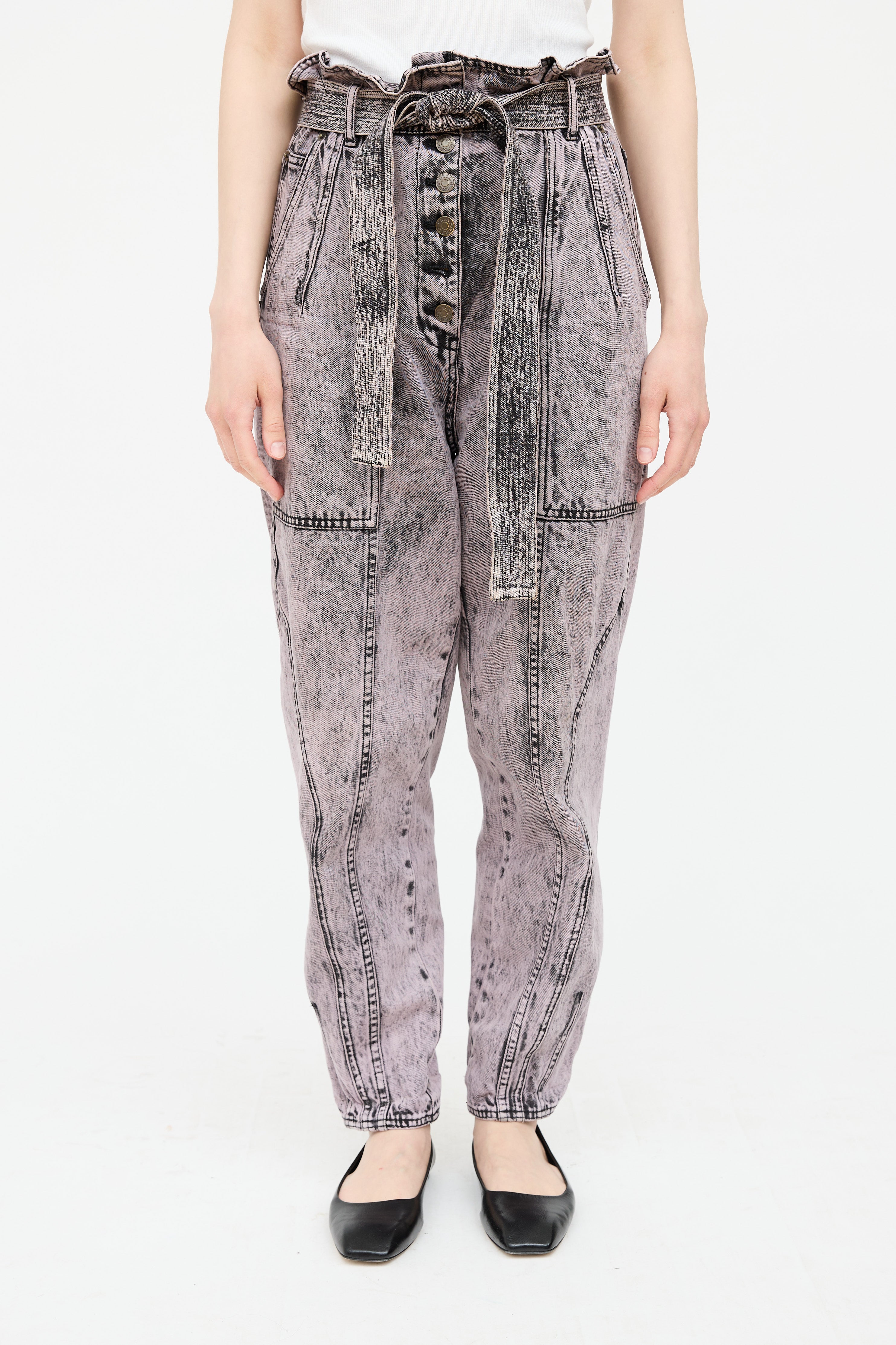 Pre-owned Ulla Johnson purple wash tapered pant featuring button closure, detachable tie at waist, large slit pockets at side, patch pockets at back, paneling throughout.