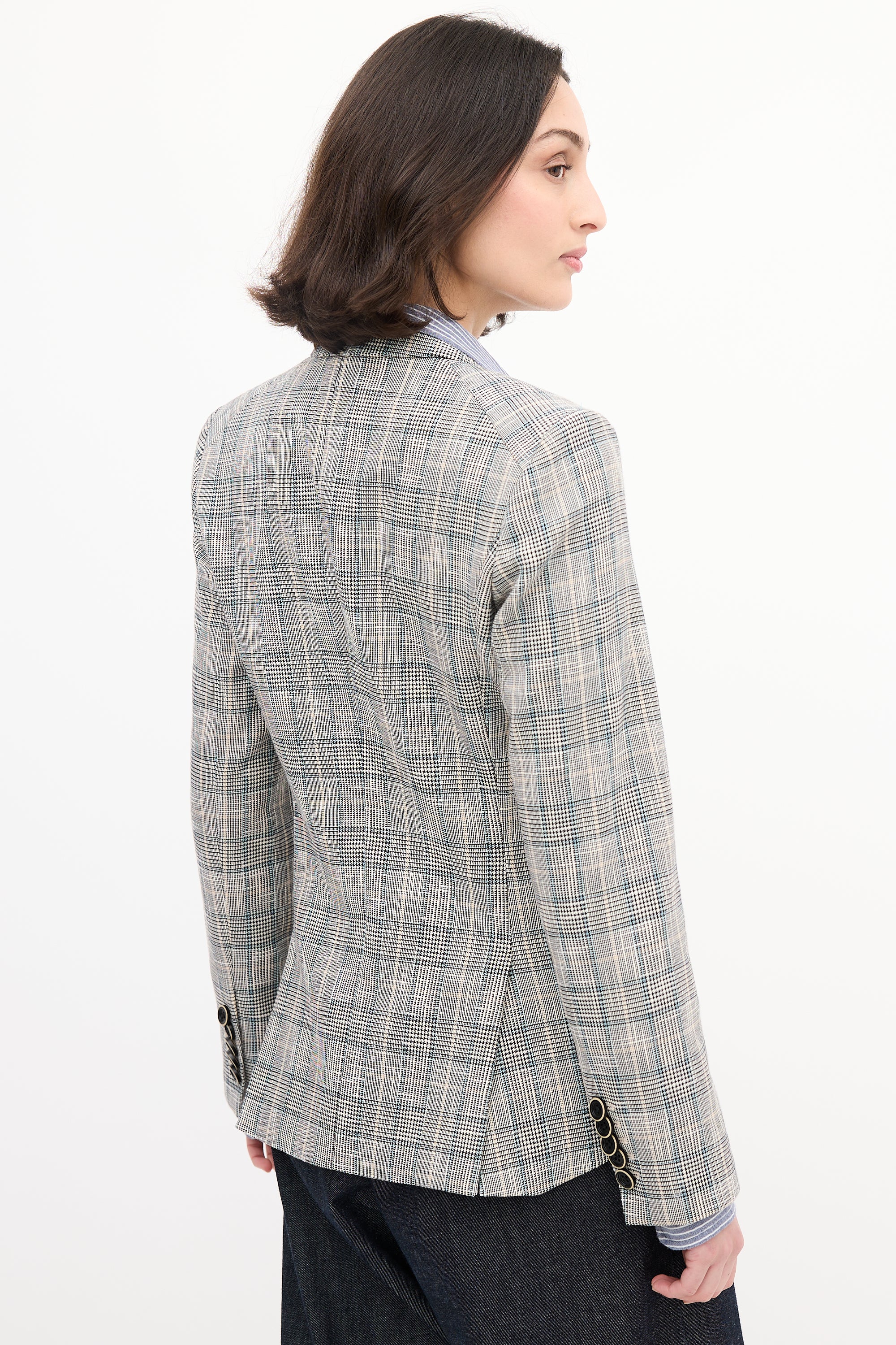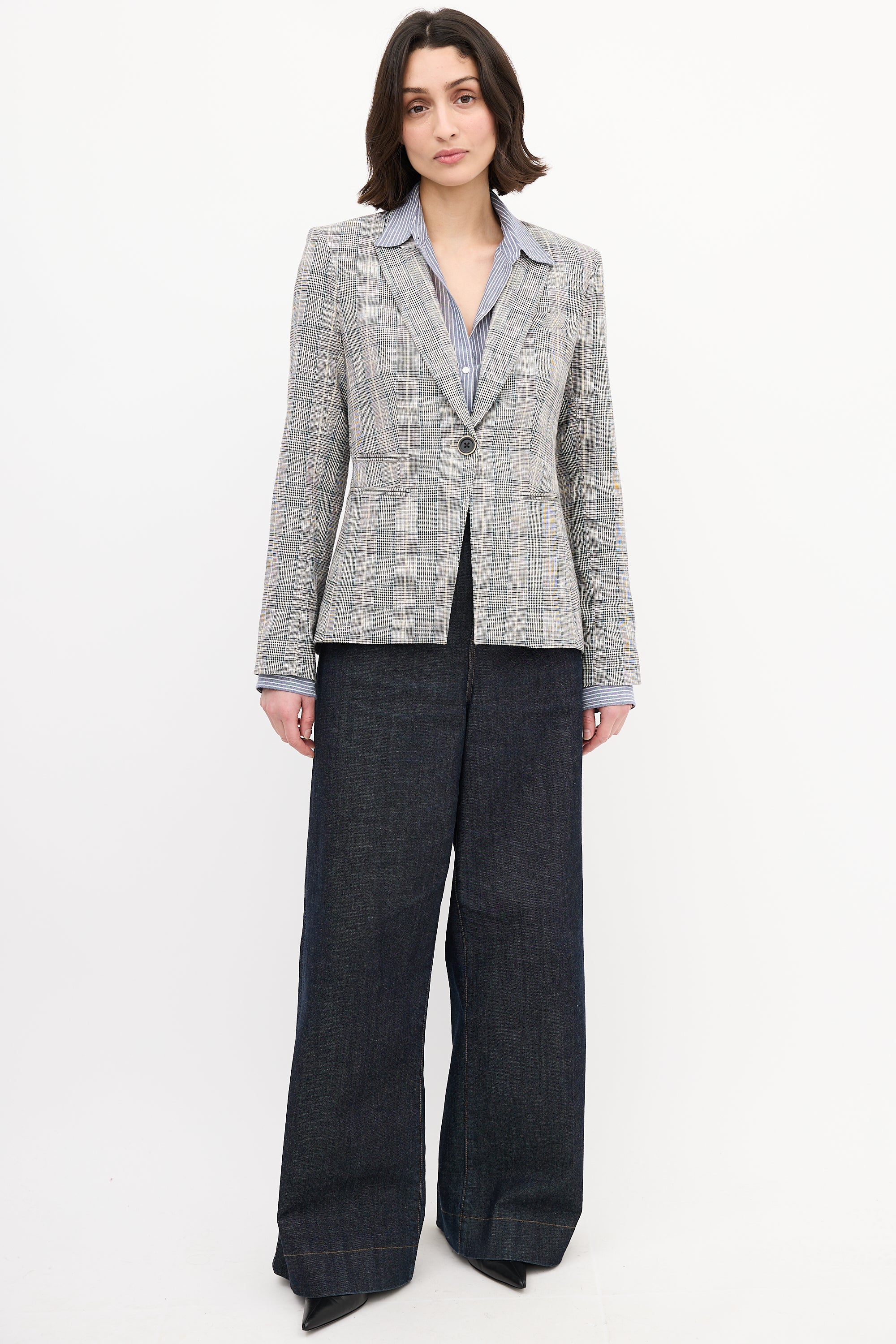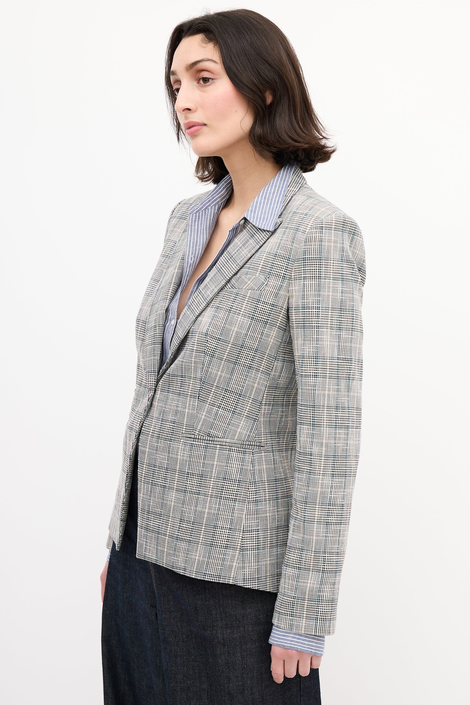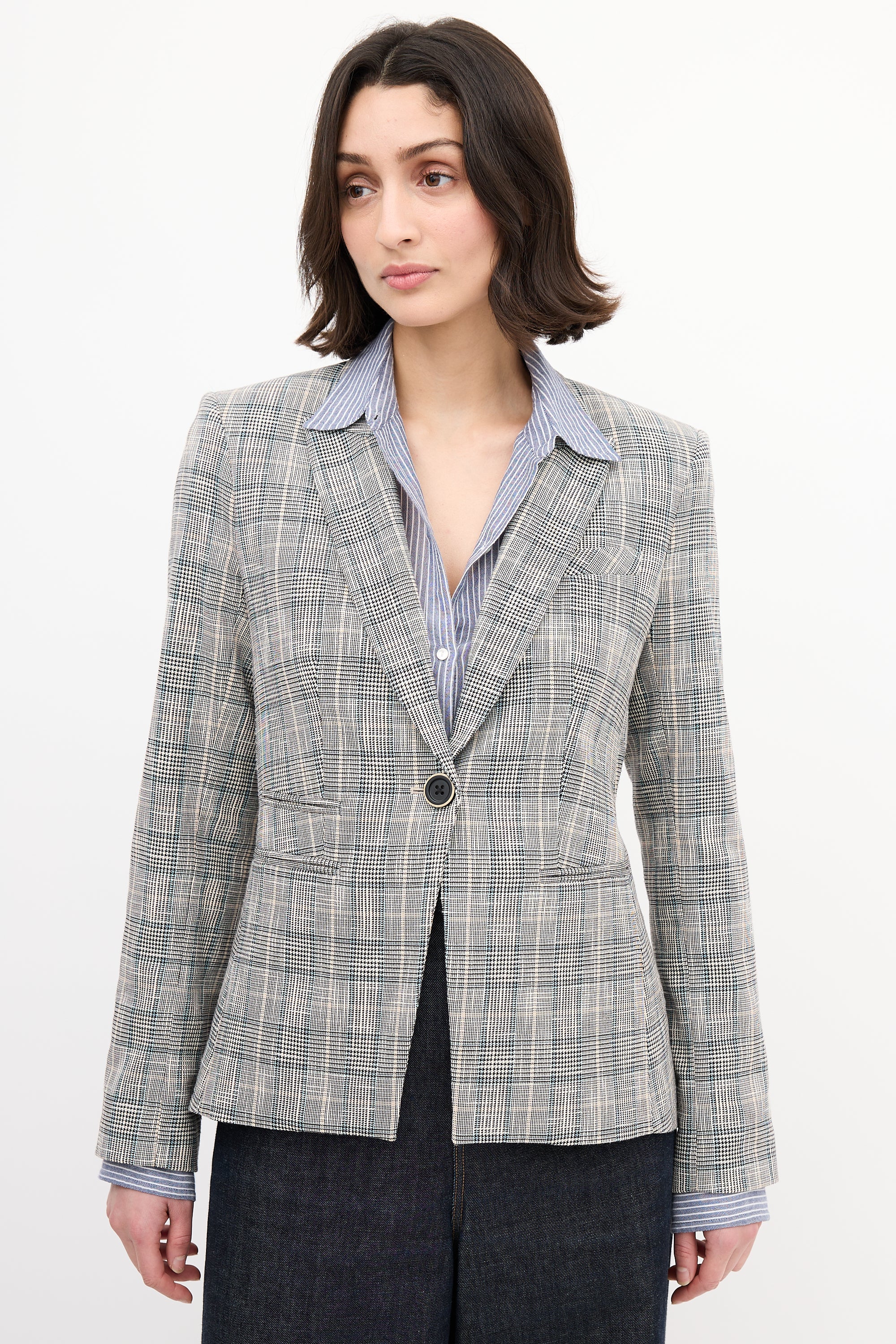 Pre-owned Veronica Beard black, white, and multicolour Glen check blazer featuring a peak lapel, front single button closure, four front pockets, back double vent, and buttoned cuffs. Lined.