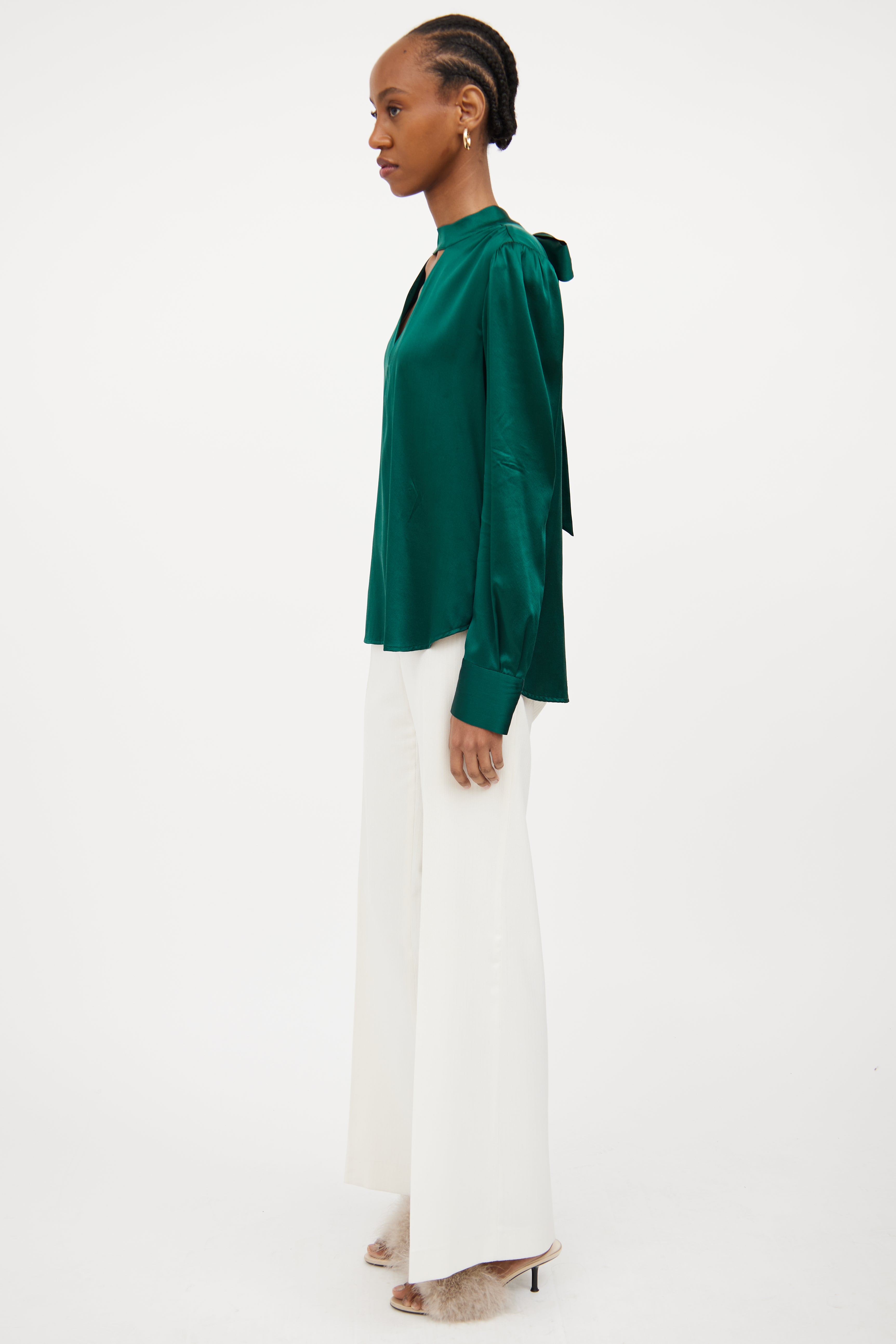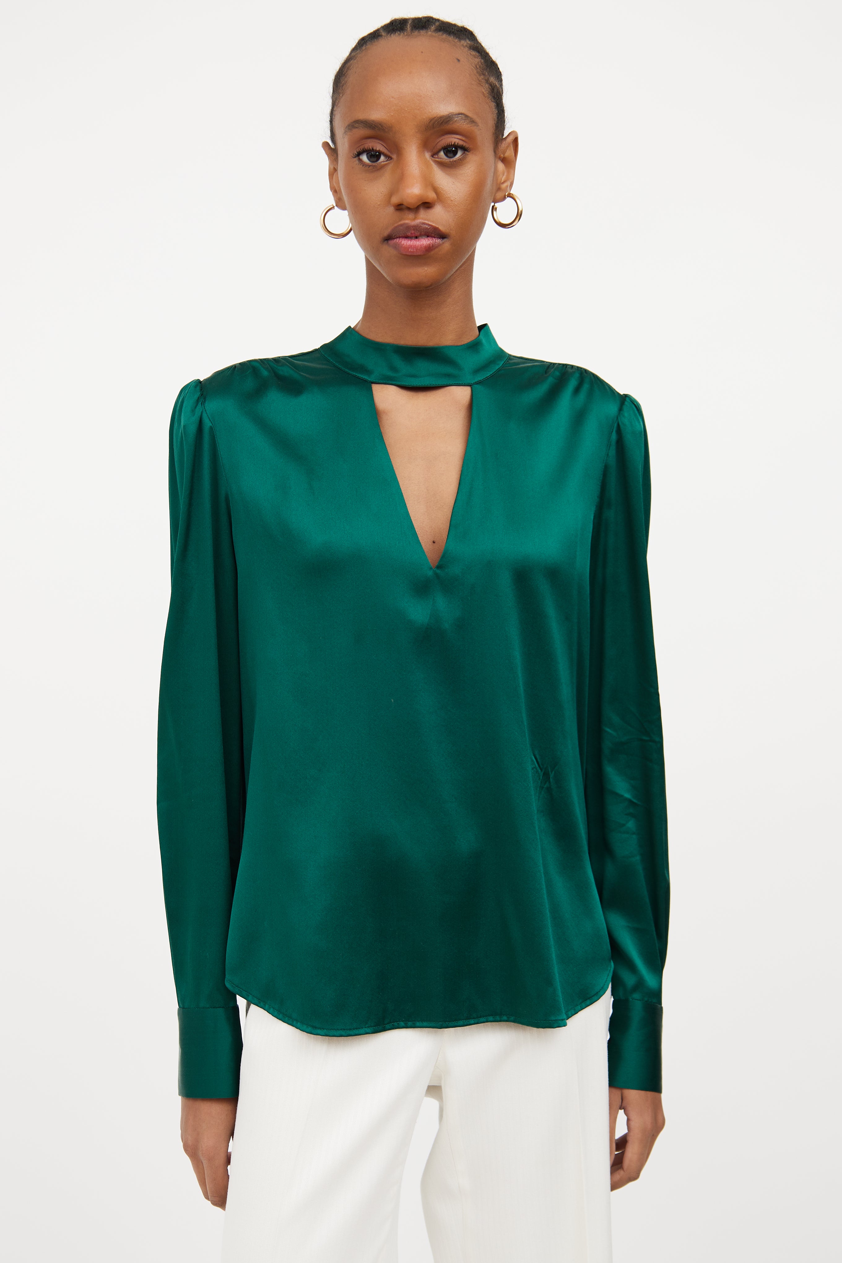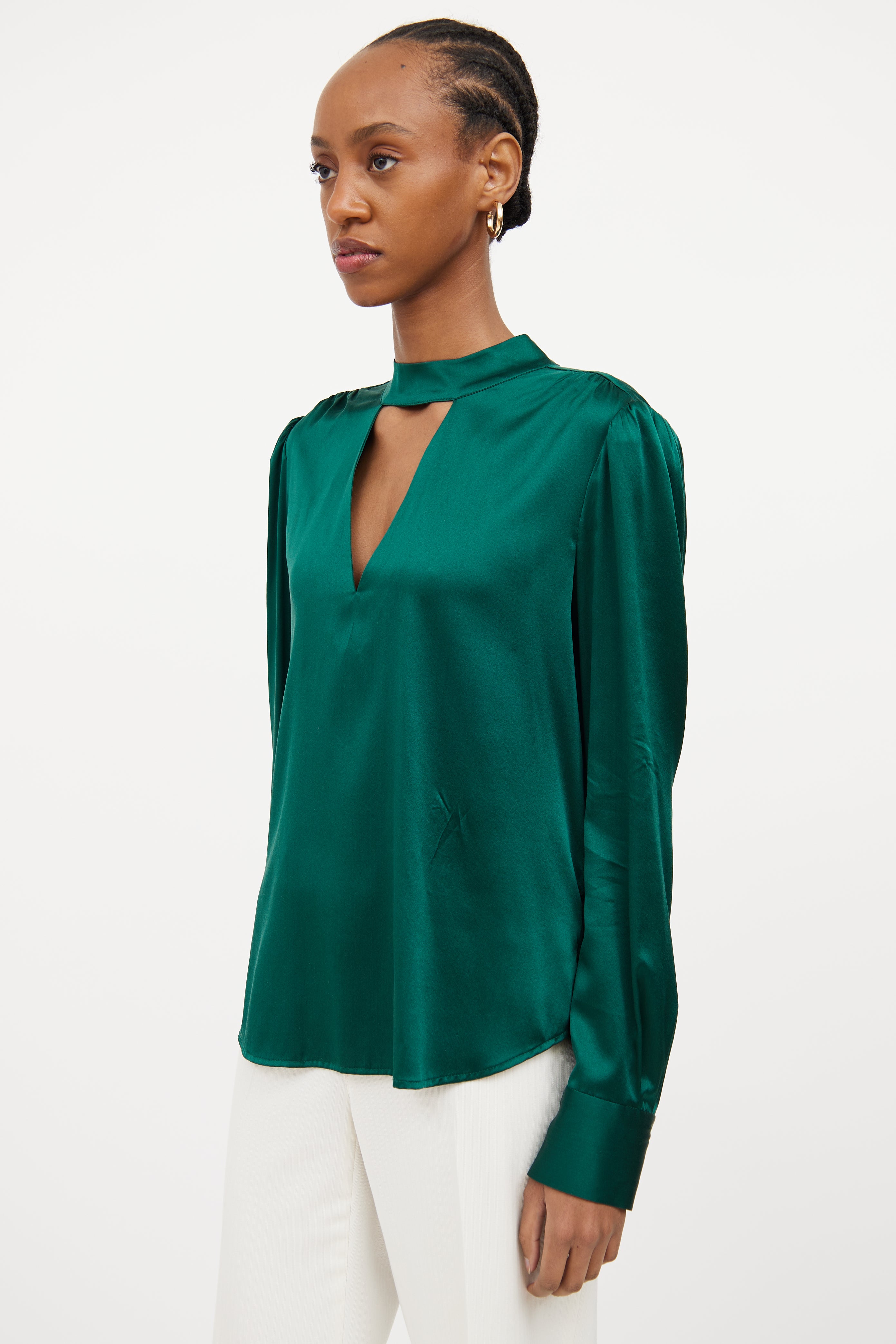 Pre-owned Veronica Beard green silk top featuring a keyhole neckline, long sleeves, long sleeves with buttoned cuffs, and tie closure at back.