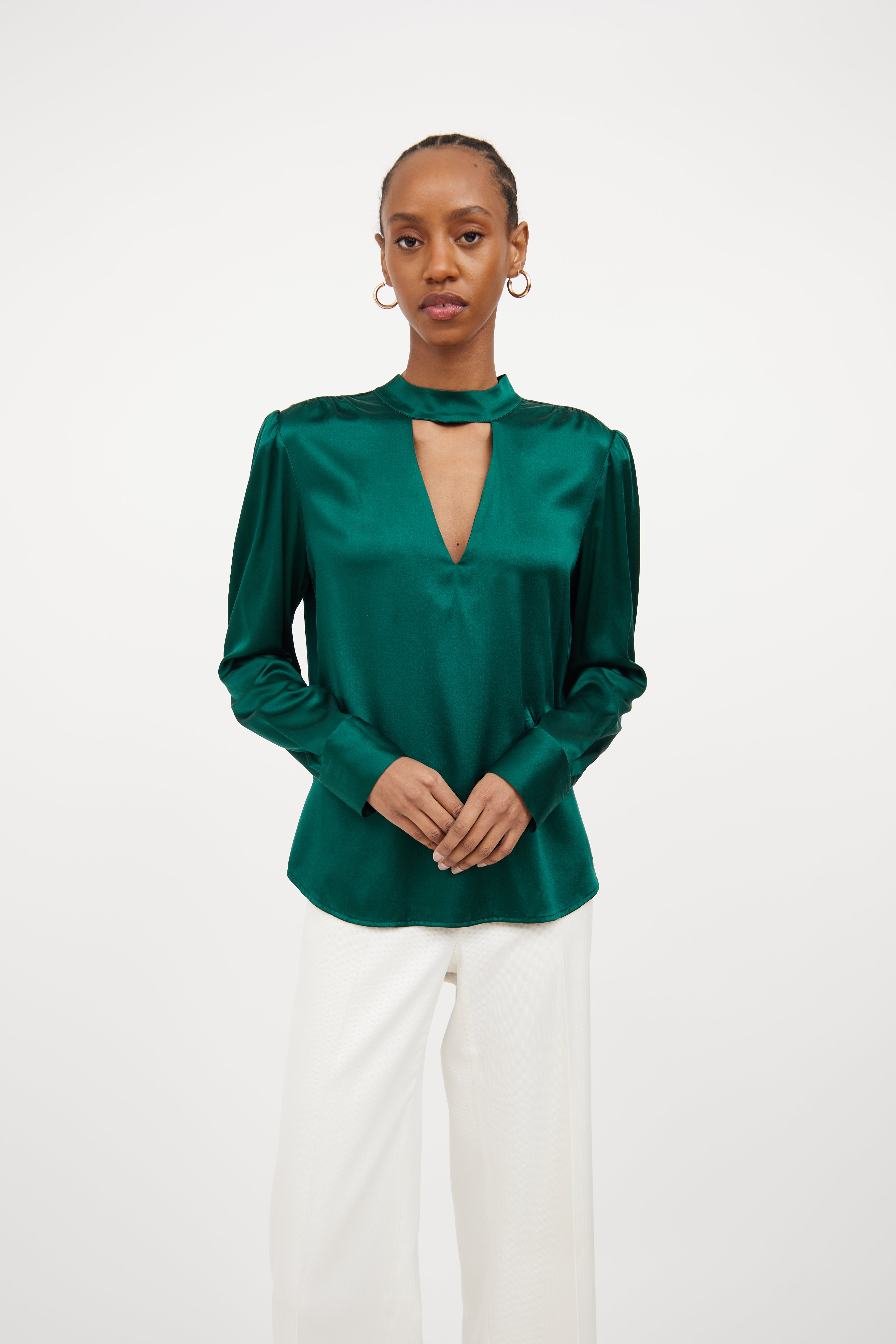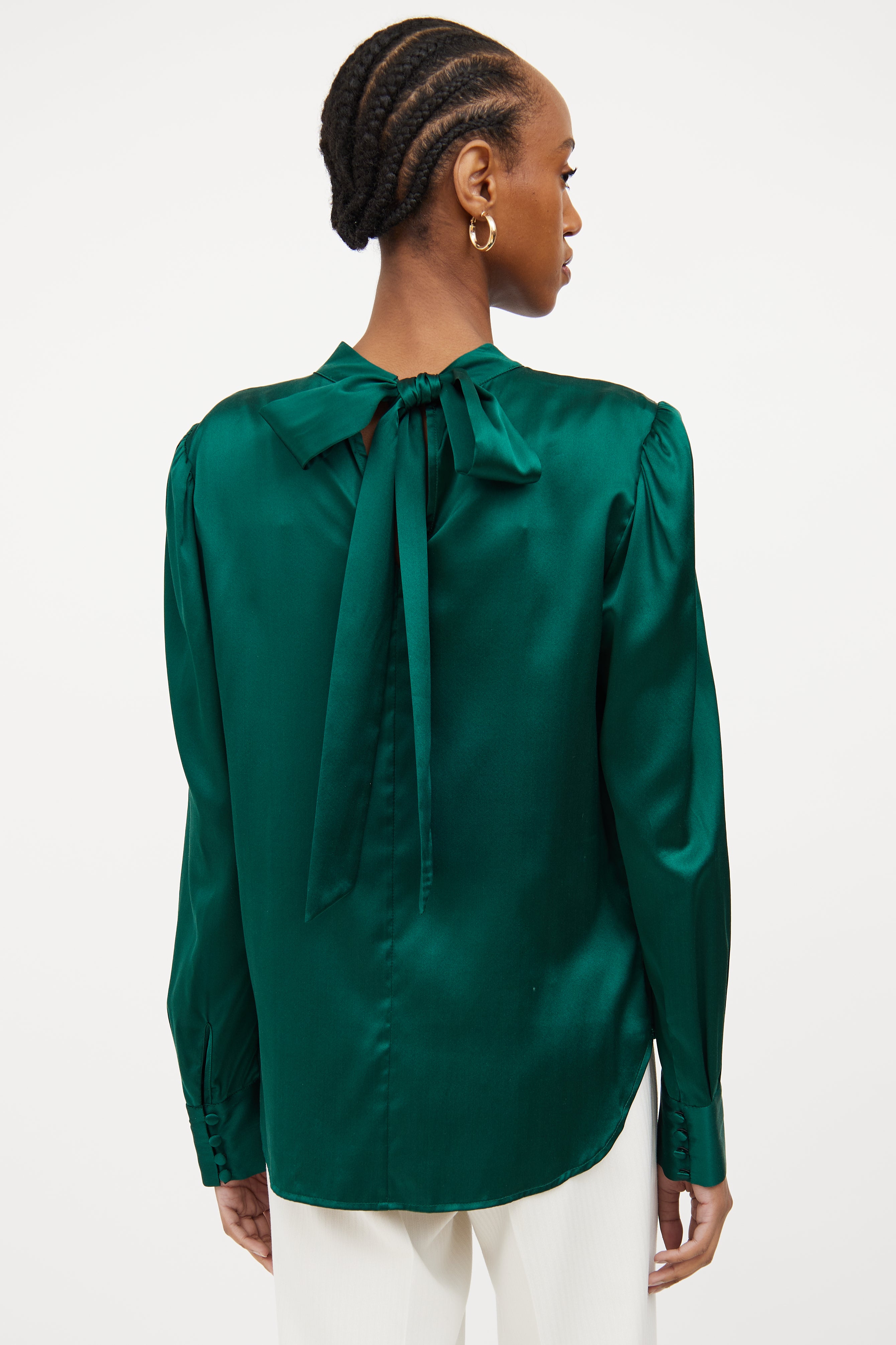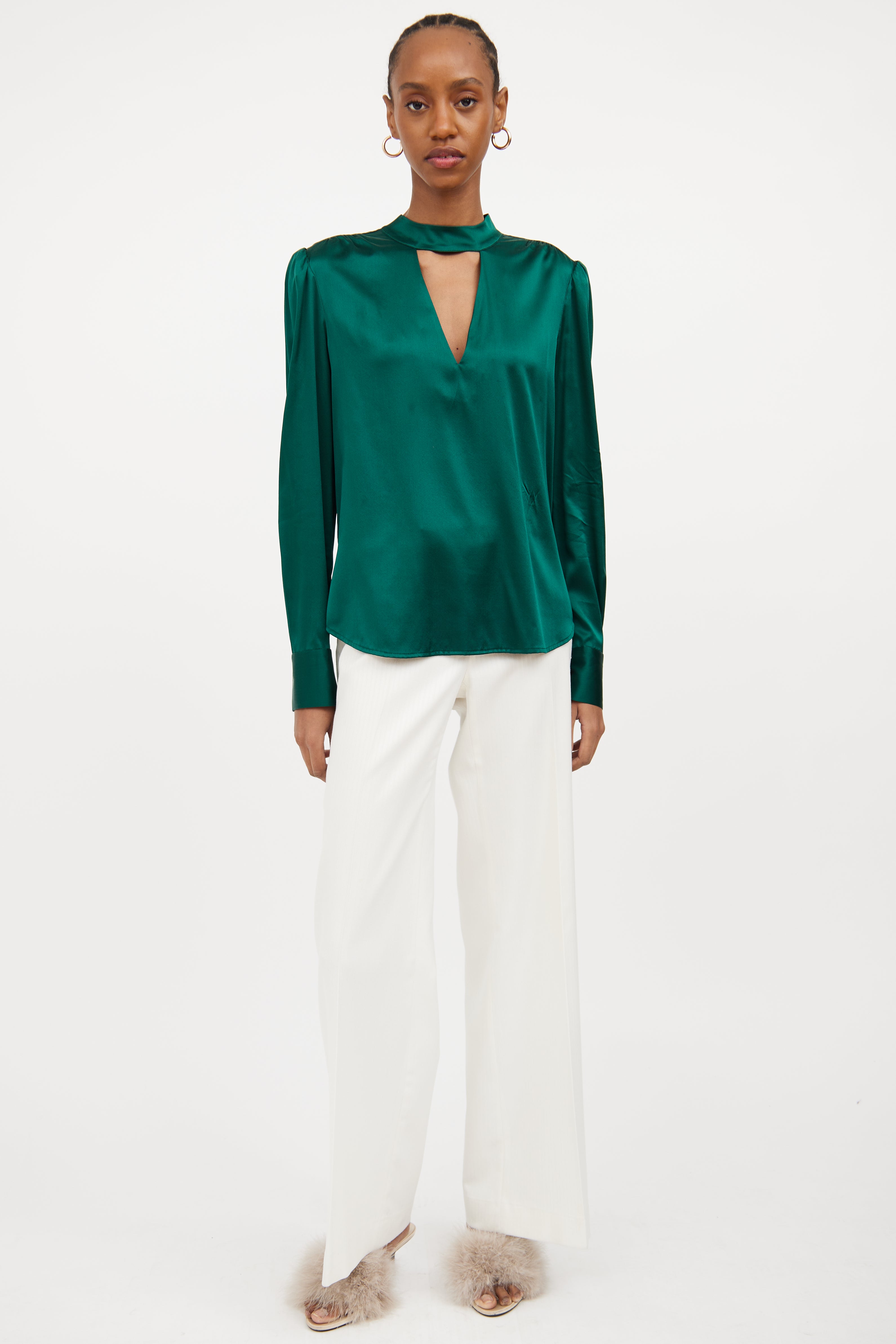 Pre-owned Veronica Beard green silk top featuring a keyhole neckline, long sleeves, long sleeves with buttoned cuffs, and tie closure at back.