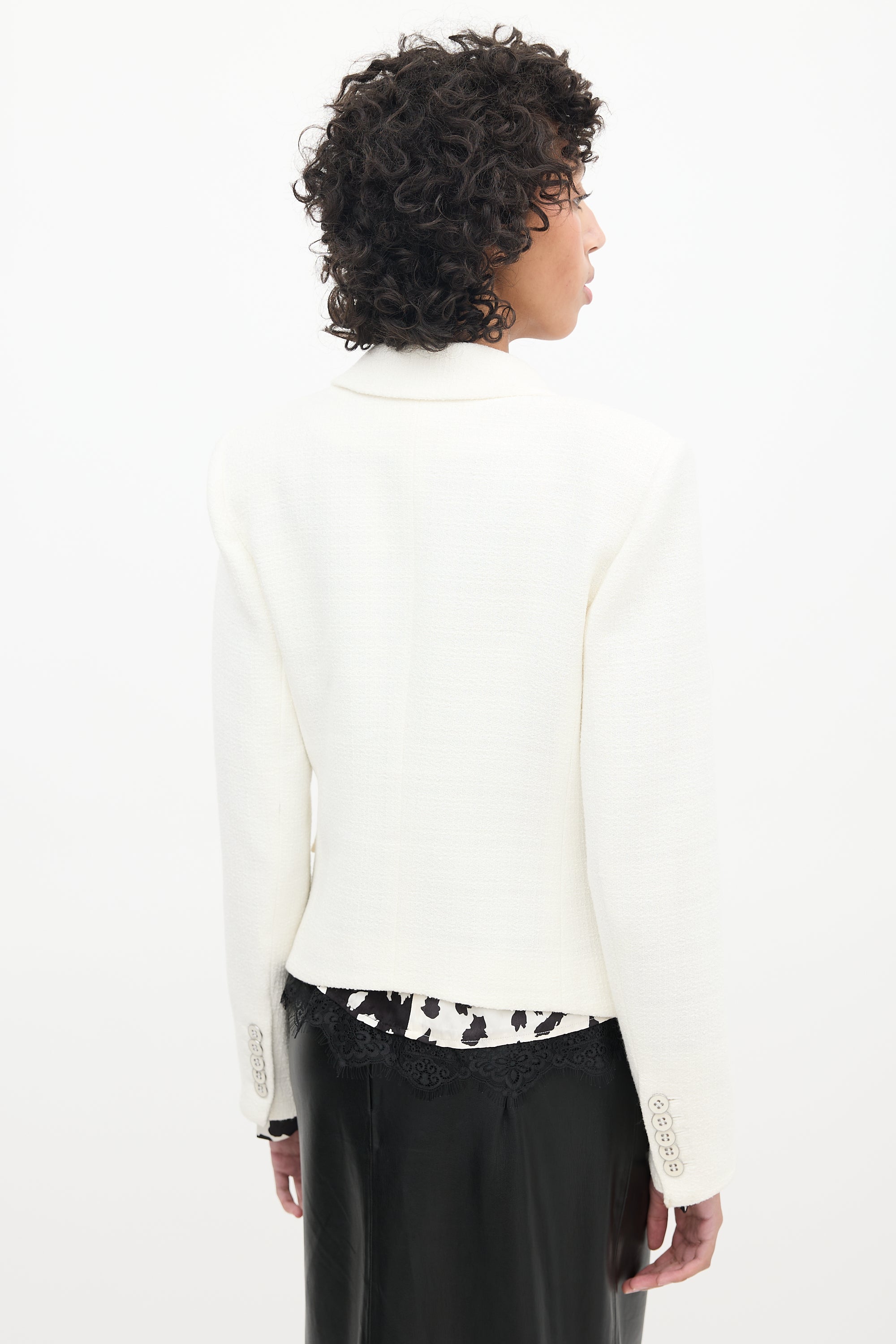 Pre-owned Veronica Beard white woven blazer featuring a peak lapel, structured shoulders, long sleeves with buttoned cuffs, one welt pocket at chest, two flap pockets at hip, high low hem, and silver tone button closure. Lined.