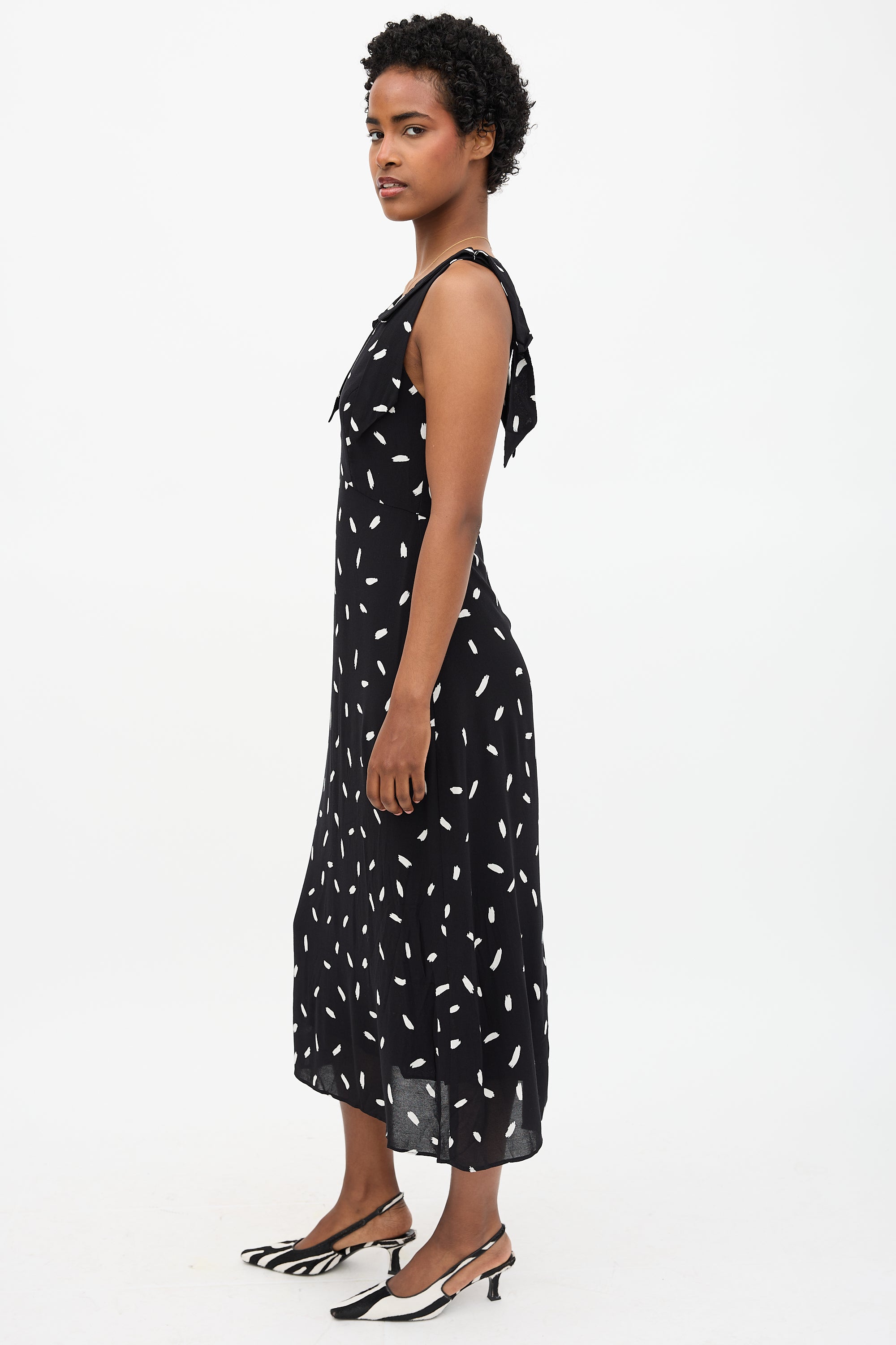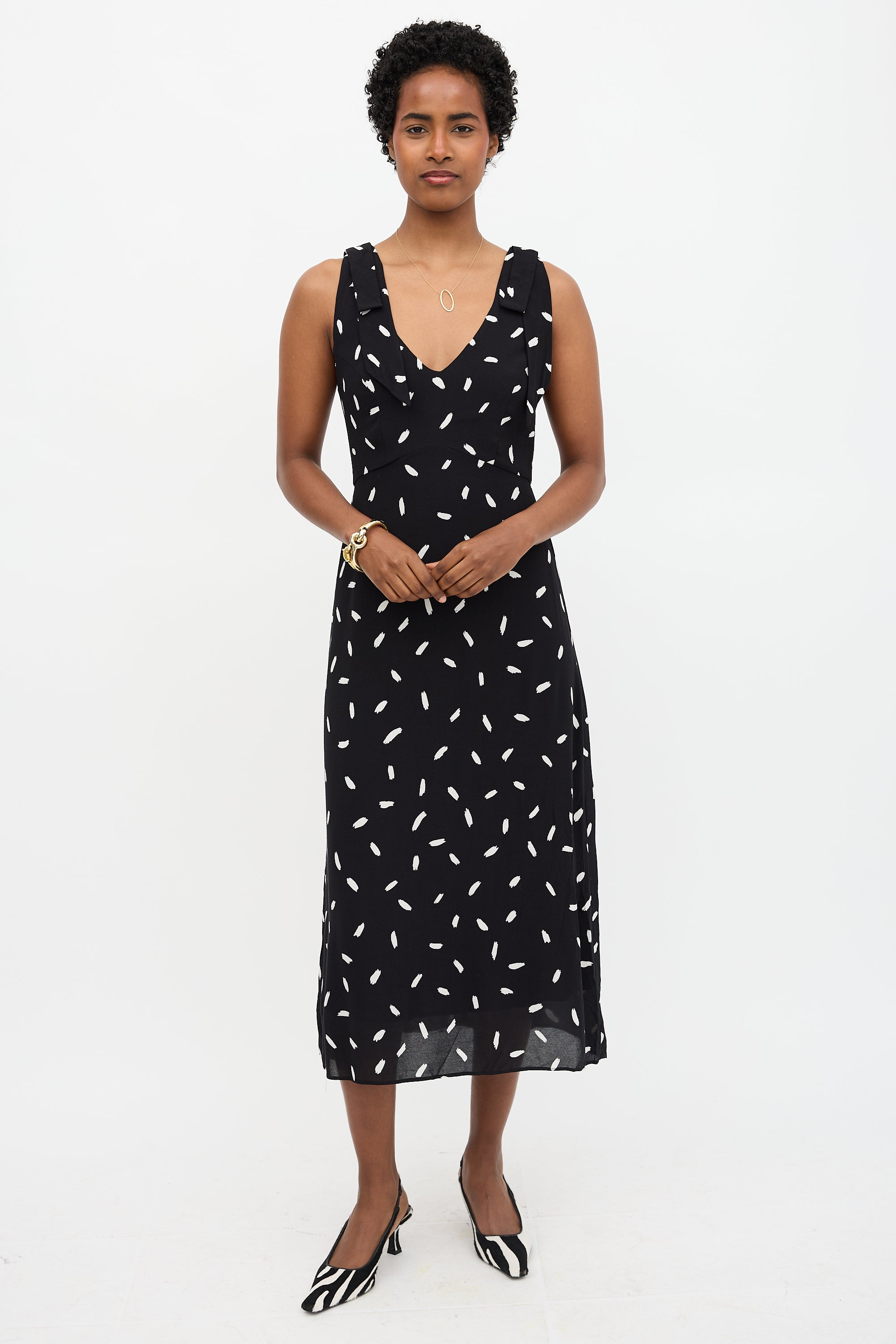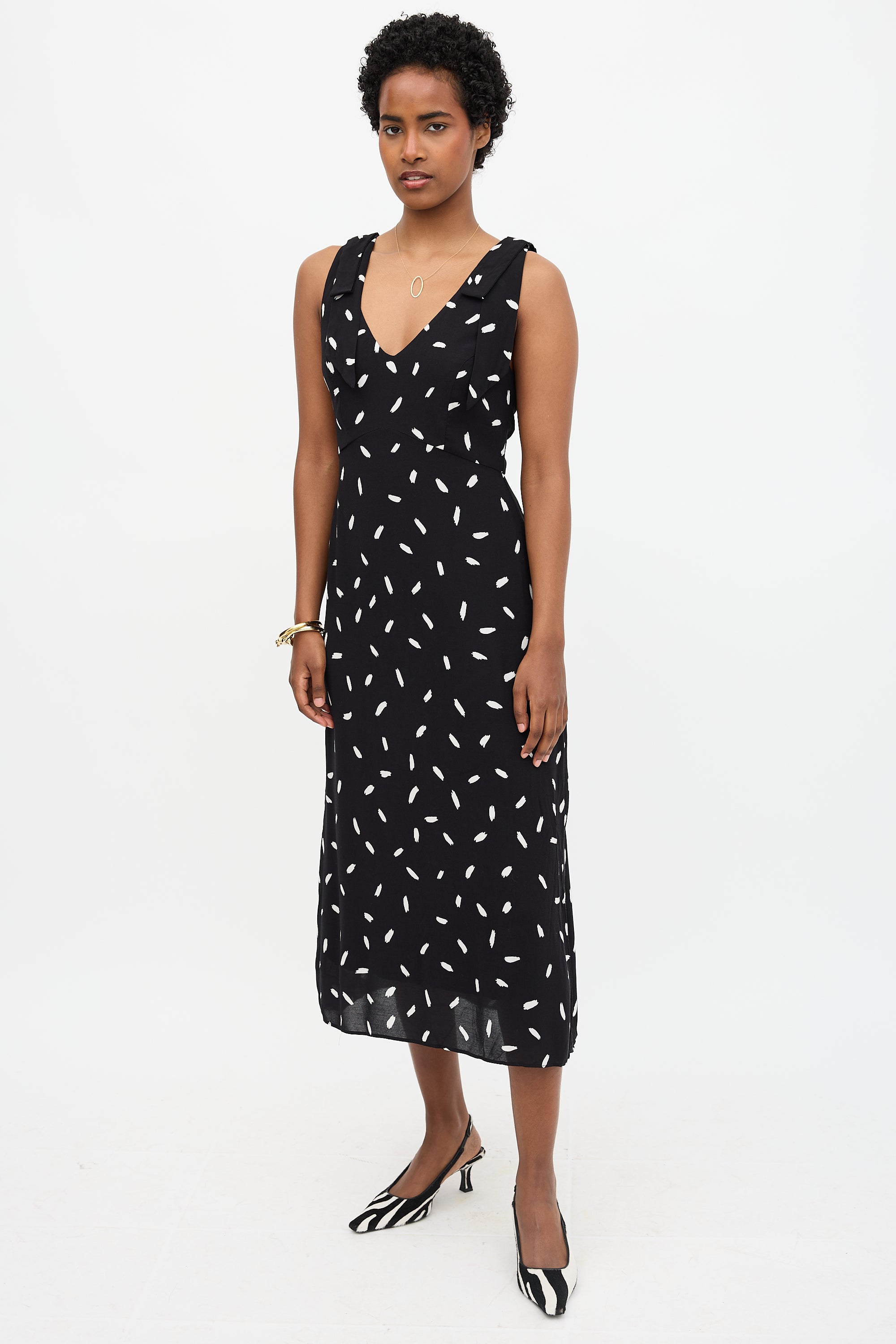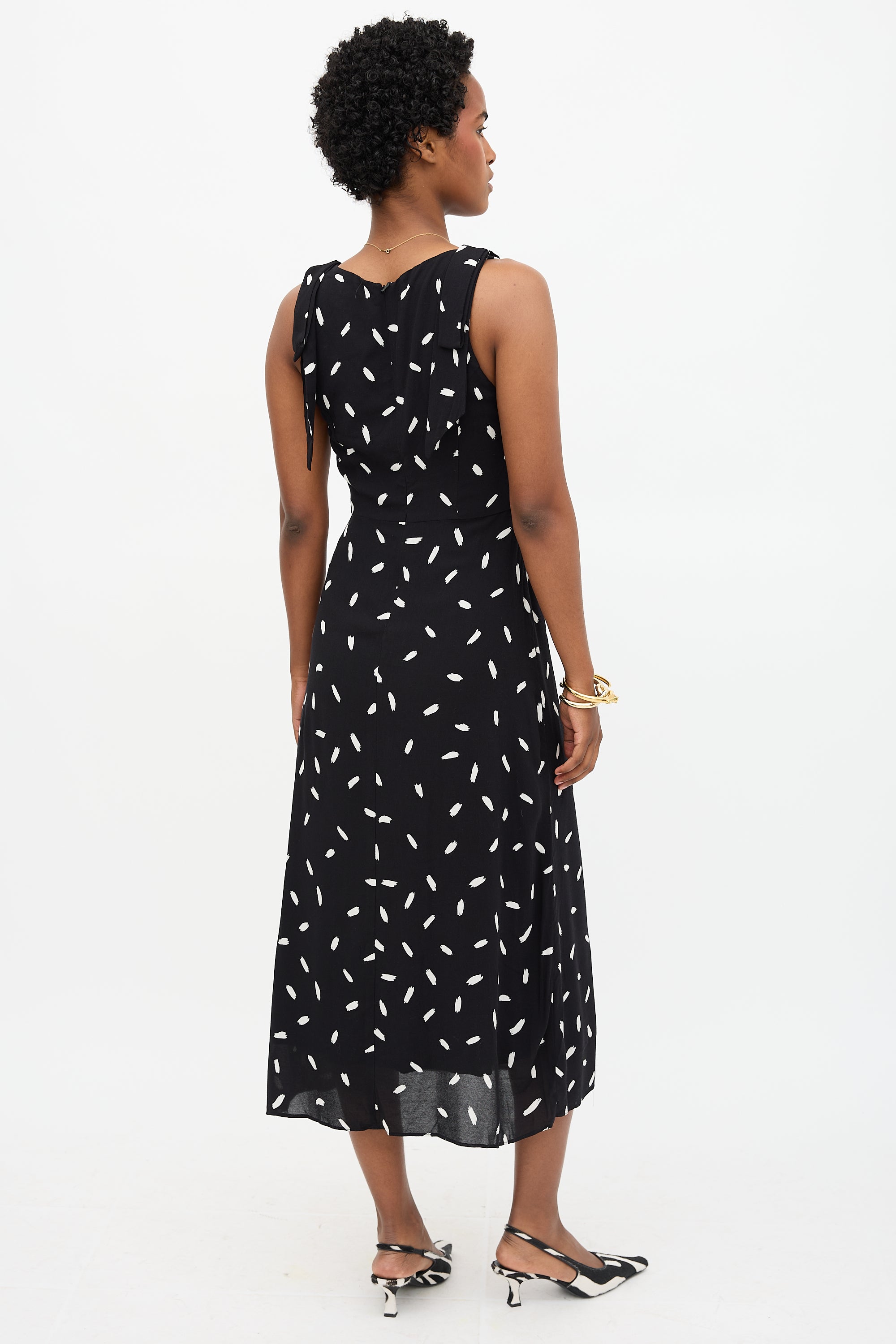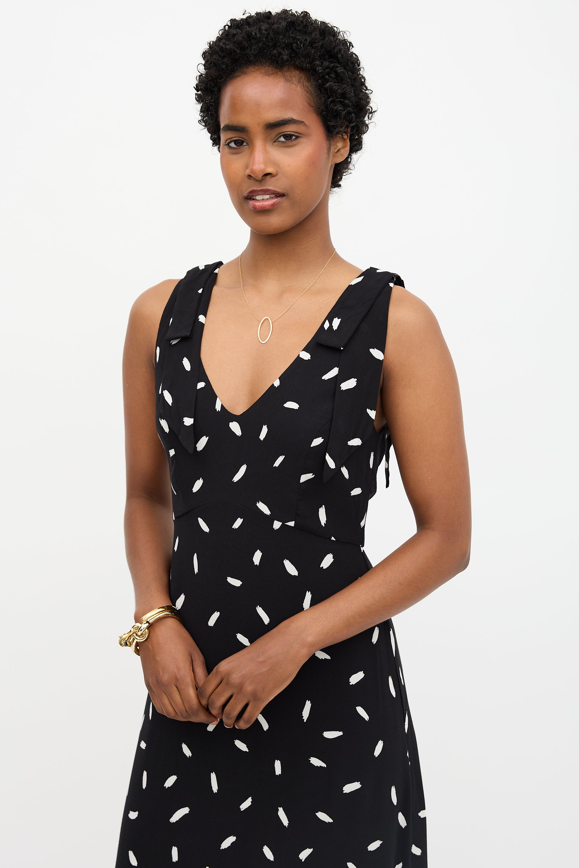 Pre-owned Zimmermann black dress featuring white dot print, V-neckline, shoulder bow detail, and concealed back zip. Lined.
