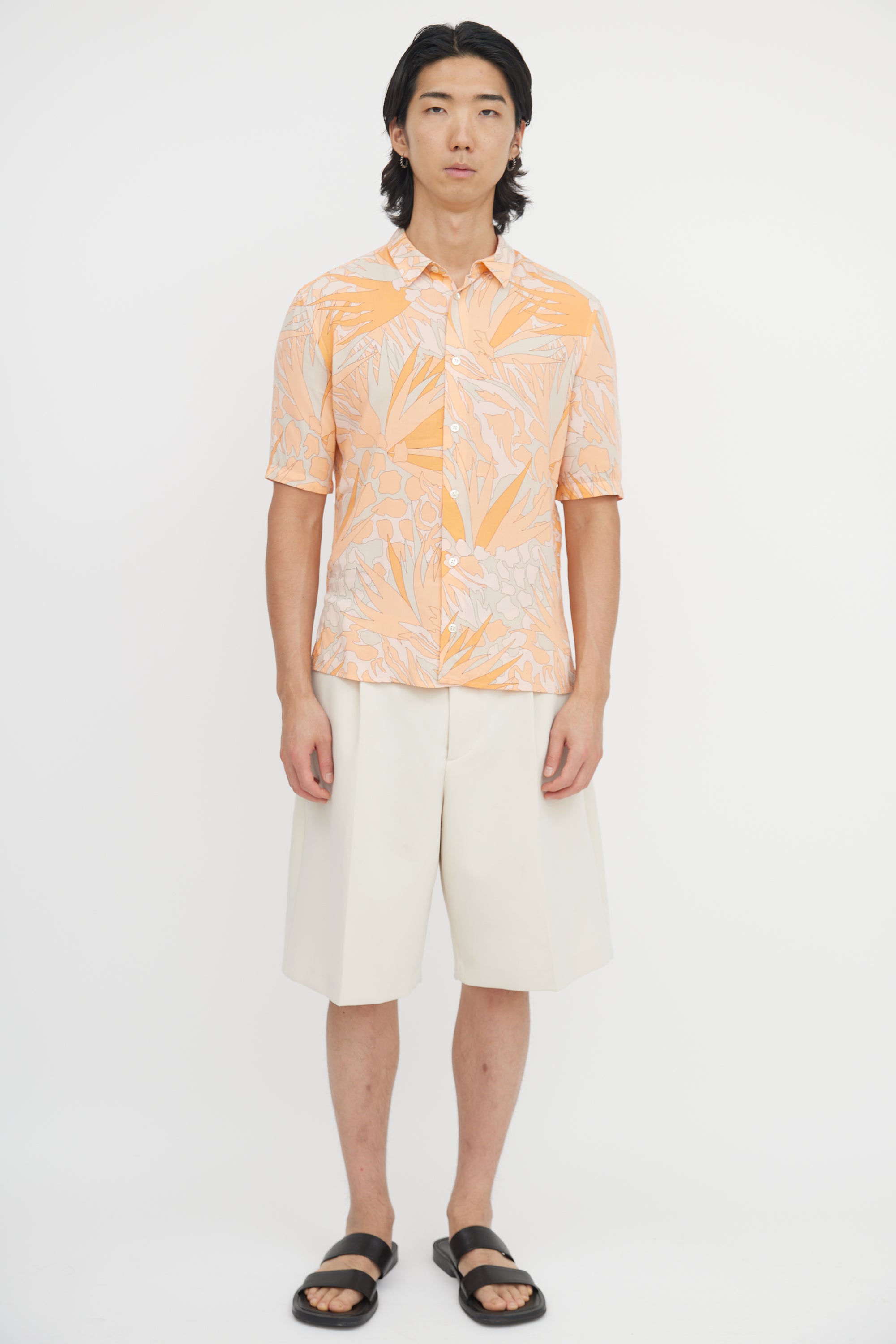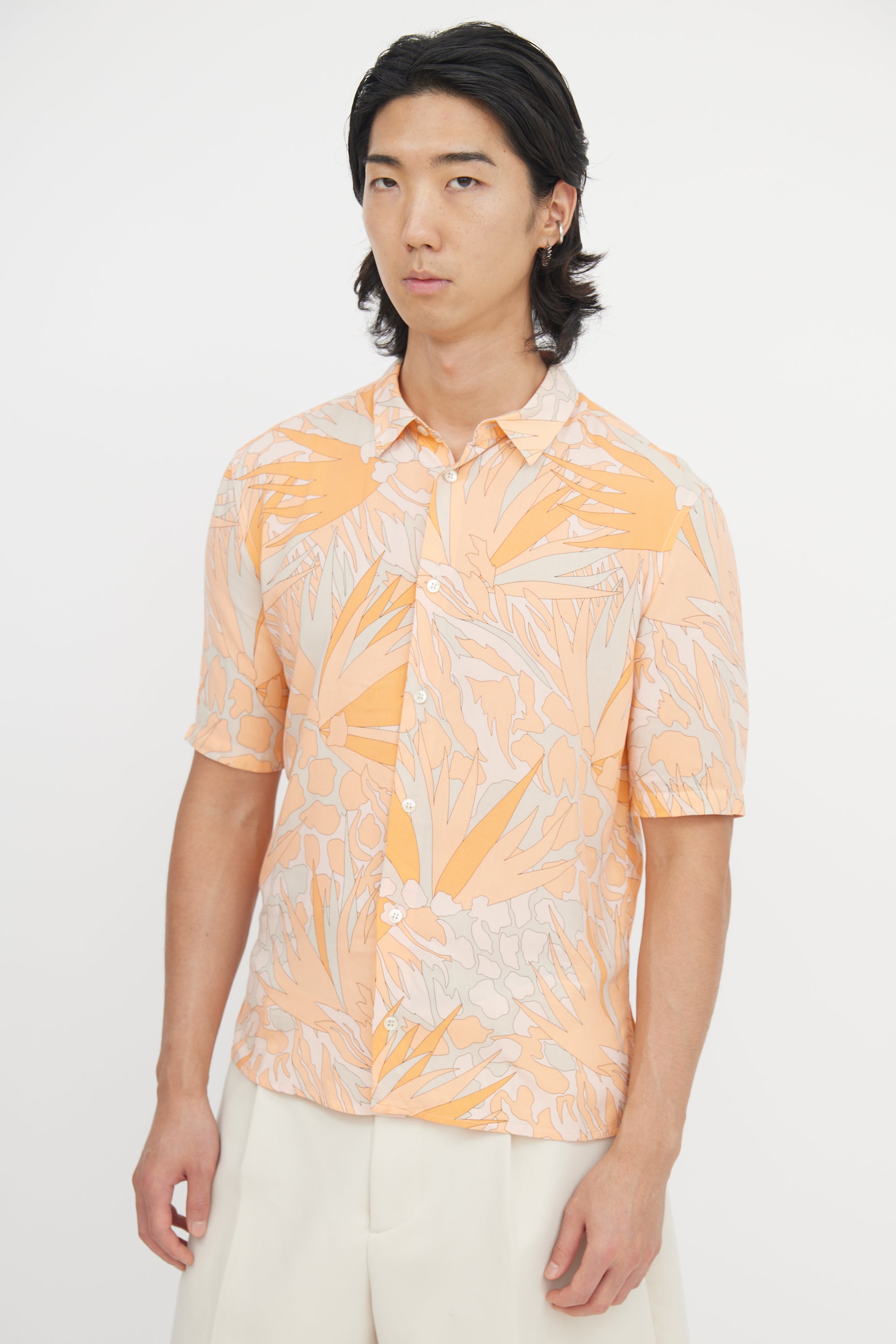 Pre-owned Saint Laurent orange and beige shirt featuring tropical floral print, straight collar, button up front, and side vents.