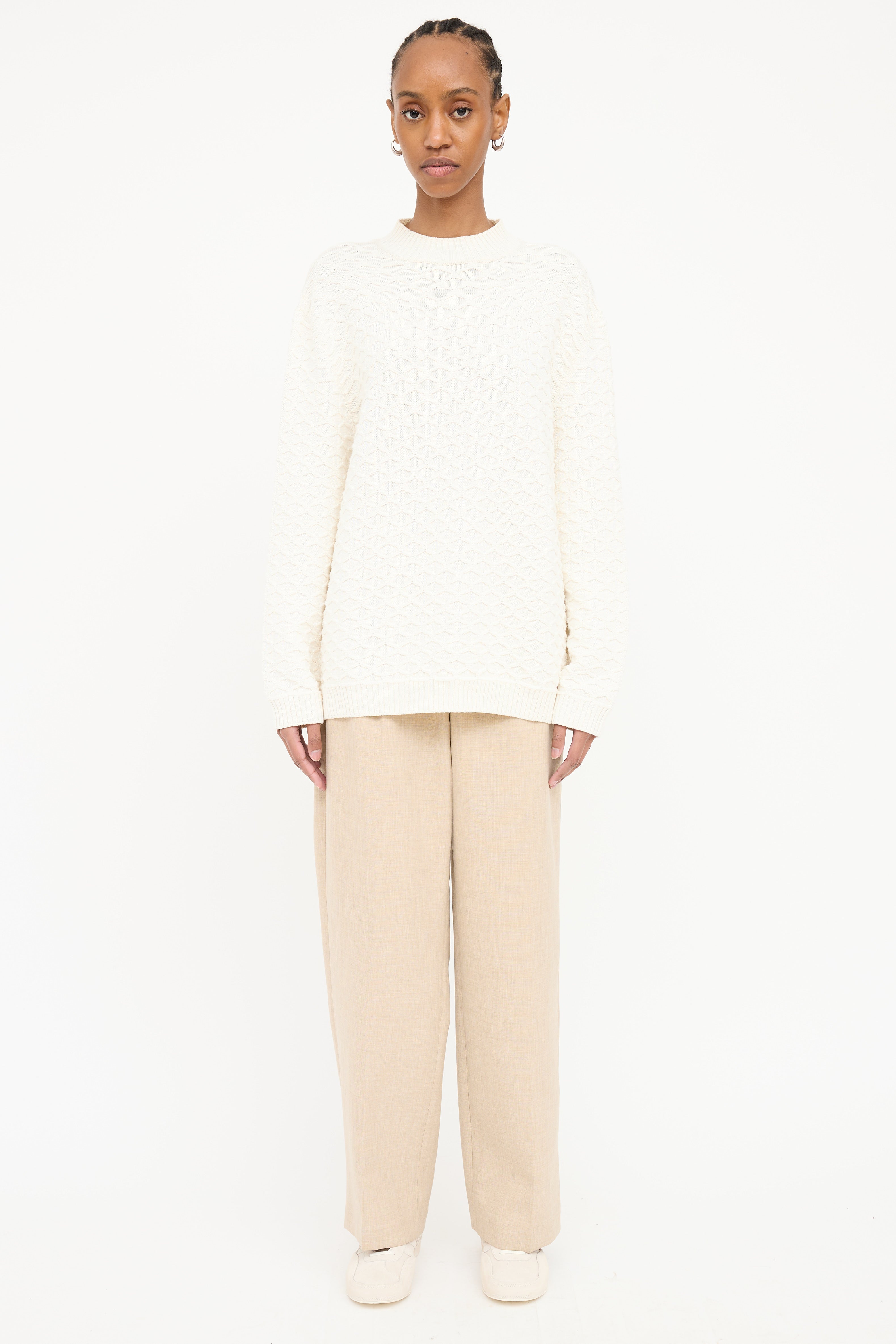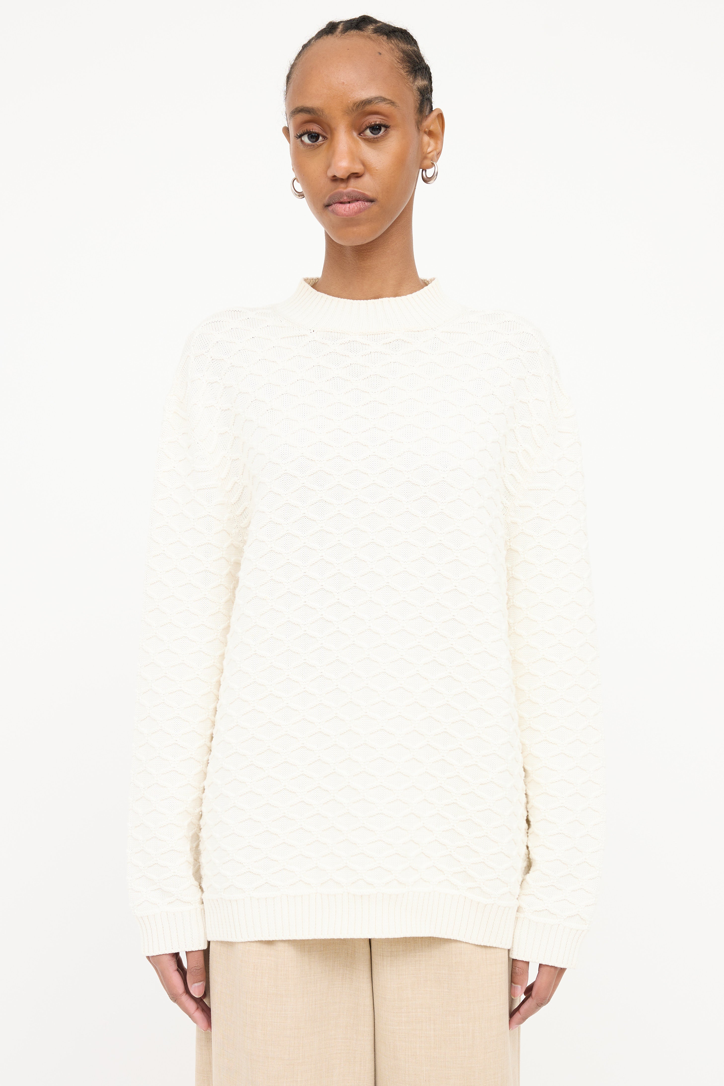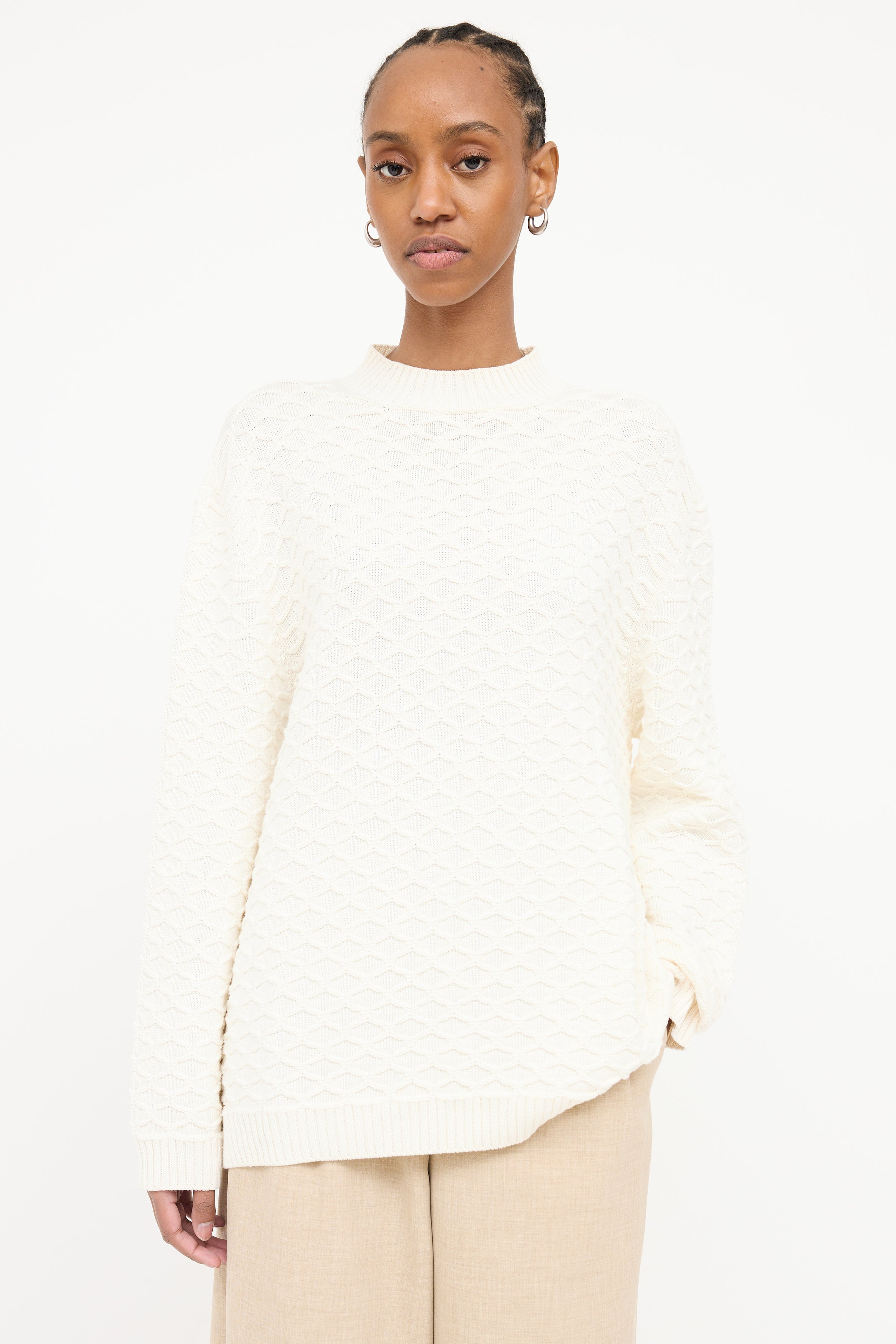 Pre-owned Loro Piana cream long sleeve silk blend knit sweater featuring ribbed mock neck, ribbed cuffs and hem and textured finish throughout sweater.