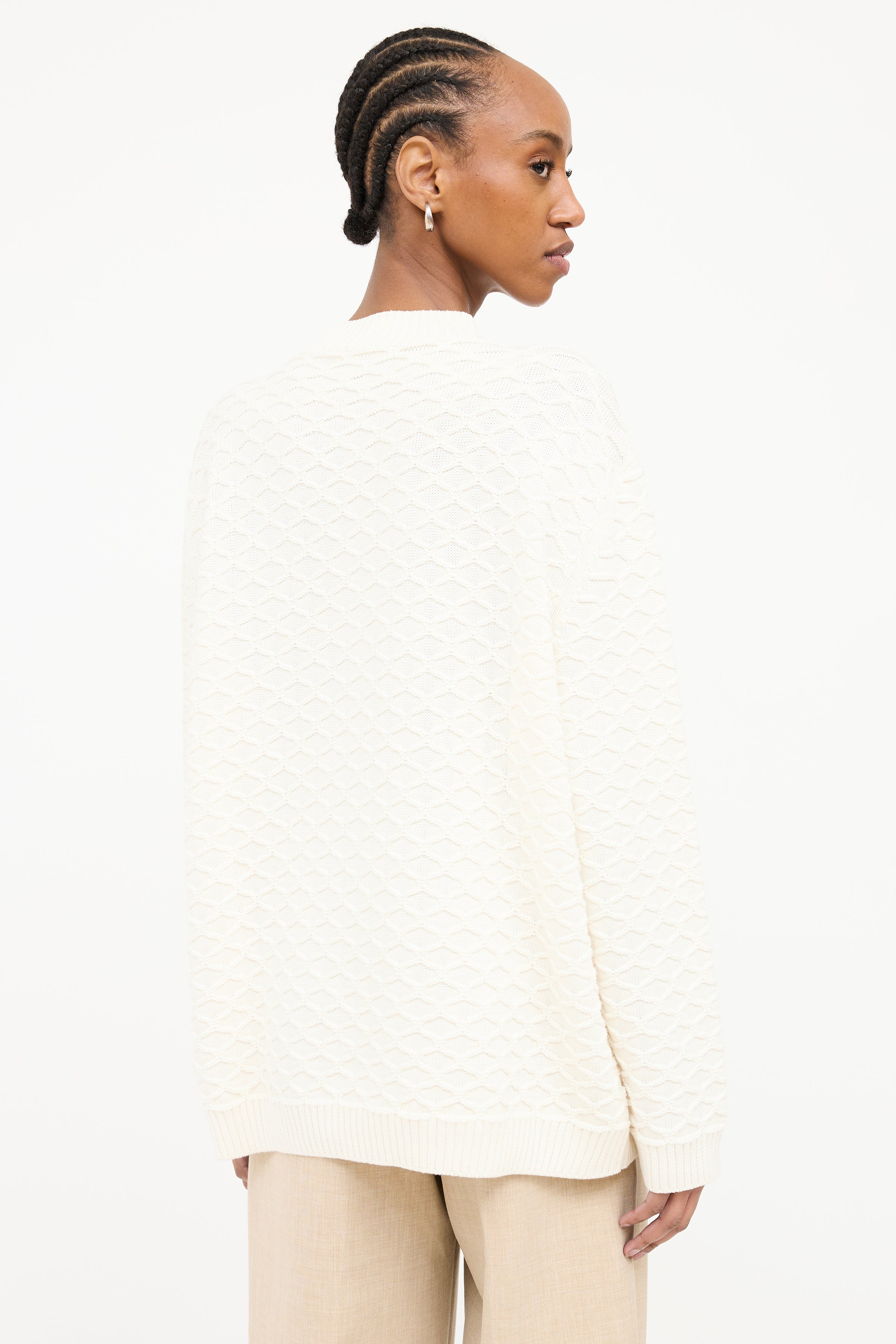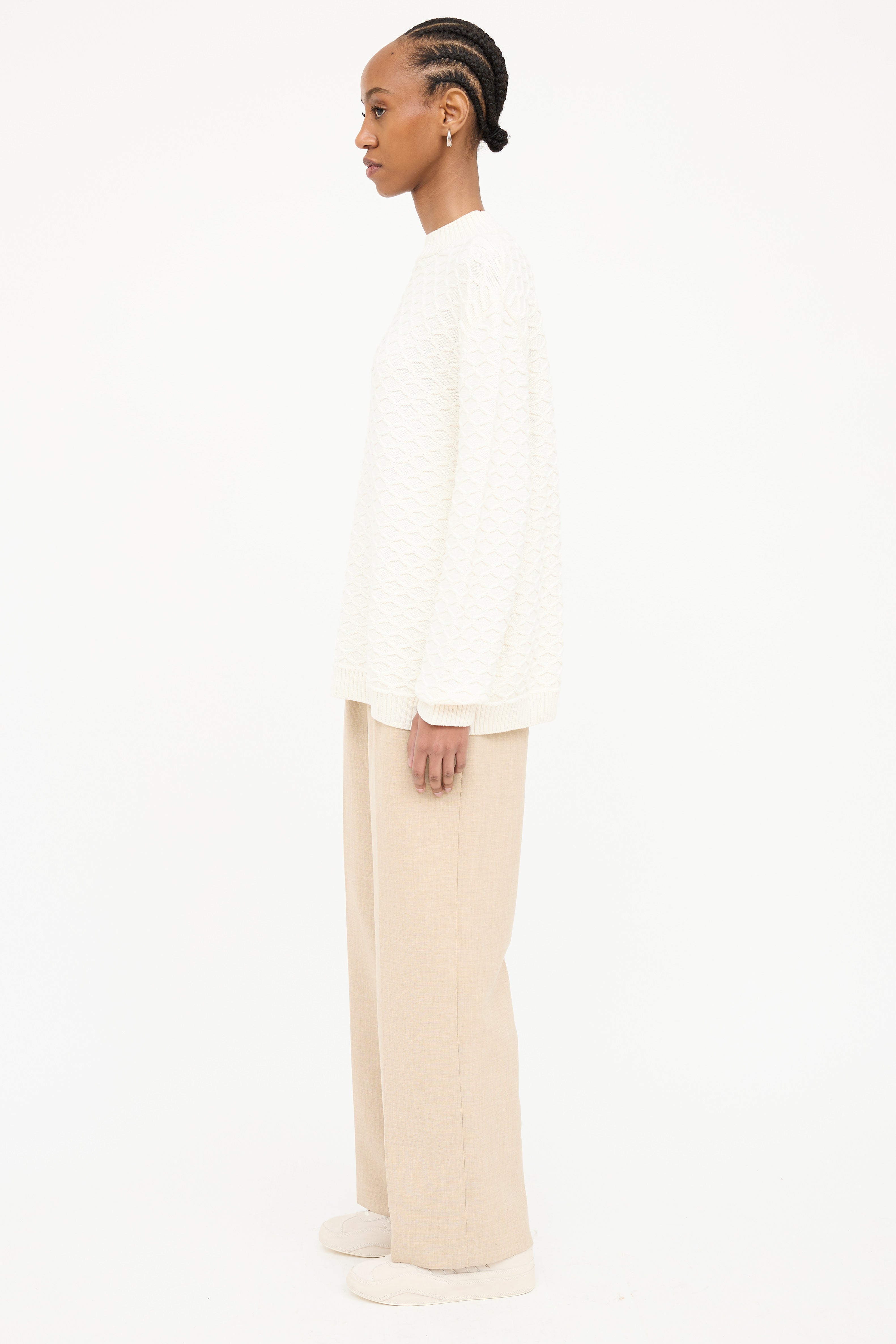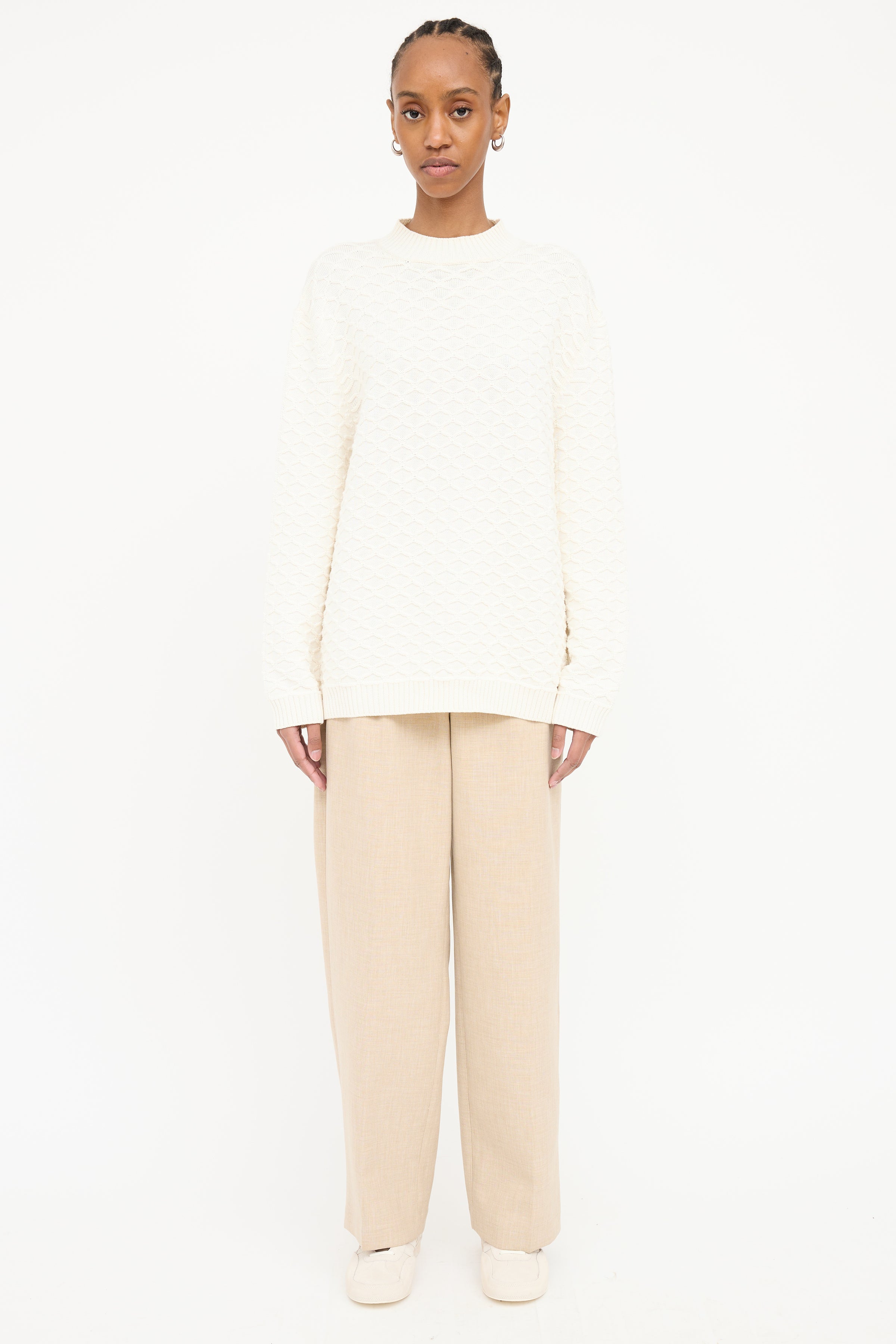 Pre-owned Loro Piana cream long sleeve silk blend knit sweater featuring ribbed mock neck, ribbed cuffs and hem and textured finish throughout sweater.