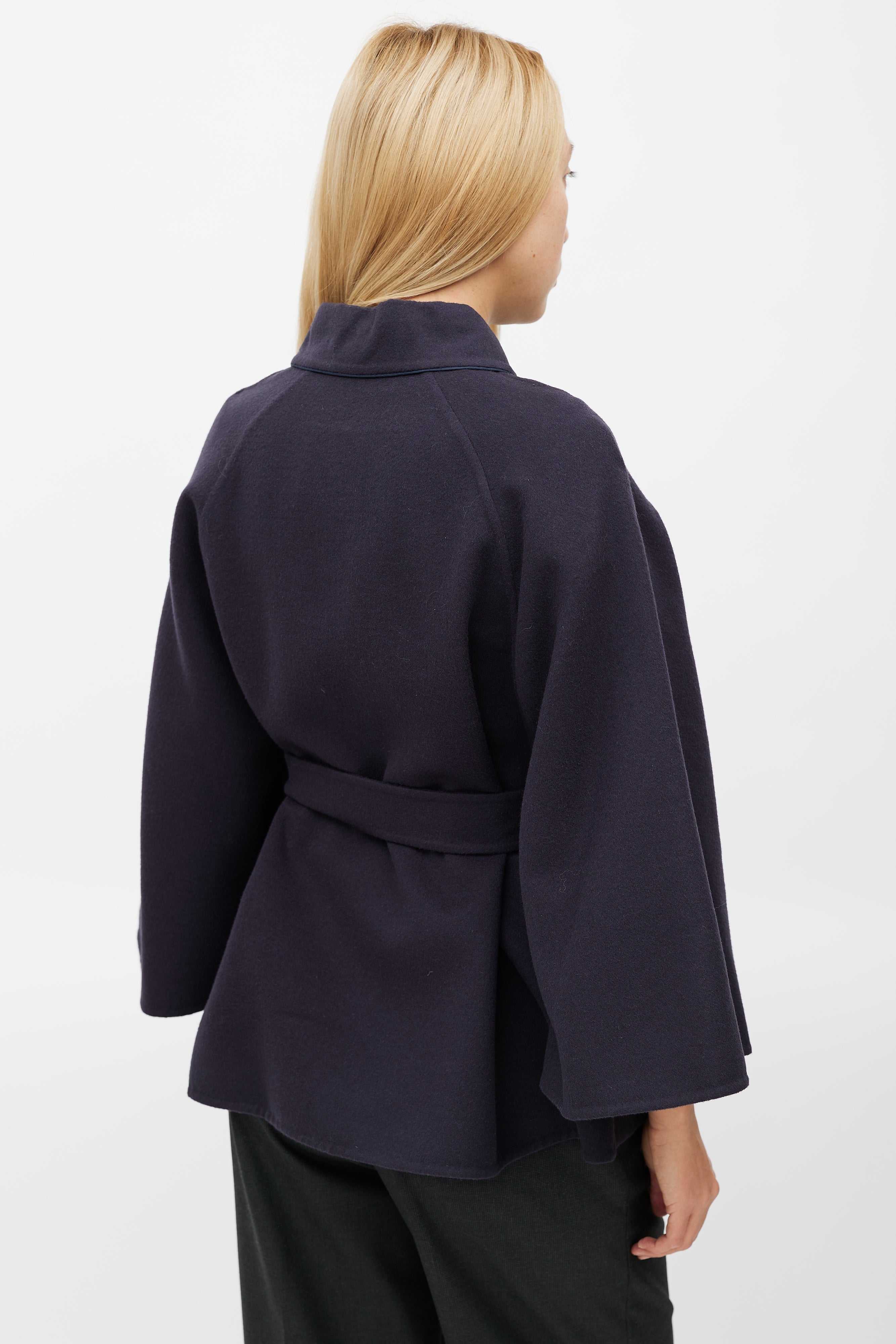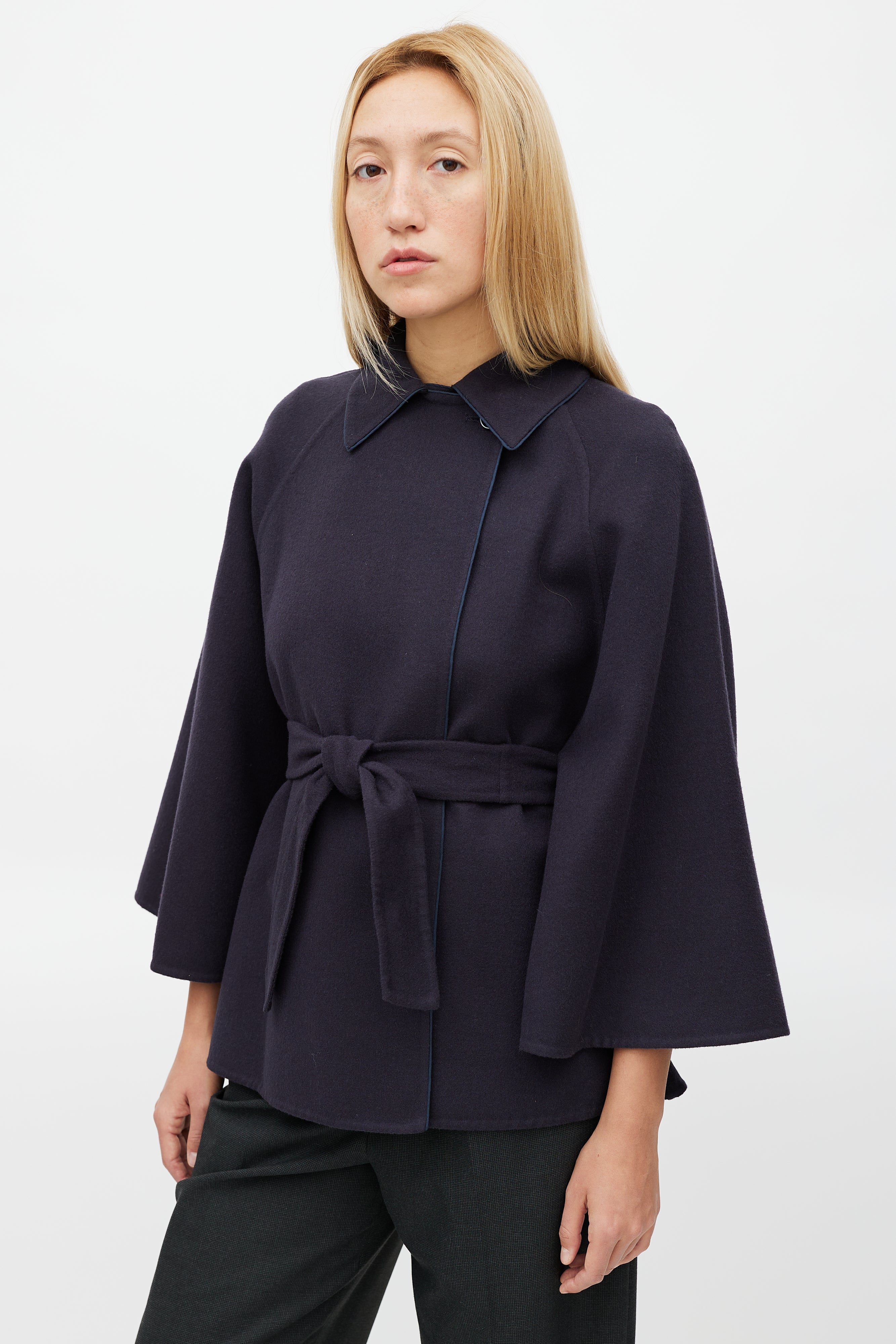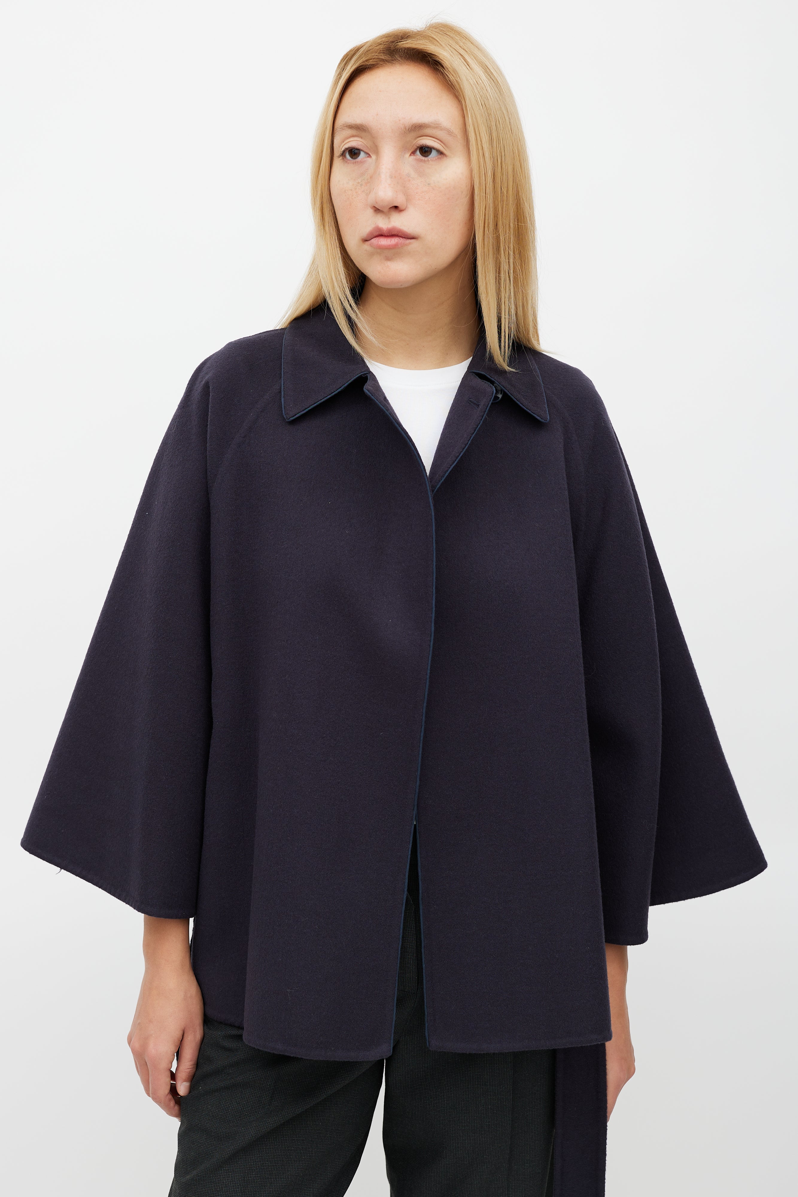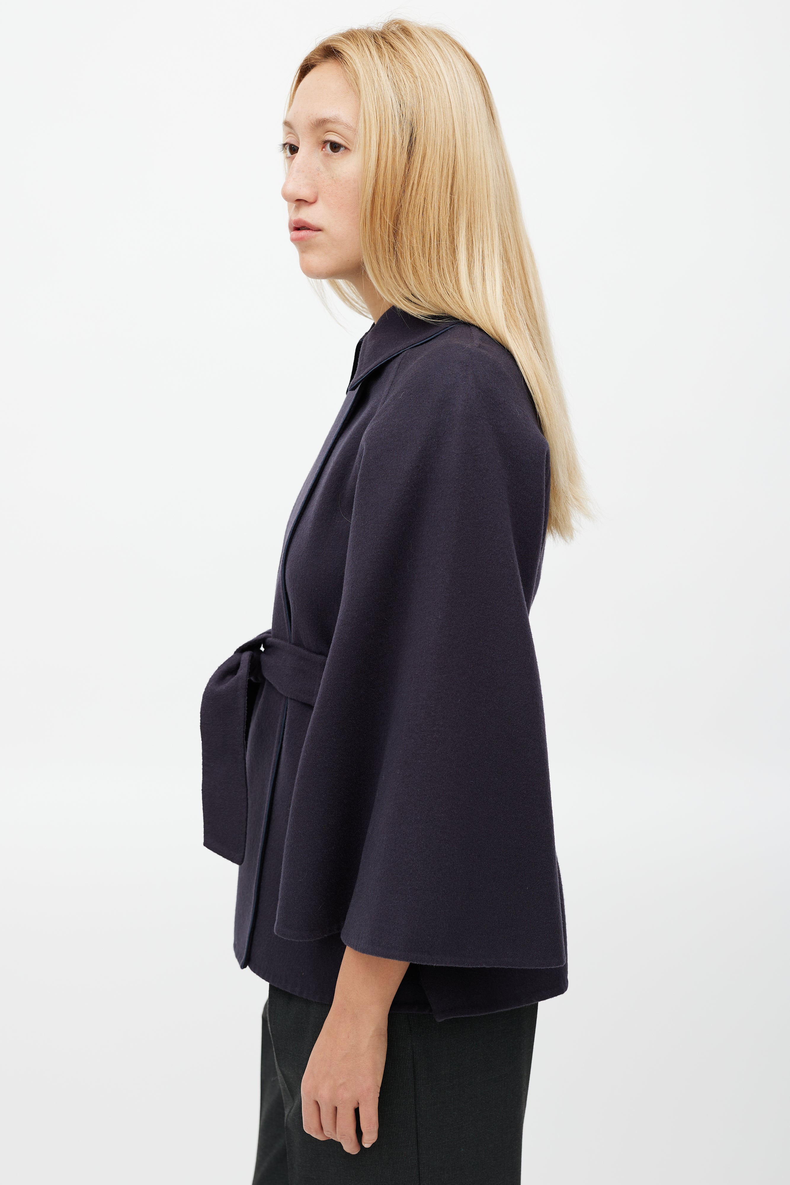Pre-owned Max Mara navy wool cape featuring a pointed collar with button detail, long sleeves, and tie belt at waist.
