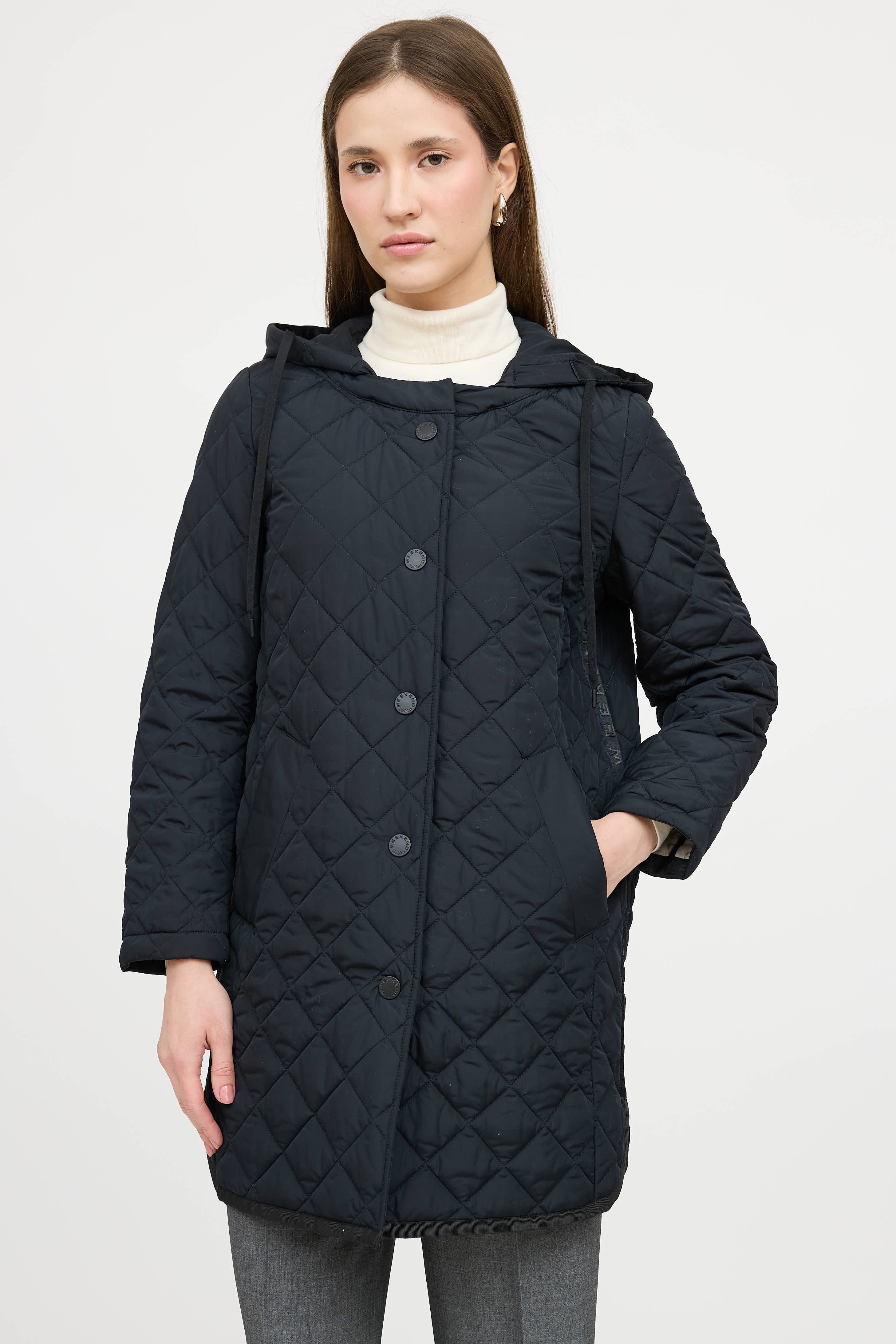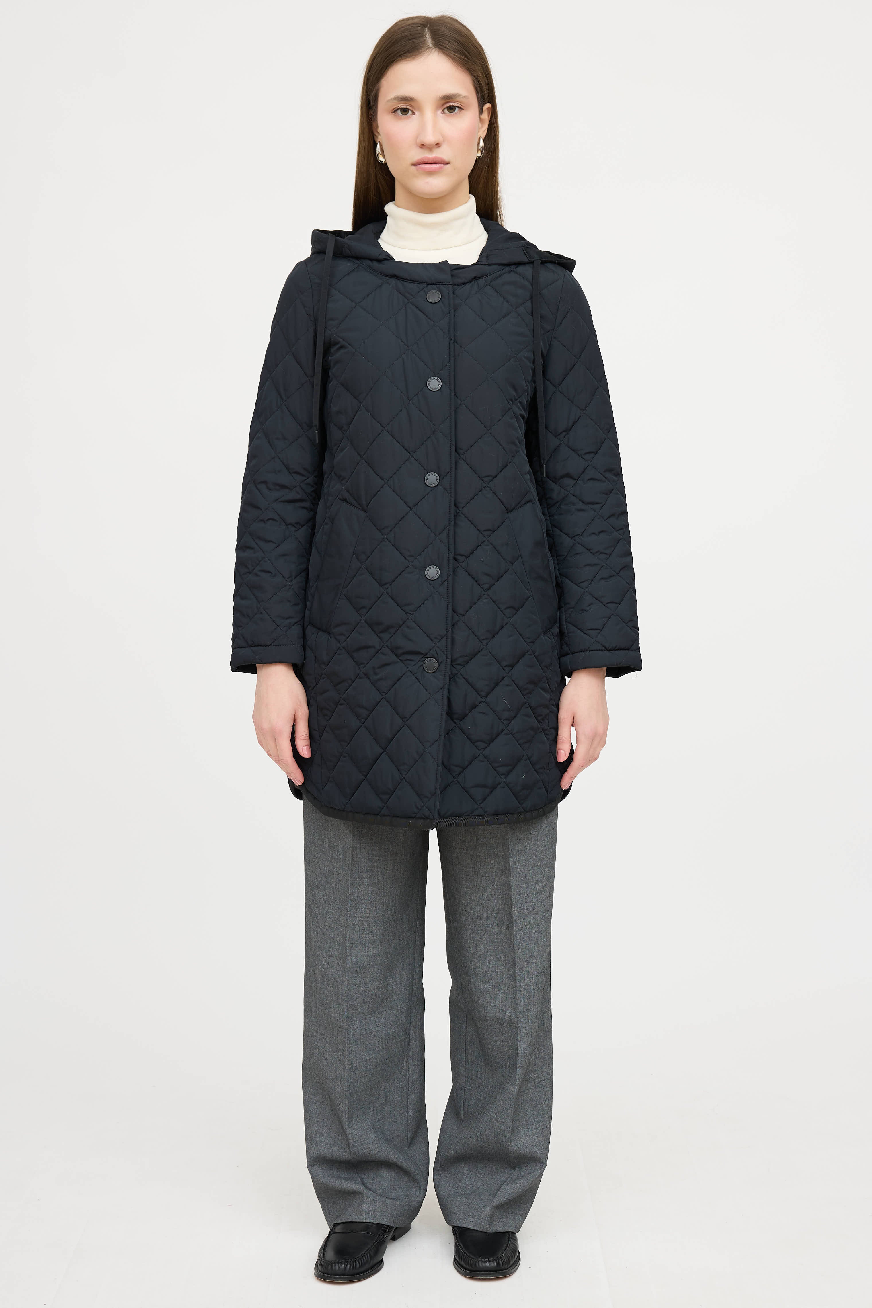 Pre-owned Weekend Max Mara navy coat featuring a drawstring hood, long sleeves, two slip pockets at hip, webbed logo trim at sides, and snap button up closure. Lined.