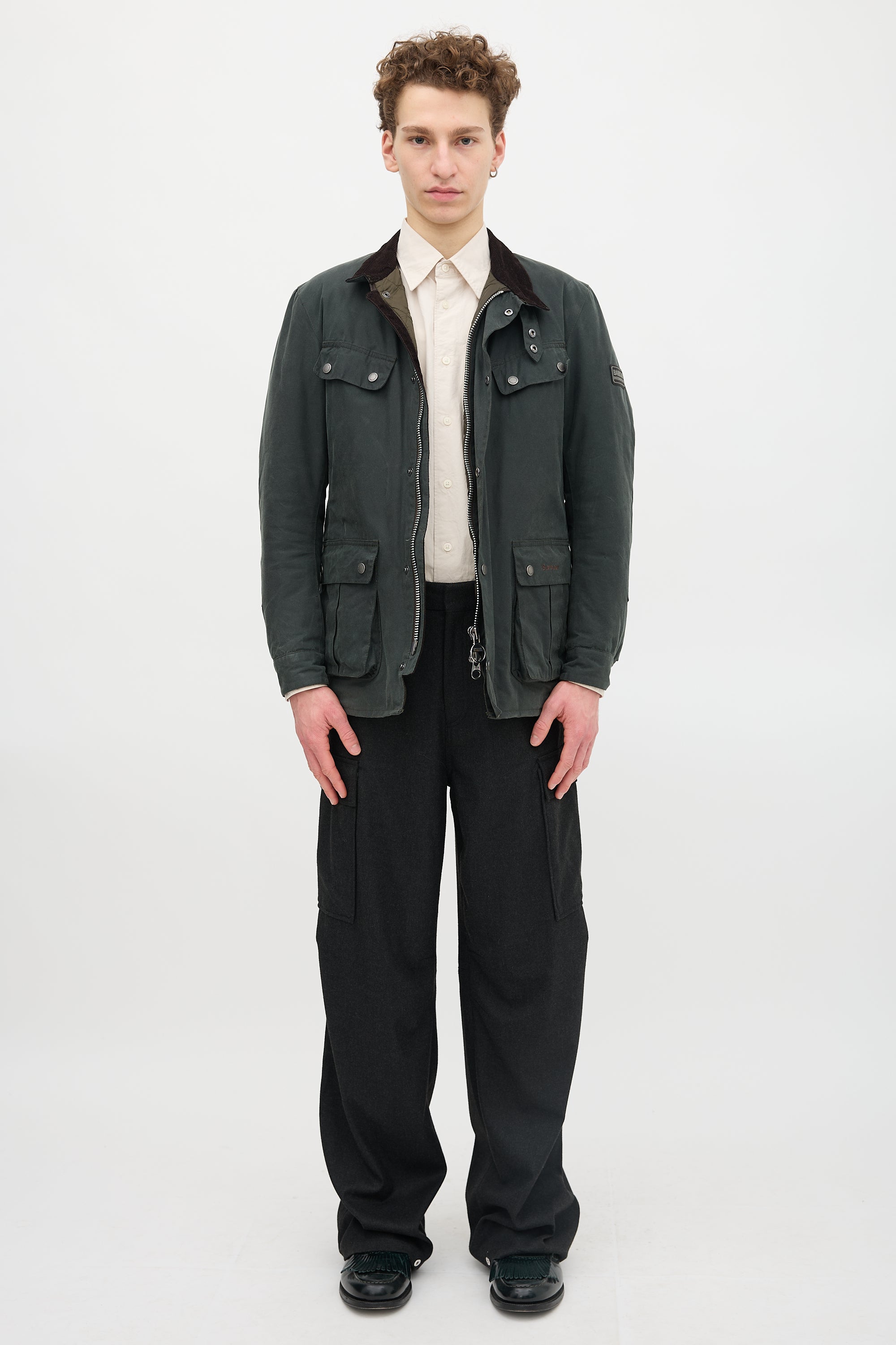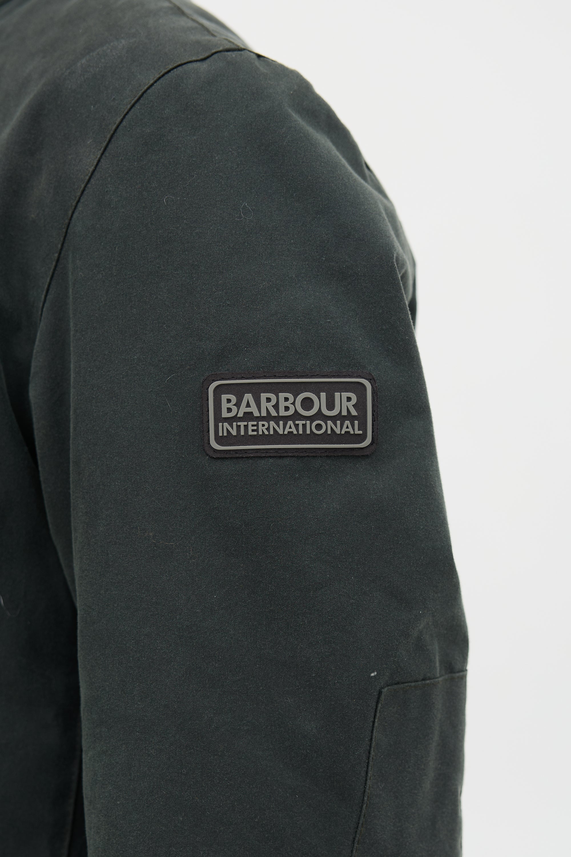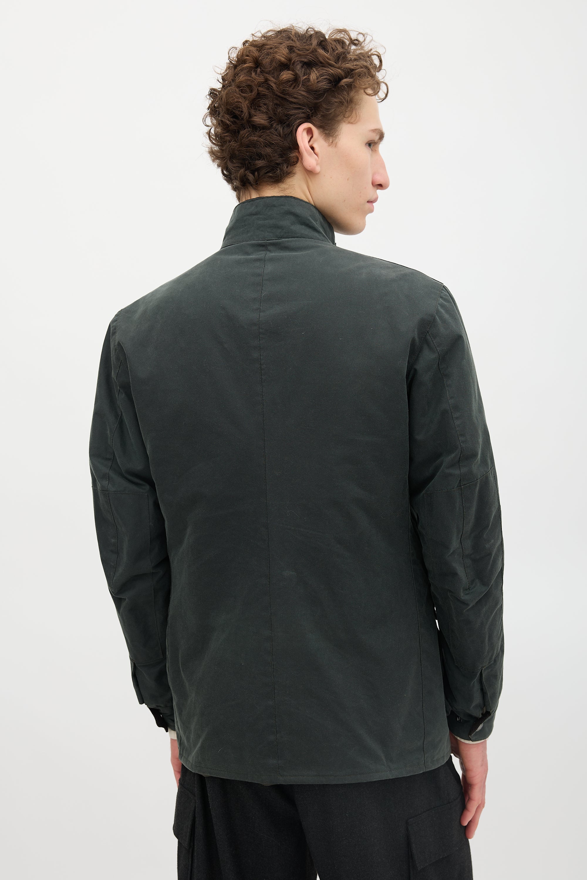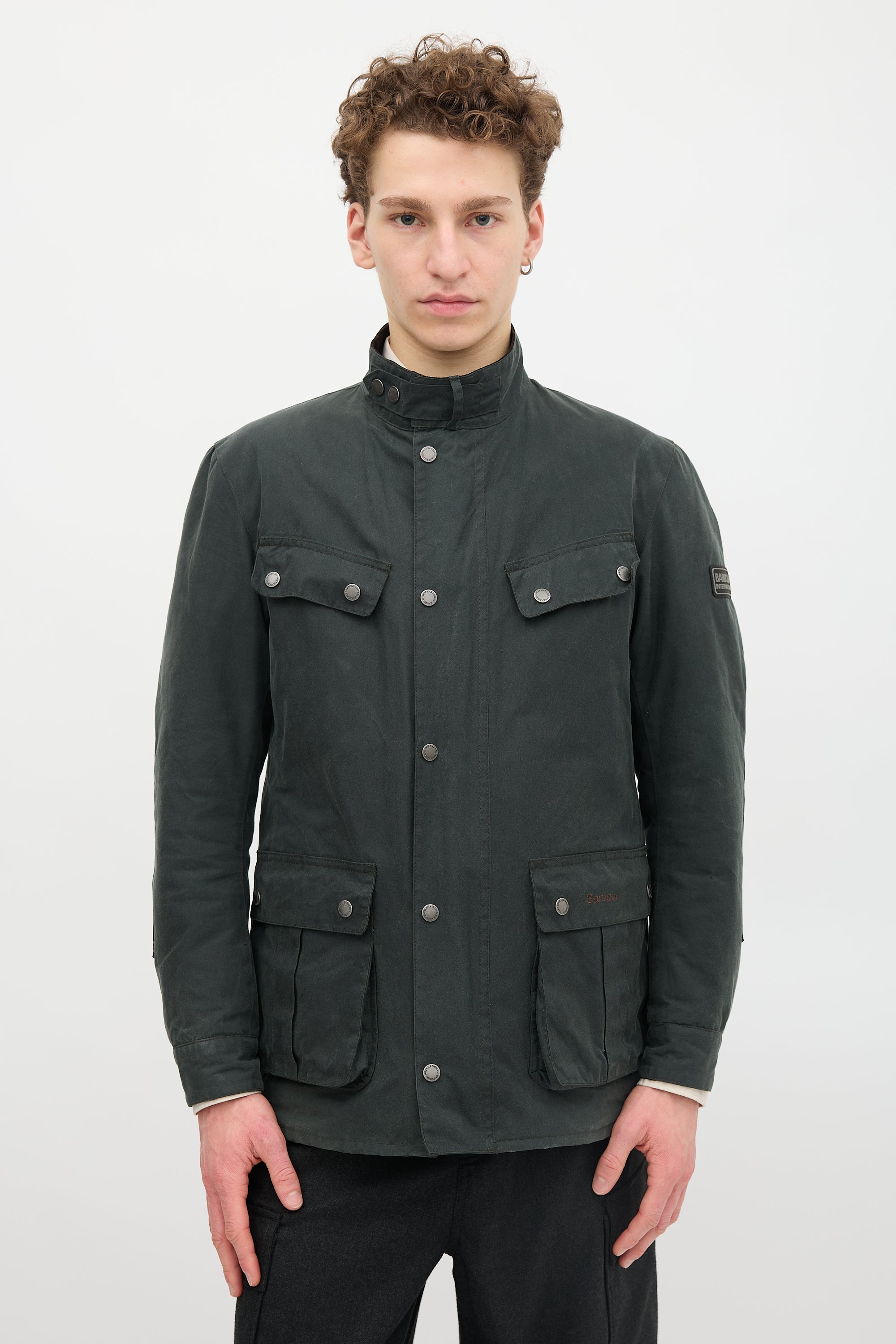 Pre-owned Barbour dark green waxed canvas Duke jacket featuring a corduroy funnel collar, two way zip front with snap button placket, four snap button flap pockets at front, rubber logo patch at sleeve, stitched logo at front, and button cuffs. Lined.
