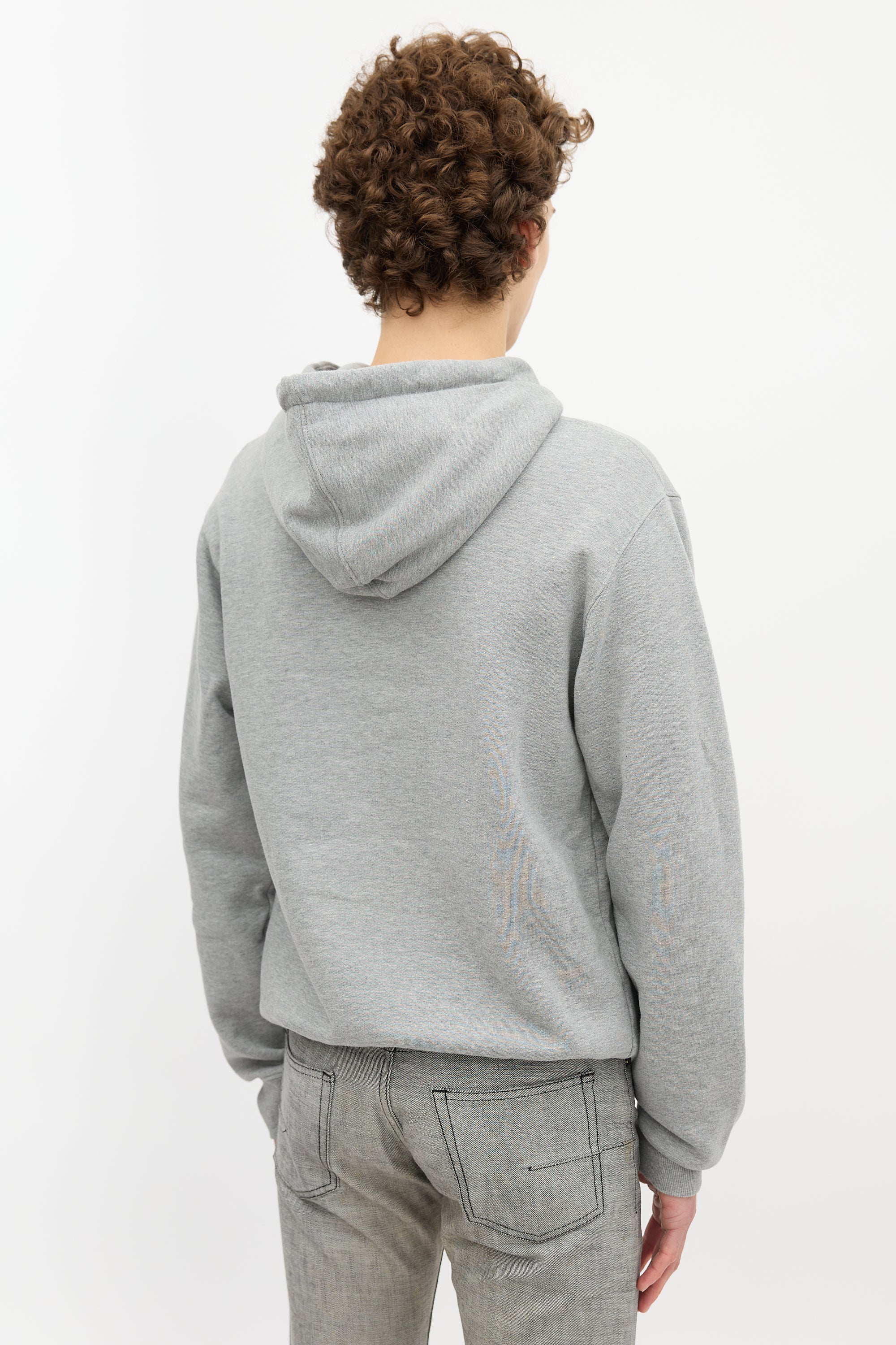Pre-owned Dior grey hoodie featuring an attached drawstring hood, tonal embroidered CD at chest, kangaroo pocket, and a ribbed hem and cuffs.