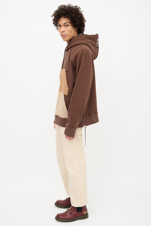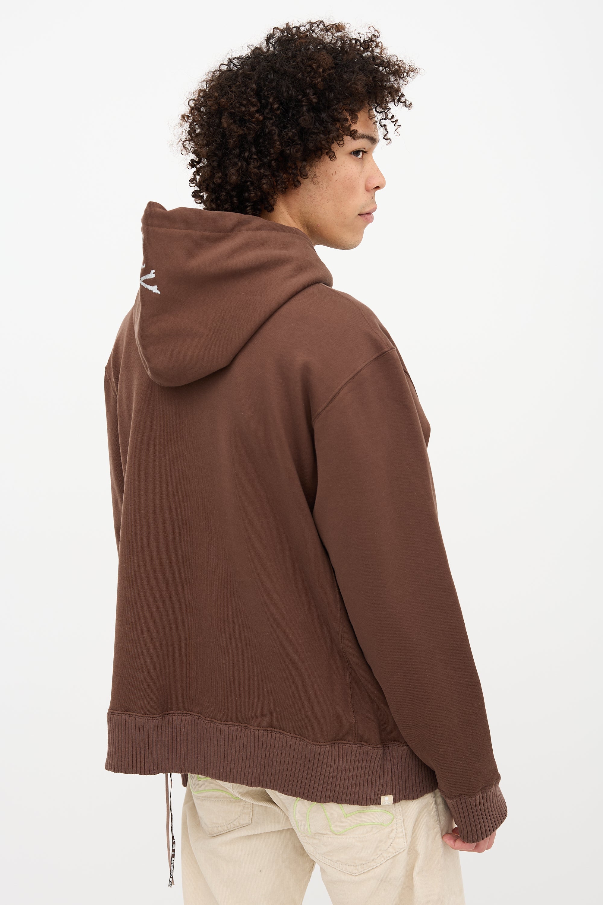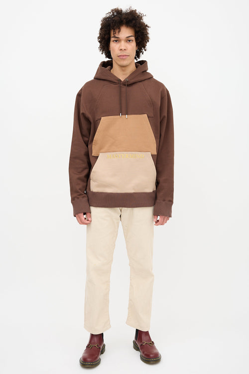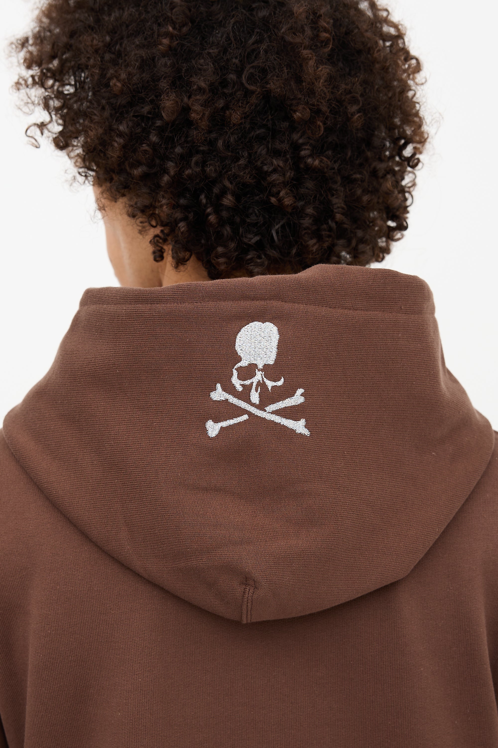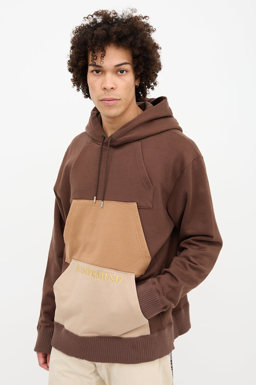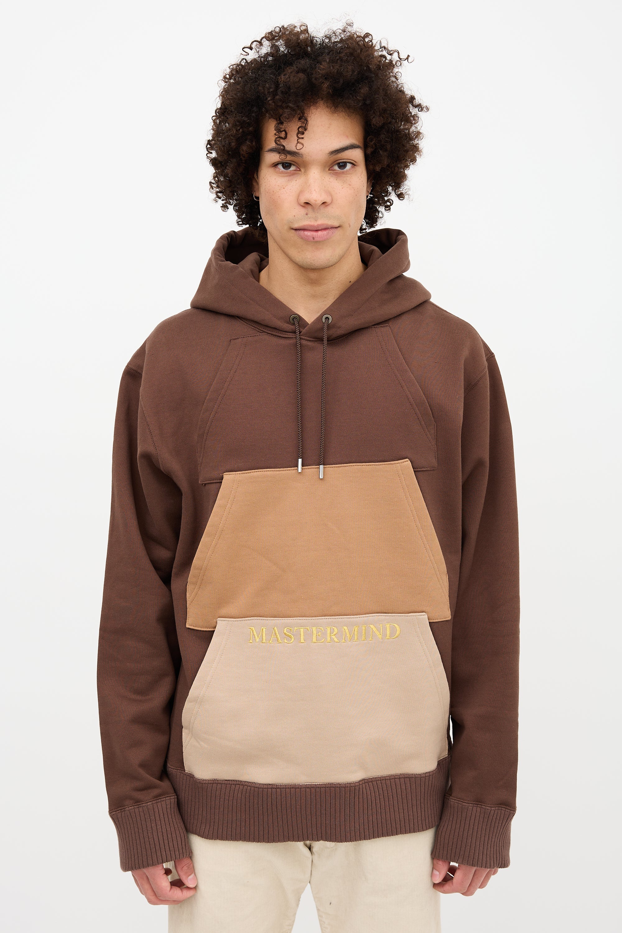 Pre-owned Mastermind World brown hoodie featuring a drawstring hood, three colourblock kangaroo pockets at front, gold embroidered logo at front, silver embroidered skull logo at back of hood, and a ribbed hem and cuffs.