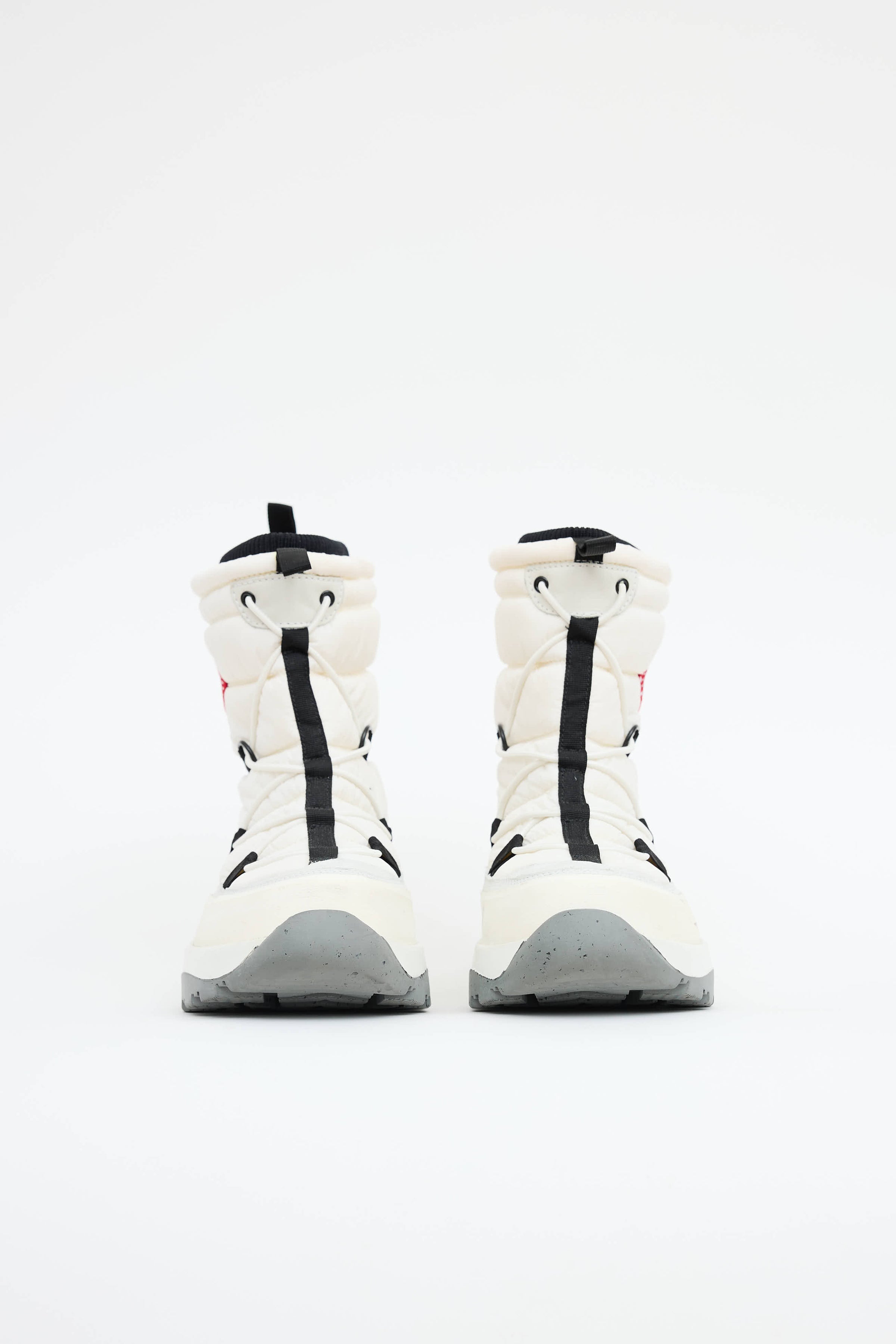 Pre-owned Canada Goose white Toronto boots featuring rubber chunky sole, slip on entry, signature logo patch at side, draw string and cord lace up detail and ribbed quilted layer at entry.