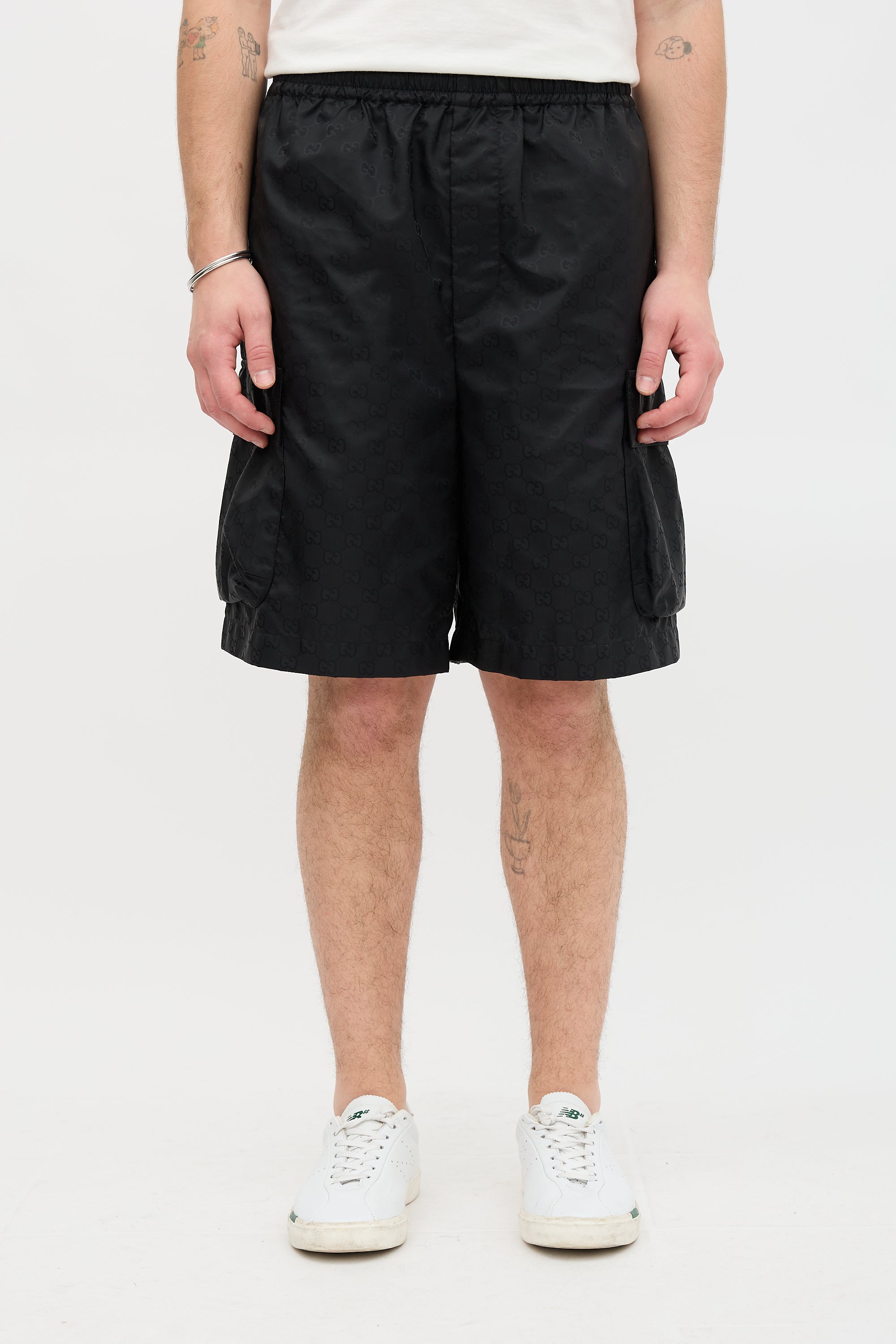 Pre-owned Gucci black nylon shorts featuring a tonal GG monogram, elasticized waist, faux fly, two slip pockets at hip, two cargo pockets at outseam, and one zip pocket at back.