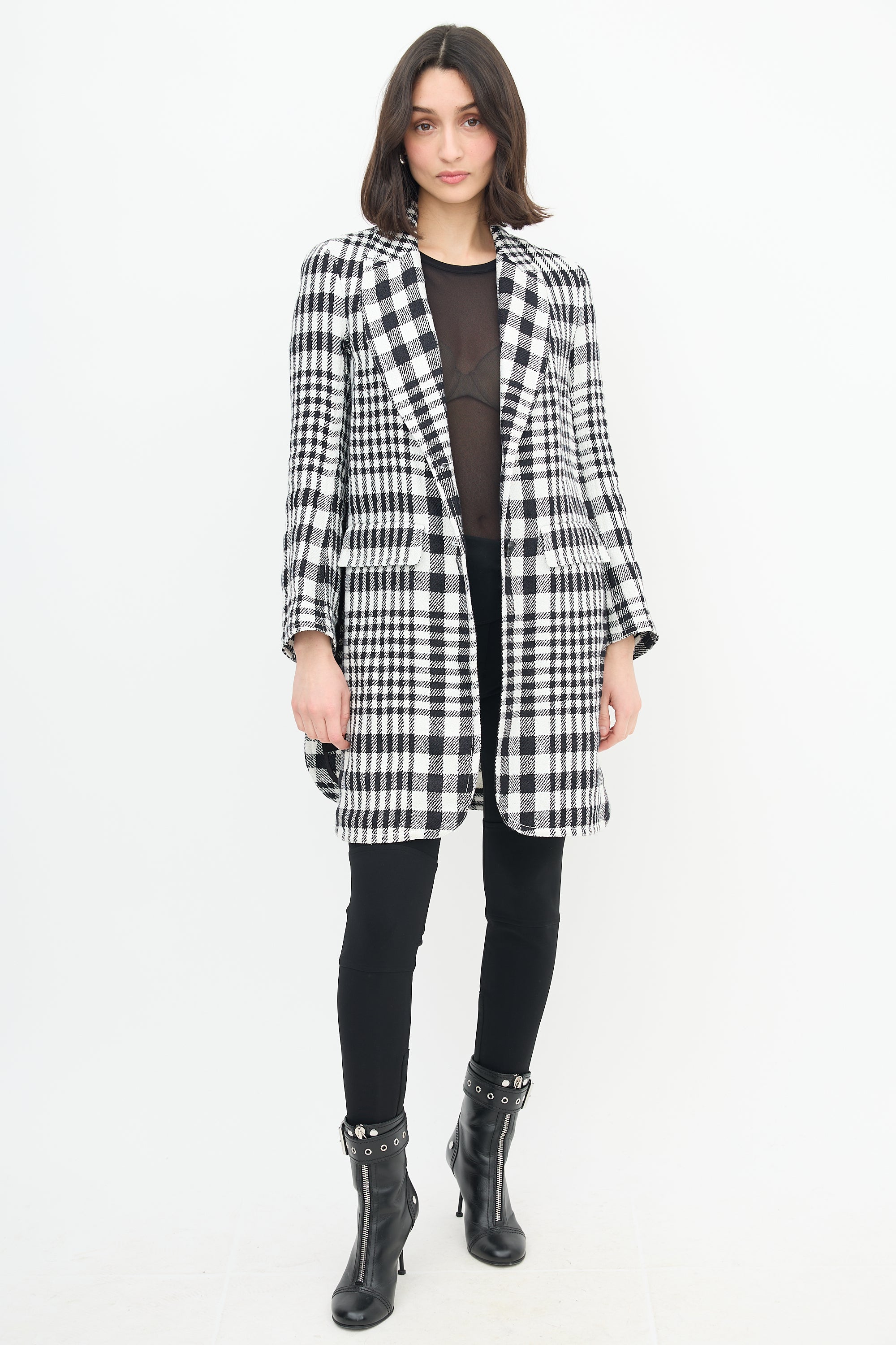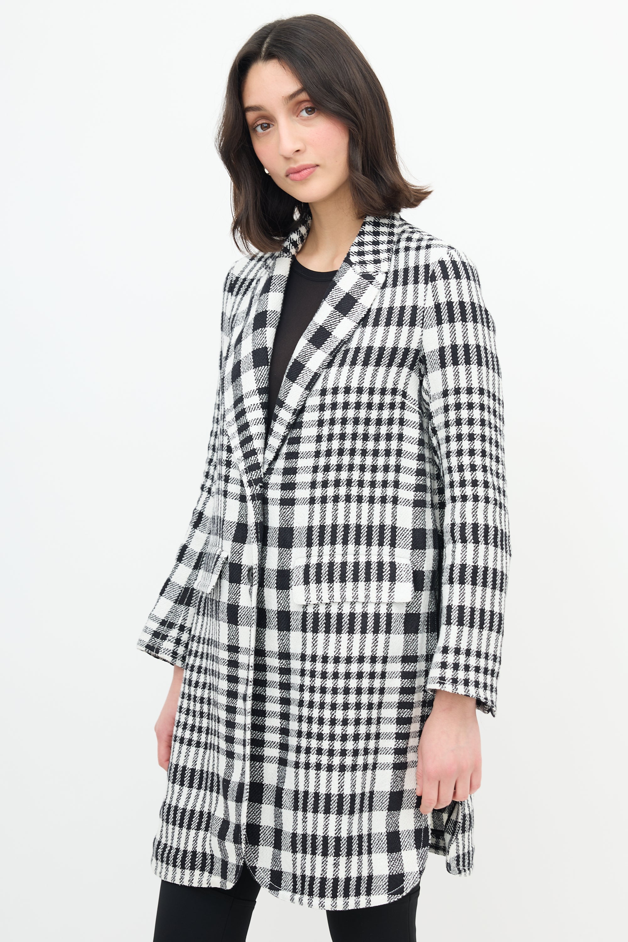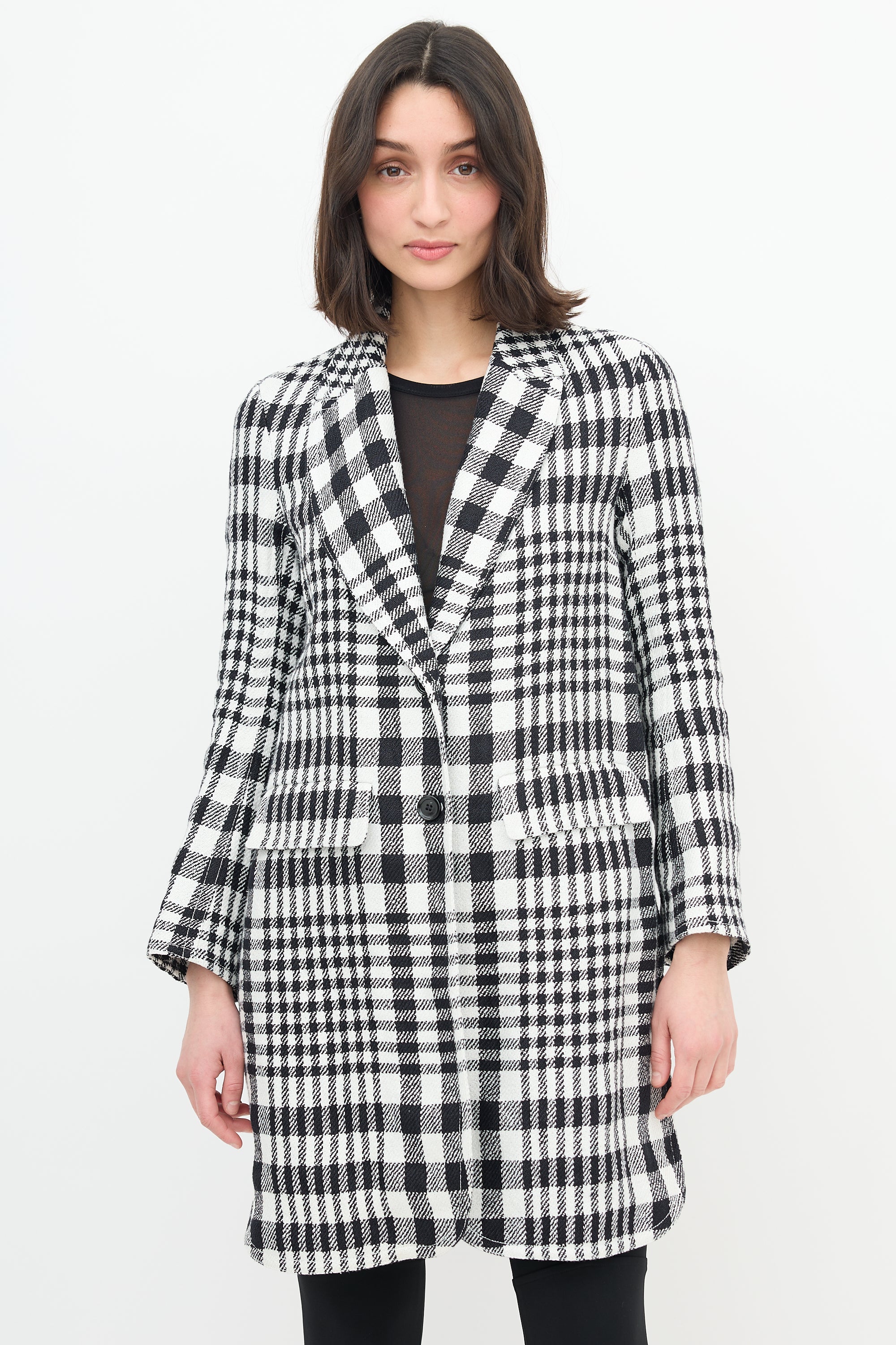 Pre-owned Ermanno Scervino black and white linen coat featuring peak lapel, buttoned front, sideless with buckle fastening, two flap pockets at front, and buttoned cuffs.