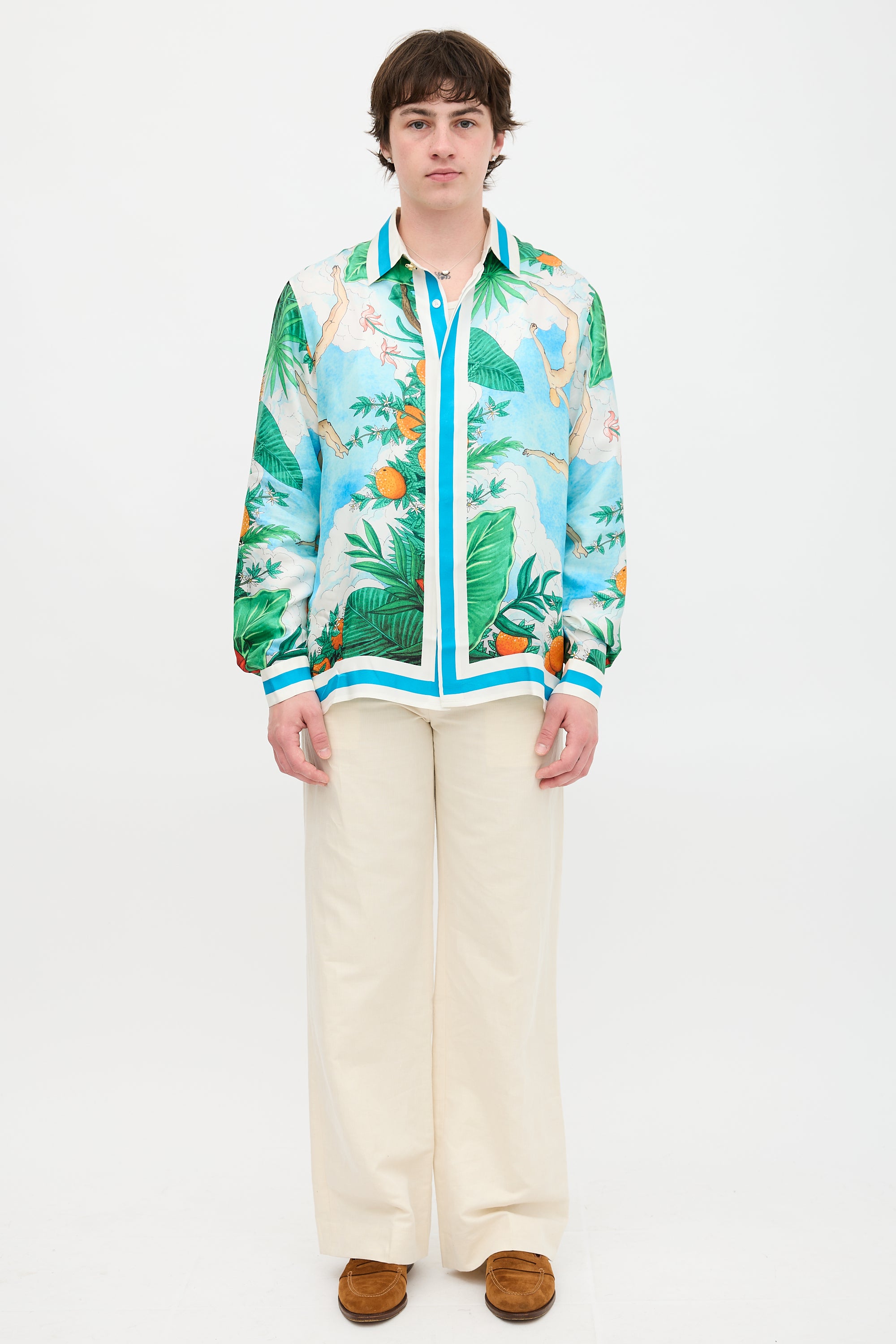 Pre-owned Casablanca blue and green silk shirt featuring a foliage and character motif throughout, point collar, concealed button front, and buttoned cuffs.