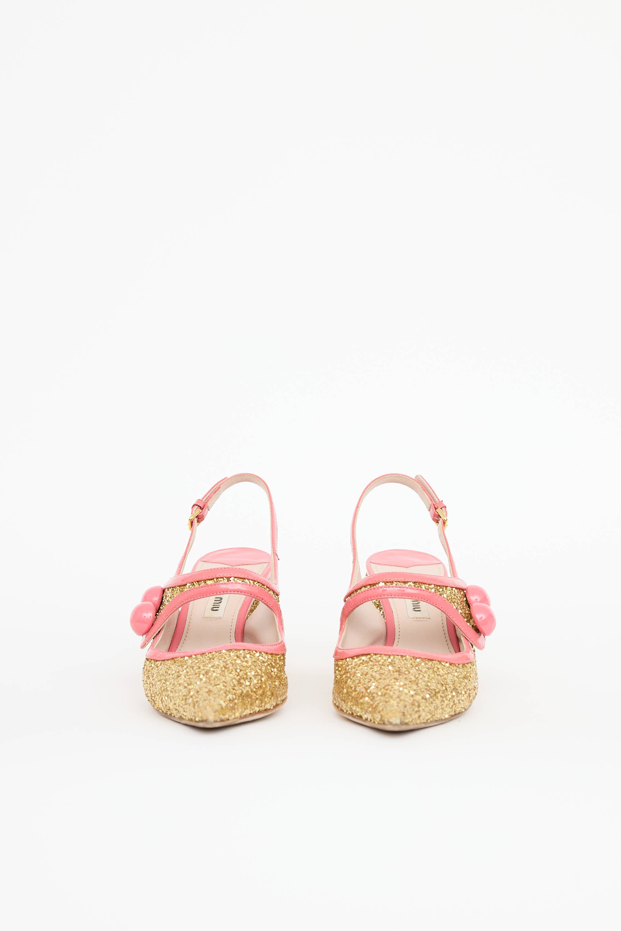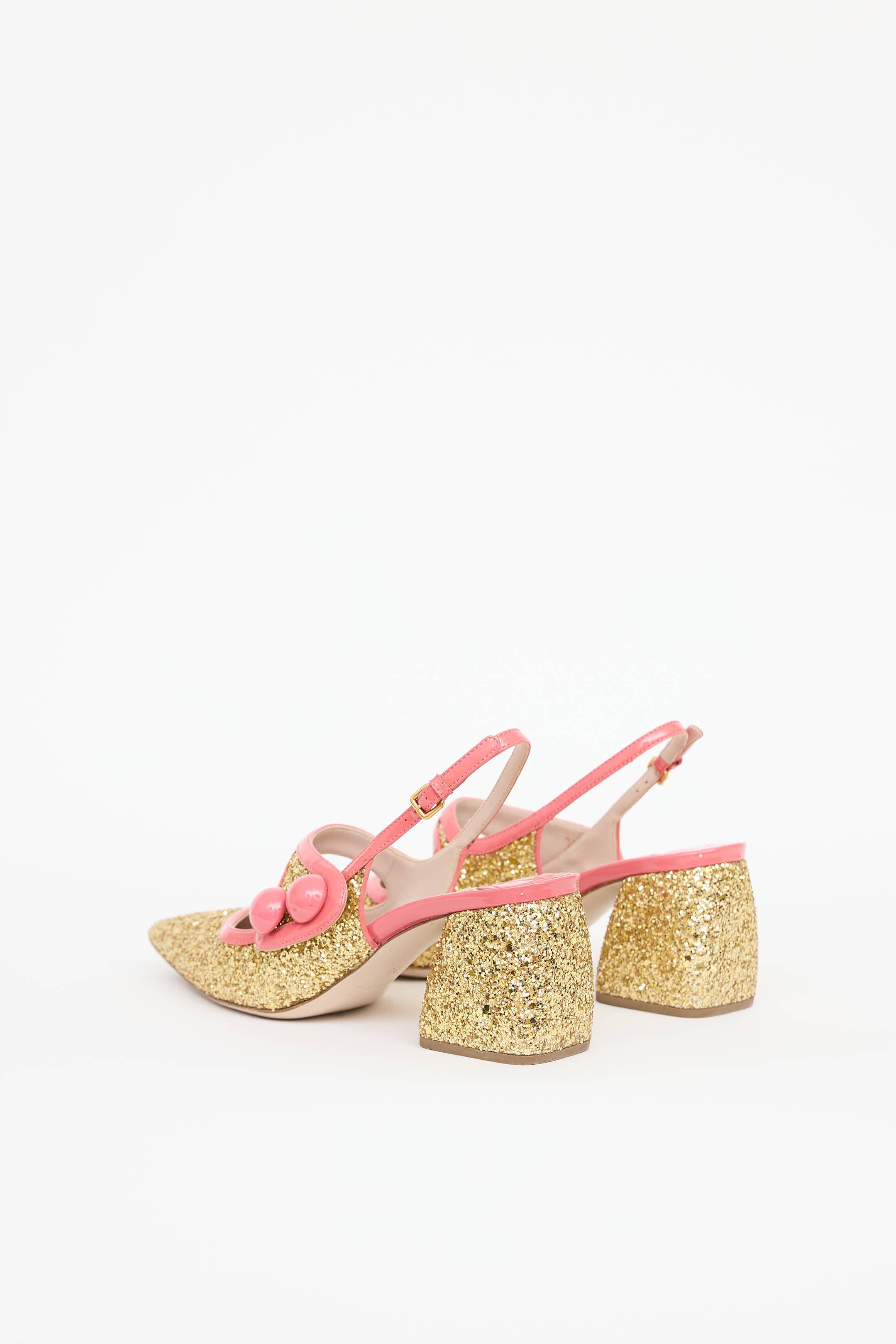 Pre-owned Miu Miu pink and gold glitter and patent leather pump featuring pointed toe, strap at vamp, adjustable ankle strap, and covered block heel.