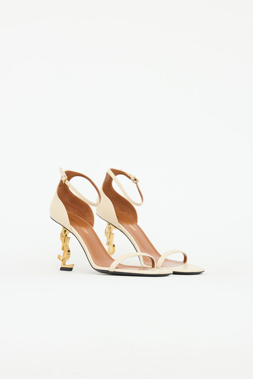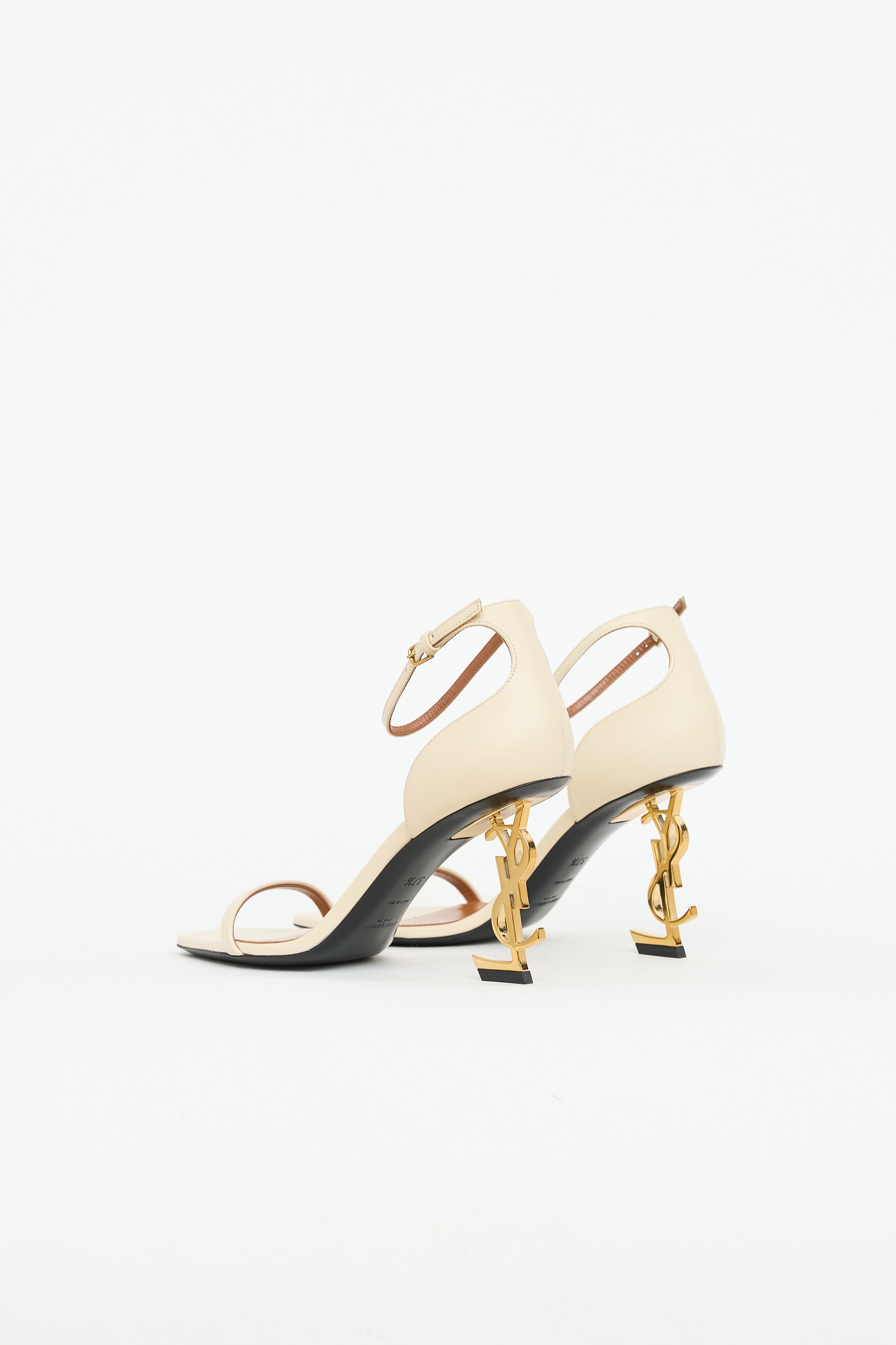 Pre-owned Saint Laurent cream Opyum sandals featuring leather adjustable ankle strap, square open toe, and gold tone Cassandre logo heel.