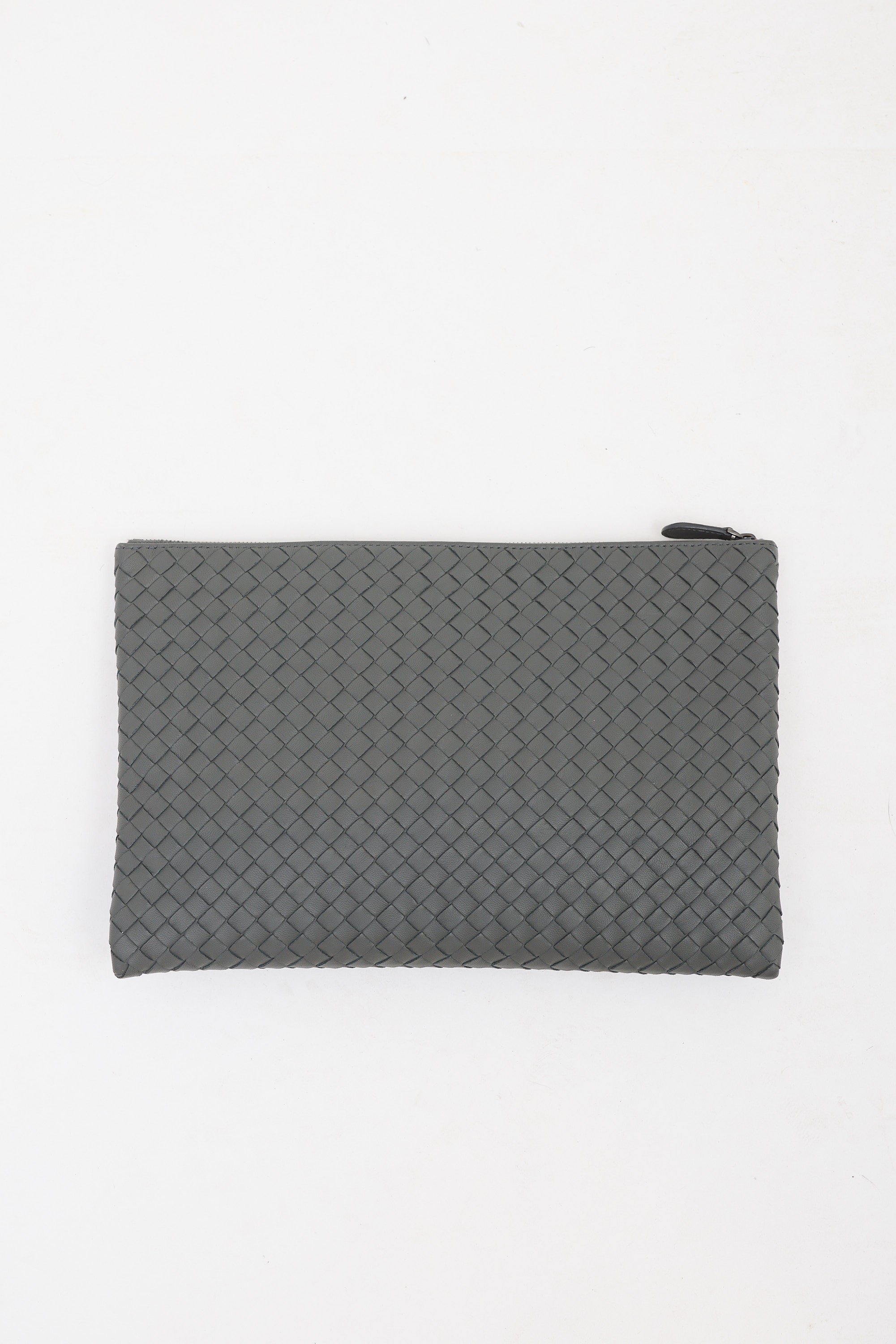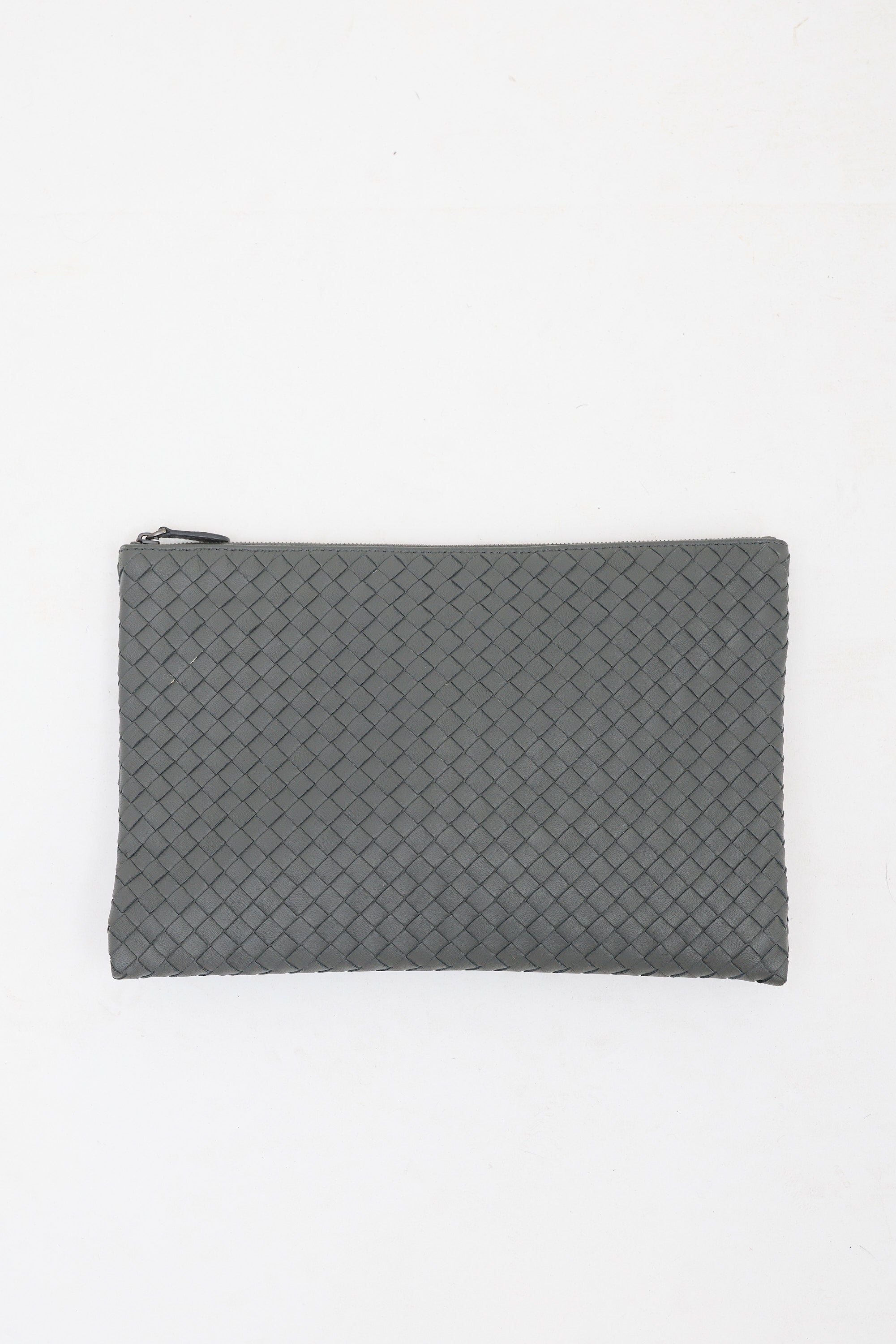 Pre-owned Bottega Veneta grey intrecciato leather pouch featuring woven design, top zip closure, two lined main compartments, one slip pocket, and six card slots. Comes with original dust bag.