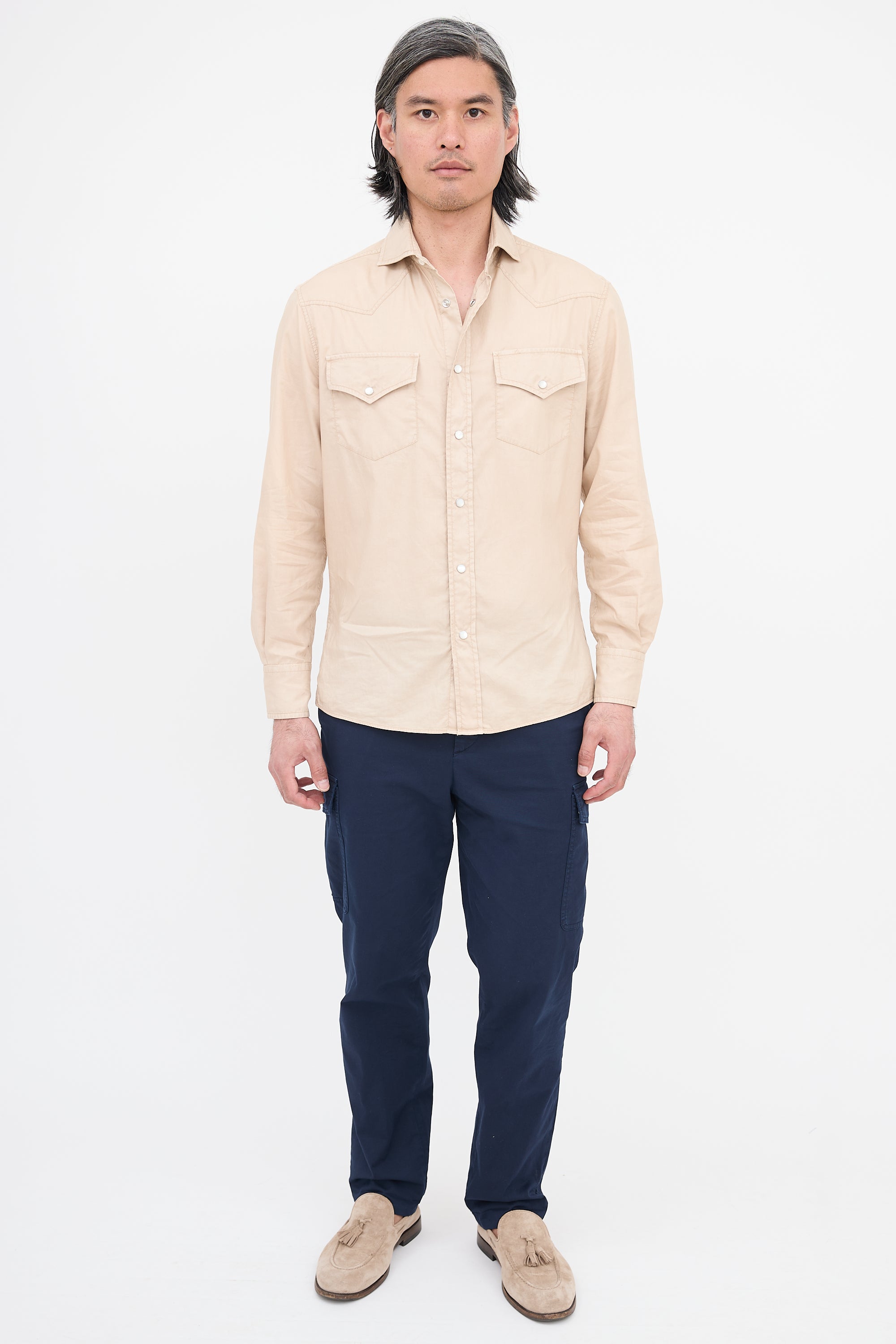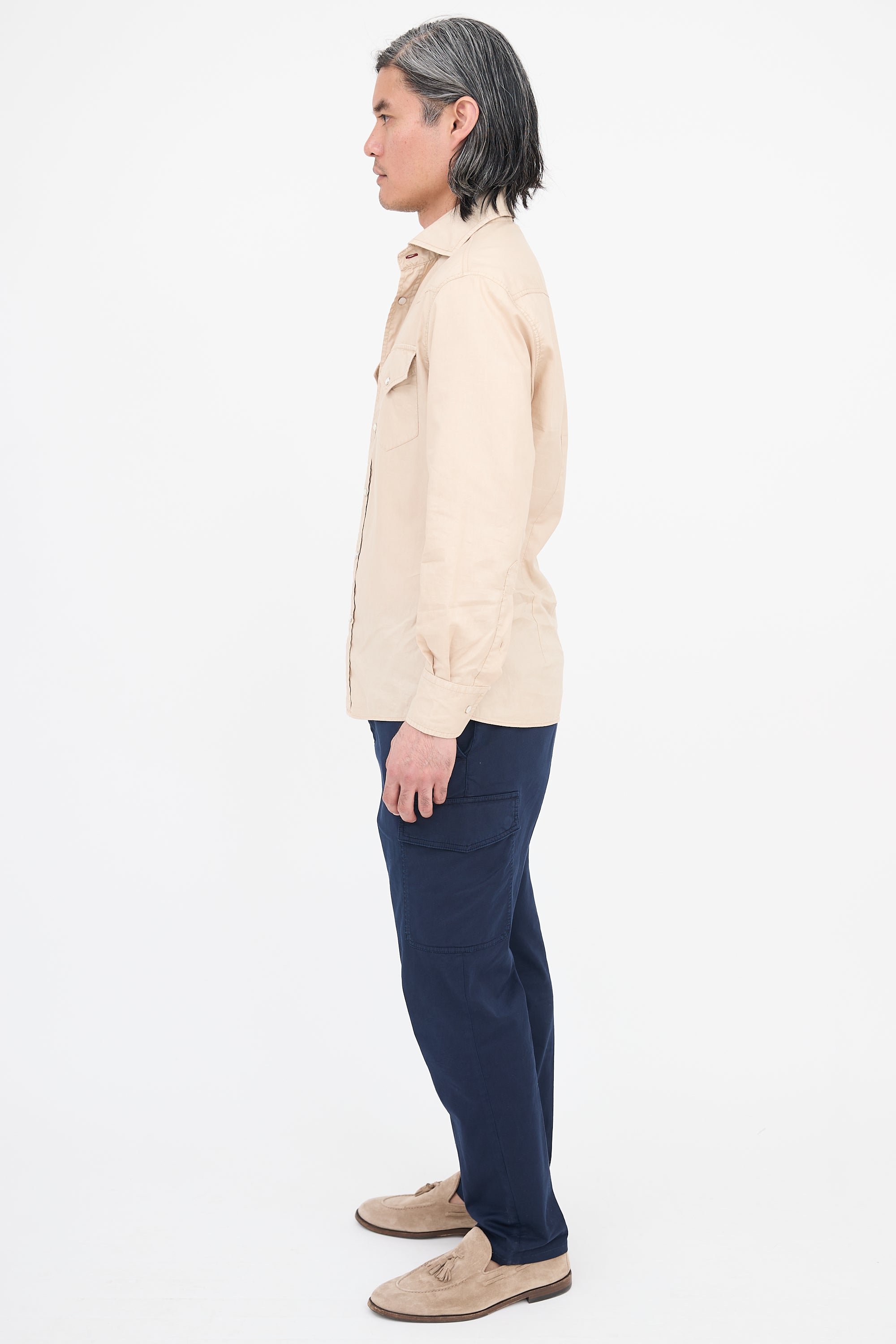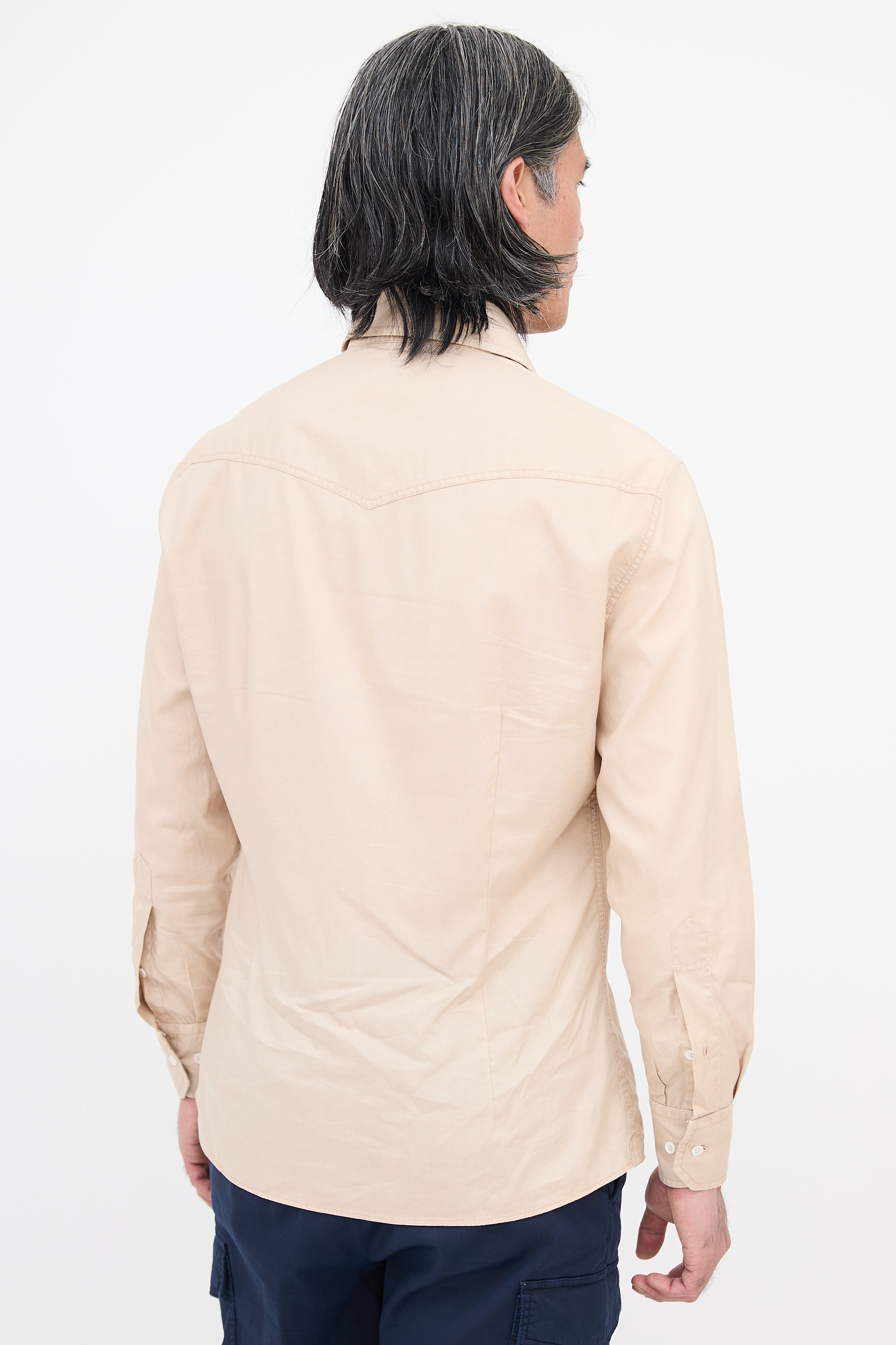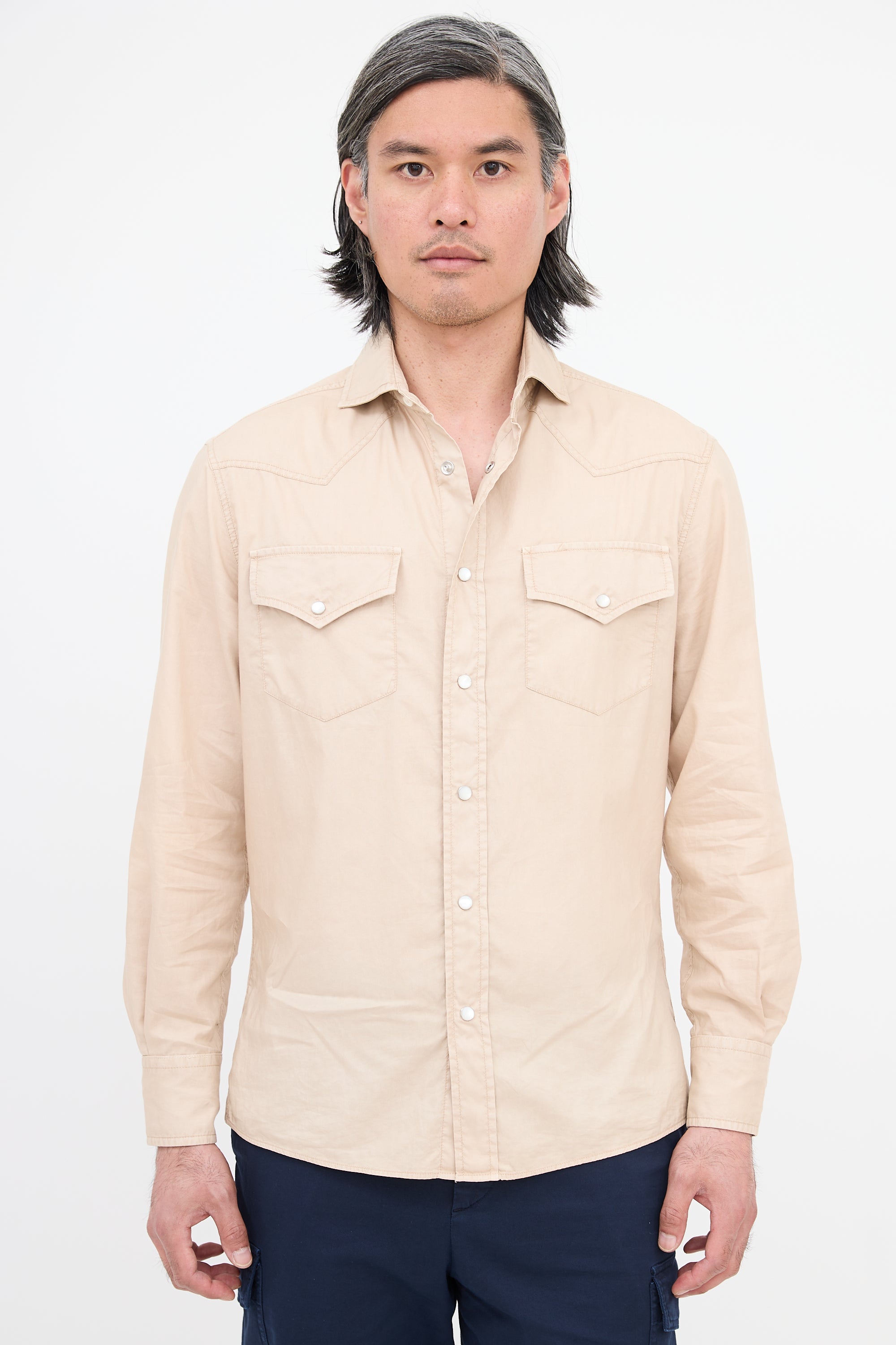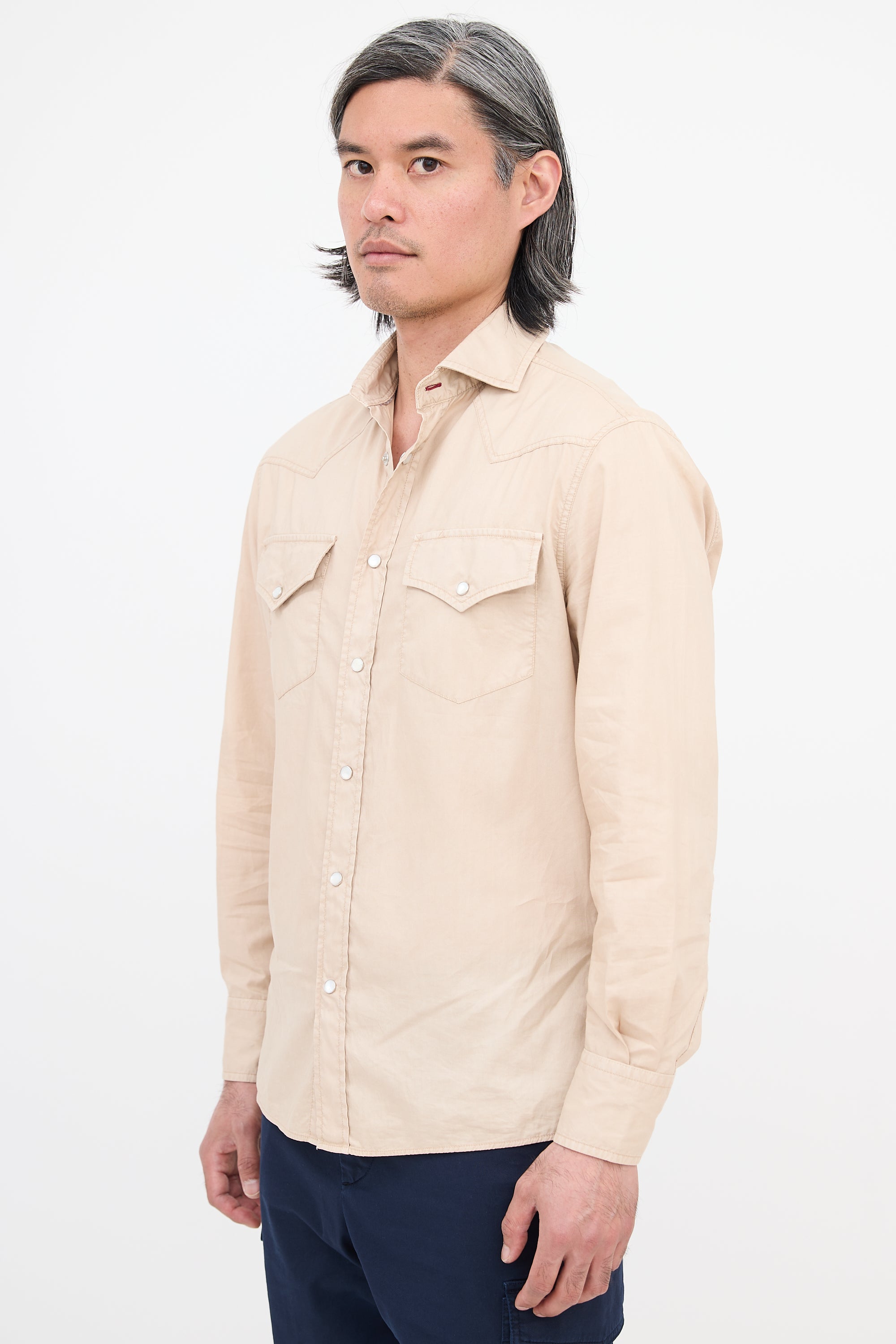Pre-owned Brunello Cucinelli beige leisure fit shirt featuring cutaway collar, snap button front, two front flap pockets, and buttoned cuffs.