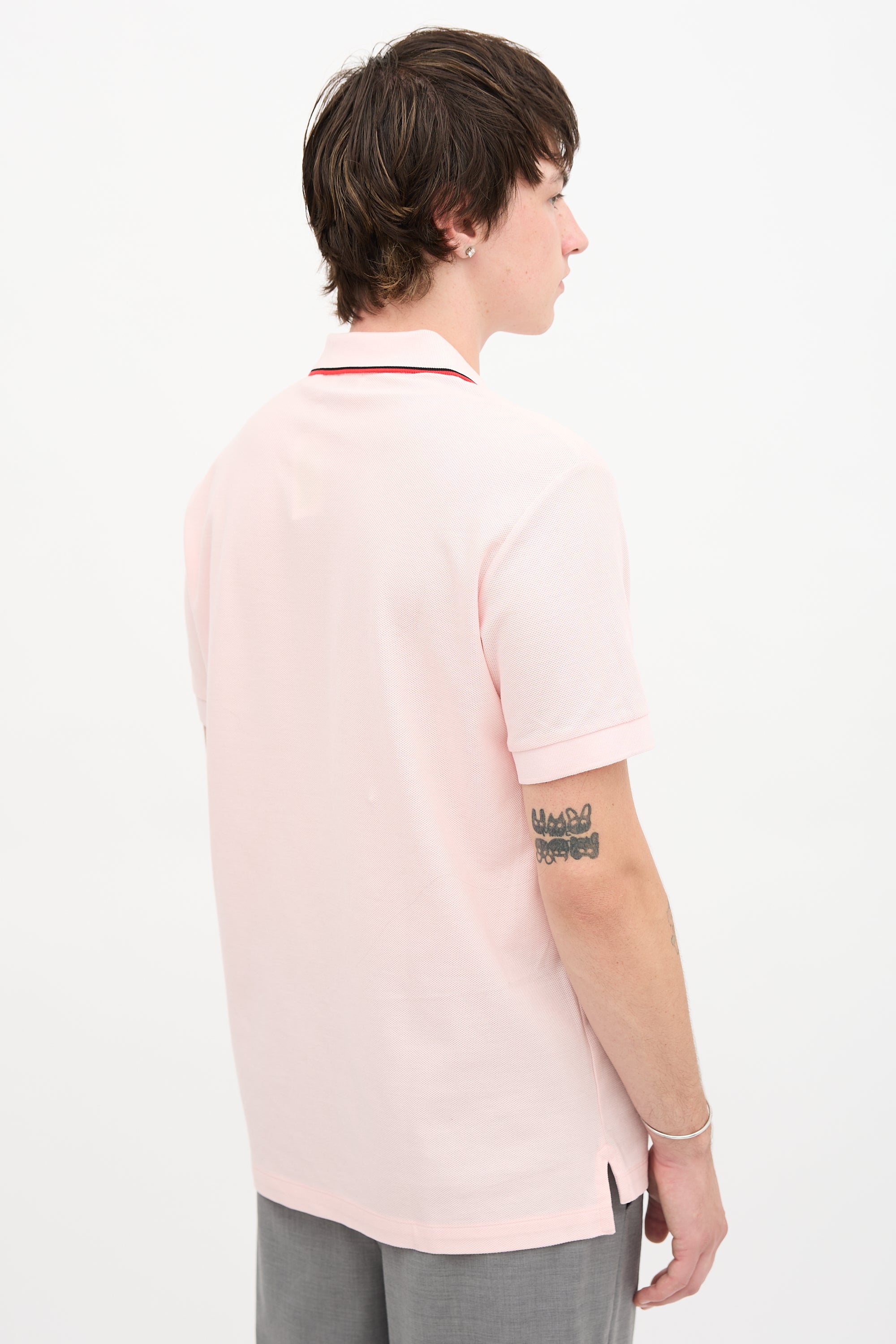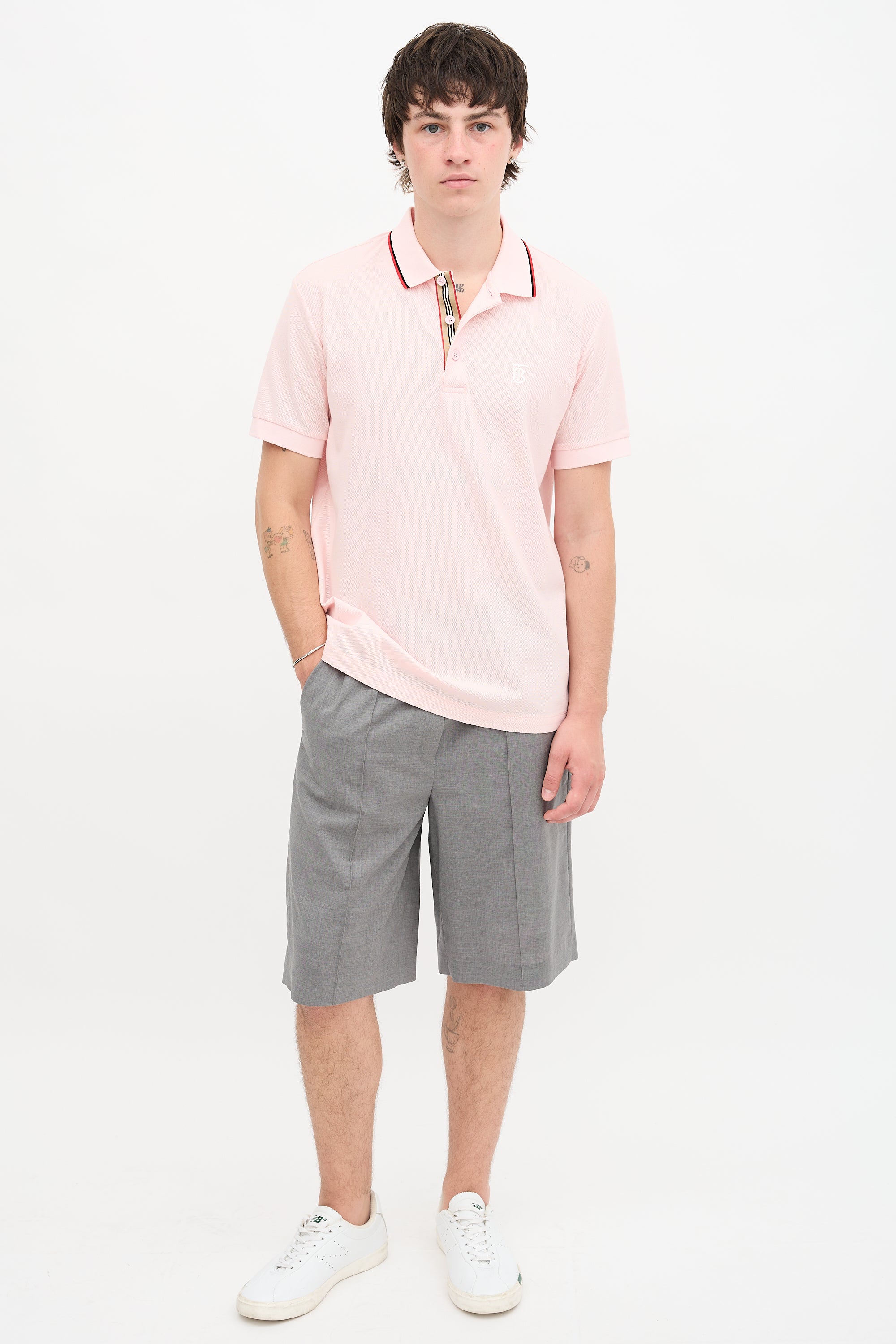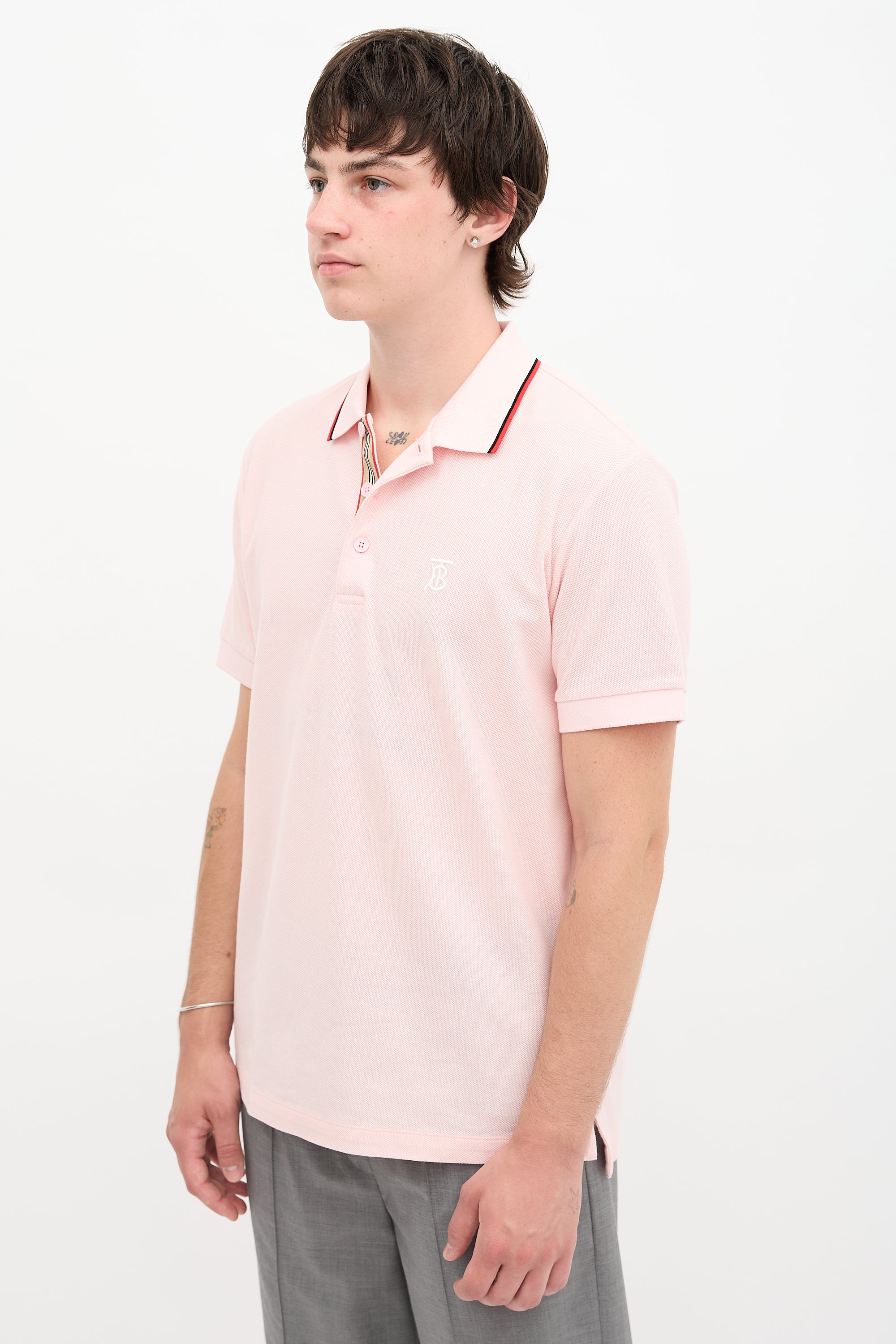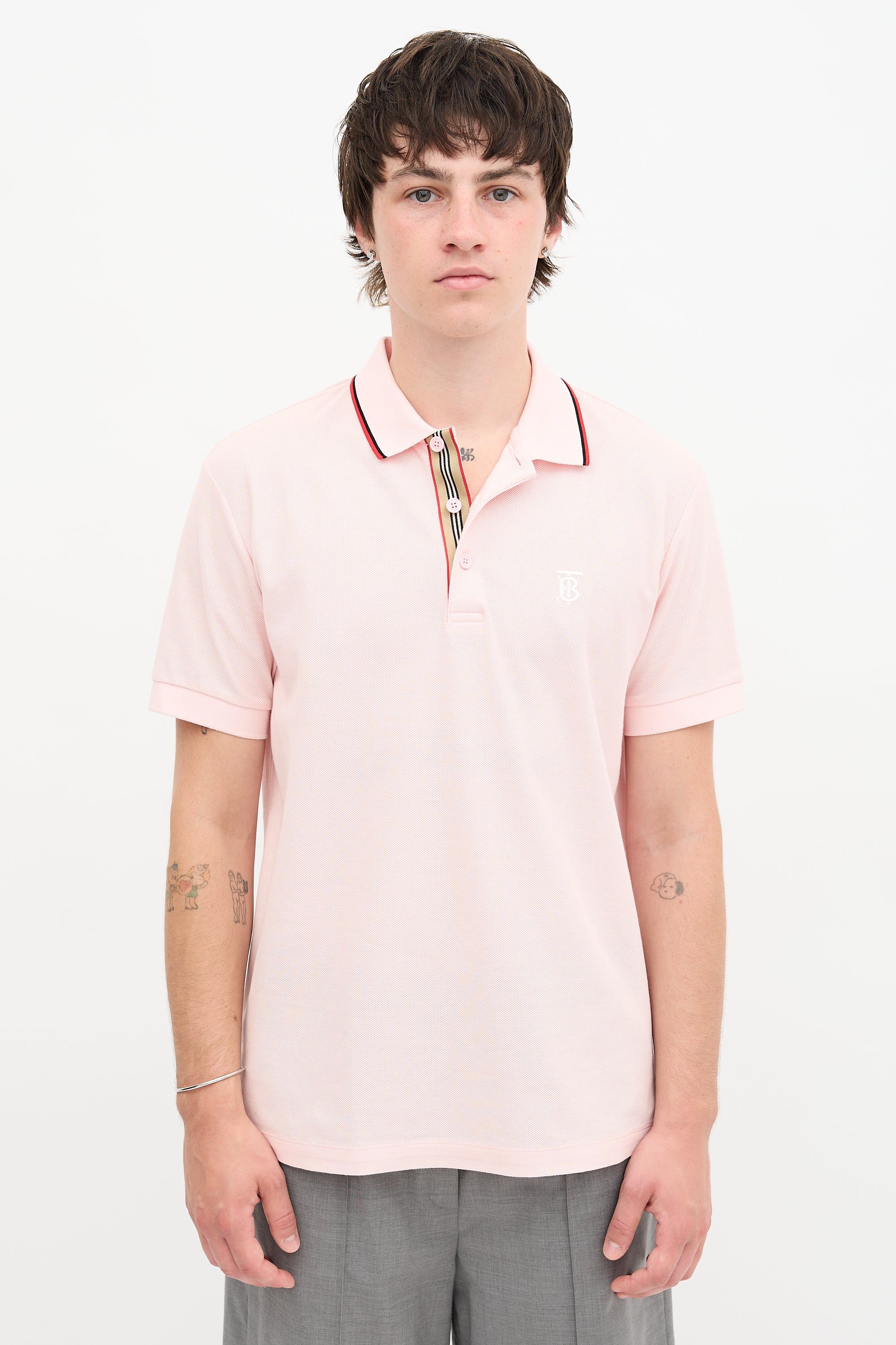 Pre-owned Burberry pink piqué cotton polo featuring a spread collar with red and black stripe, three button placket with signature beige striping, TB logo embroidery at left chest, ribbed cuffs, and side slits.