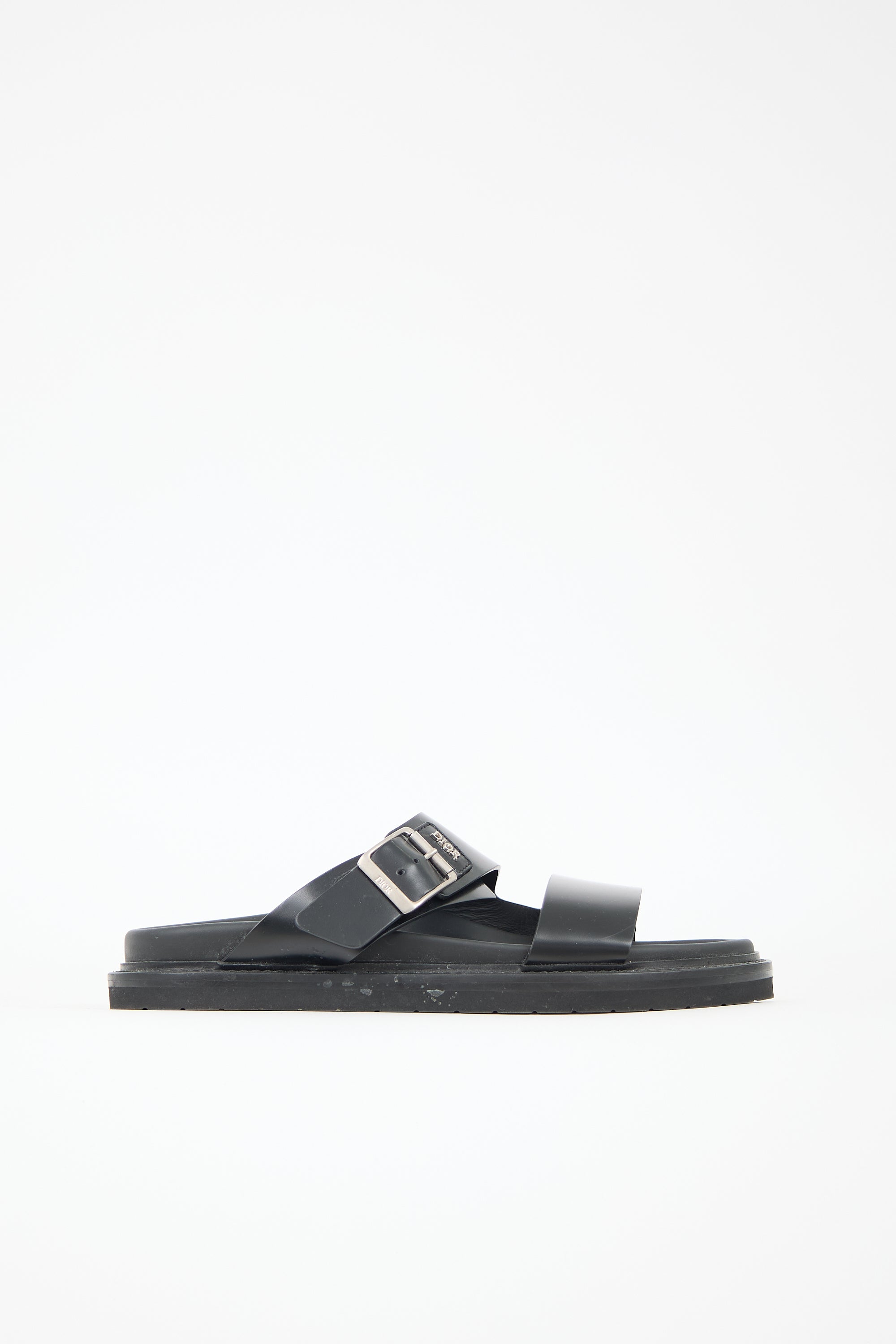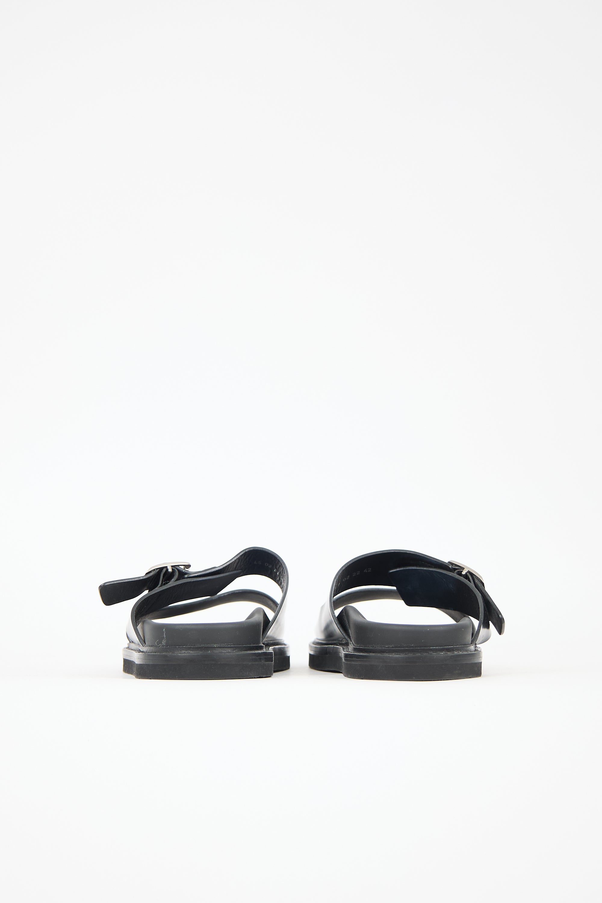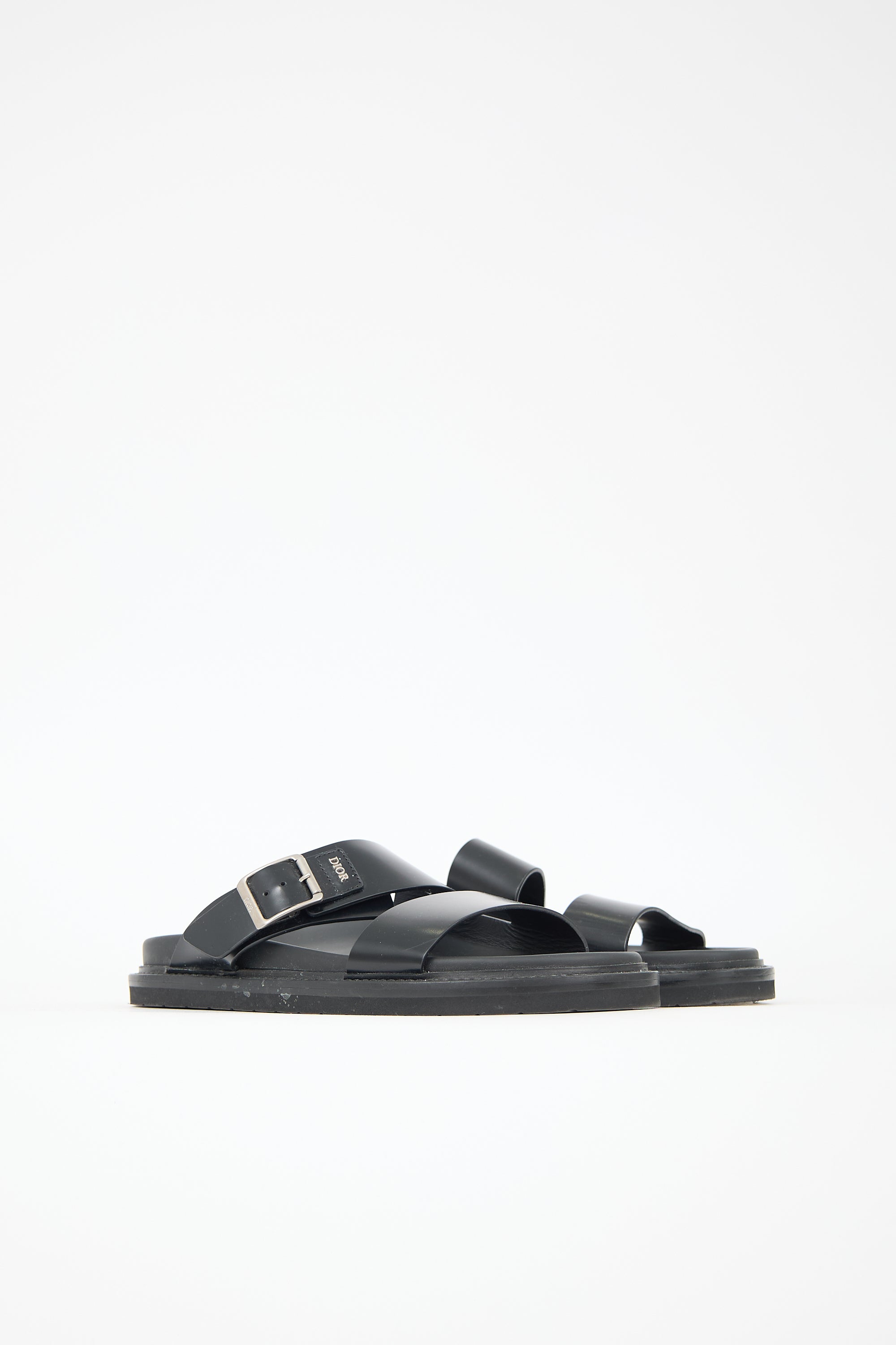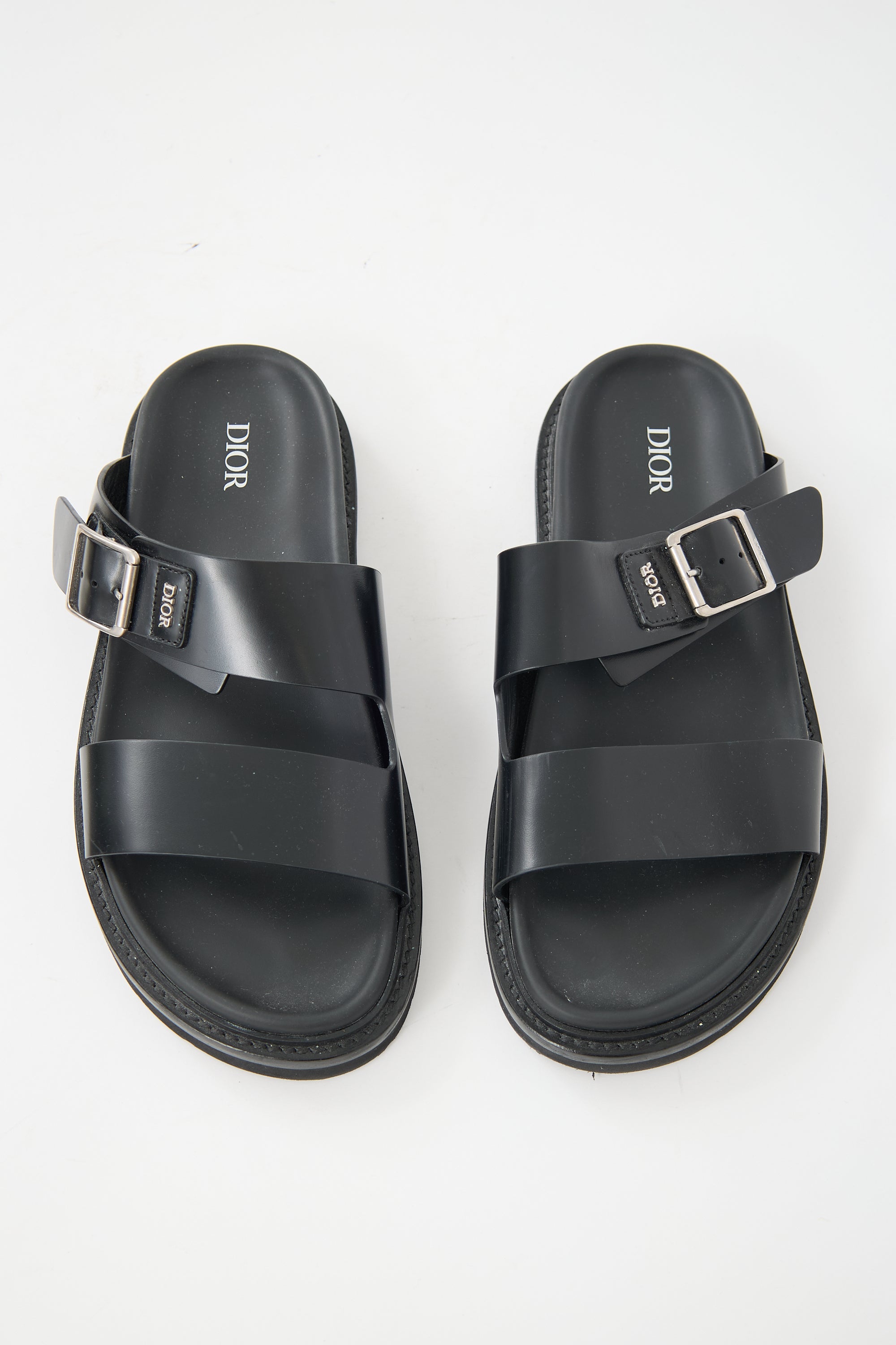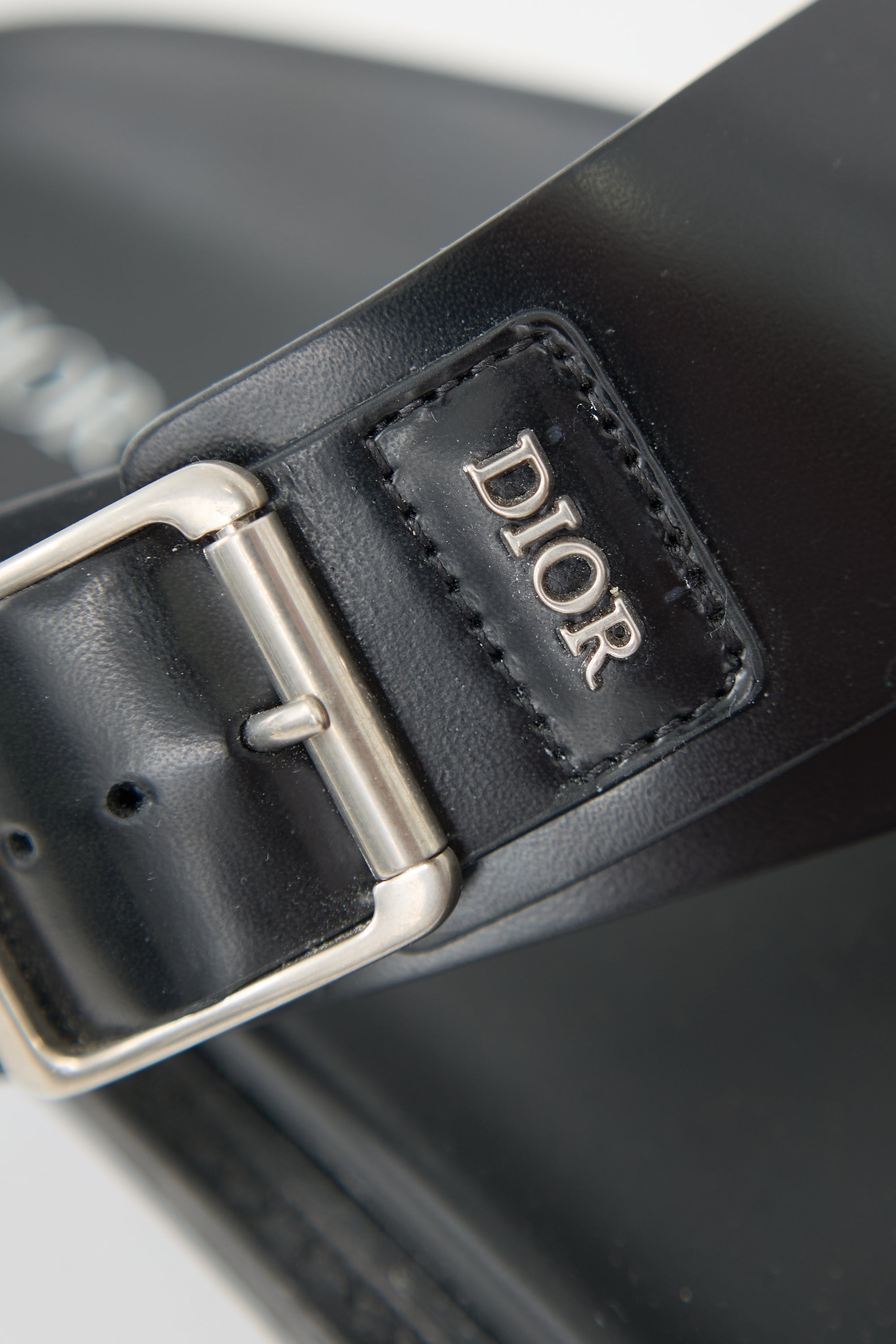 Pre-owned Dior black leather Aqua sandals featuring open rounded toe, buckled strap with silver tone logo, and molded footbed.