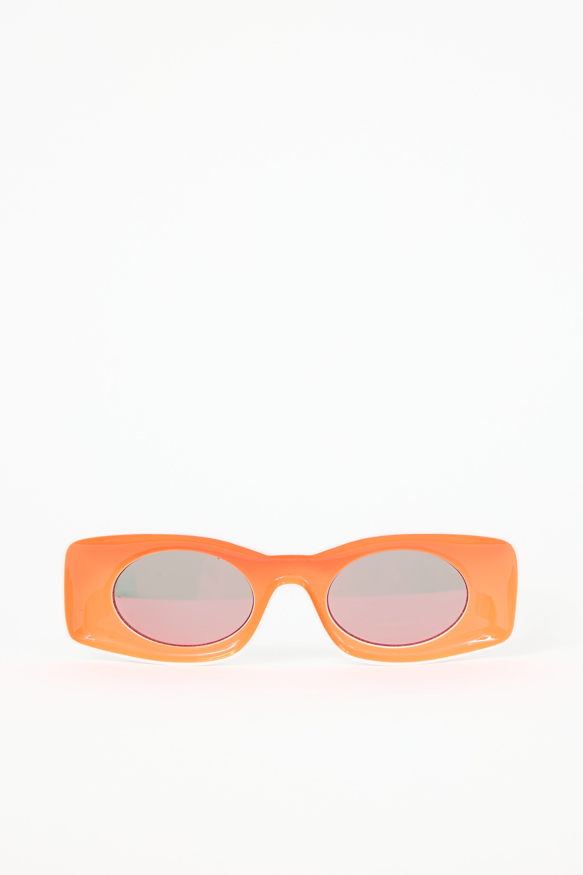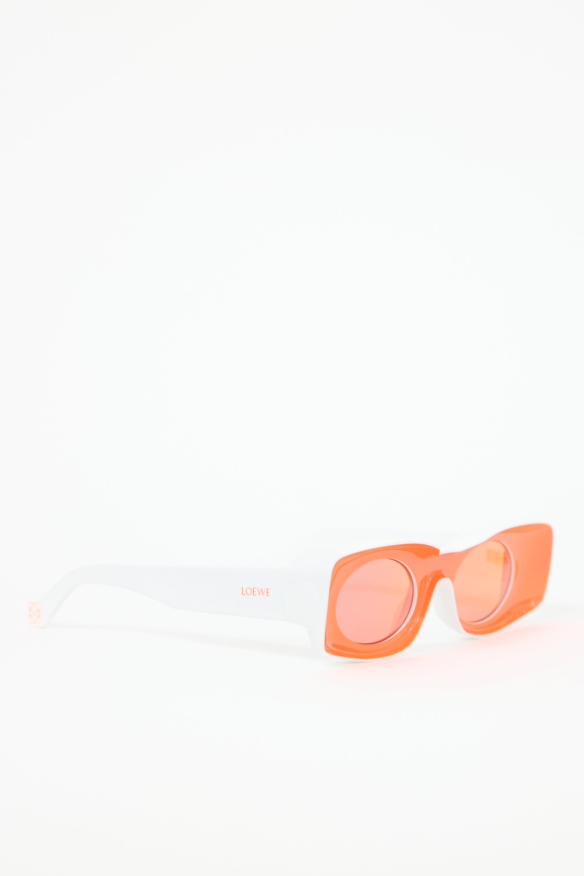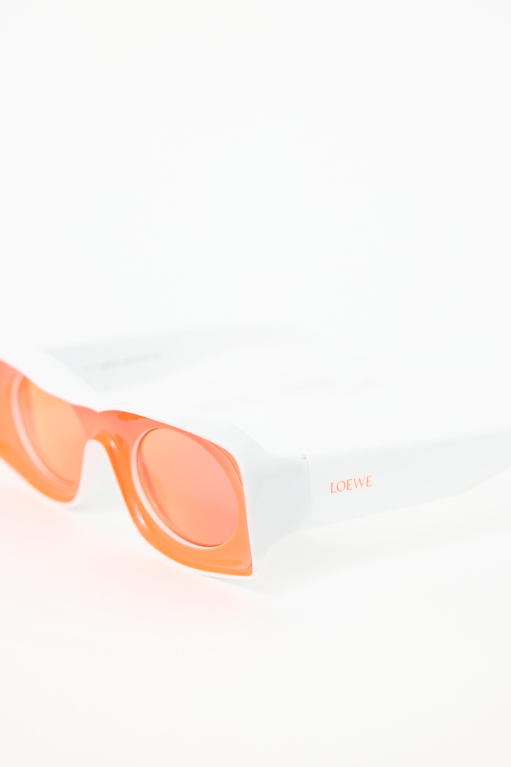 Pre-owned Loewe X Paula's Ibiza LW400331 sunglasses featuring grey tinted lenses, orange and white rectangle frame, nose saddle bridge, and orange debossed logo at temples. Comes with original case.