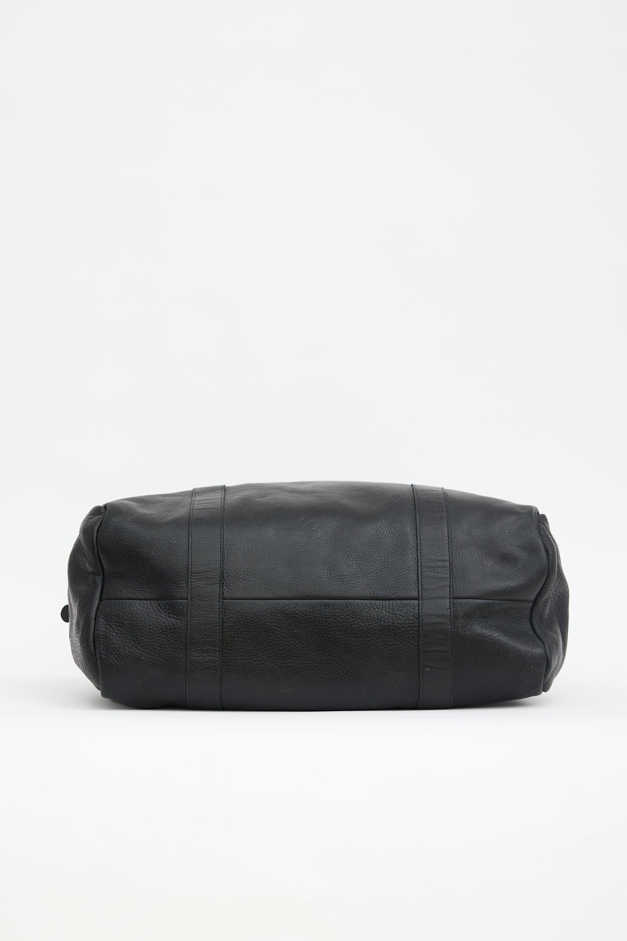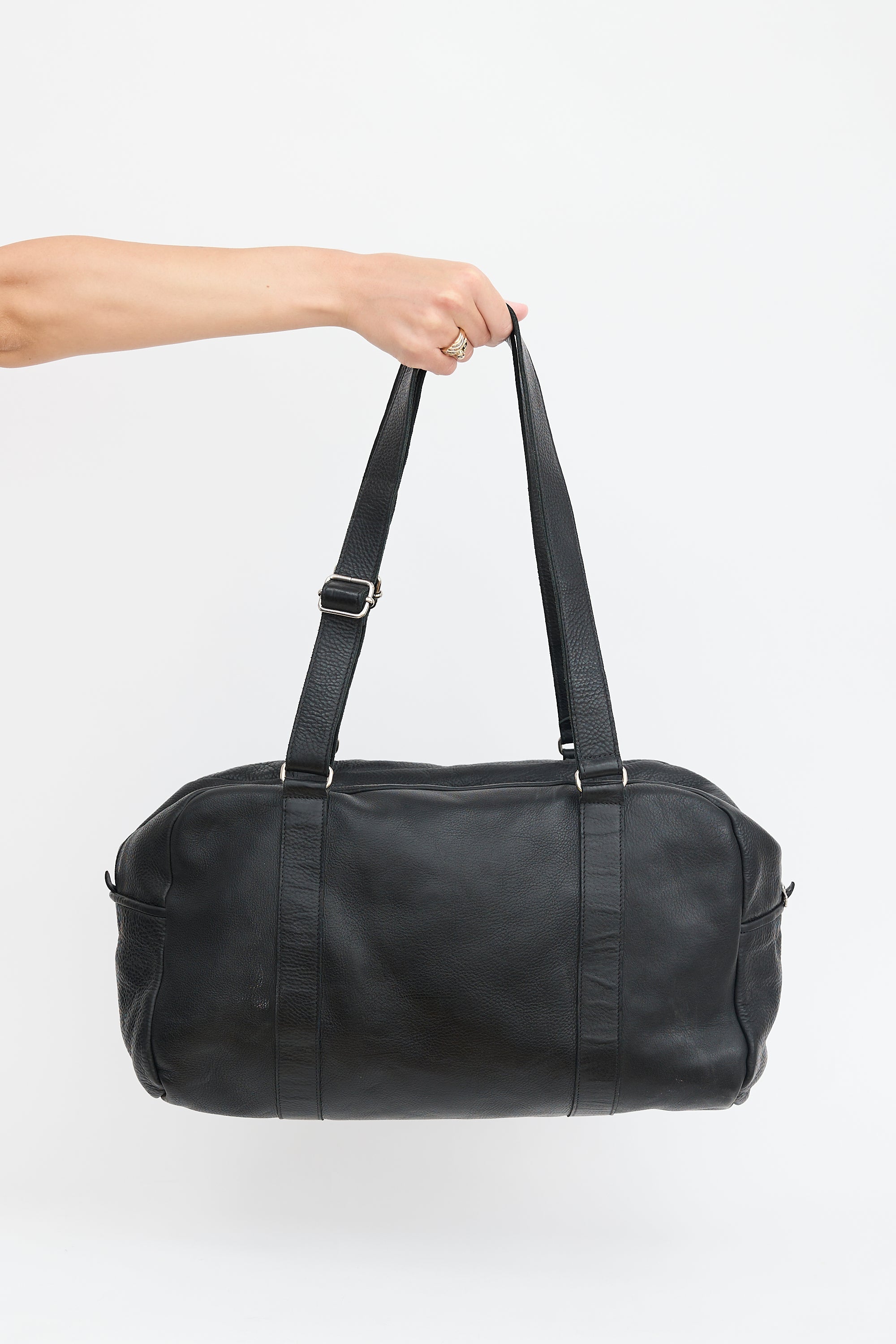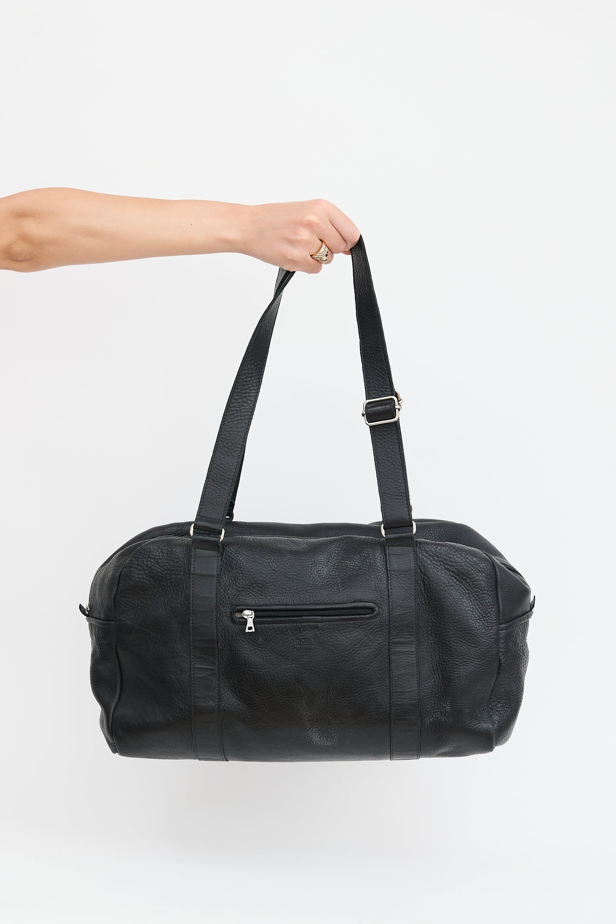 Pre-owned m0851 black grain leather duffle bag featuring two adjustable shoulder straps, silver tone hardware, one zip pocket at front, debossed logo, zip top closure, and a nylon lining with two interior shoe pockets.