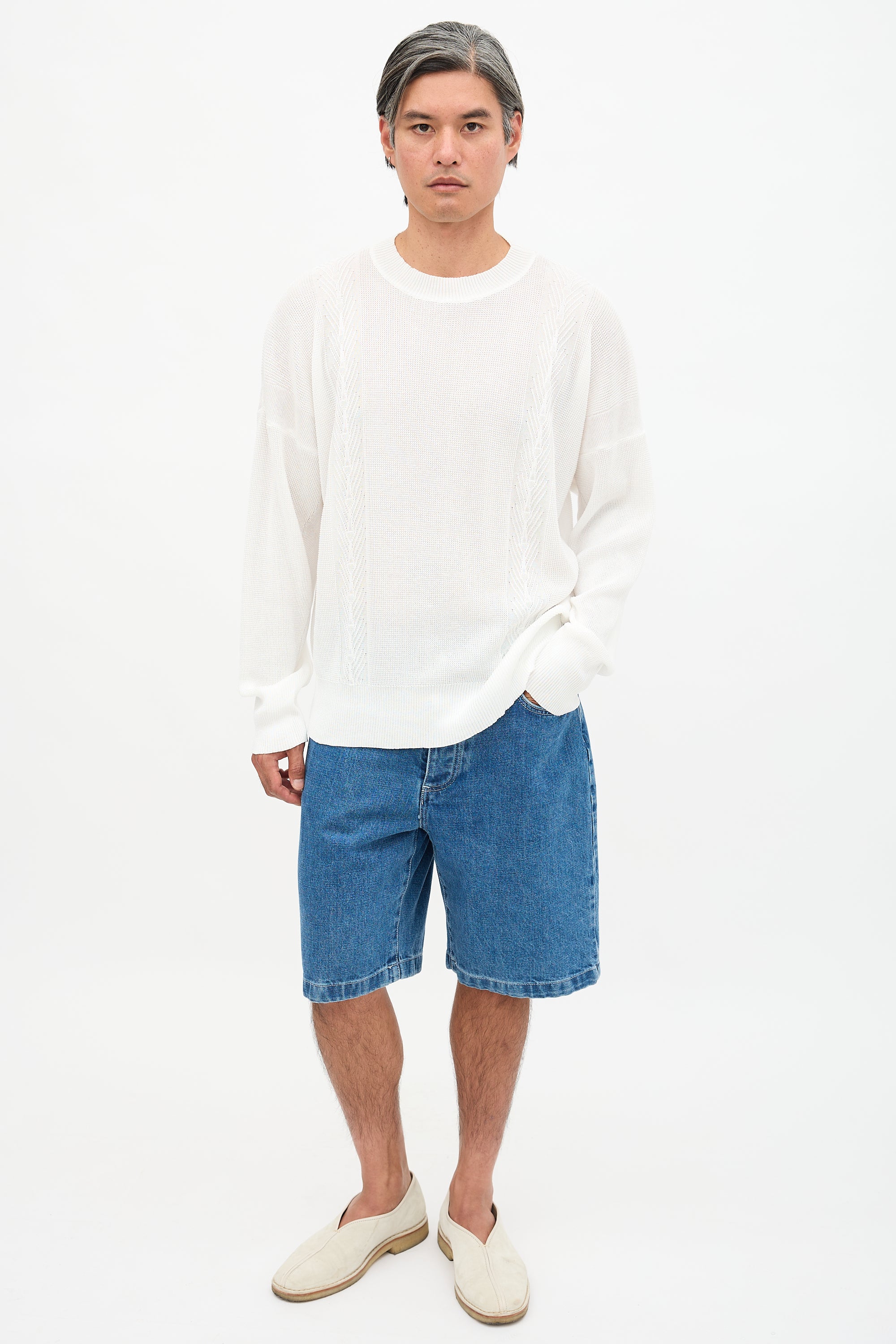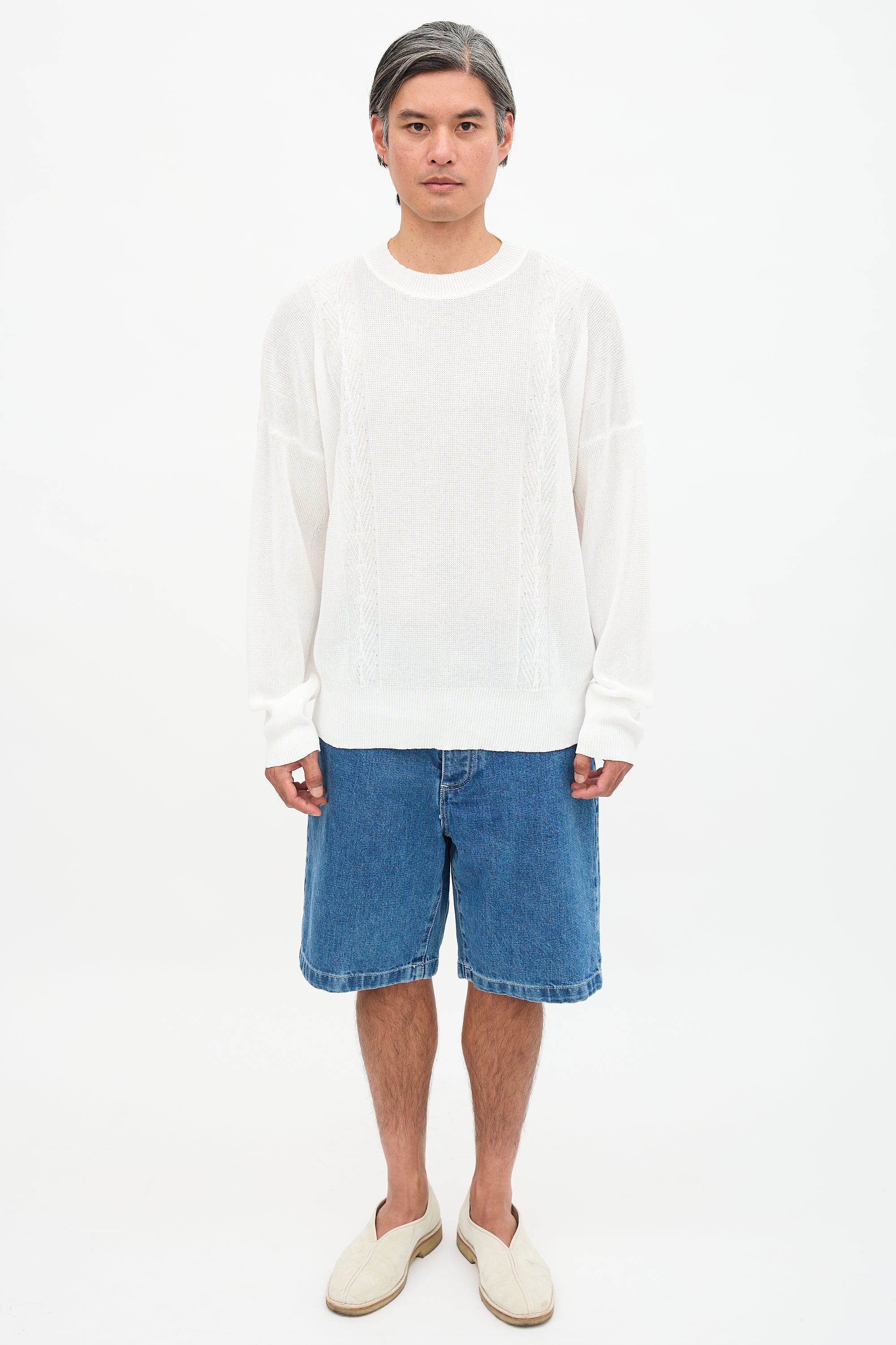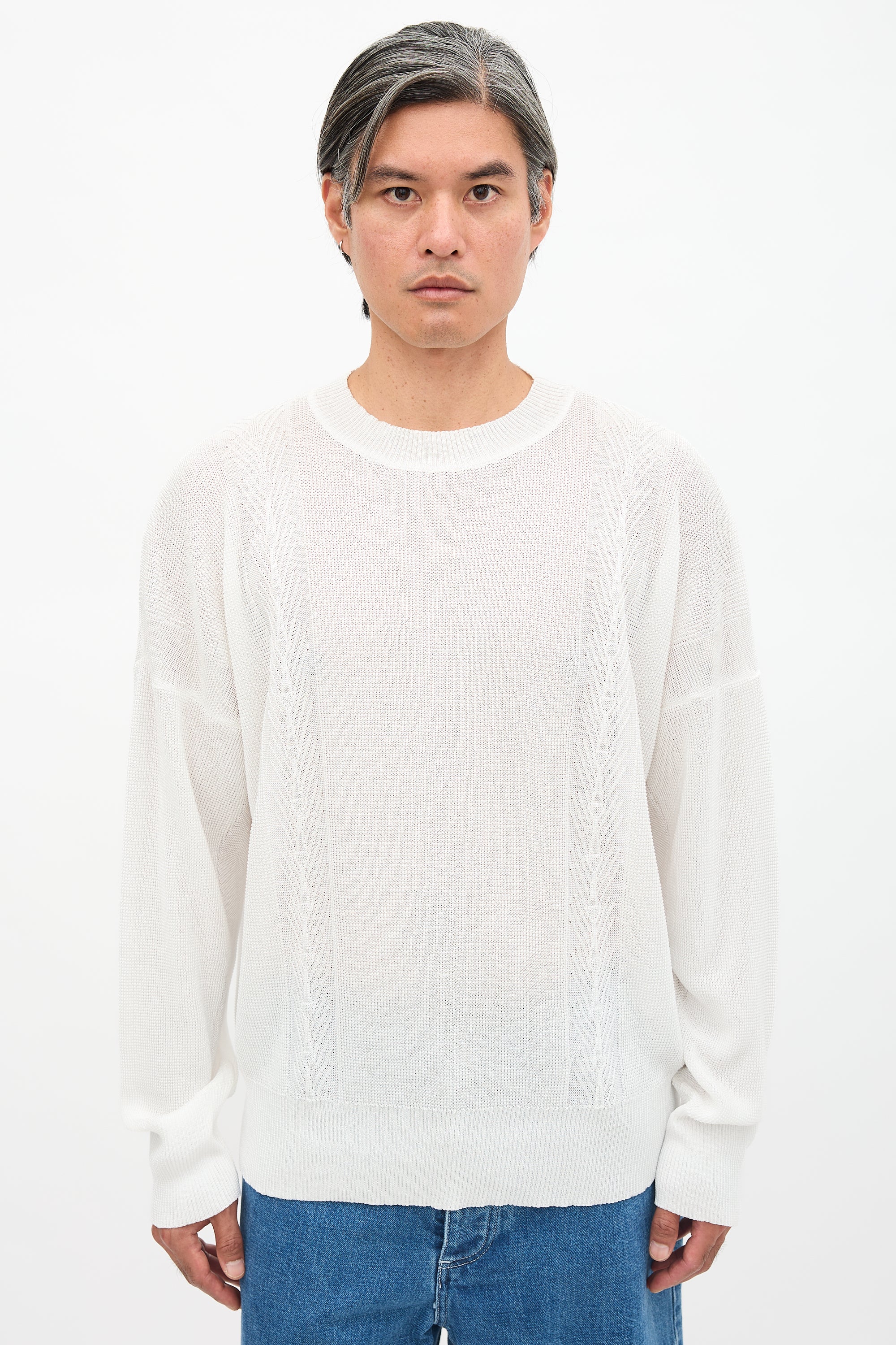 Pre-owned Our Legacy white semi sheer Smooth Cable sweater featuring crew neck, cable knit stripes, and ribbed collar, hem, and cuffs.