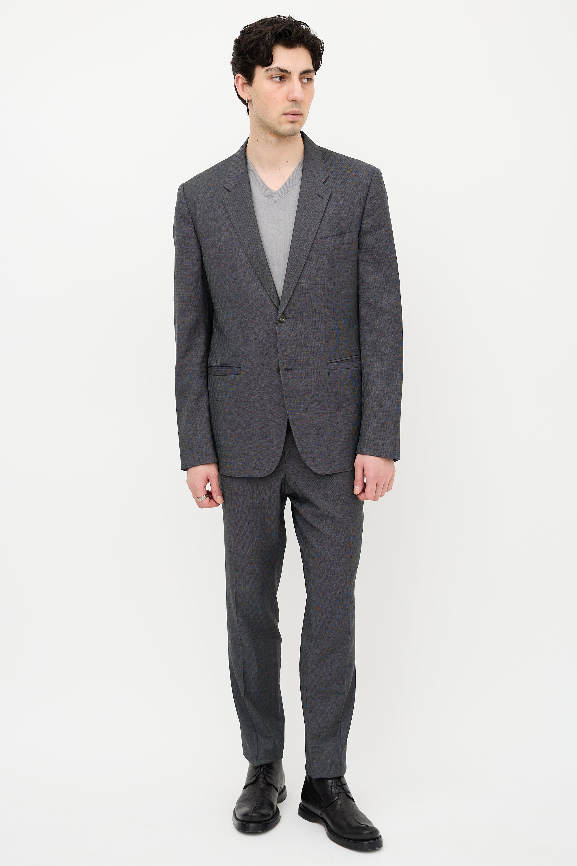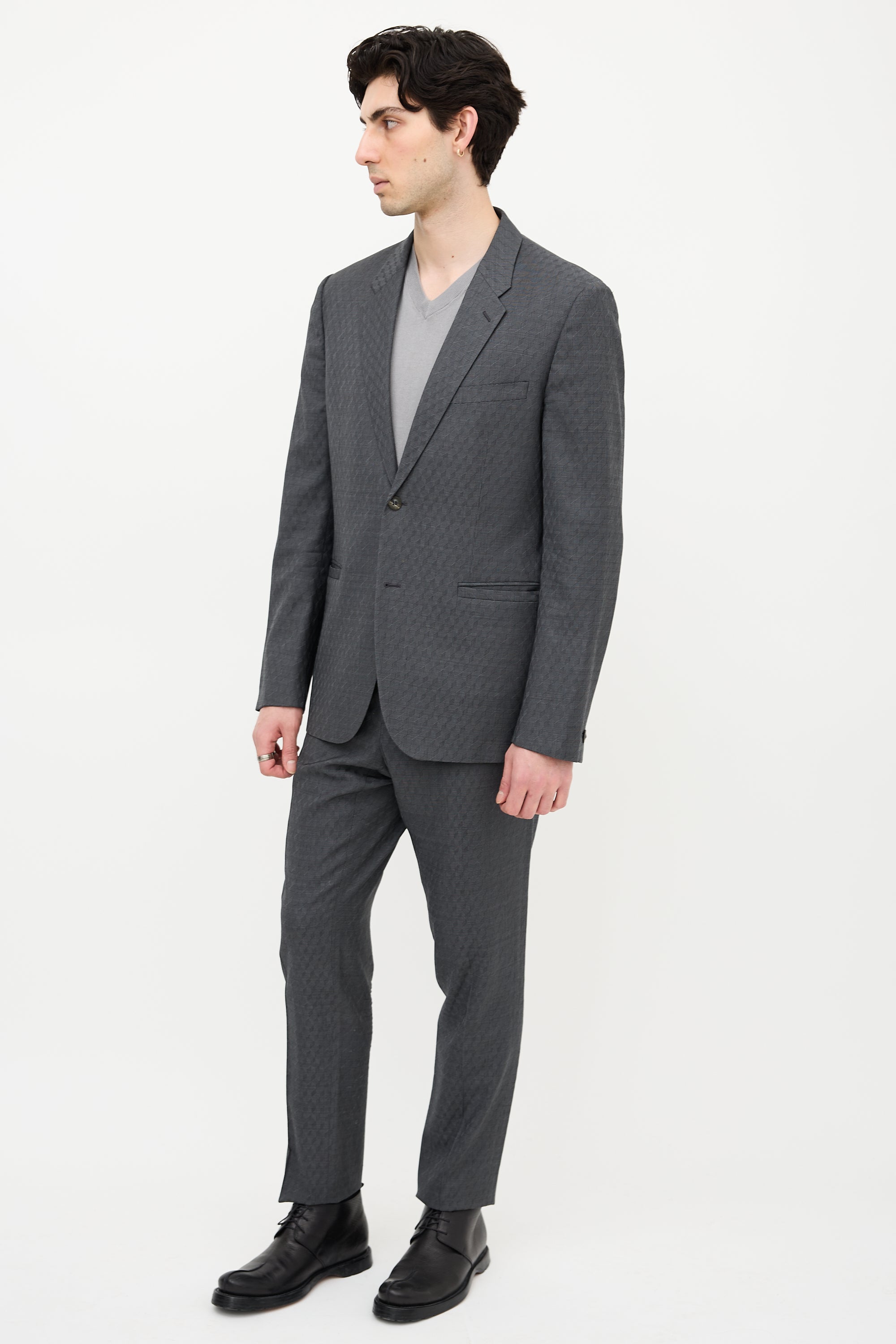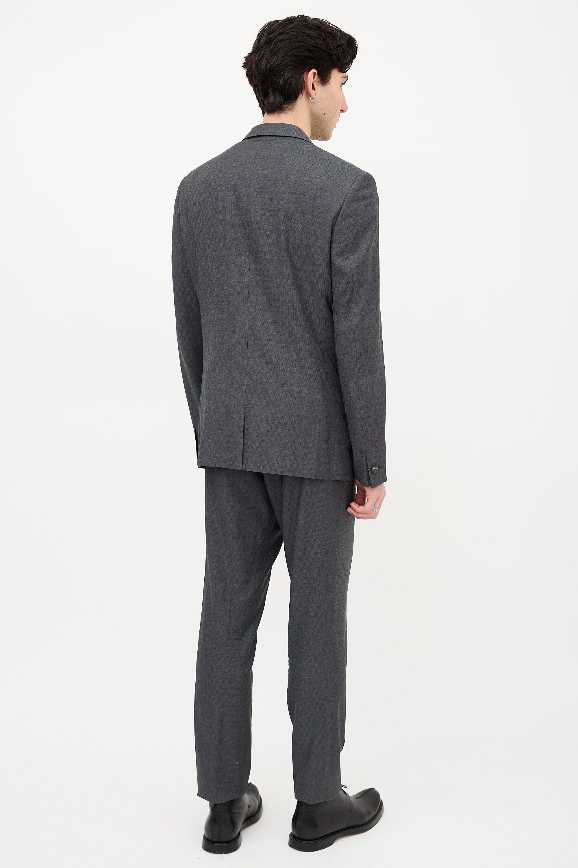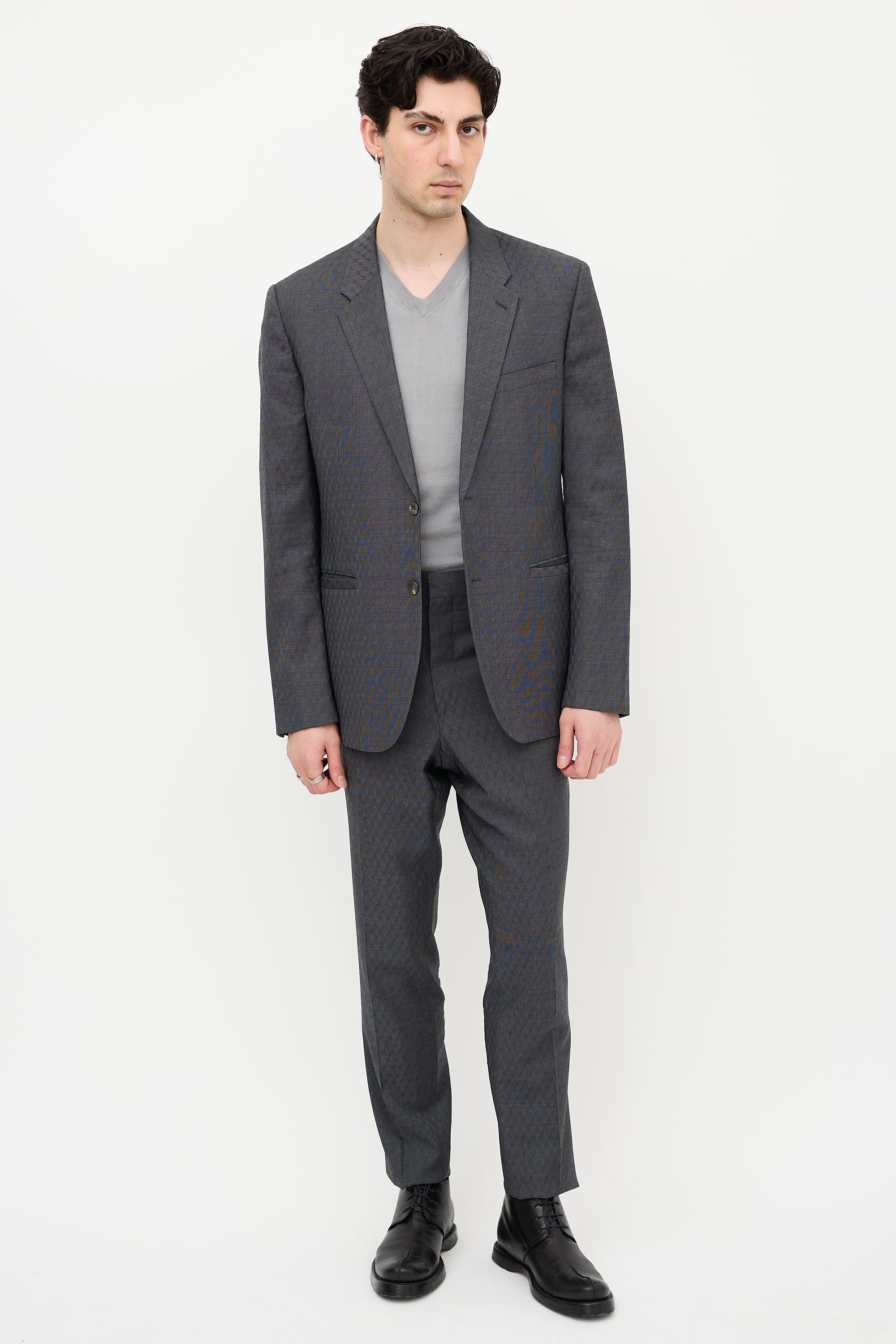Pre-owned Versace dark grey wool suit jacket featuring a geometric checked pattern, notched lapel, buttoned front, three welt pockets at front, padded shoulders, vented back, and buttoned cuffs. Matching trousers featuring a zip fly with hook fastening, belt loops, two slash pockets at hip, two welt pockets at back, and pressed seams.