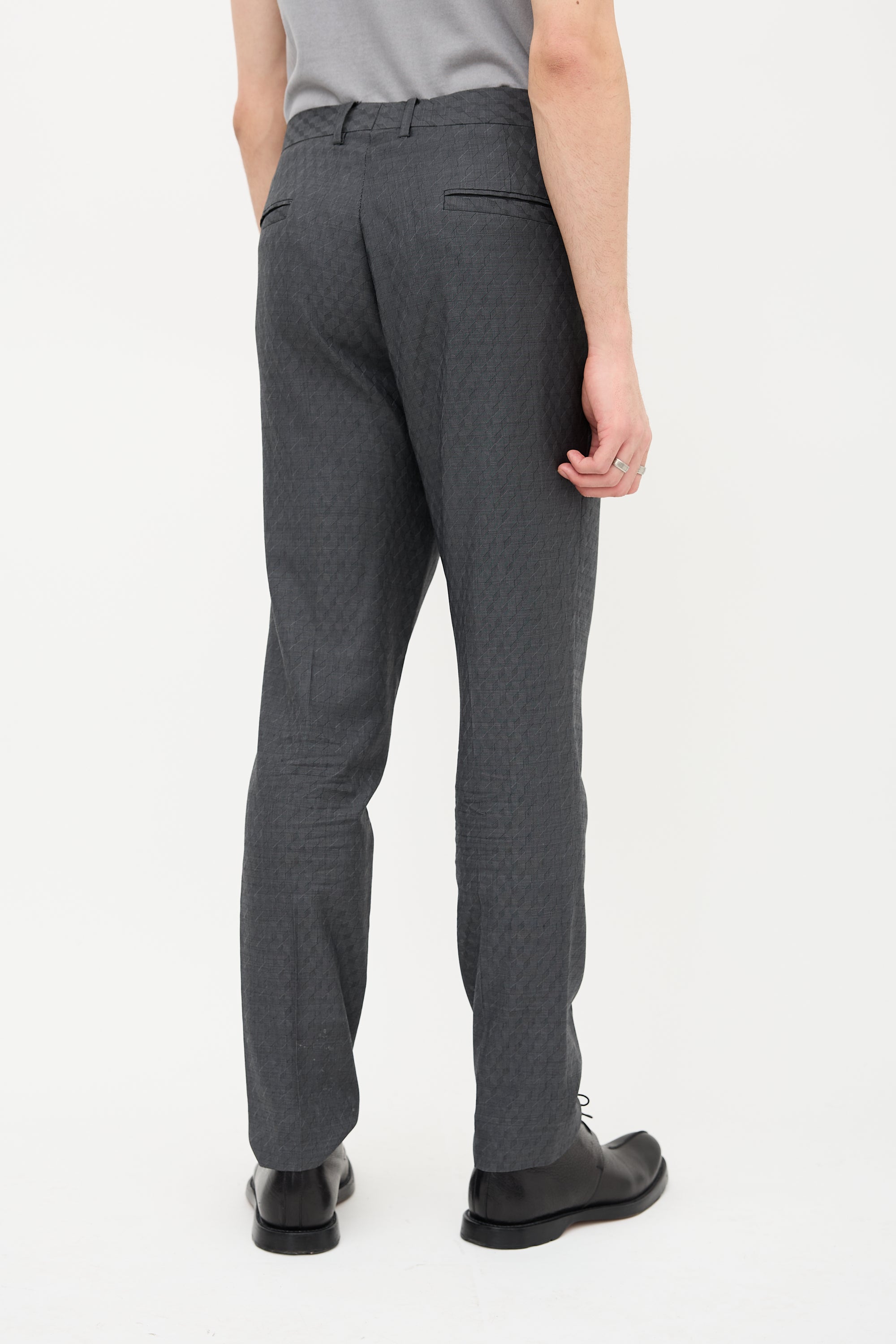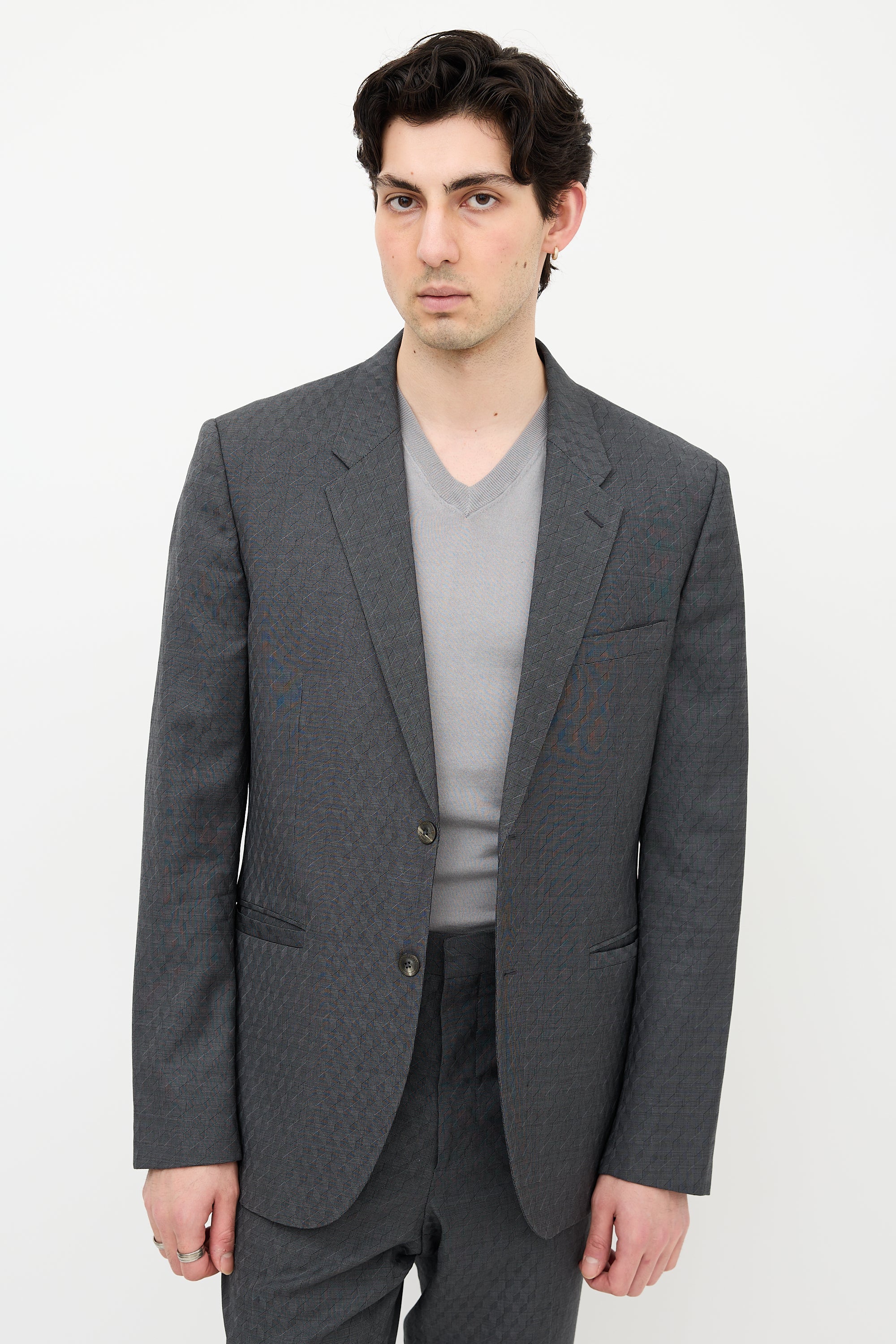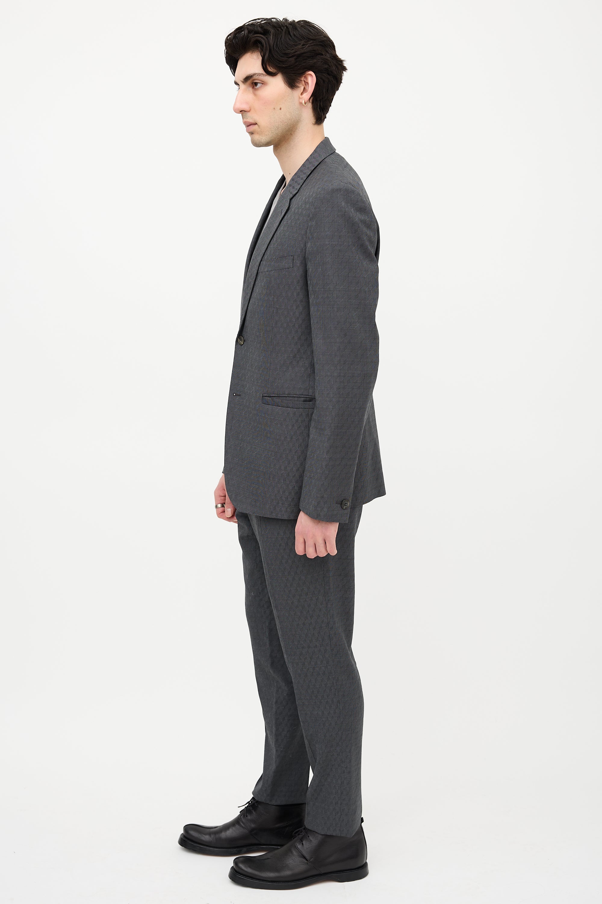 Pre-owned Versace dark grey wool suit jacket featuring a geometric checked pattern, notched lapel, buttoned front, three welt pockets at front, padded shoulders, vented back, and buttoned cuffs. Matching trousers featuring a zip fly with hook fastening, belt loops, two slash pockets at hip, two welt pockets at back, and pressed seams.