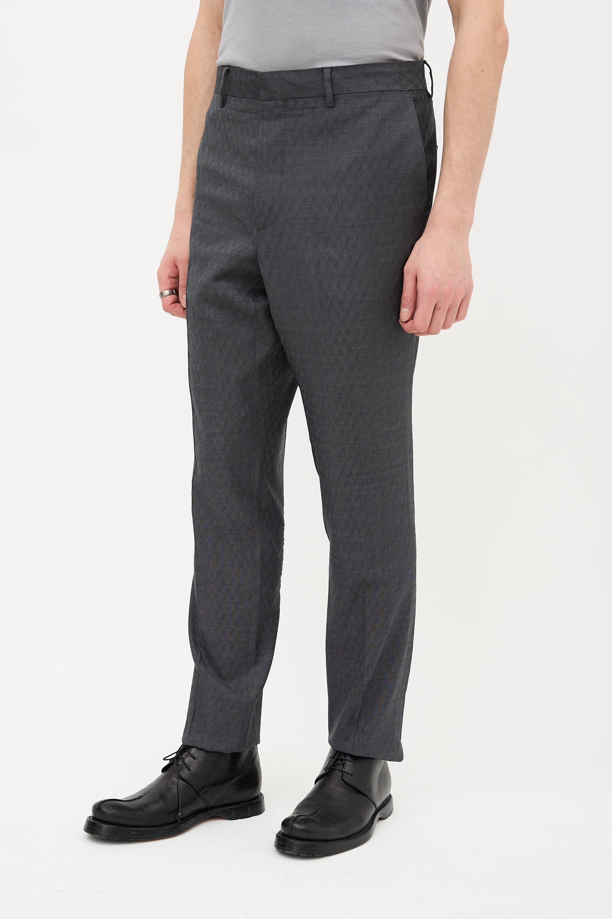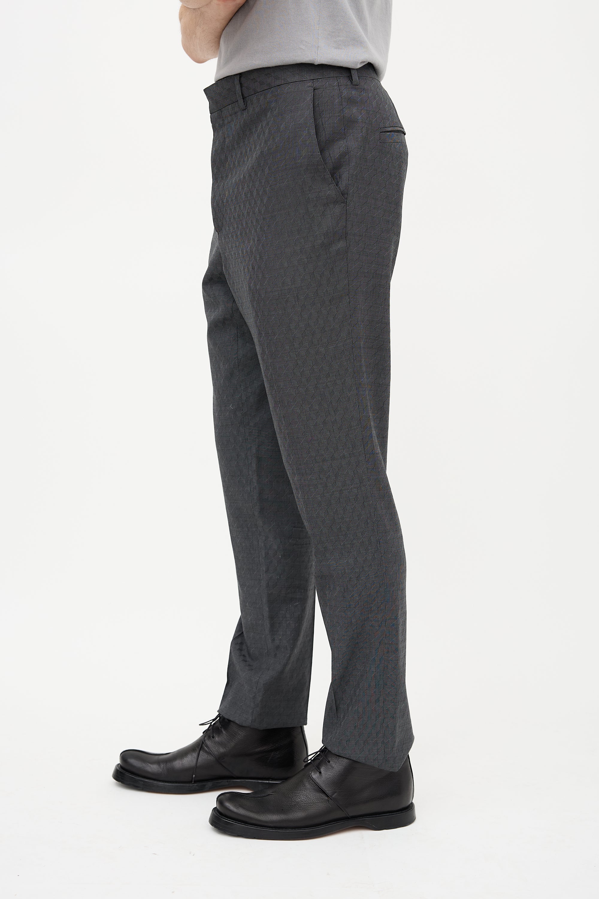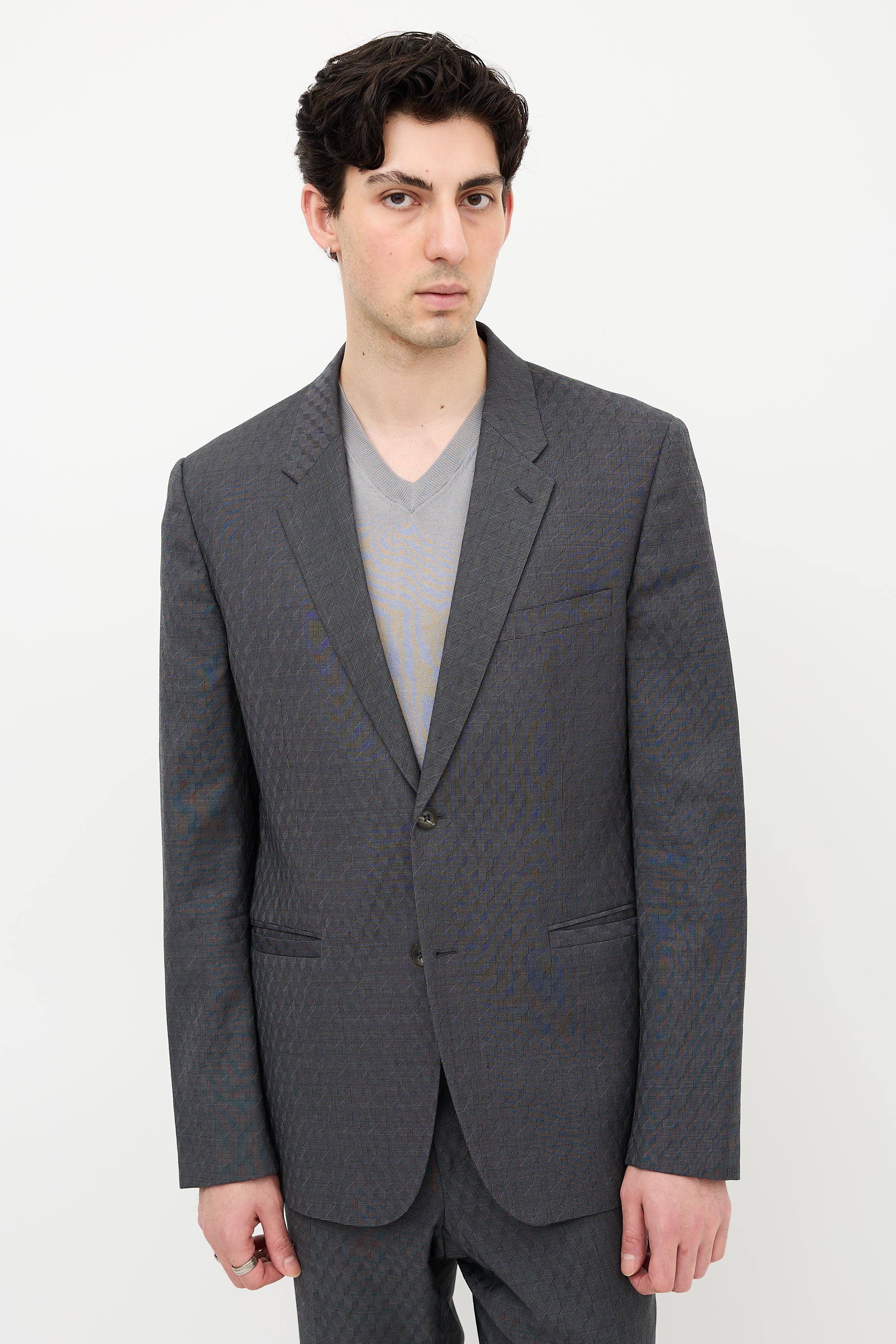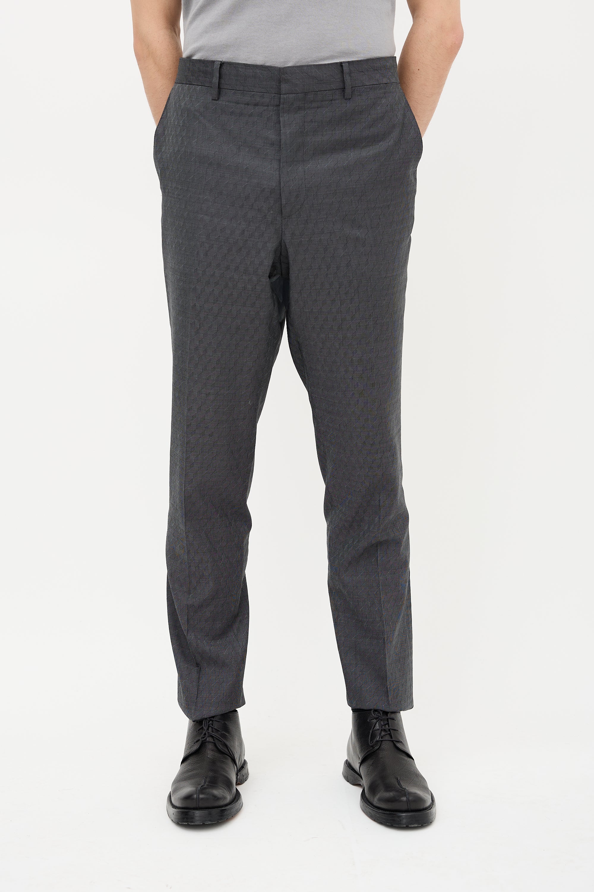 Pre-owned Versace dark grey wool suit jacket featuring a geometric checked pattern, notched lapel, buttoned front, three welt pockets at front, padded shoulders, vented back, and buttoned cuffs. Matching trousers featuring a zip fly with hook fastening, belt loops, two slash pockets at hip, two welt pockets at back, and pressed seams.