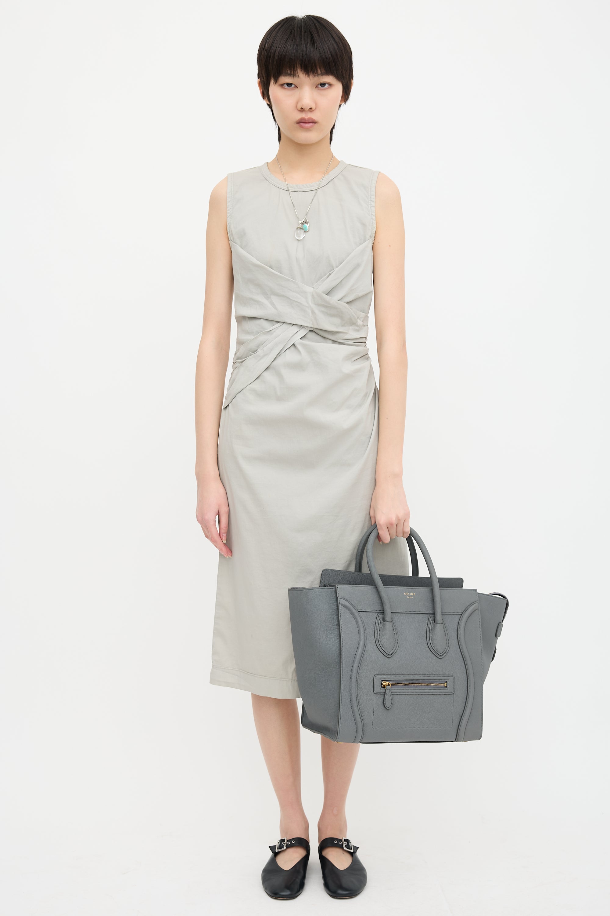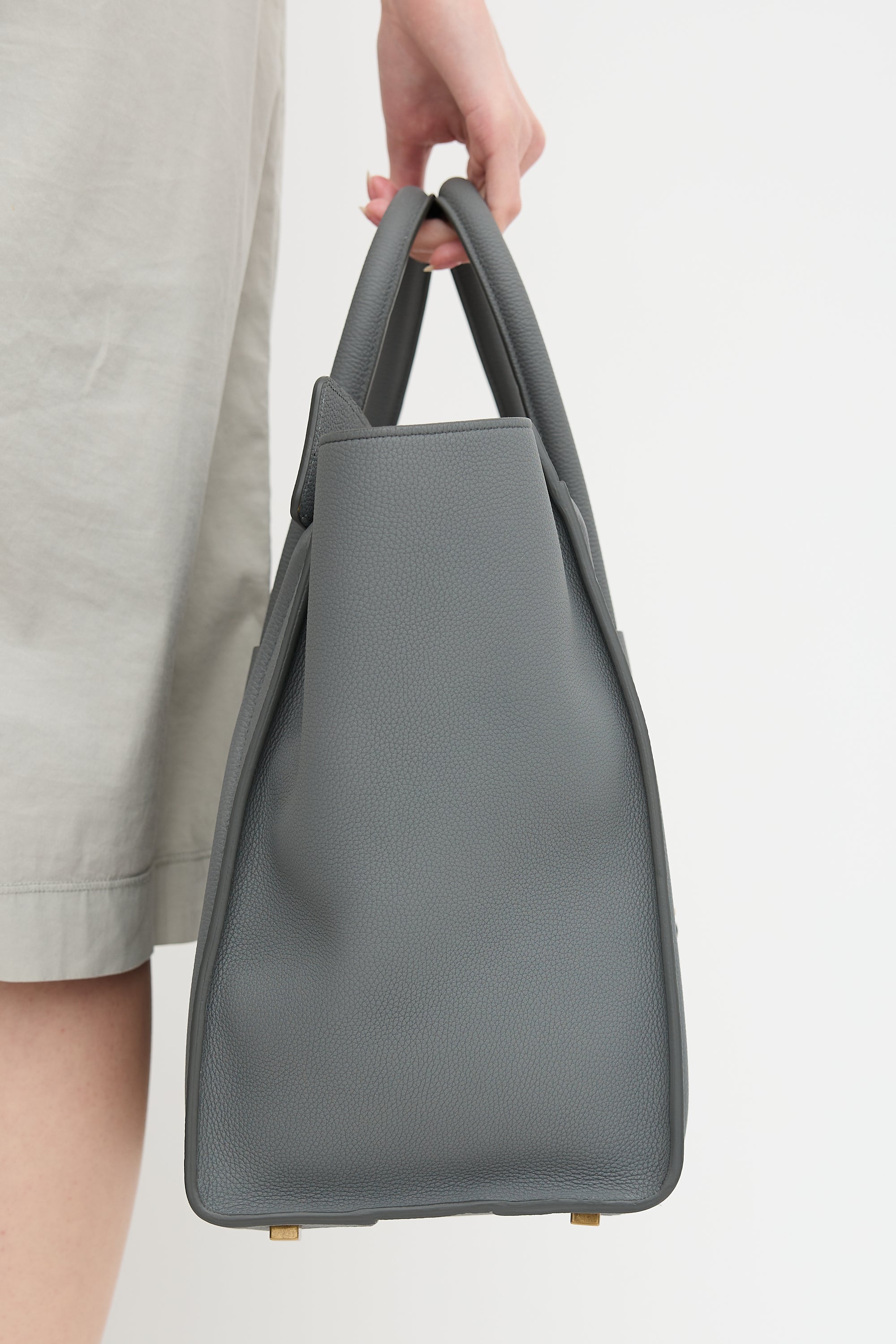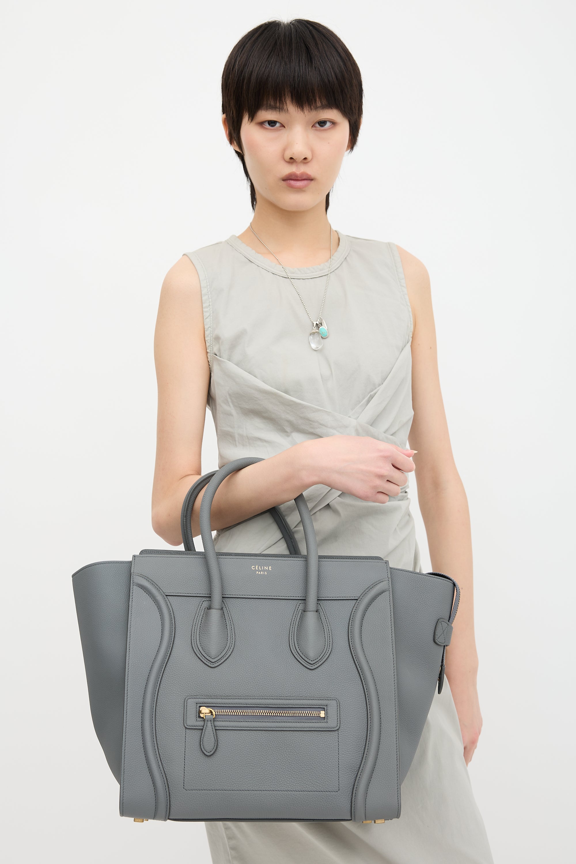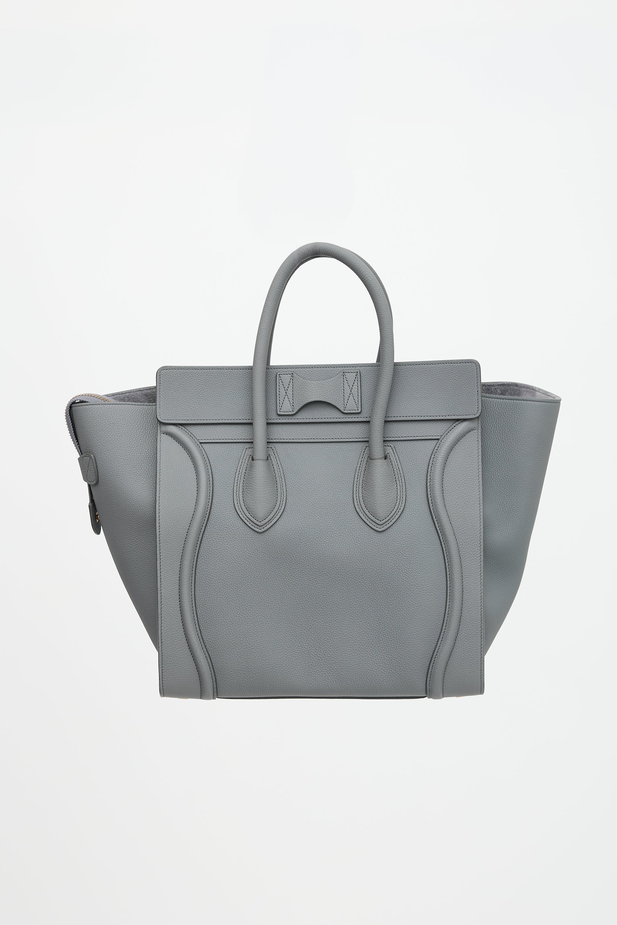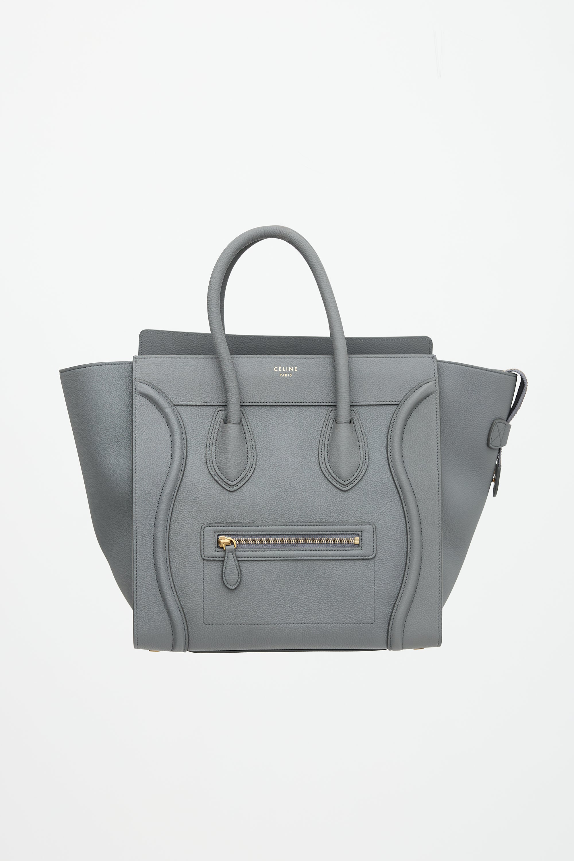 Pre-owned Celine 2017 grey leather mini Luggage tote bag featuring tonal stitching, gold tone hardware, four feet at base, gold tone stamped logo at front topline, front zip pocket, dual rolled top handles, top zip closure, and one lined main compartment with one zip pocket and two slip pockets. Comes with original dust bag.