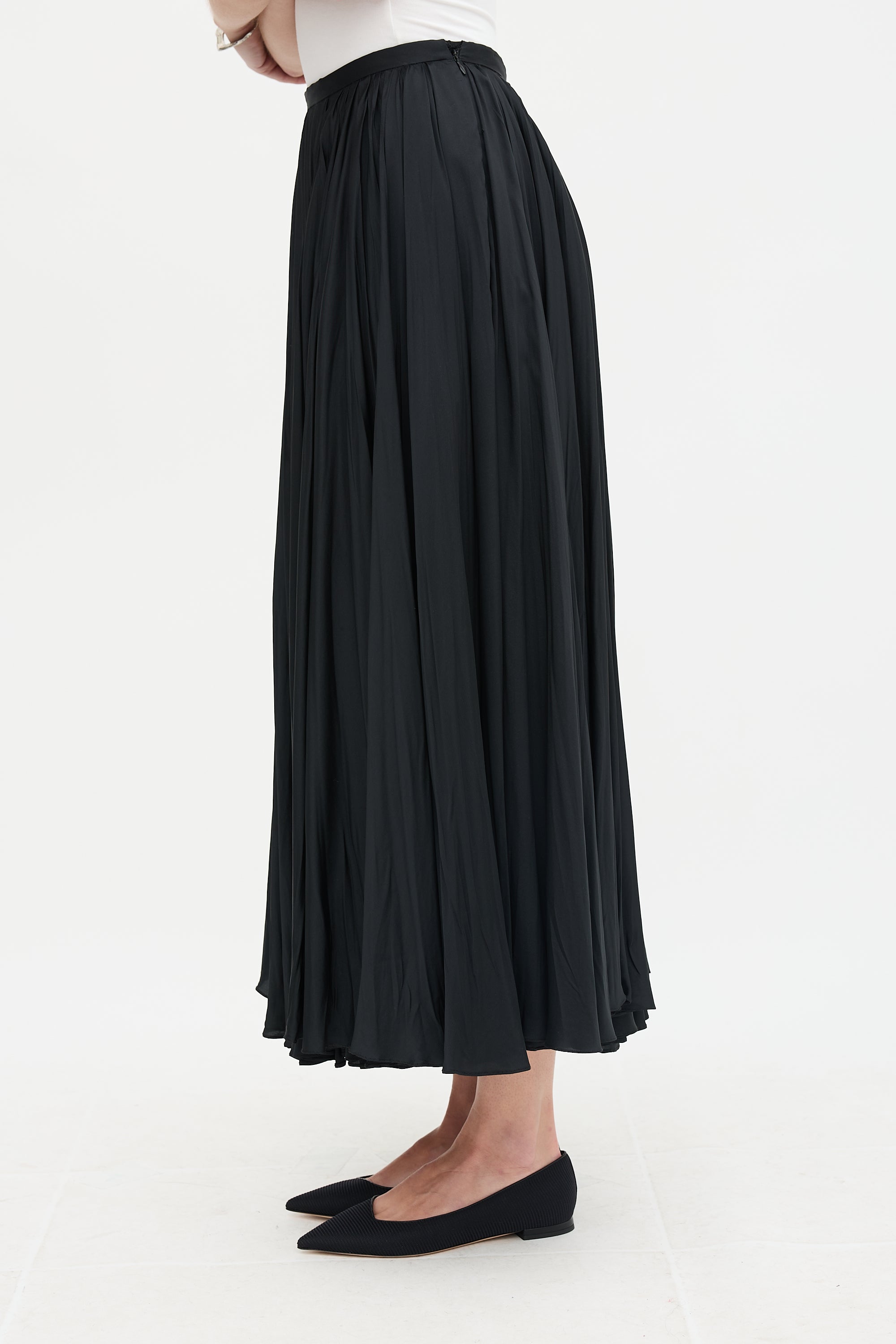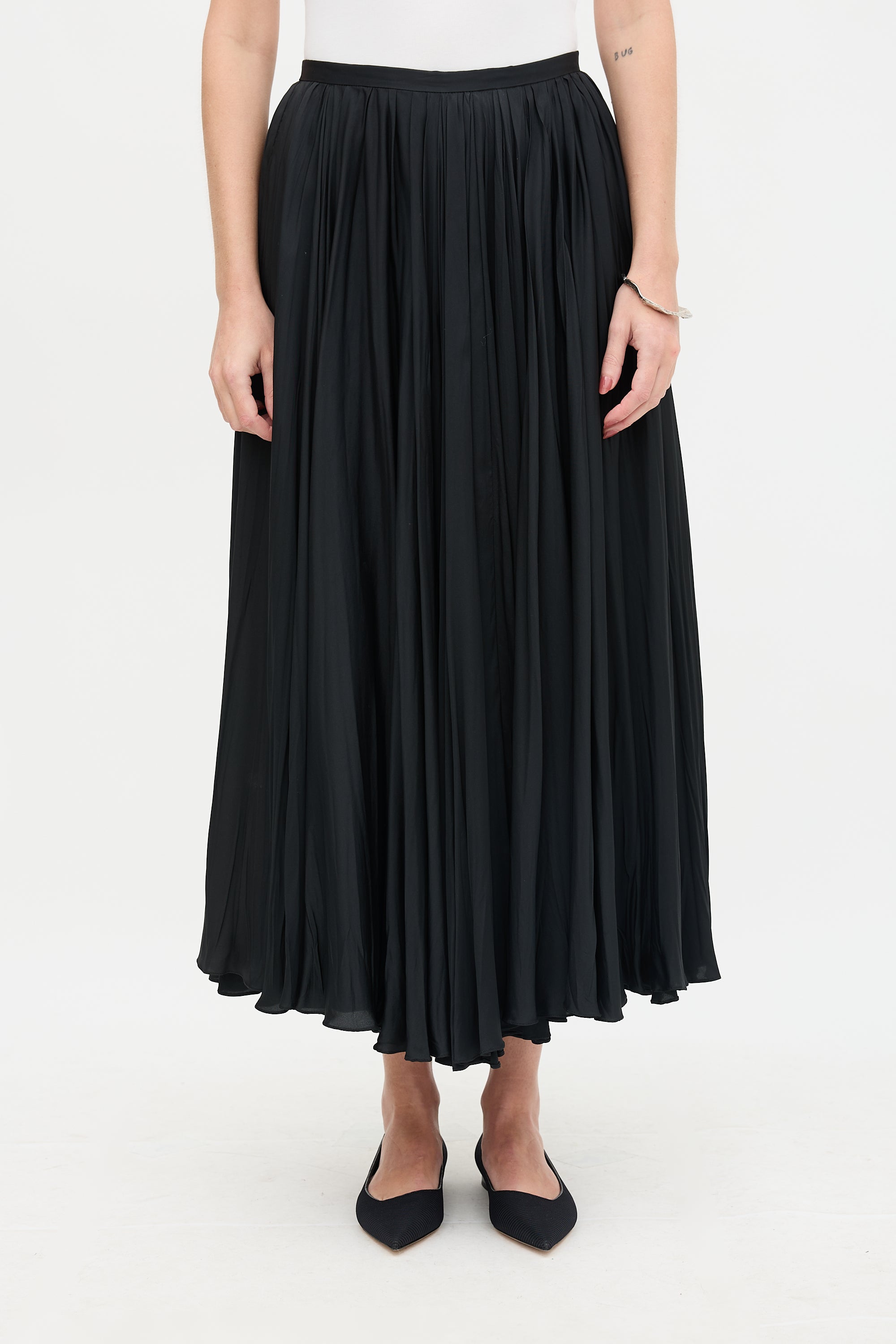 Pre-owned Jil Sander black satin midi skirt featuring high waist, pleating, in seam pockets, and concealed side zip closure.