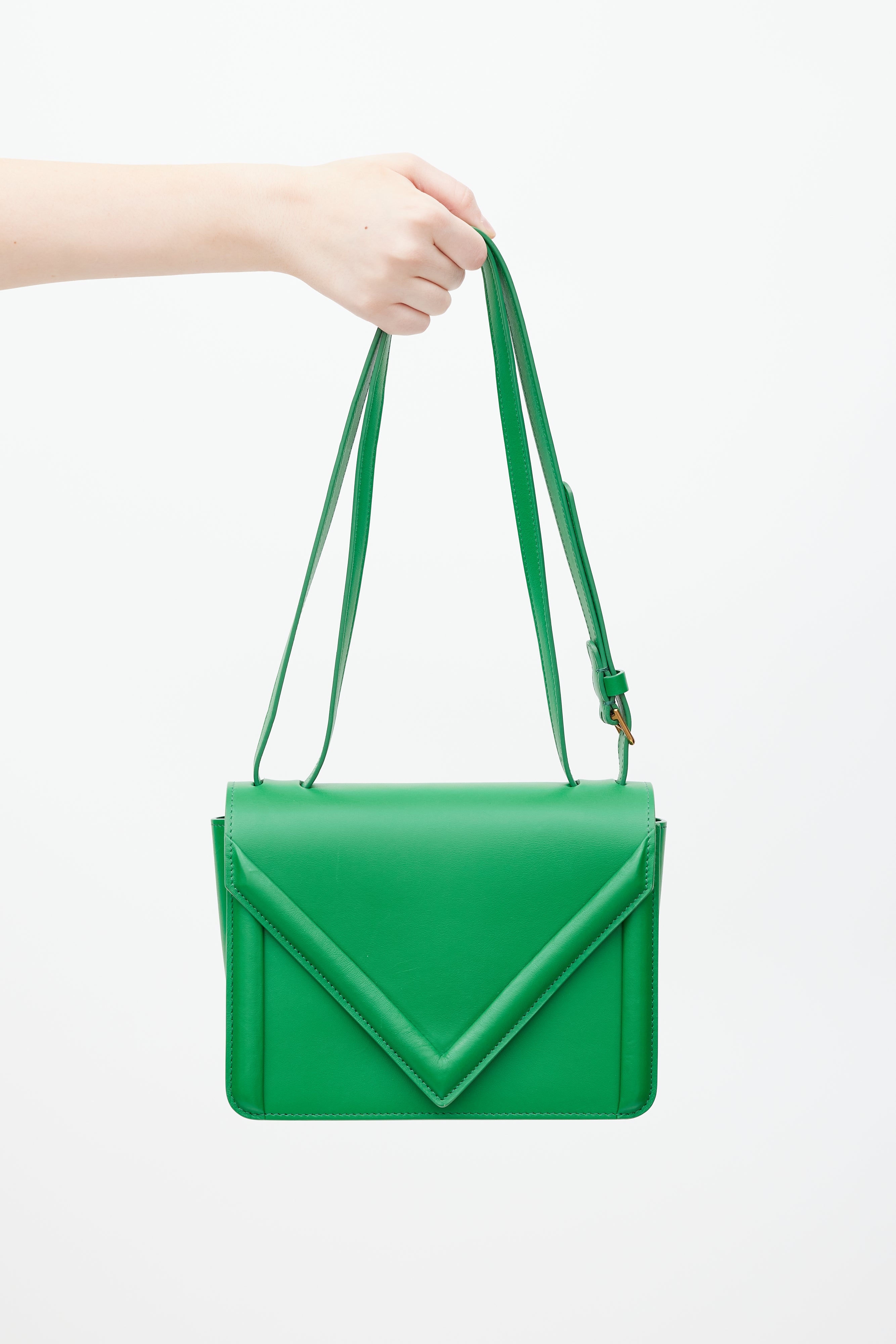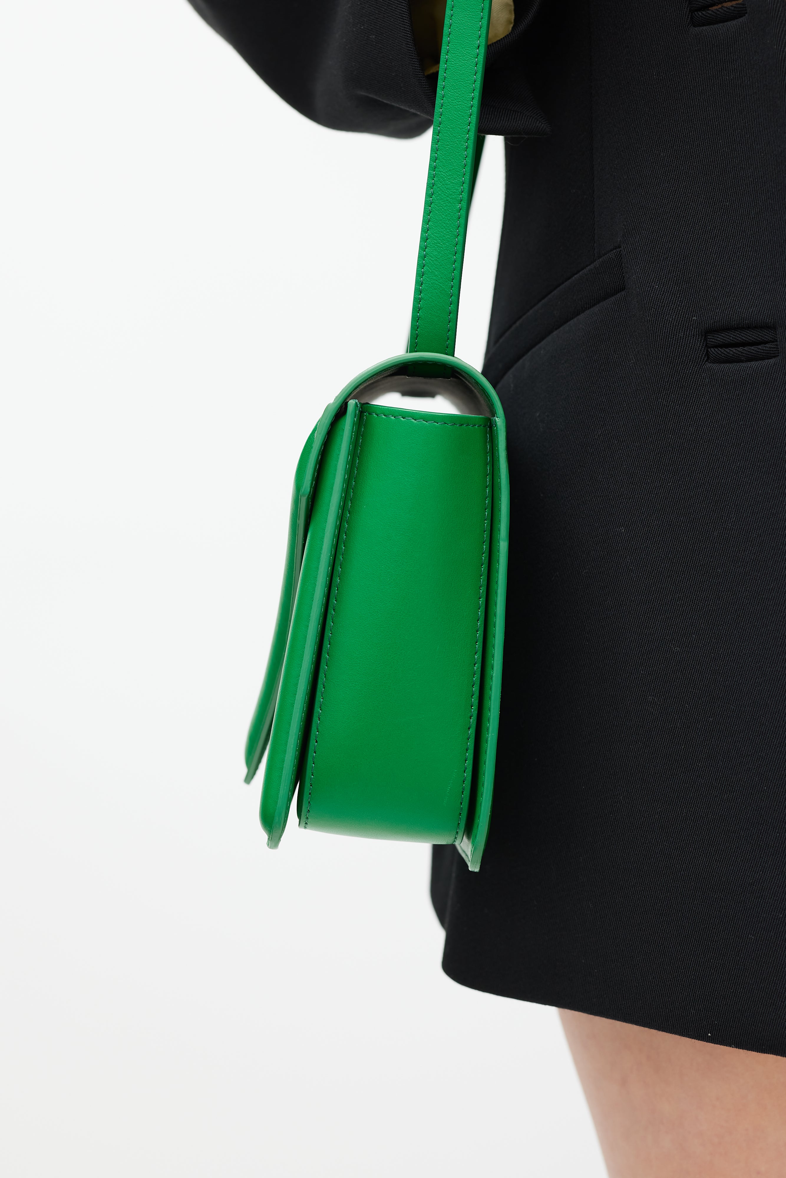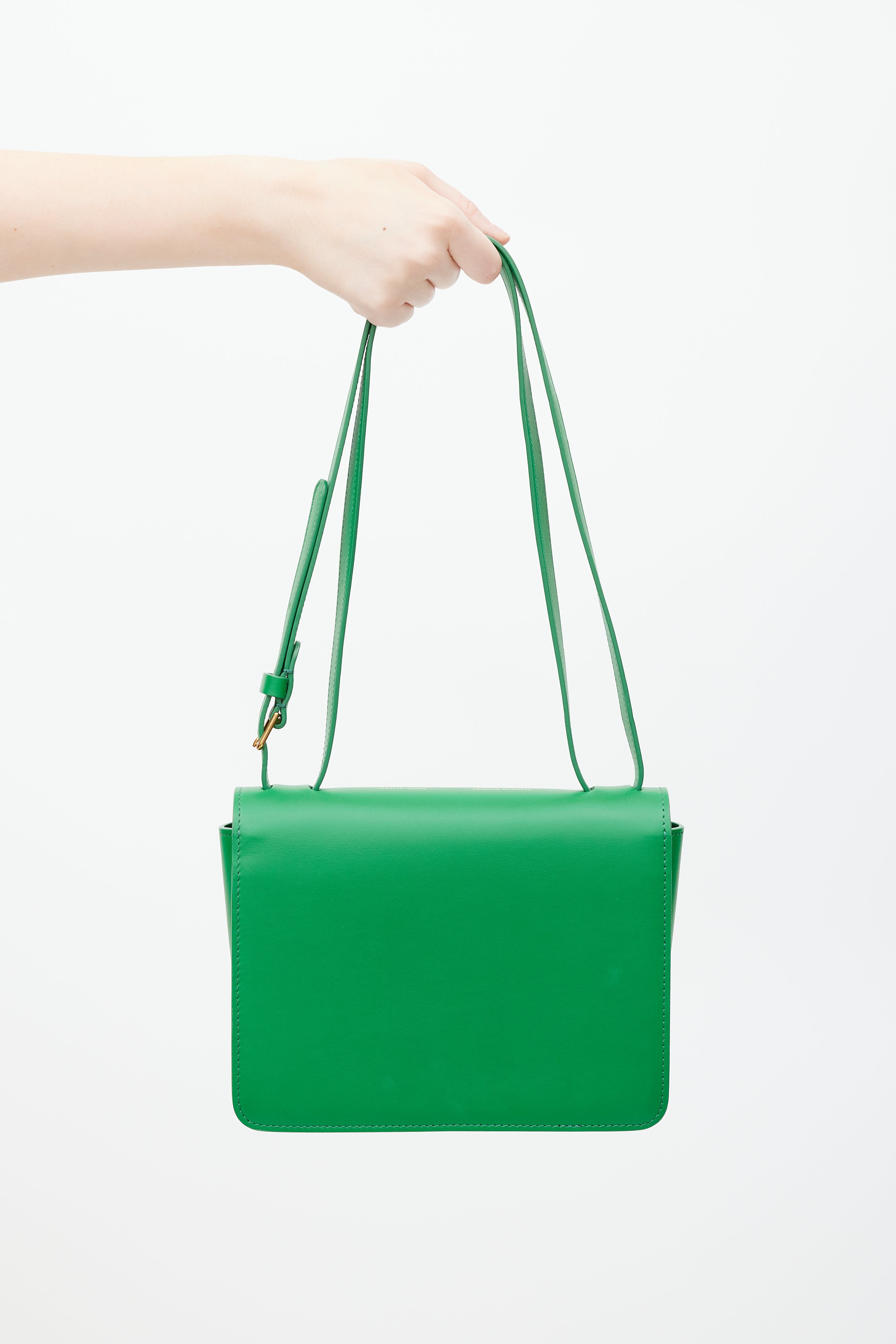 Pre-owned Mansur Gavriel green M Frame Box leather bag featuring a top flap, gold tone logo at top, two main compartments, adjustable shoulder strap, and magnetic snap closure.