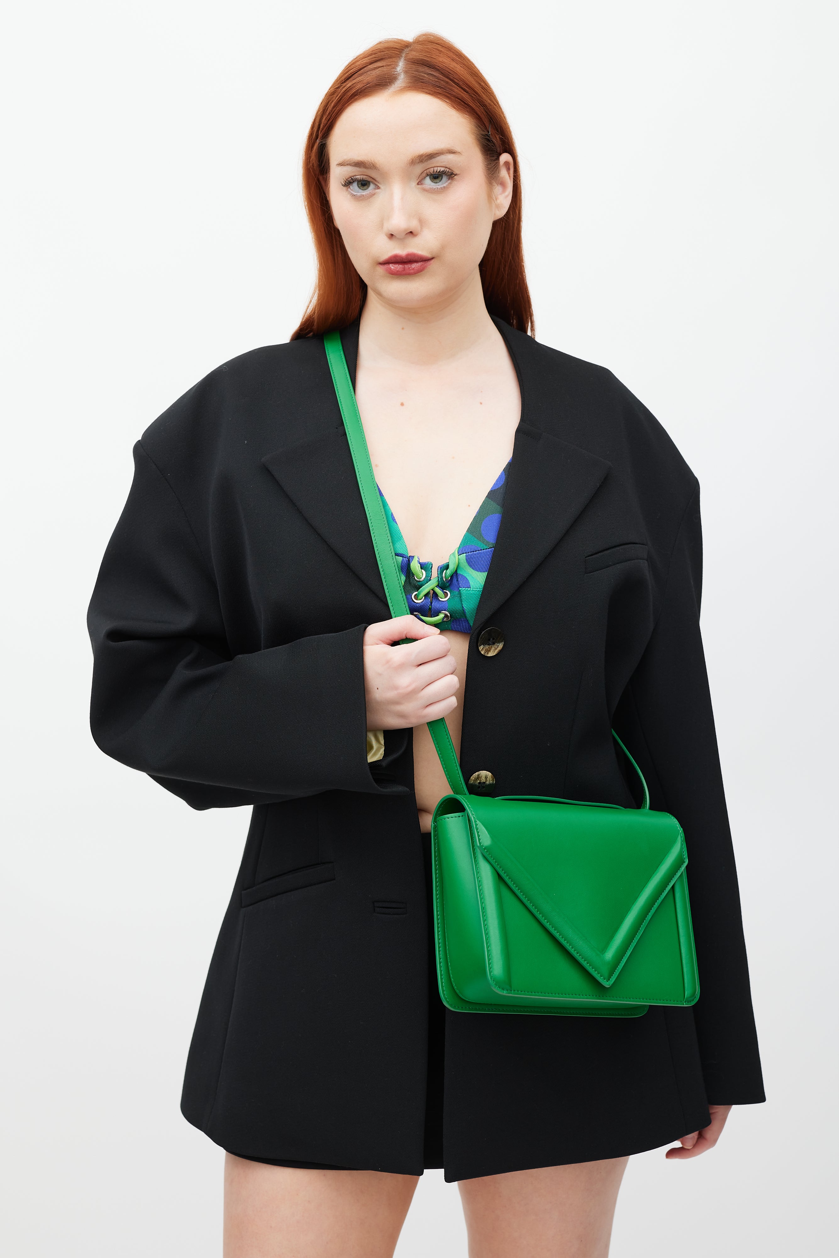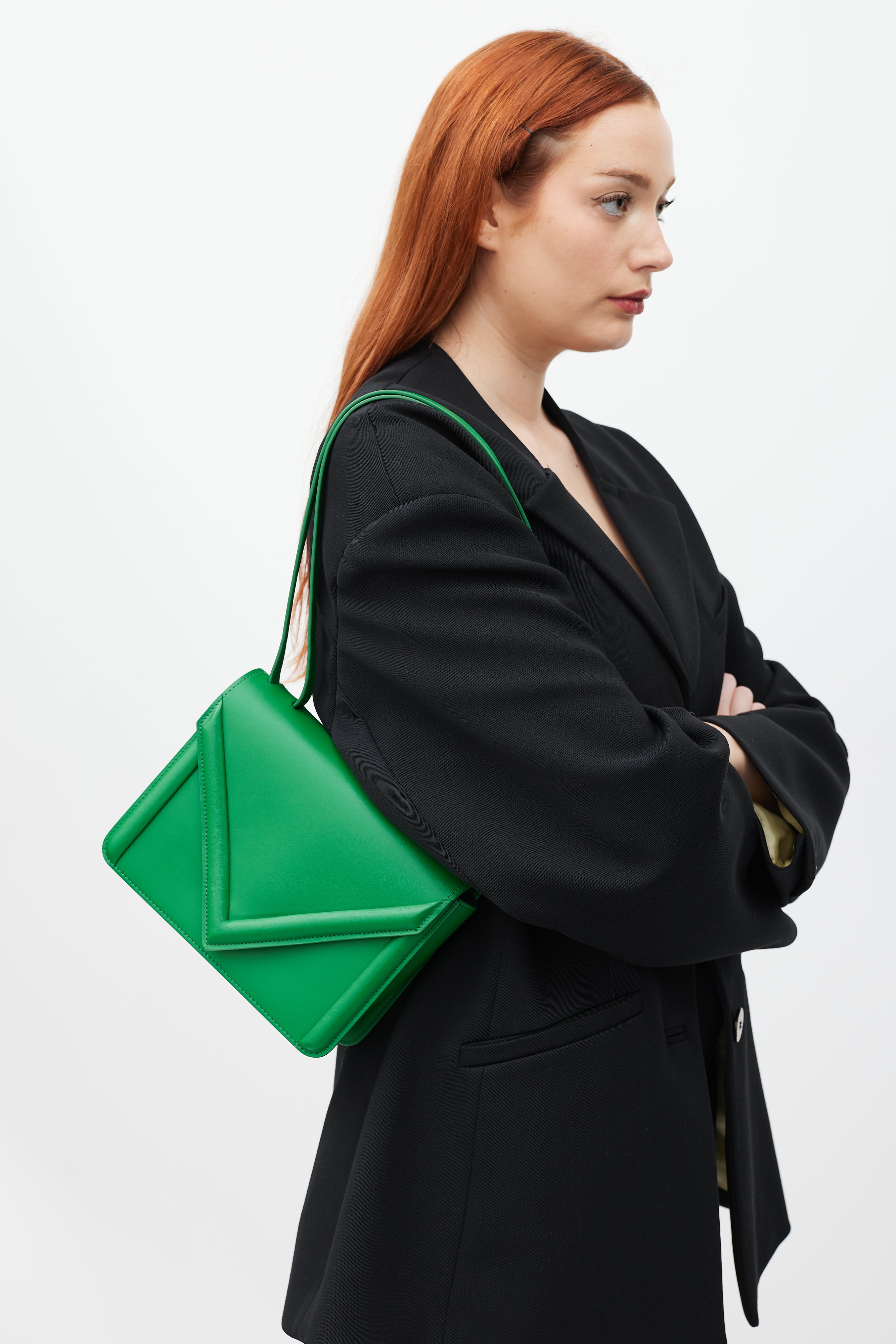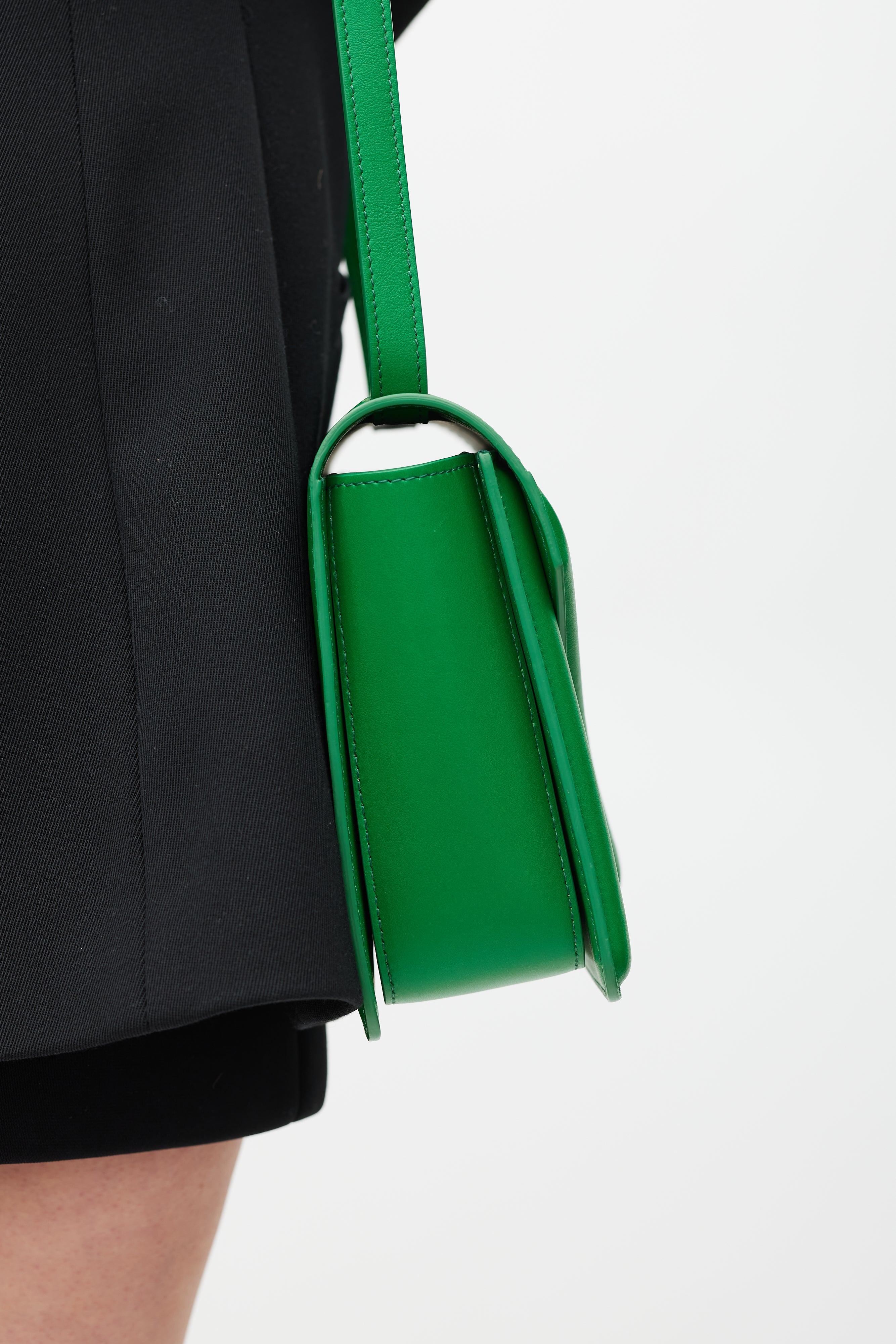 Pre-owned Mansur Gavriel green M Frame Box leather bag featuring a top flap, gold tone logo at top, two main compartments, adjustable shoulder strap, and magnetic snap closure.
