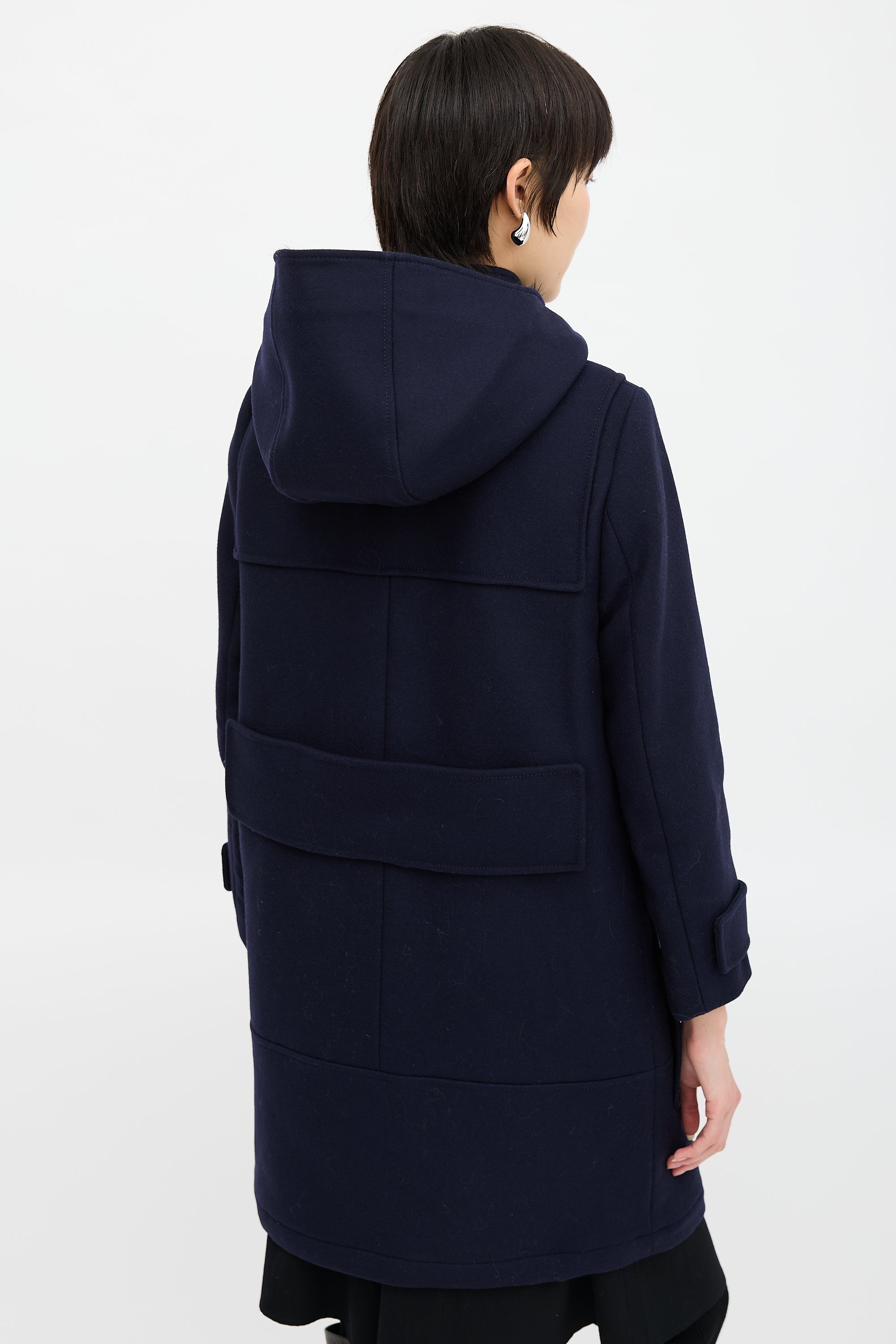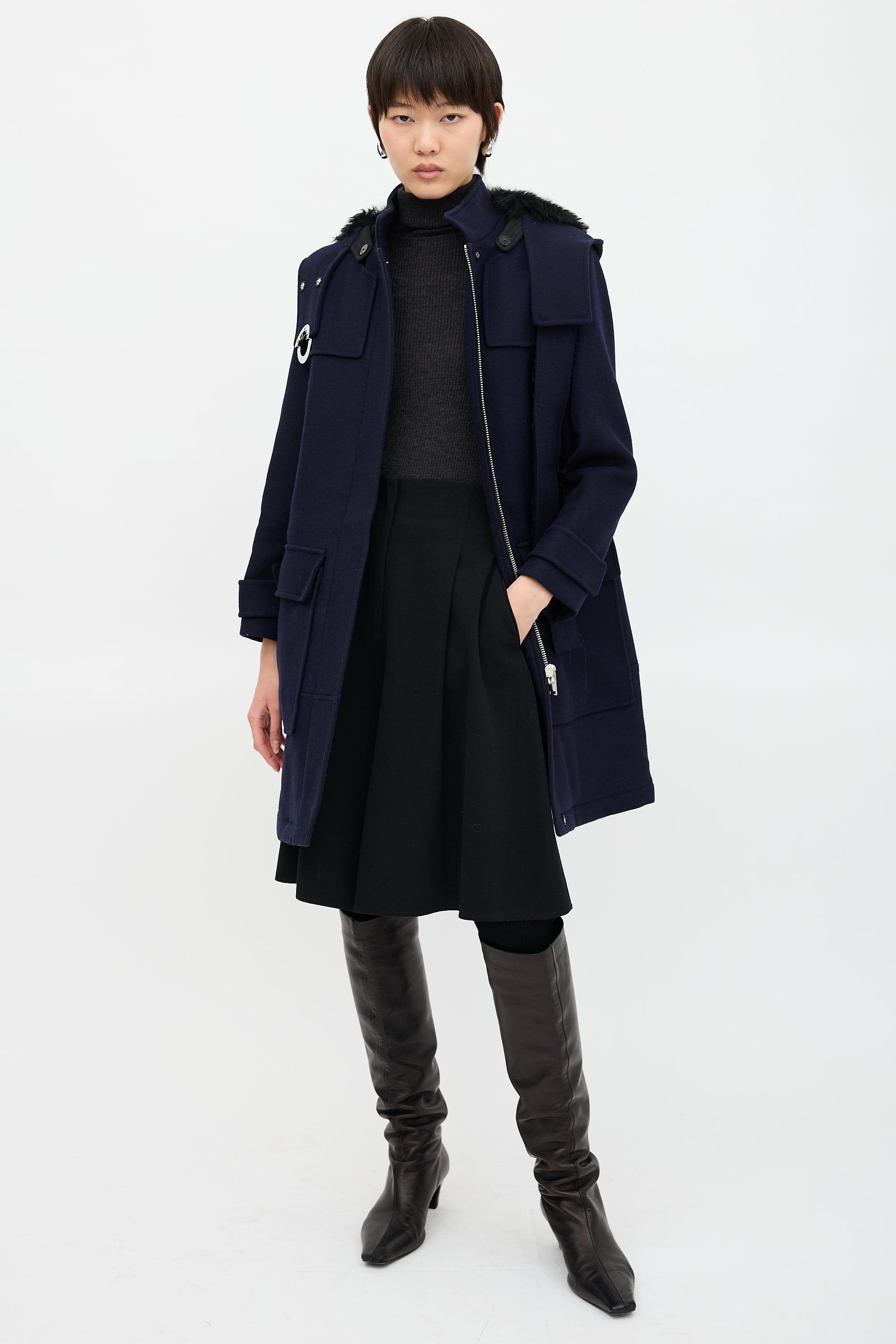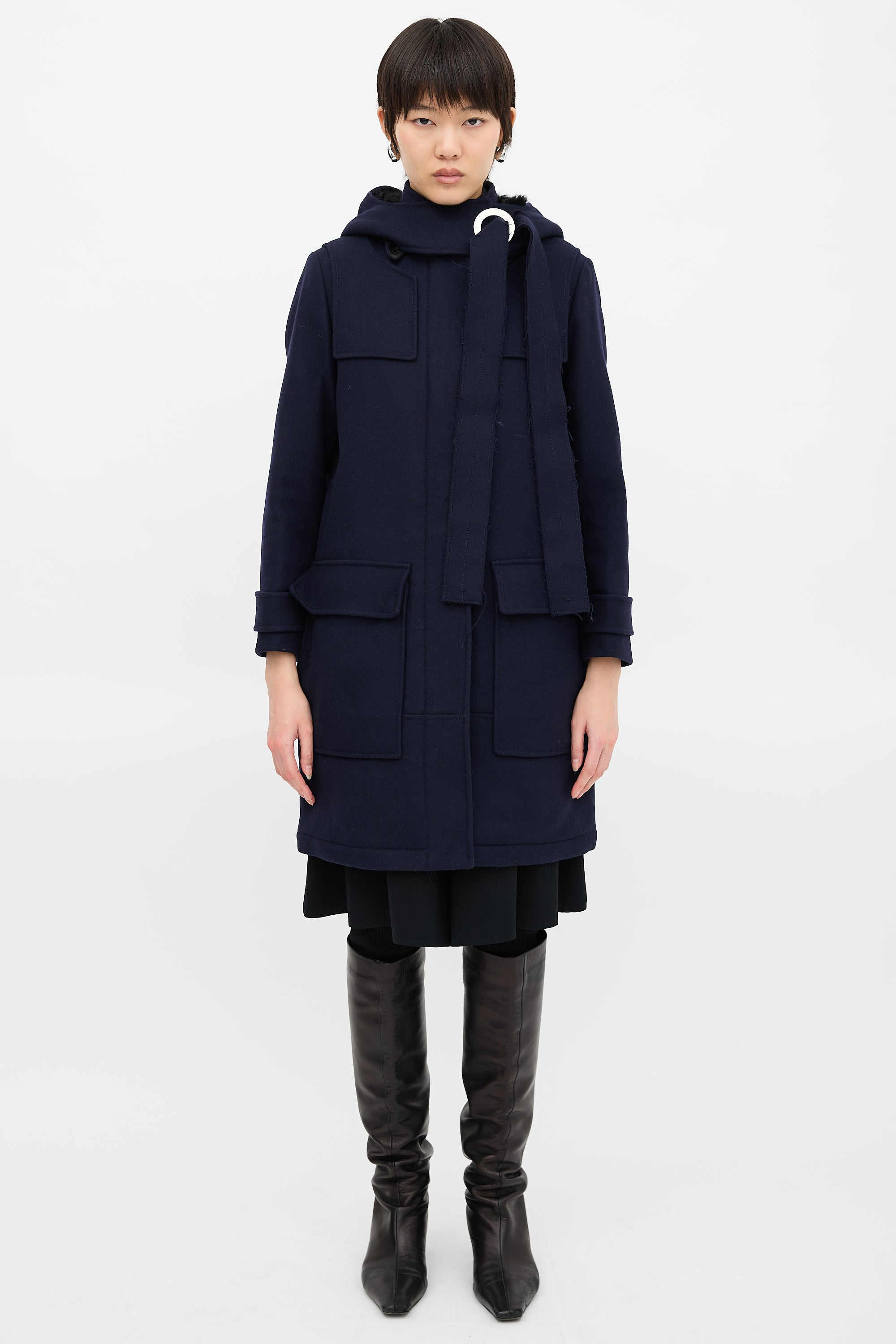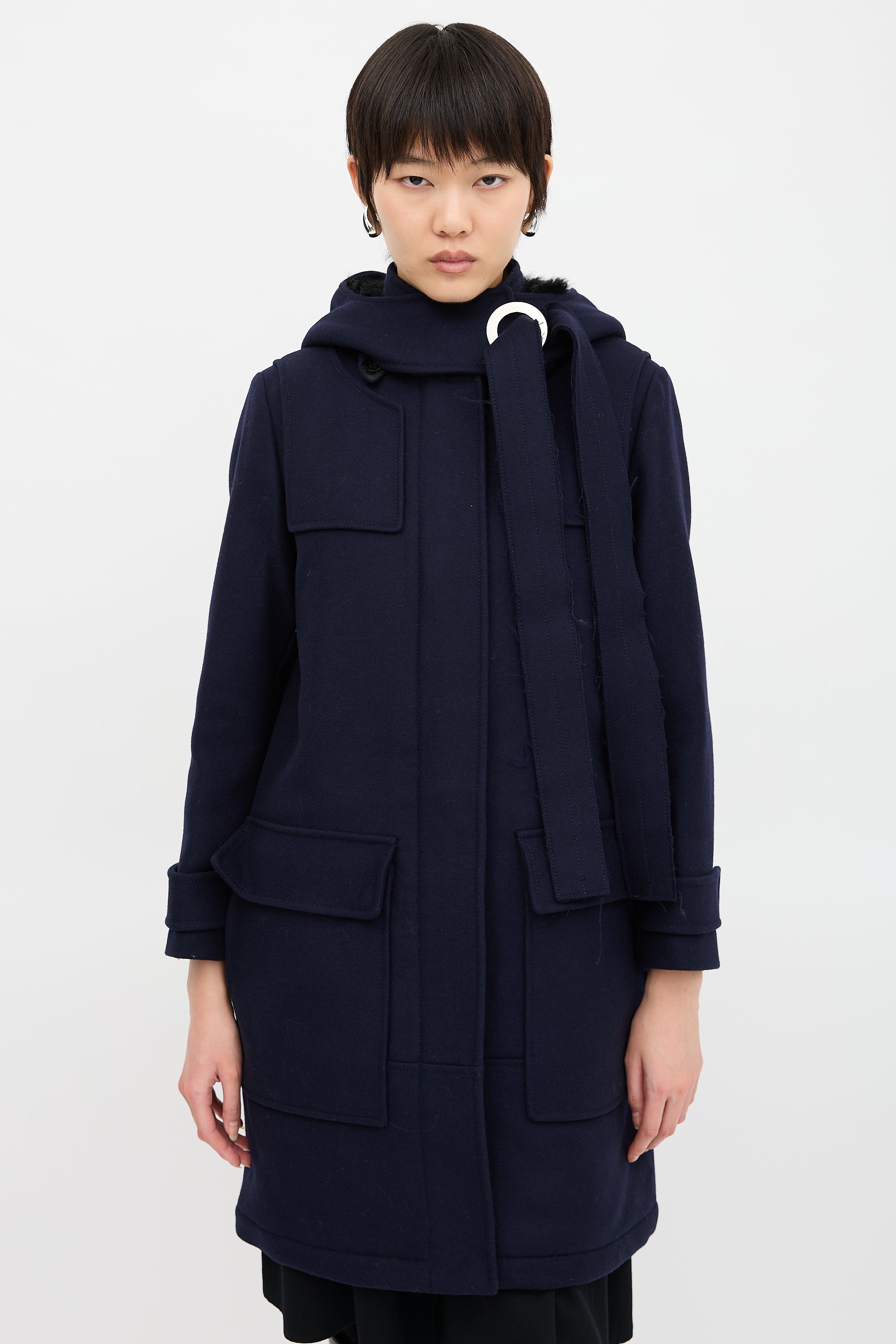 Pre-owned Proenza Schouler navy wool blend coat featuring stand collar, removable hood with fur lining, front ring and strap detail with frayed edges, zip up front, snap button placket, two front flap and slip pockets, back half belt, and cuff straps. Lined.