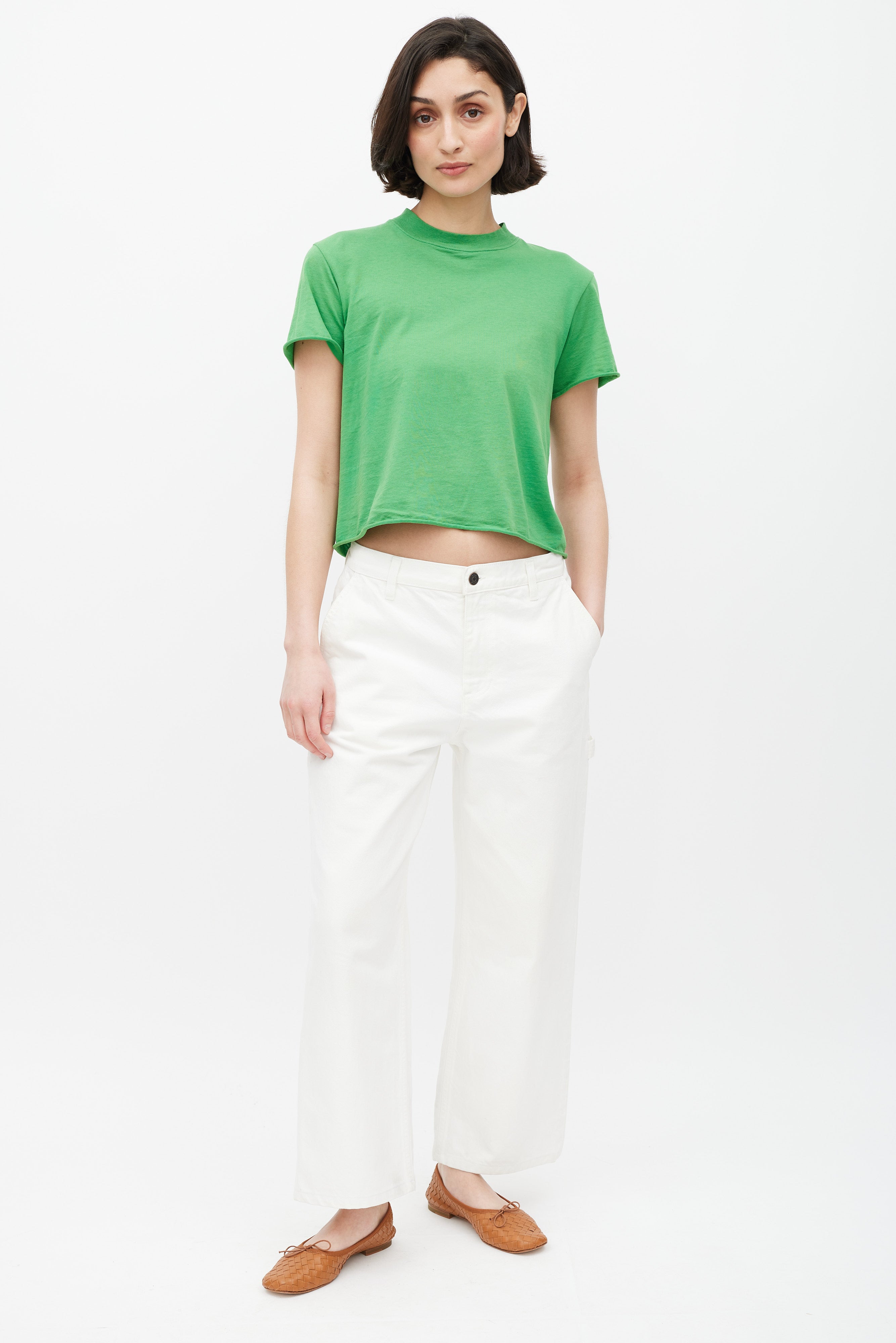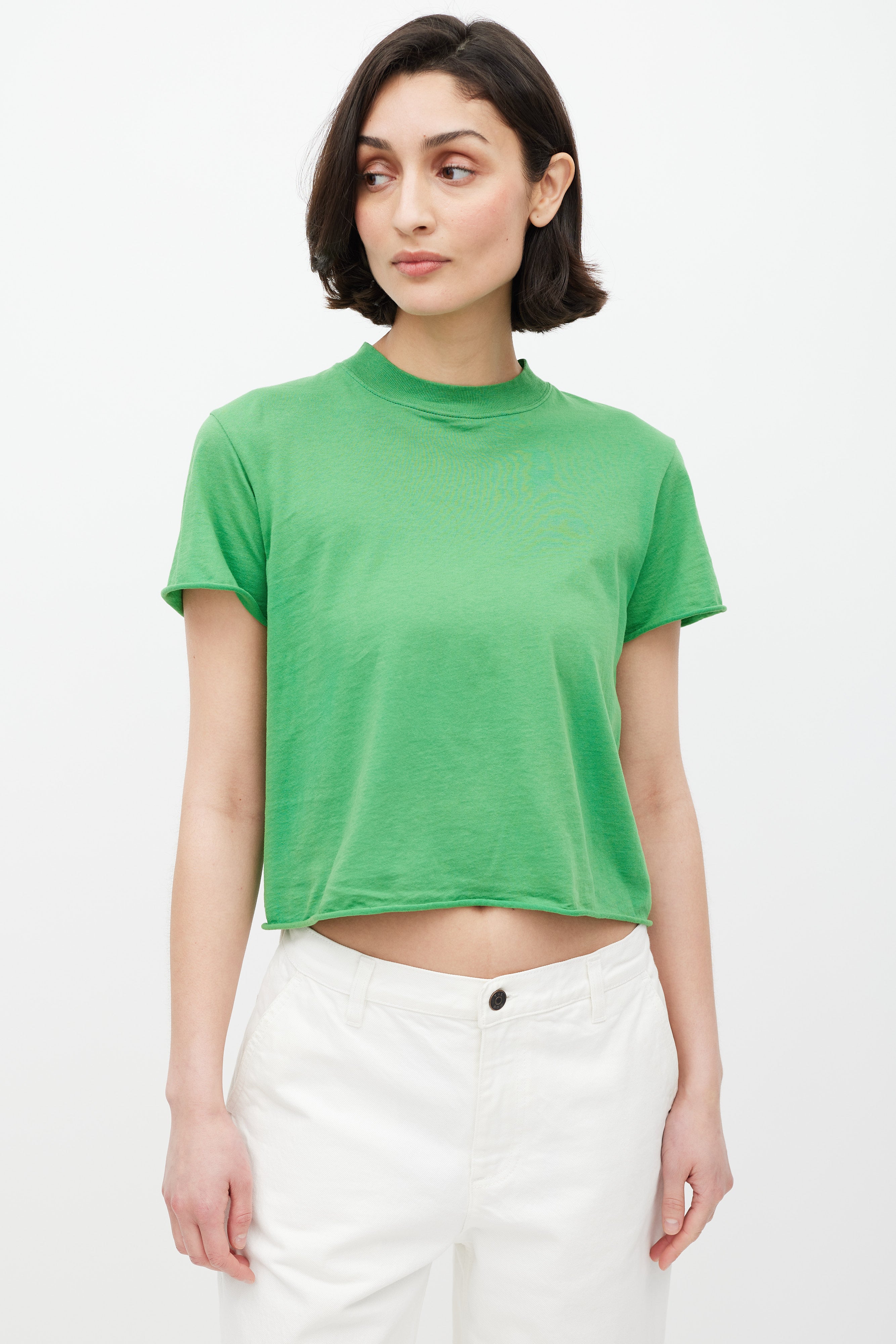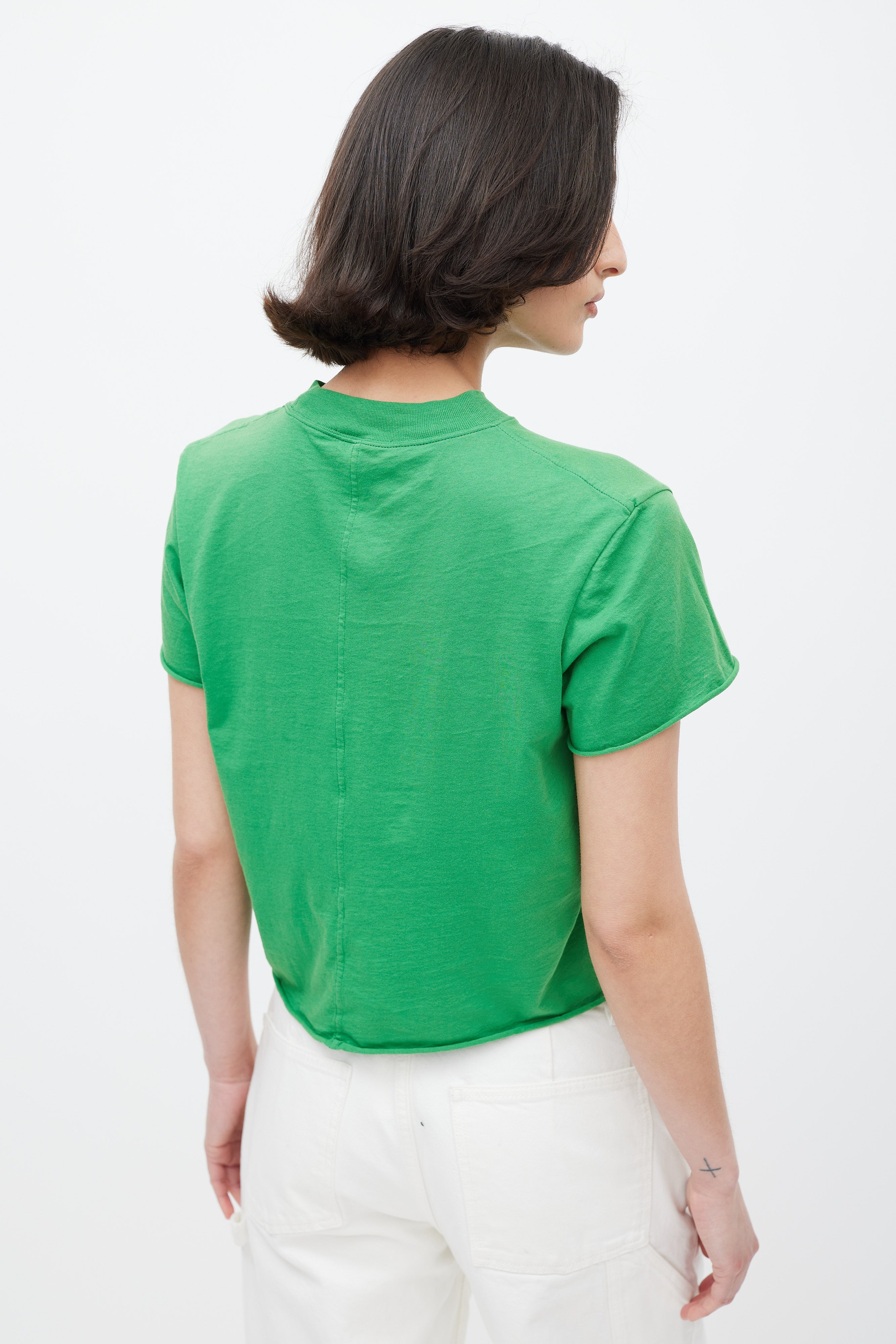Pre-owned The Row green T-shirt featuring a round neckline, panelled seams at back, cropped fit, and raw hems.